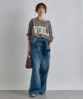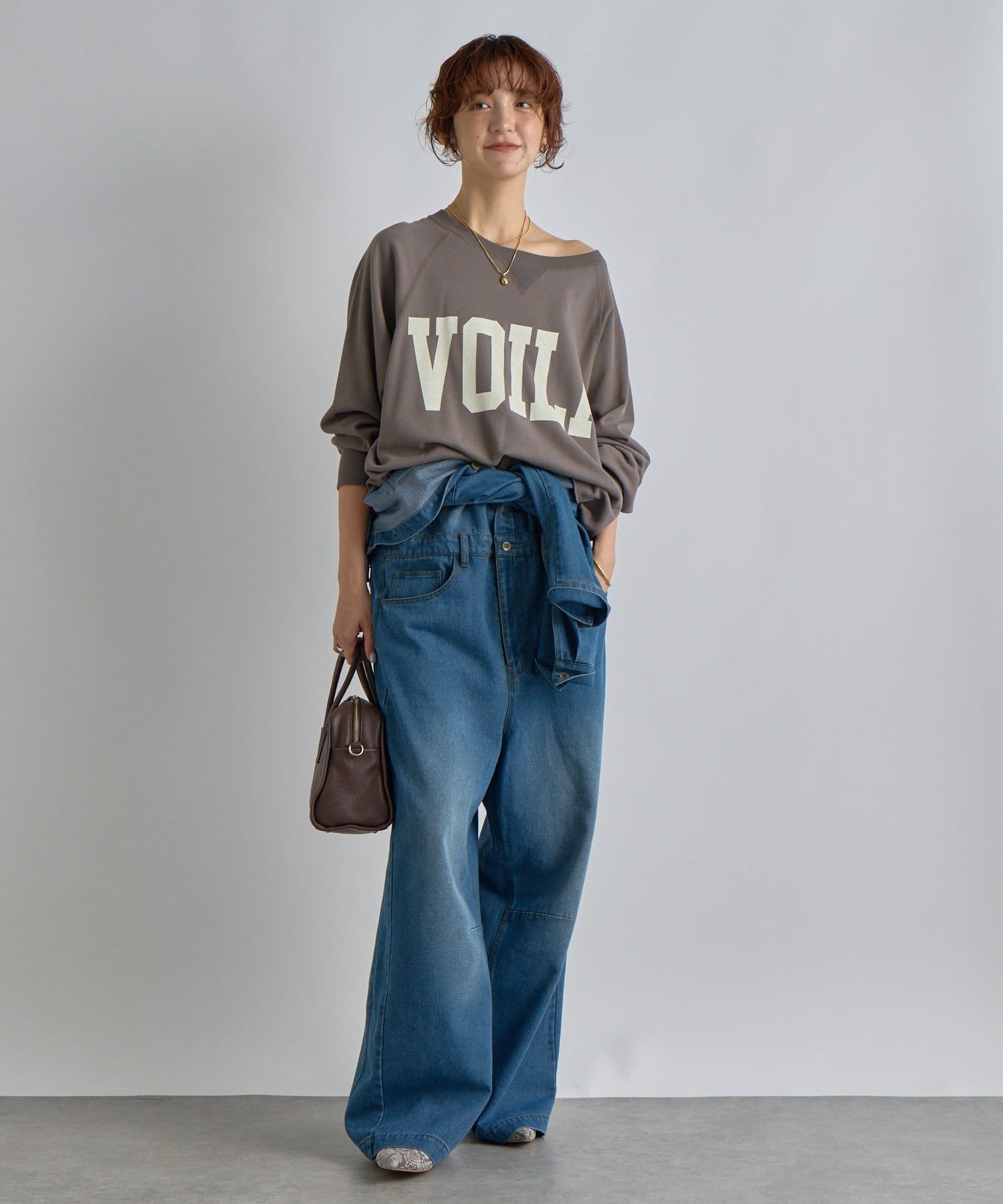 ドロップショルダーの抜け感とパンツのルーズなシルエットが特徴。