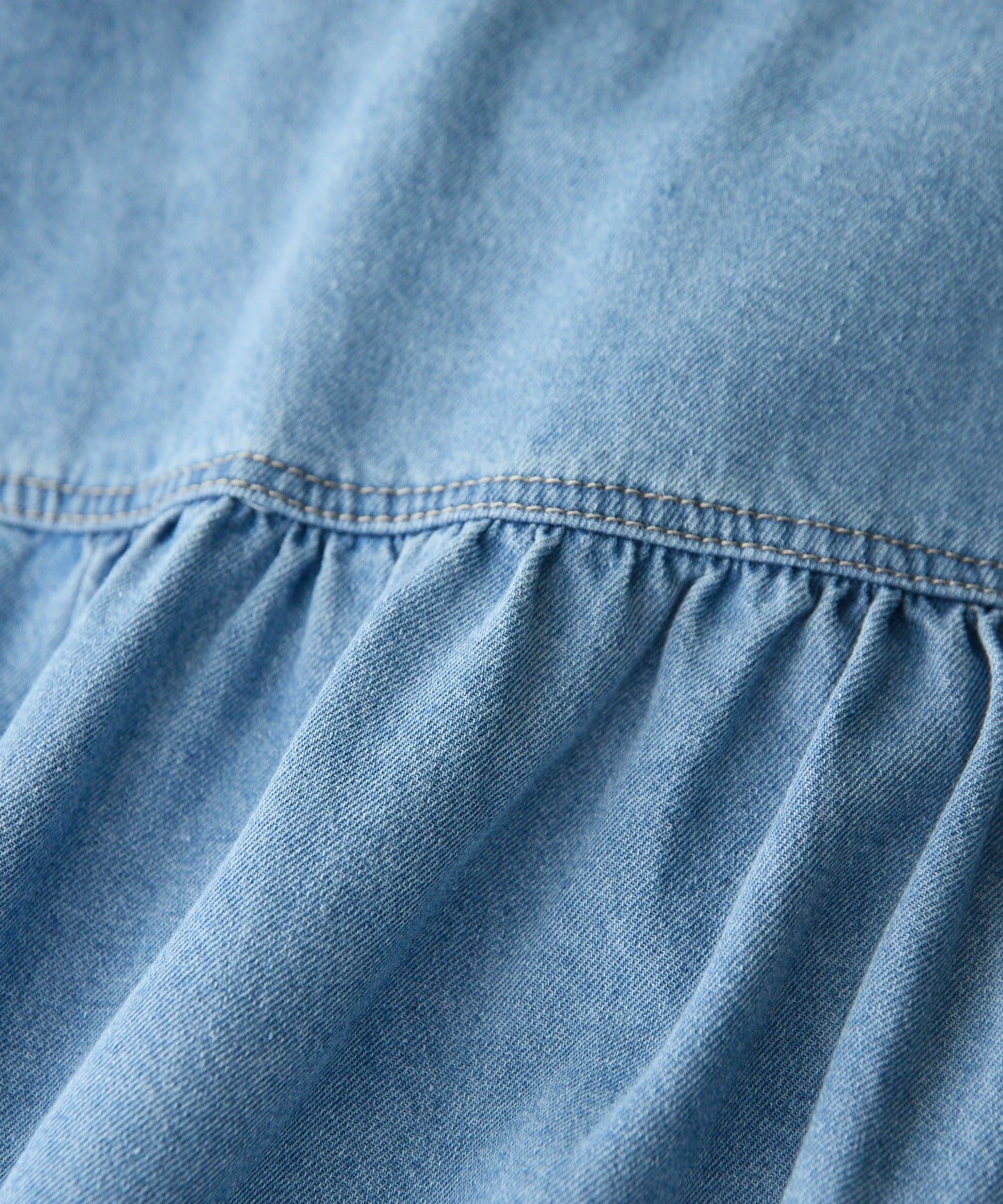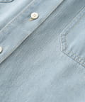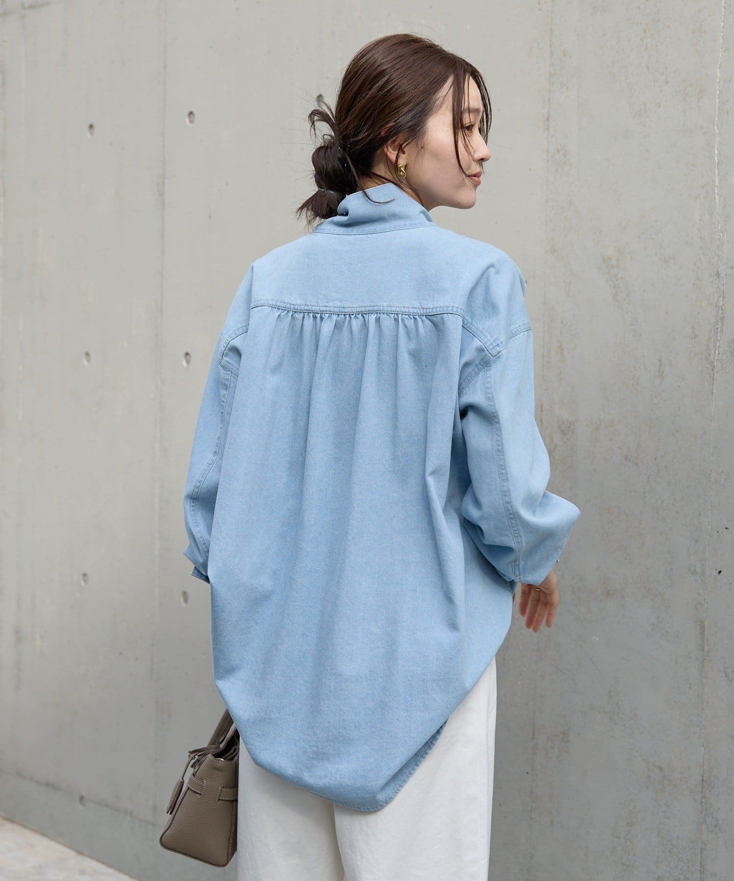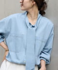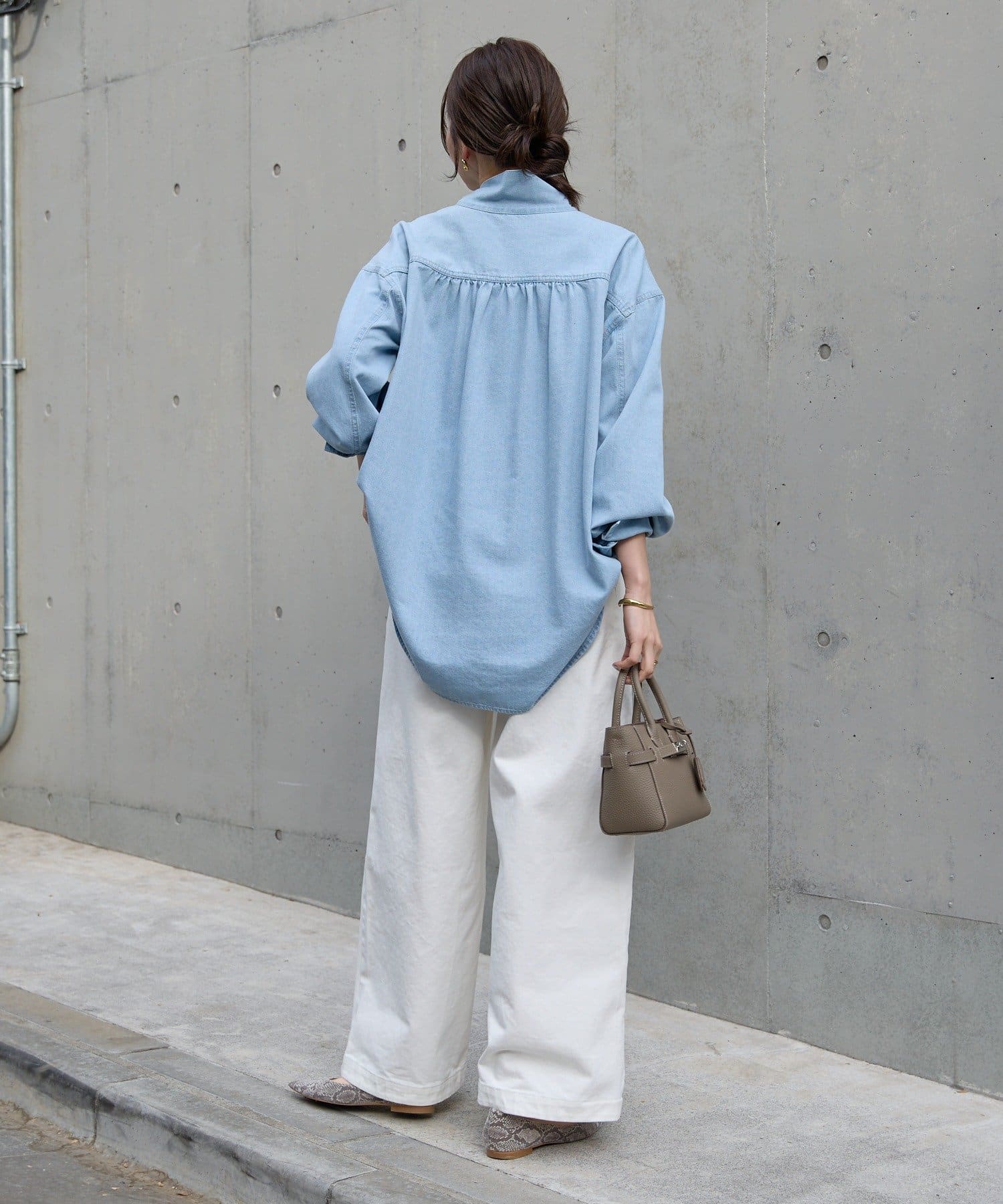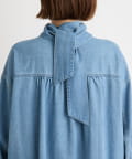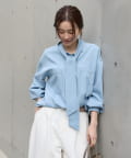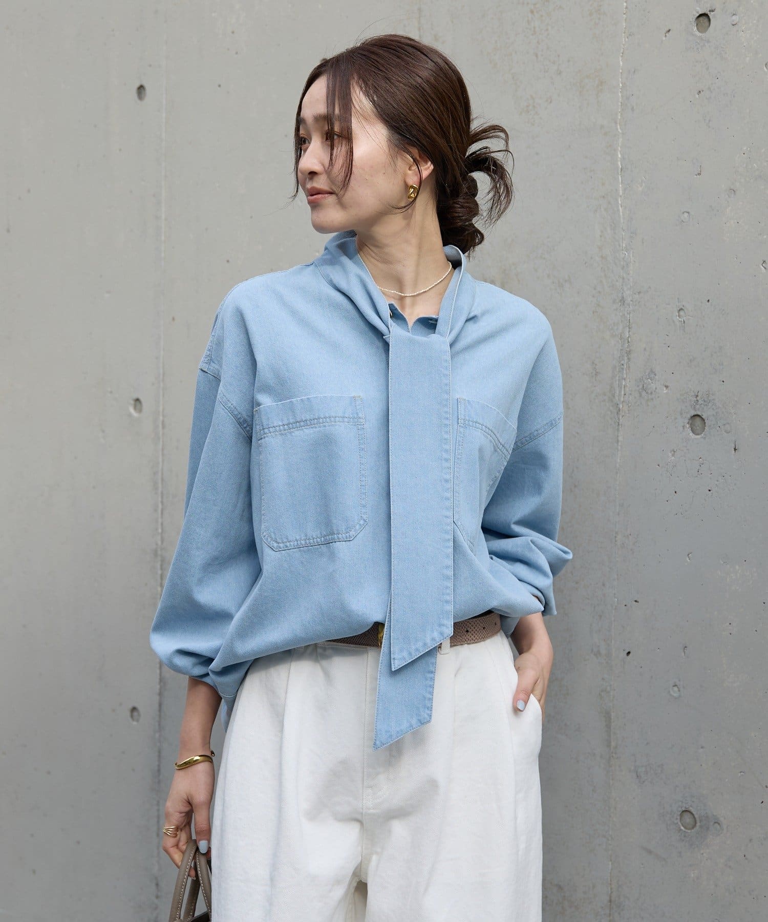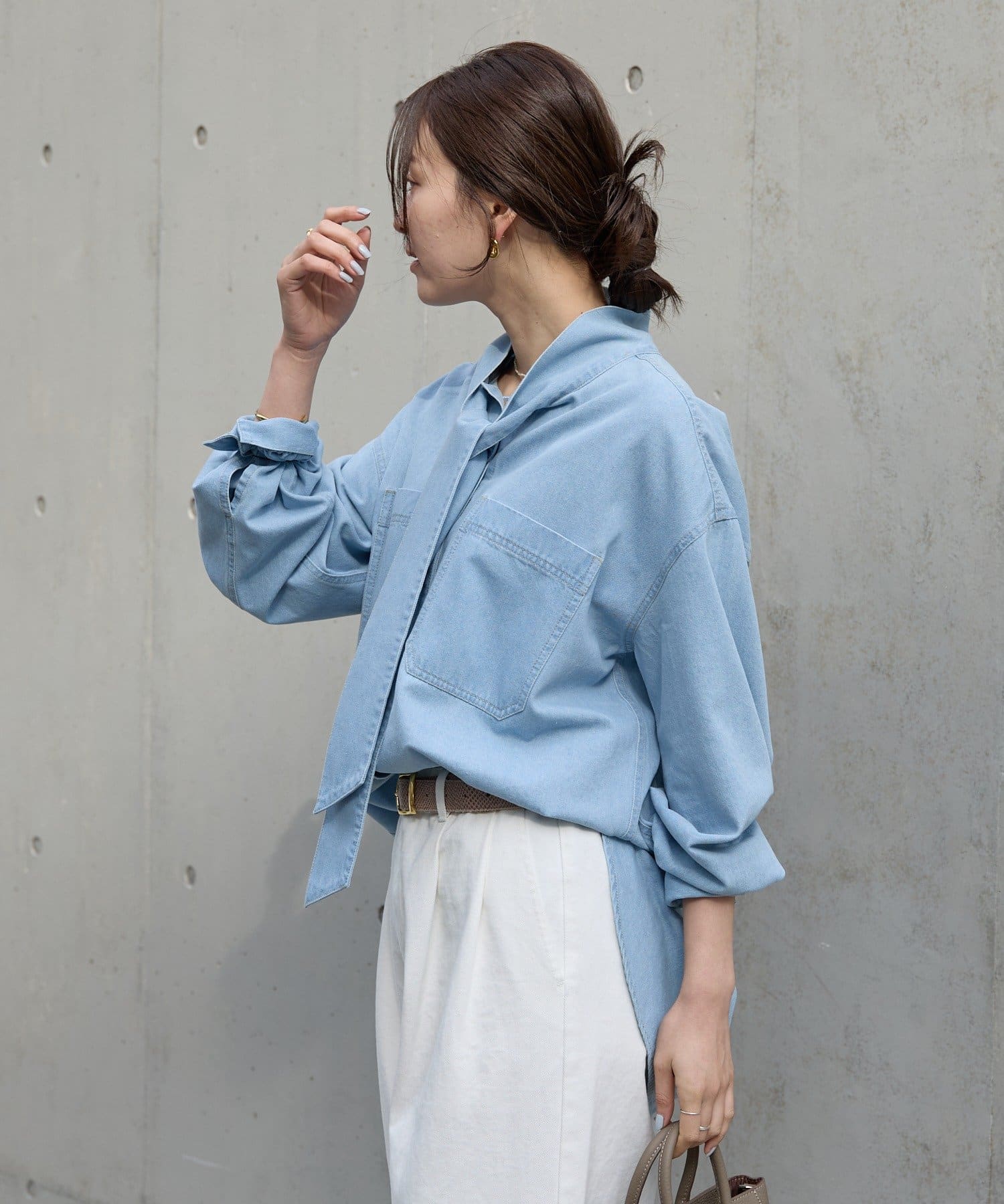 ・ボウタイやギャザーなど、フェミニンなディティールとデニムシャツの無骨さのかけ合わせが新鮮なアイテム。