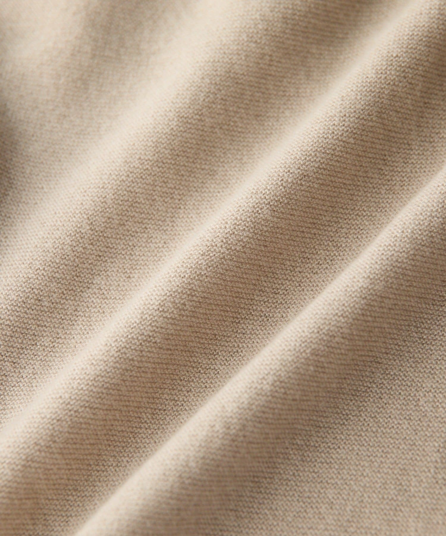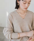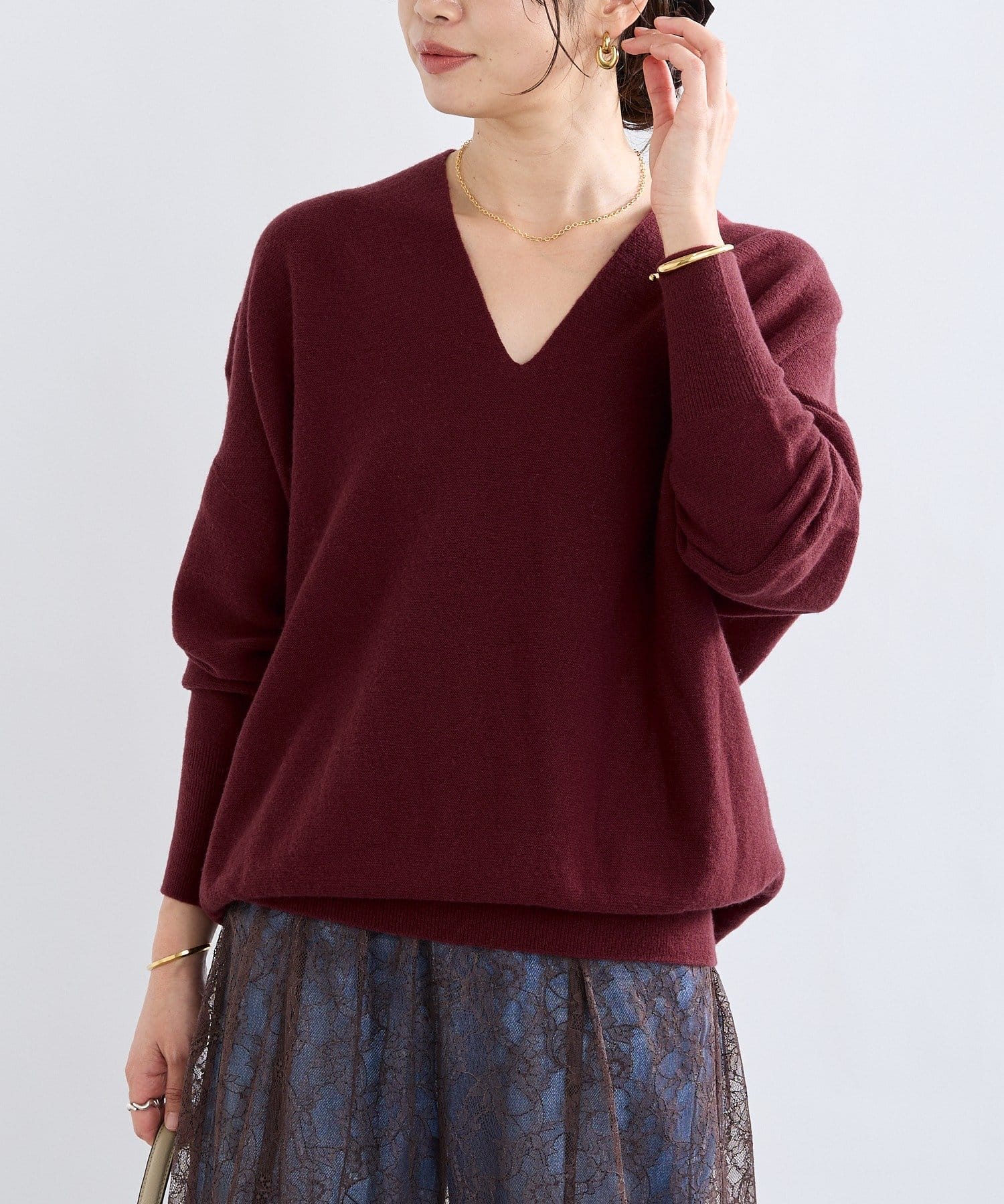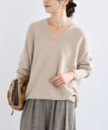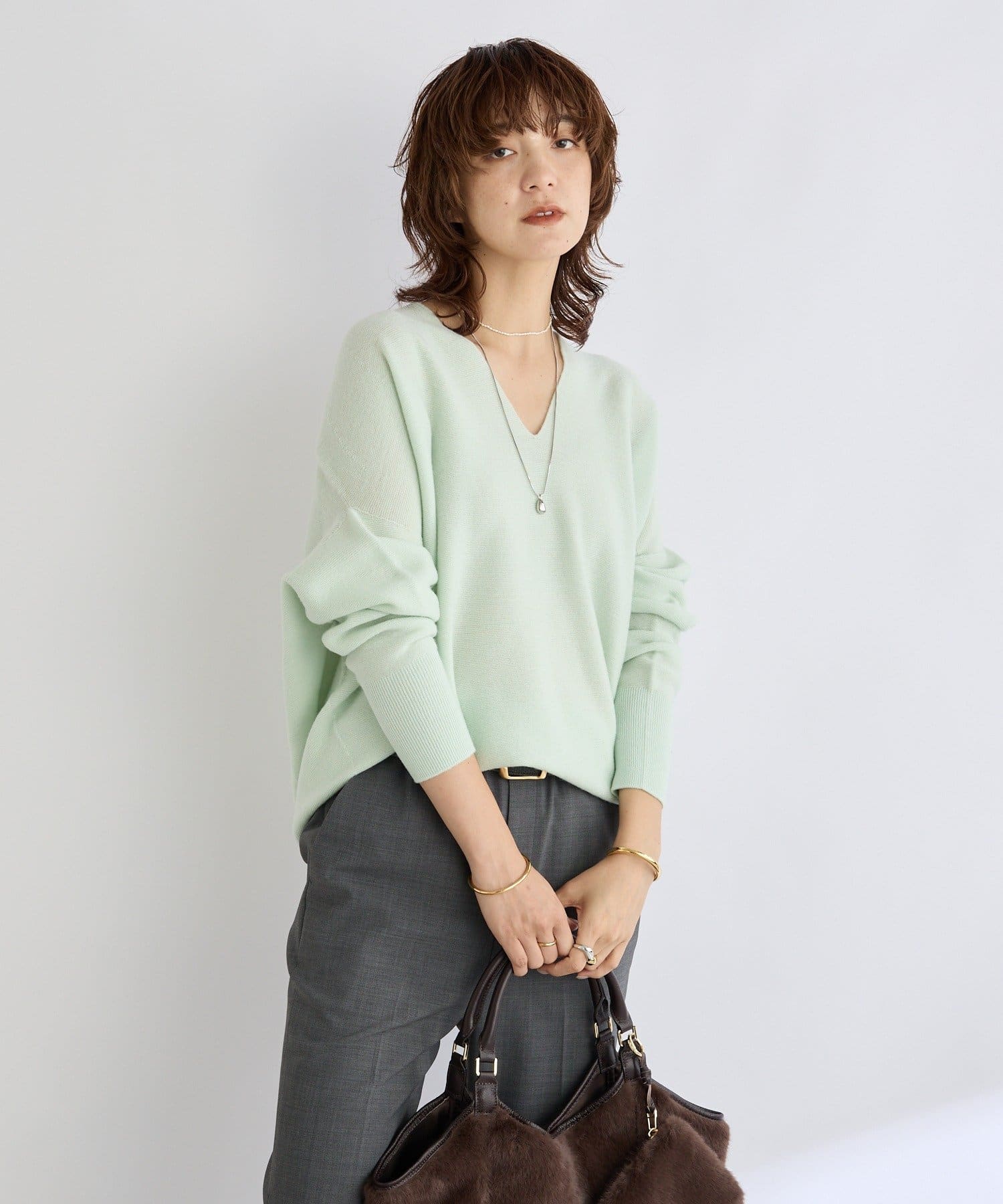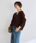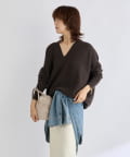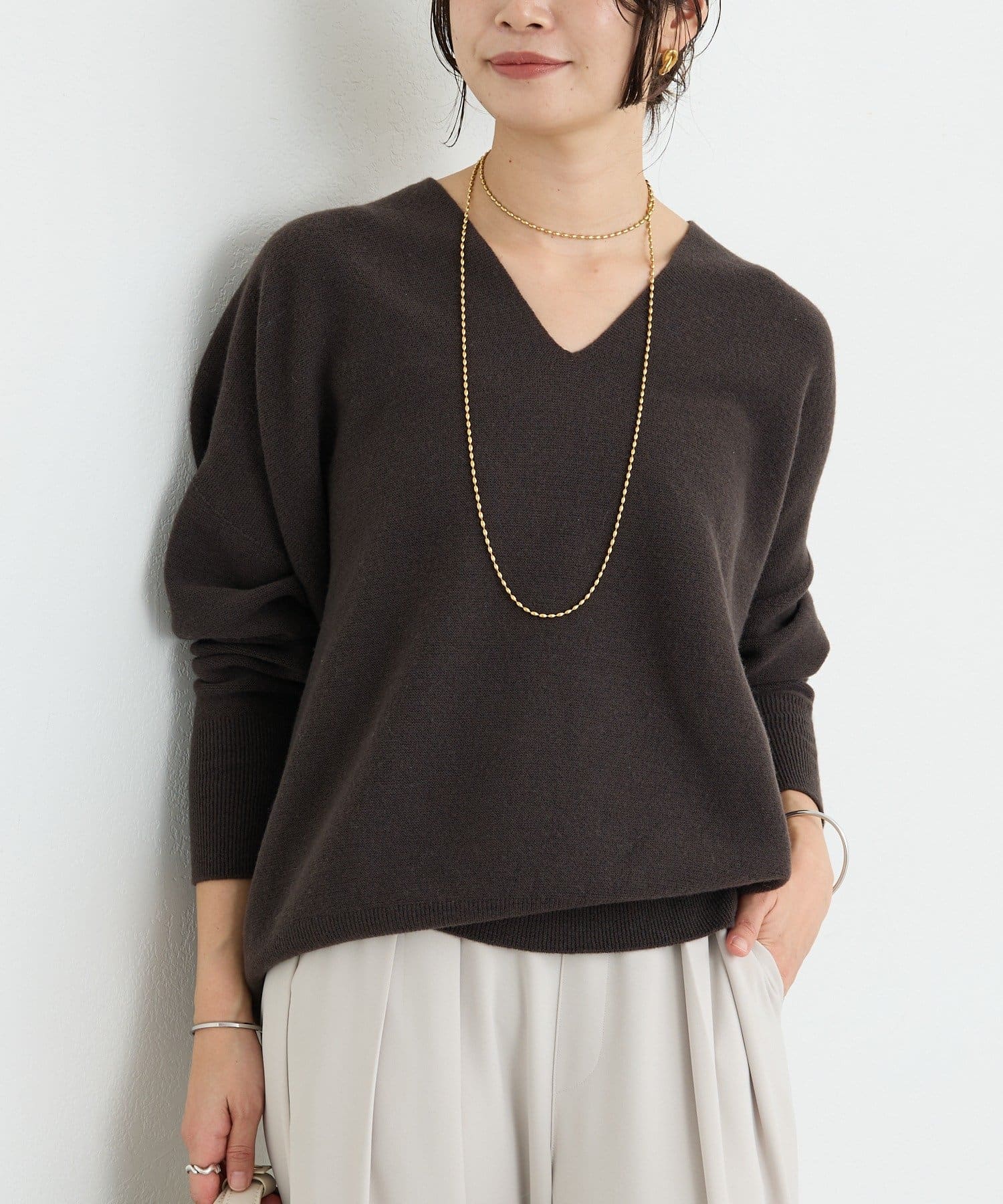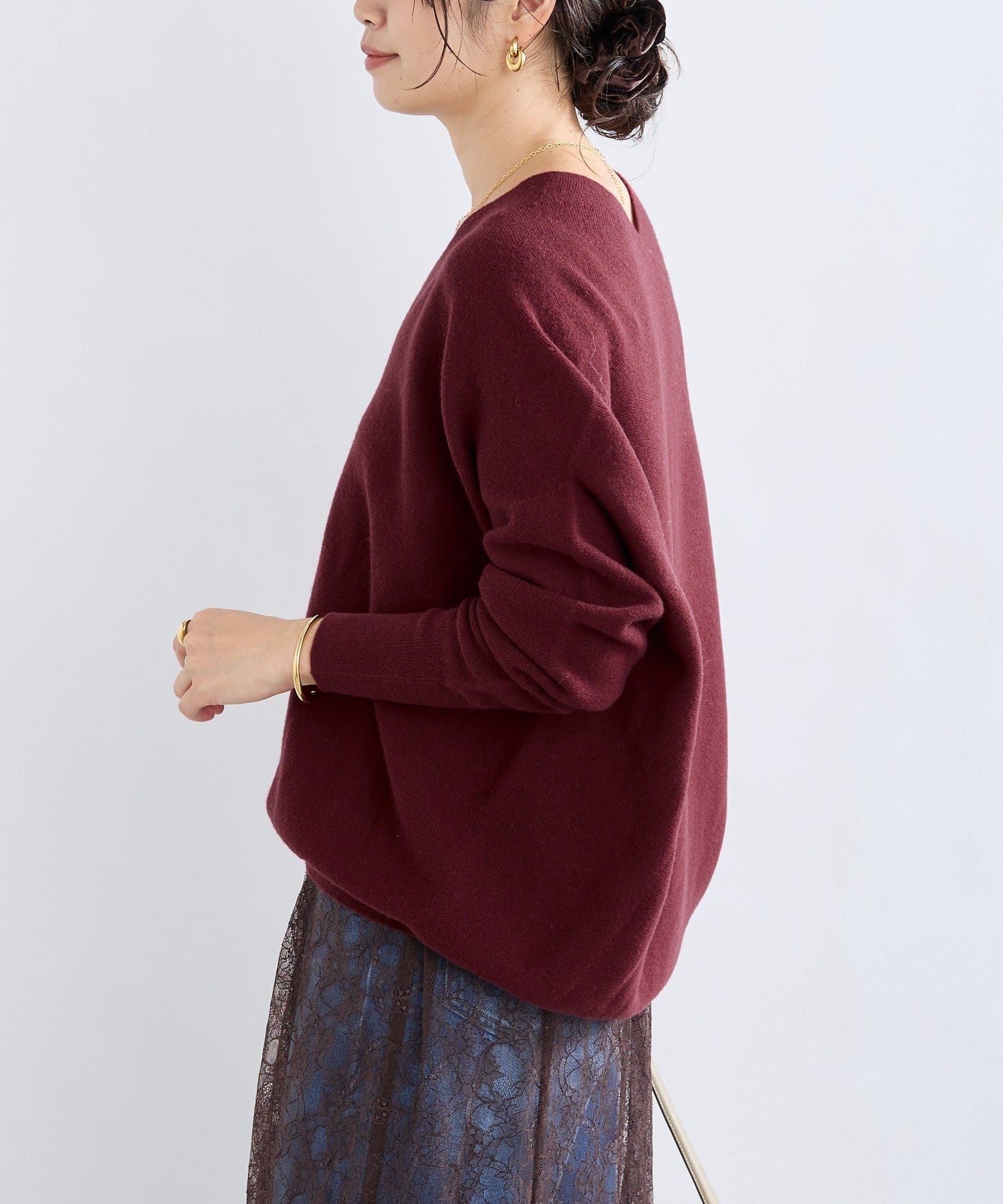 ゆとりのある着丈、身幅で着やすく、開きすぎないけれどすっきりと見える衿の開きが特徴的なニット。