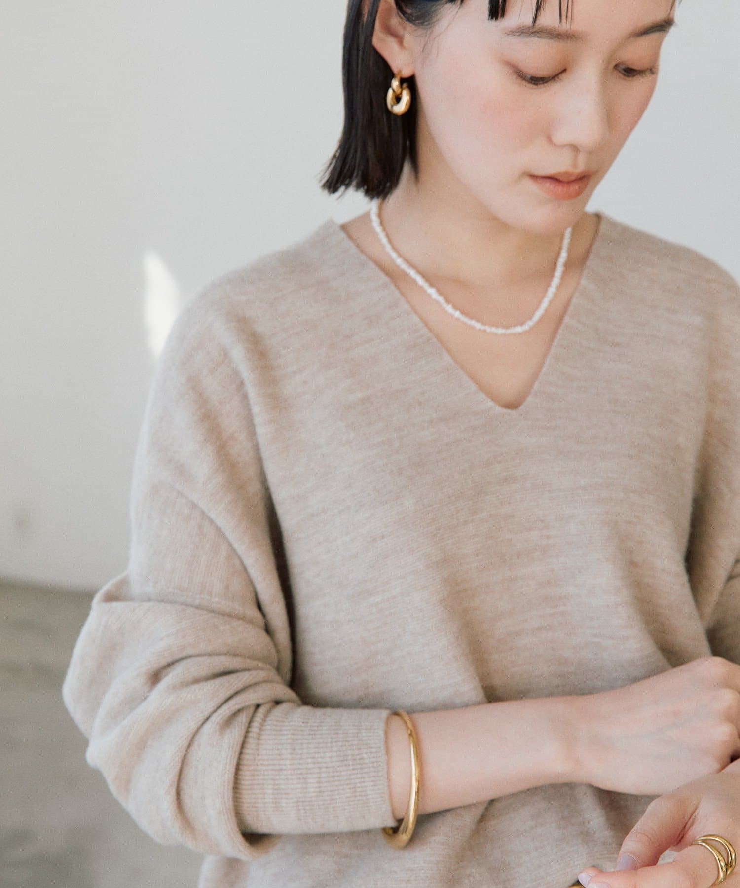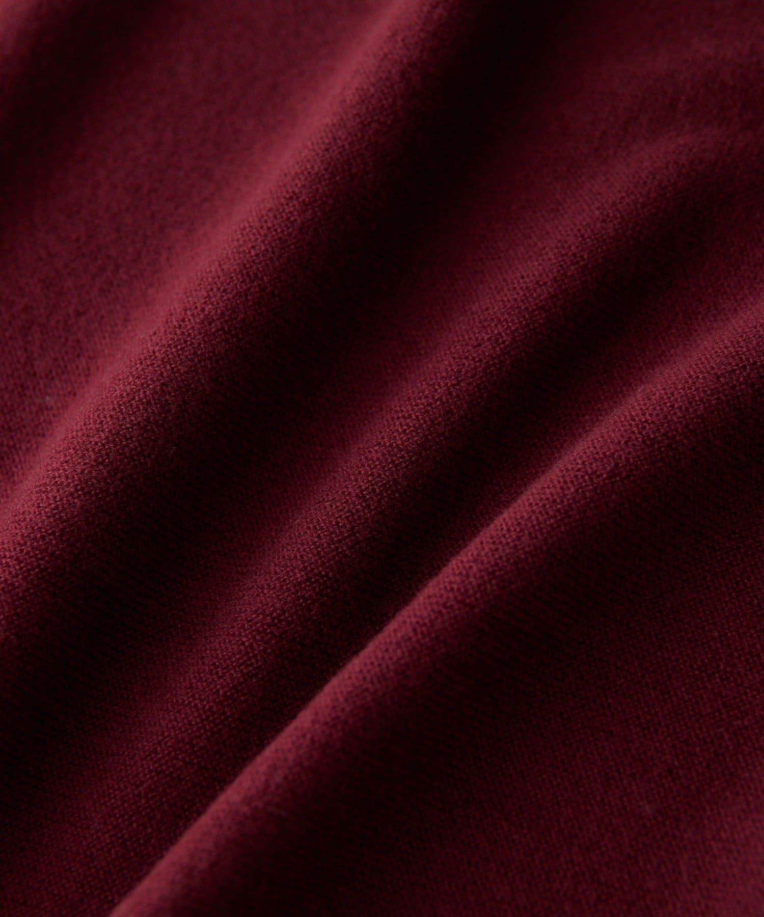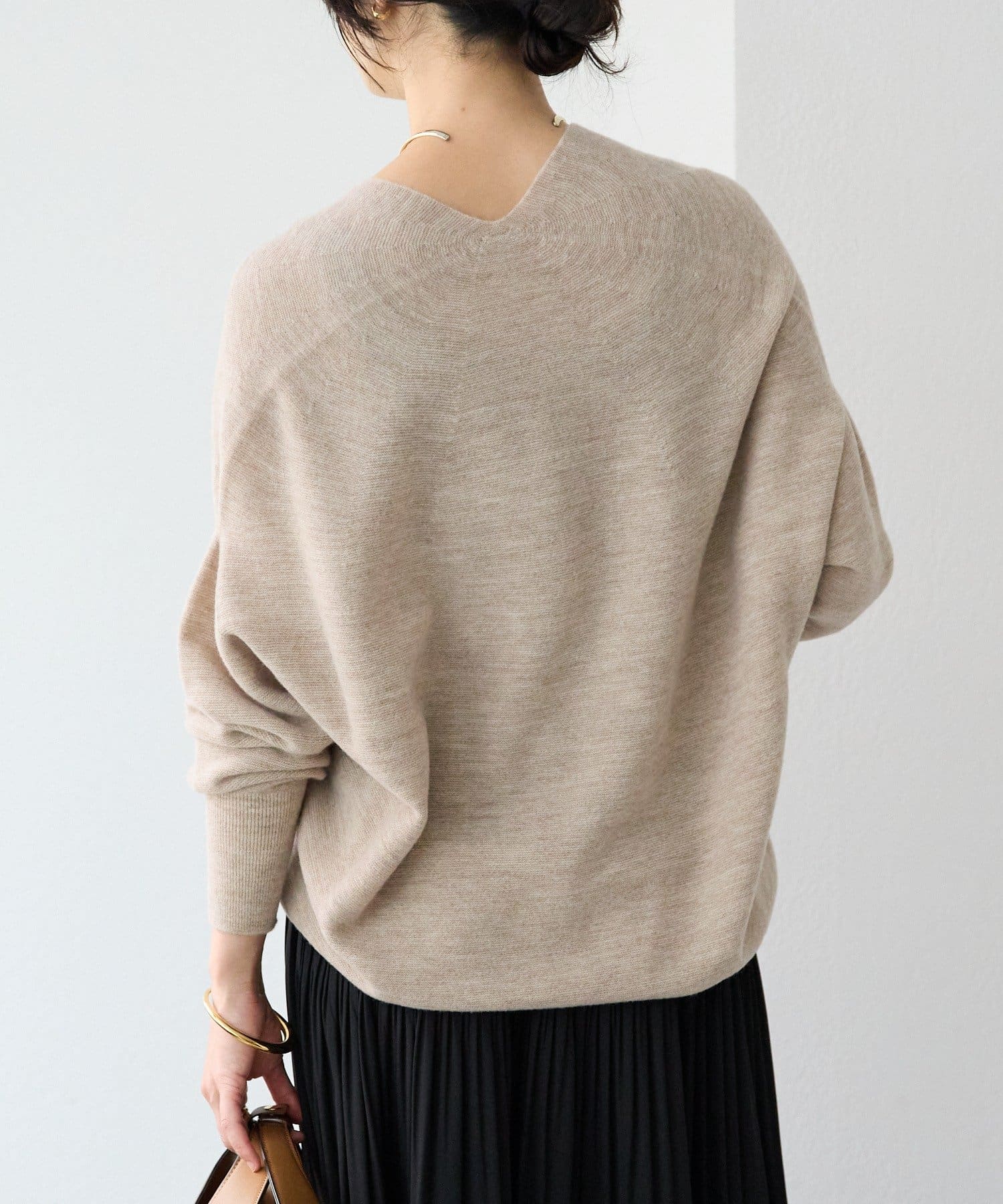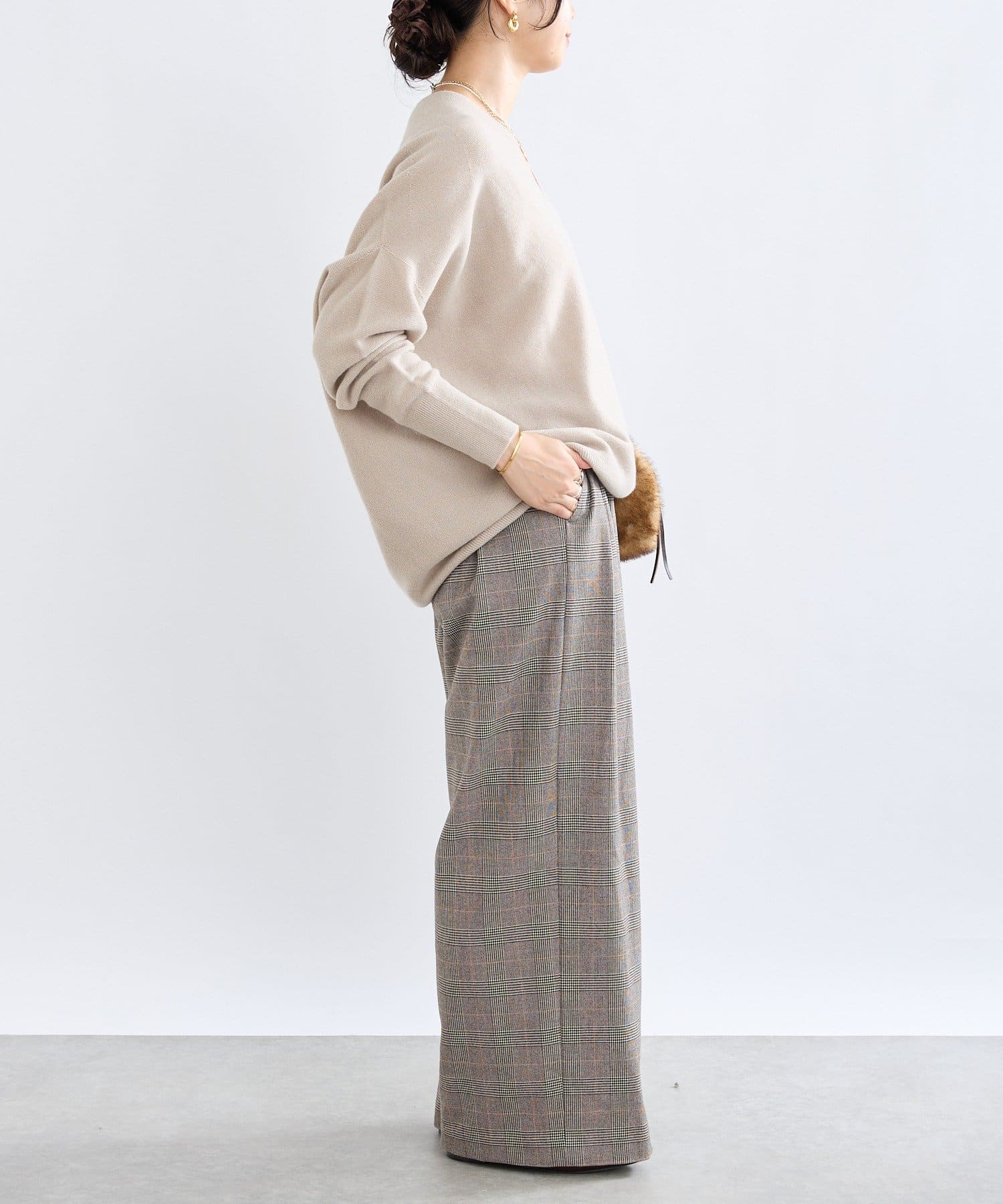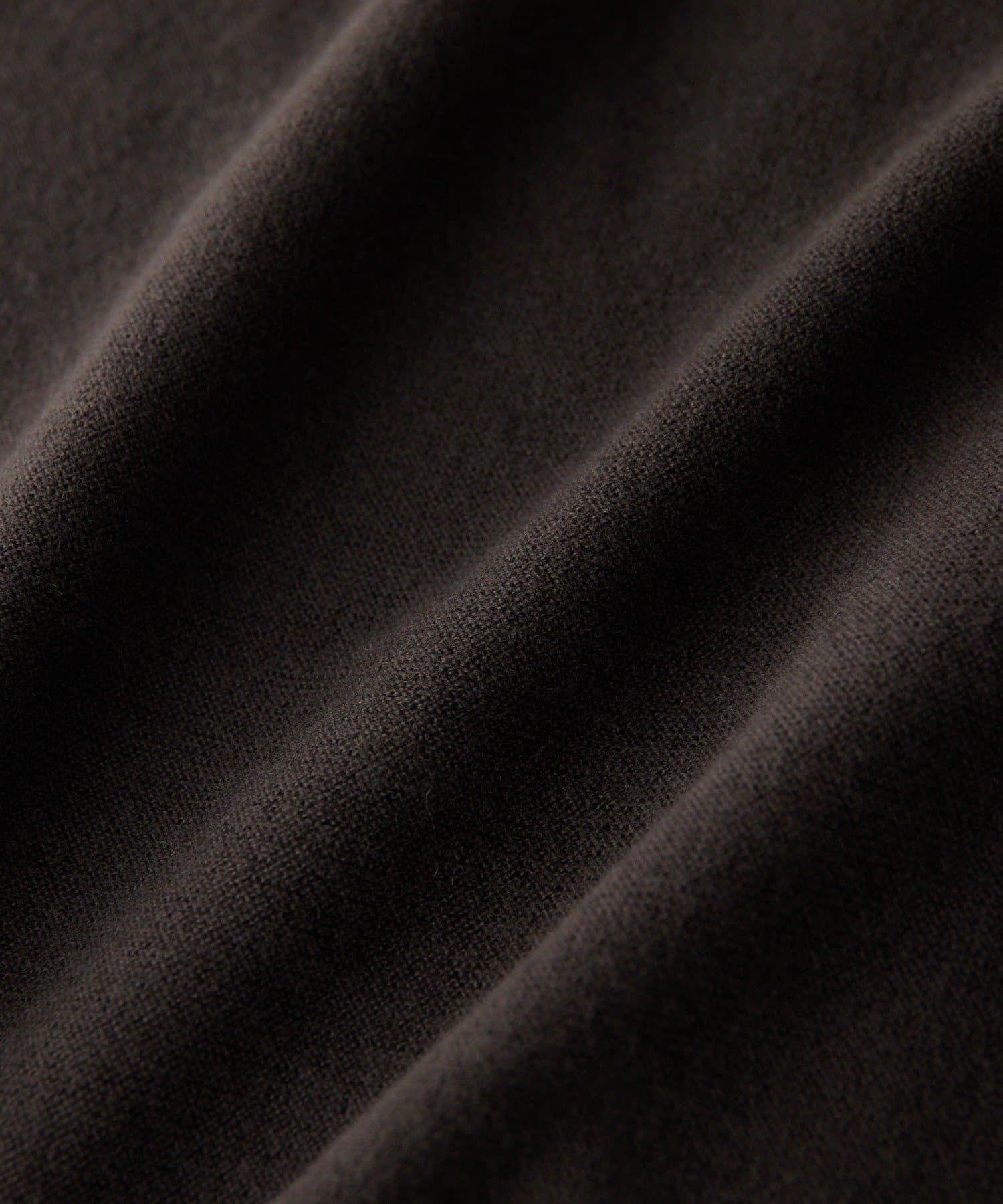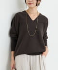 ゆとりのある着丈、身幅で着やすく、開きすぎないけれどすっきりと見える衿の開きが特徴的なニット。