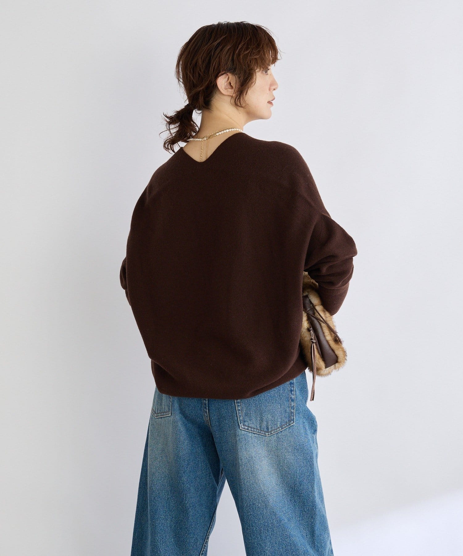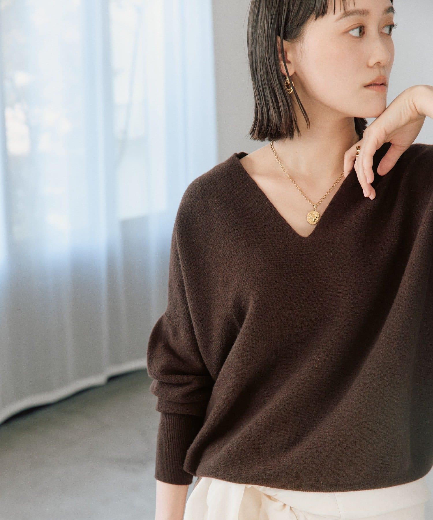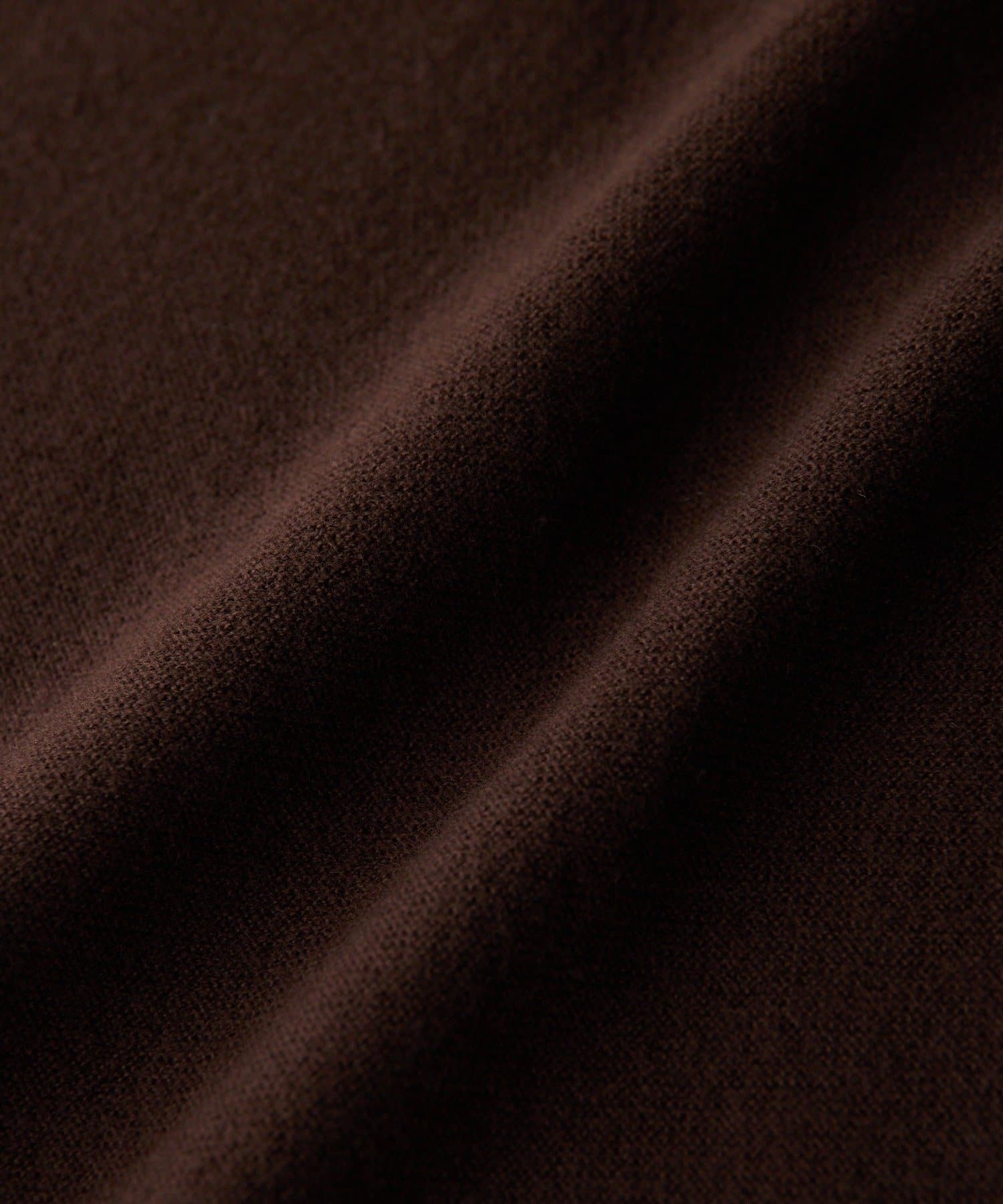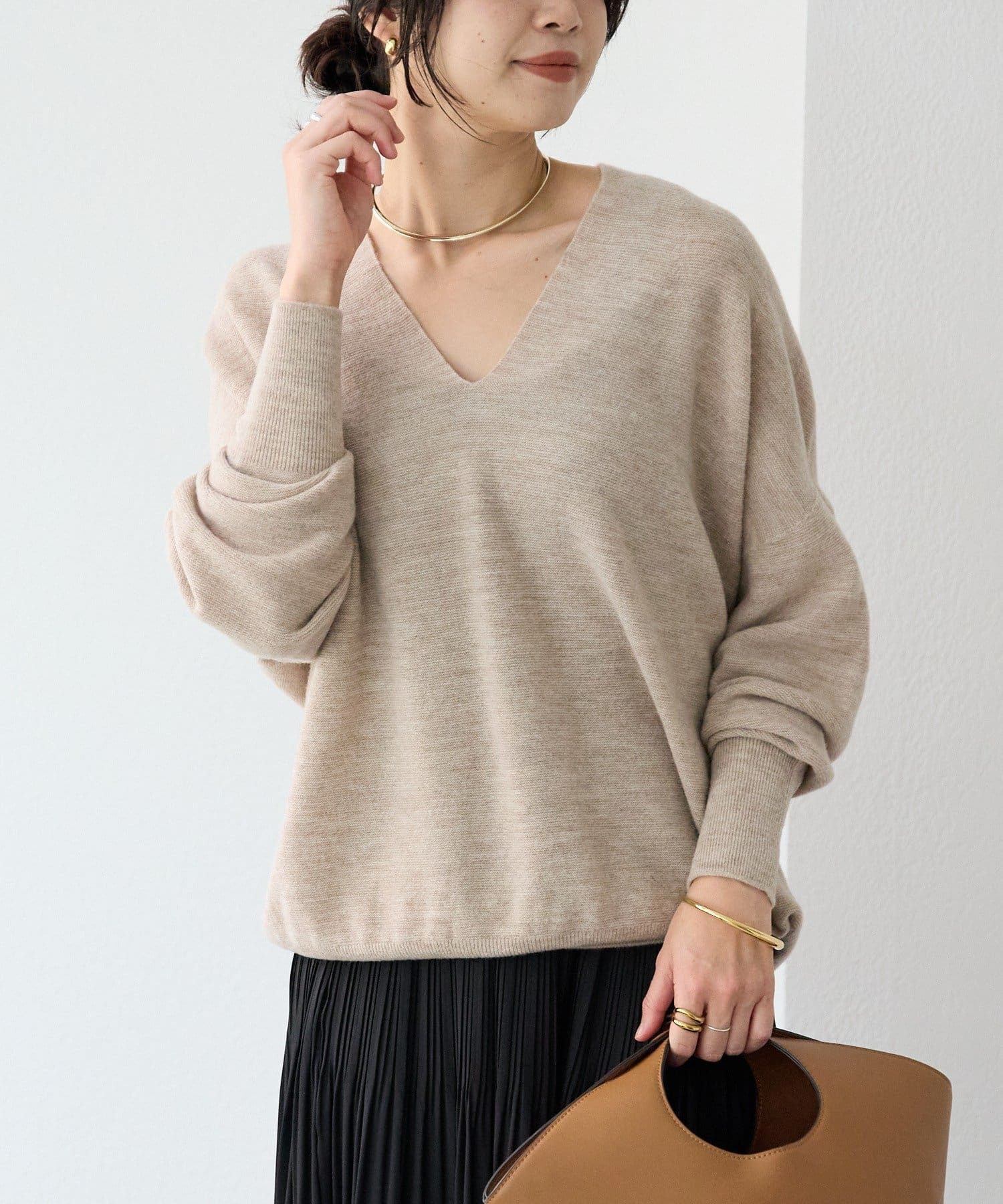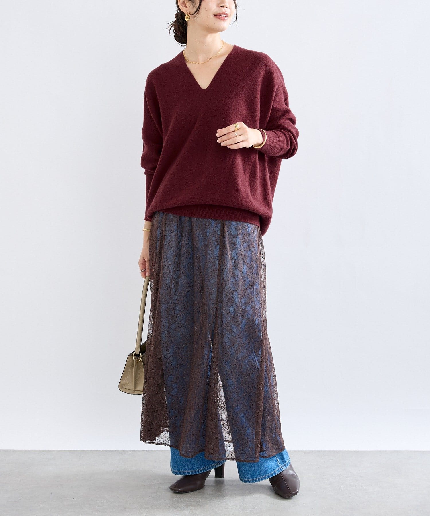 ゆとりのある着丈、身幅で着やすく、開きすぎないけれどすっきりと見える衿の開きが特徴的なニット。