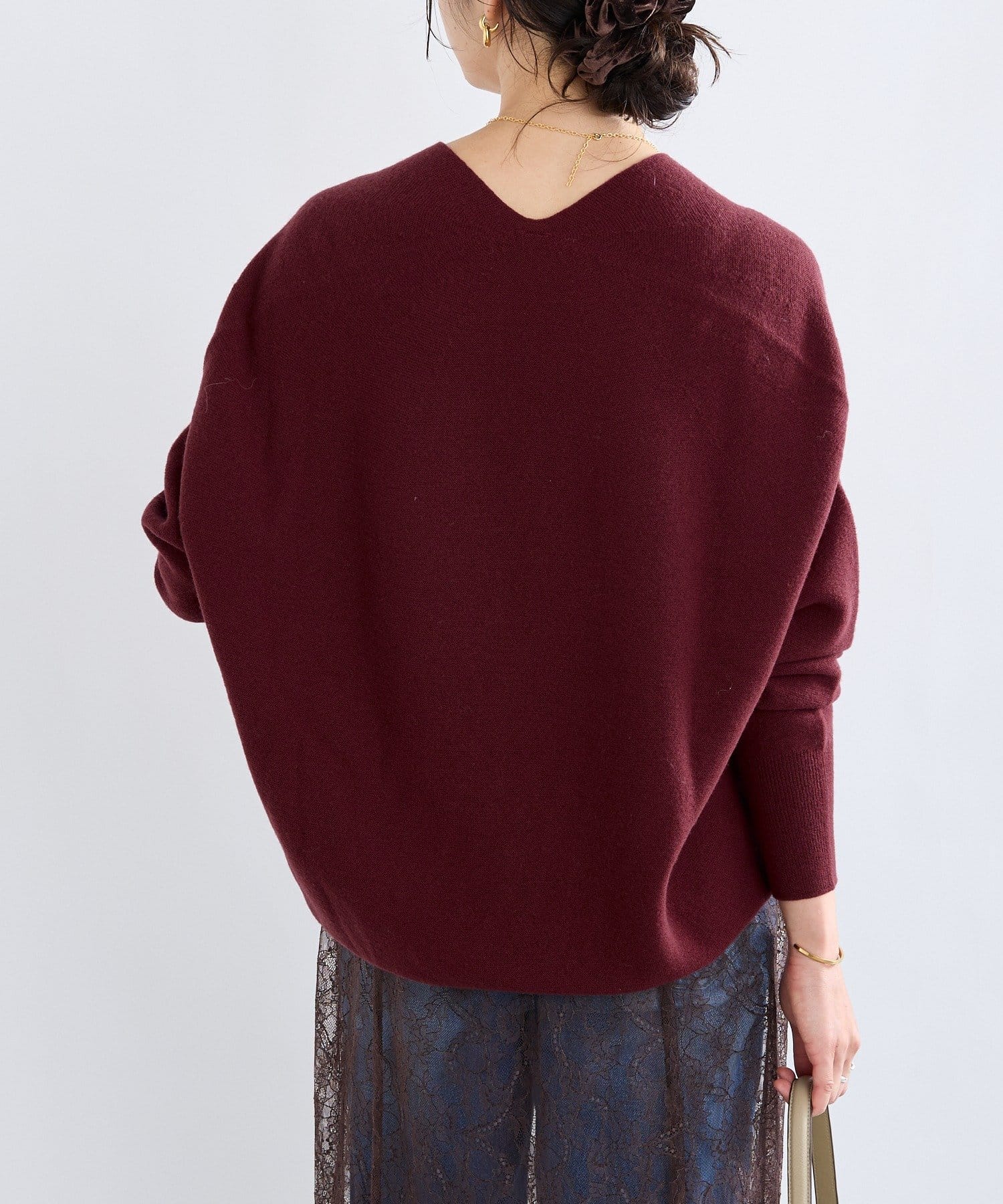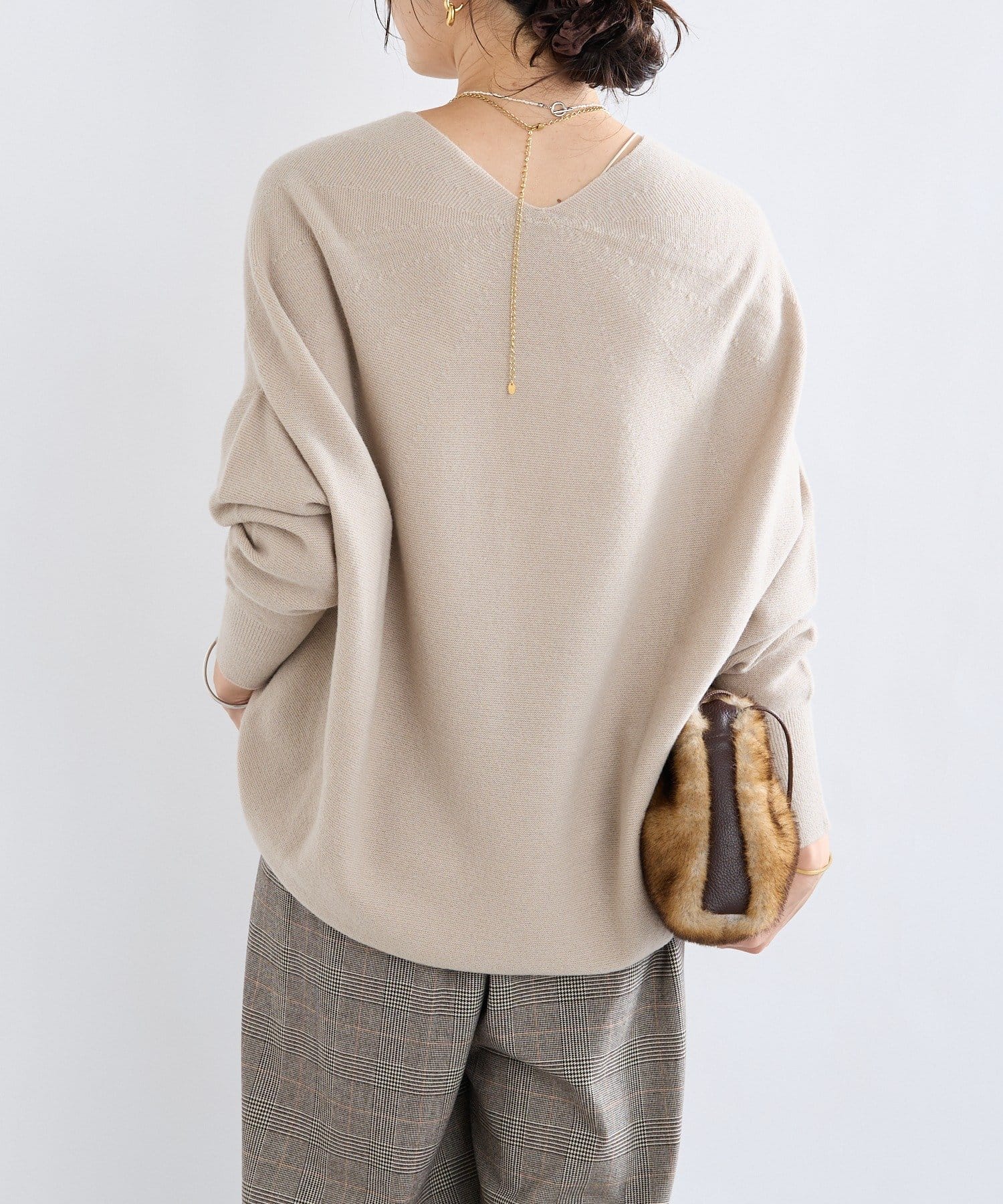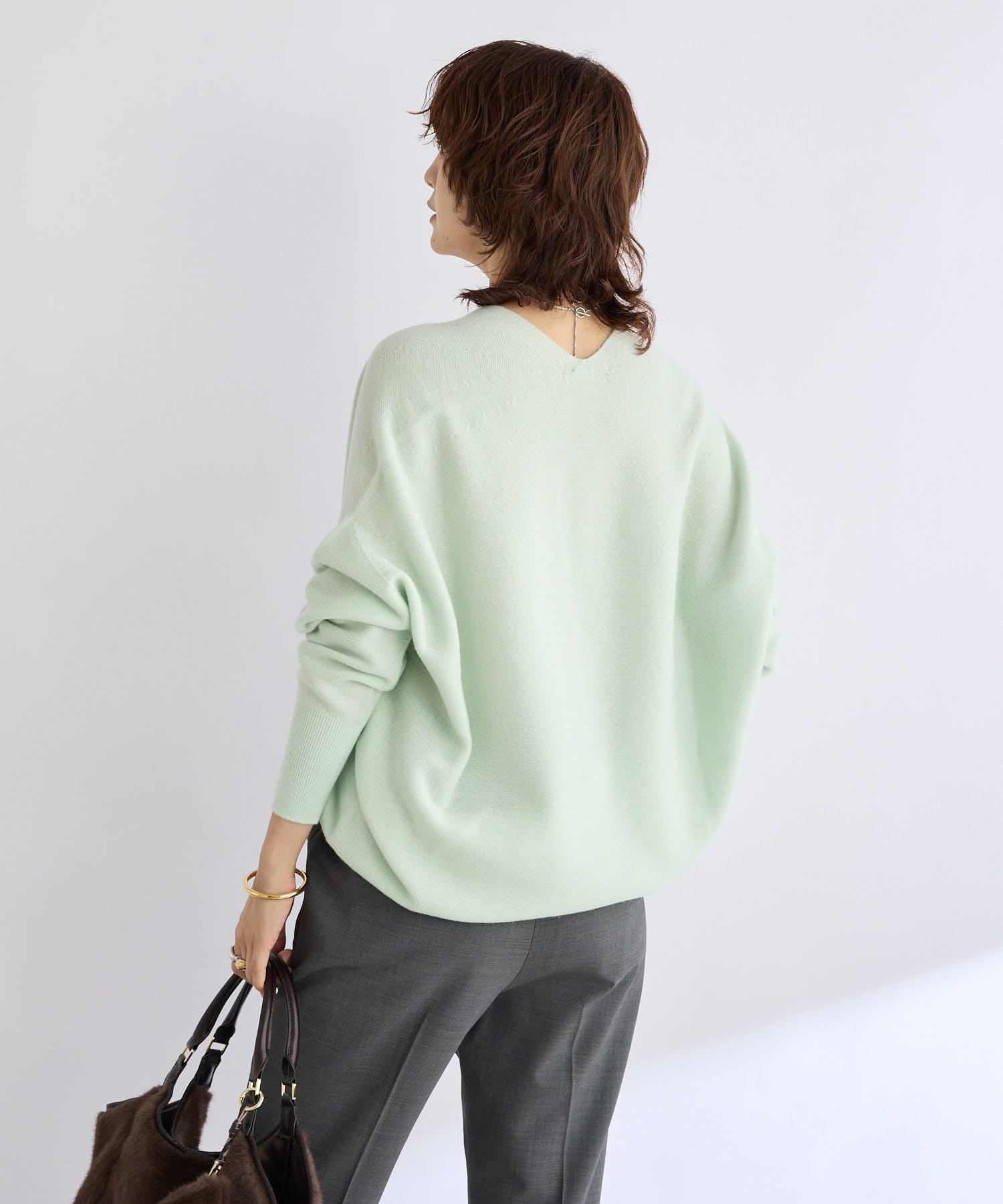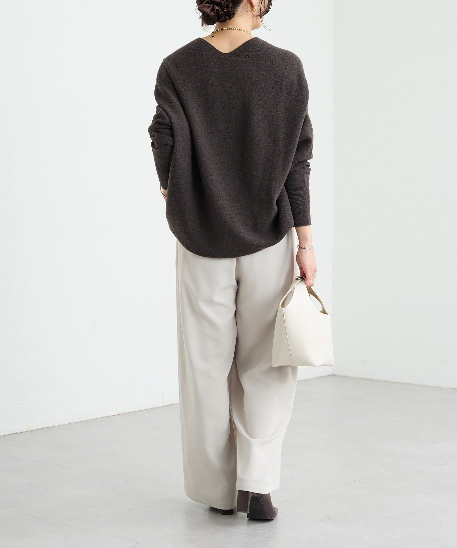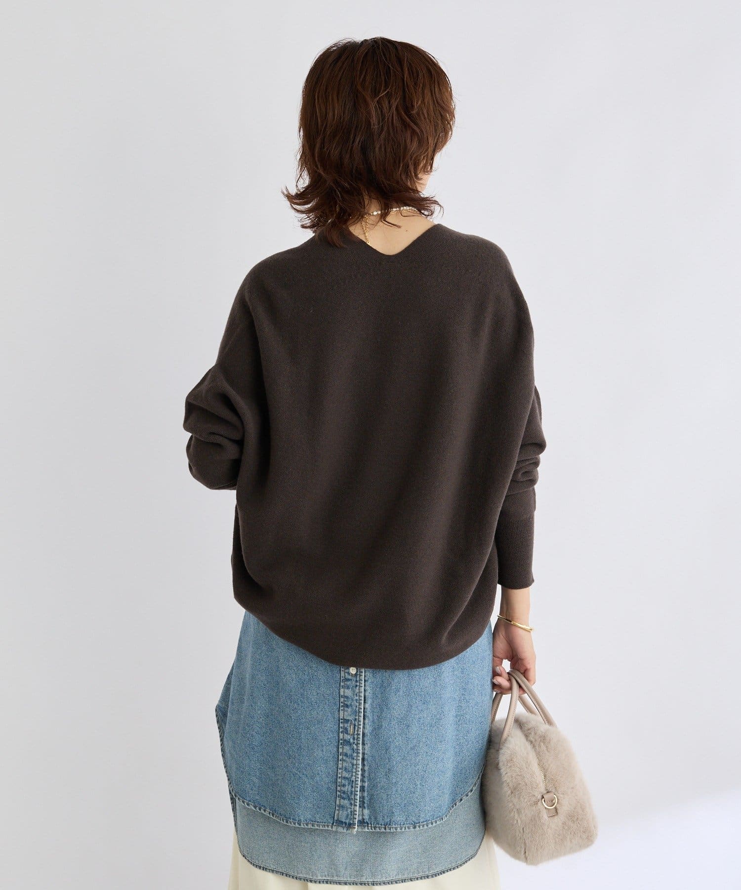 名前の通りバックにボリュームがあり、後ろ姿がすっきり見えてお尻もすっぽり隠れて細見えします。全体的にゆったりしているのですが、袖は細みでアウターを着てもごわつかないのがめちゃくちゃいいです。首周りも空きすぎず、肩が落ちたりせず着やすい。Vネックなので顔周りはすっきり見えます。ニットなのに細見えシルエットで綺麗です。ホワイトでも膨張しません。目が詰まったニットでめちゃくちゃ暖かそう