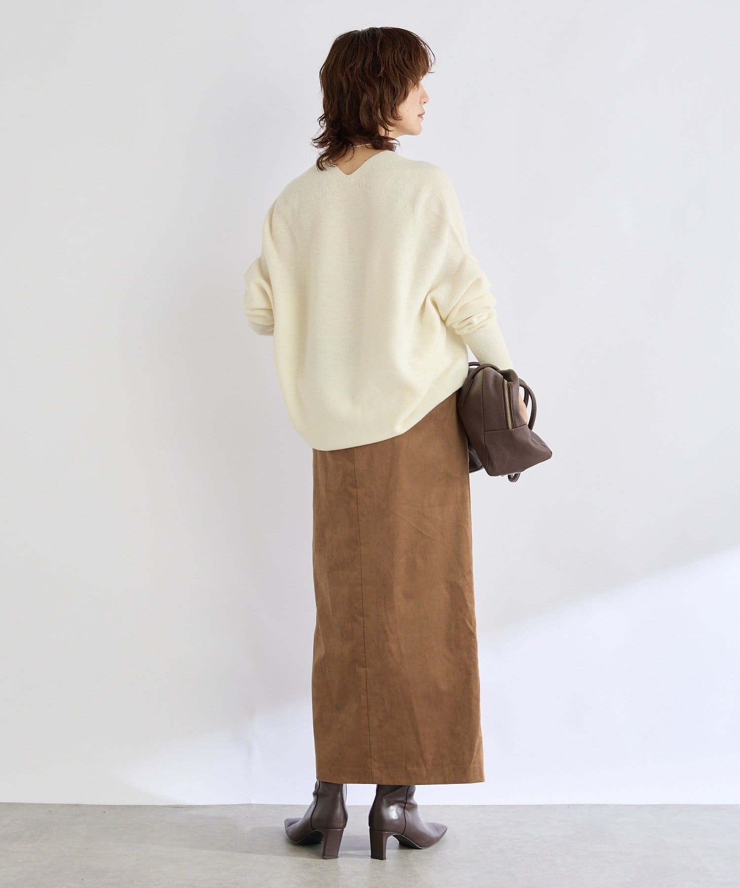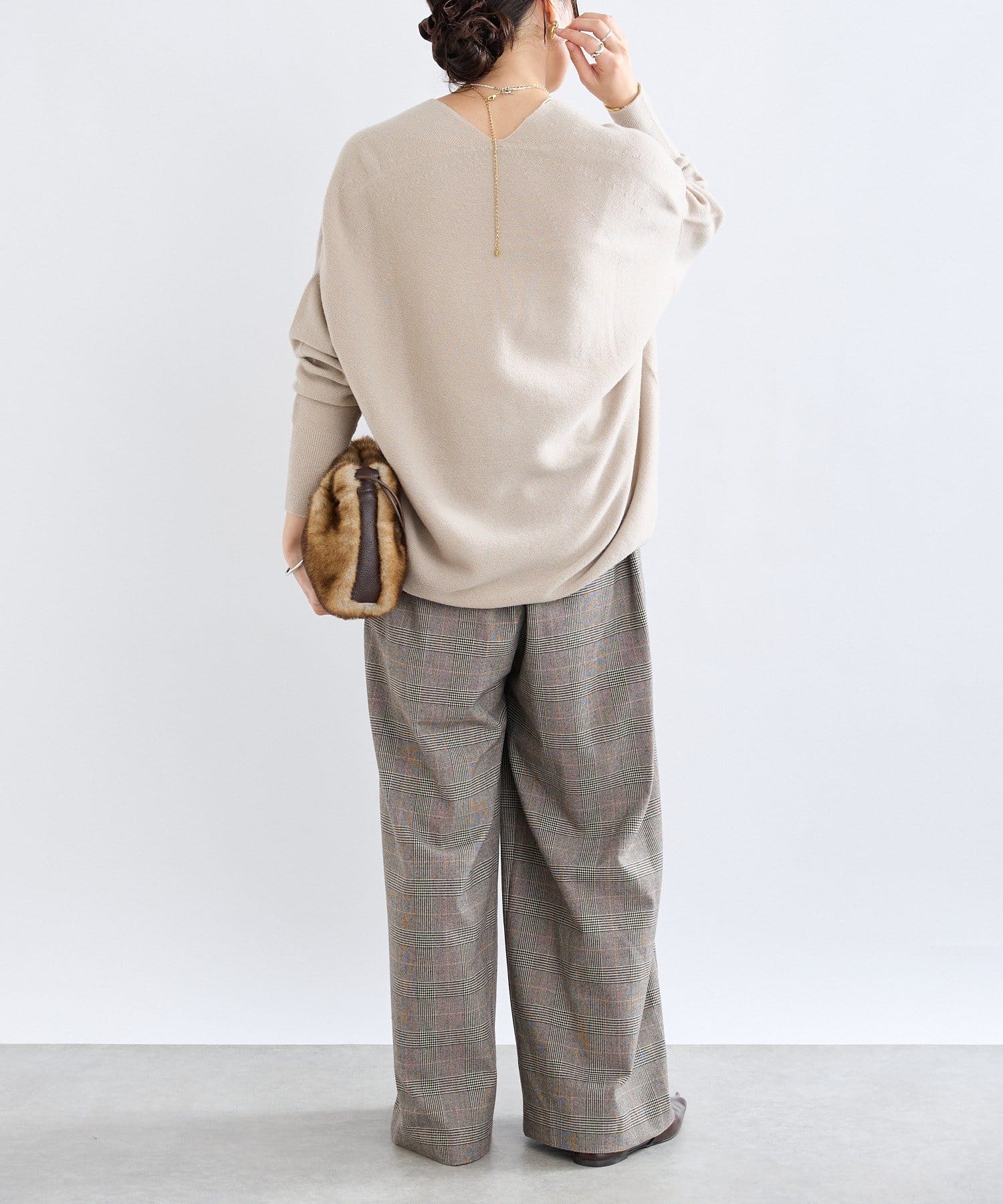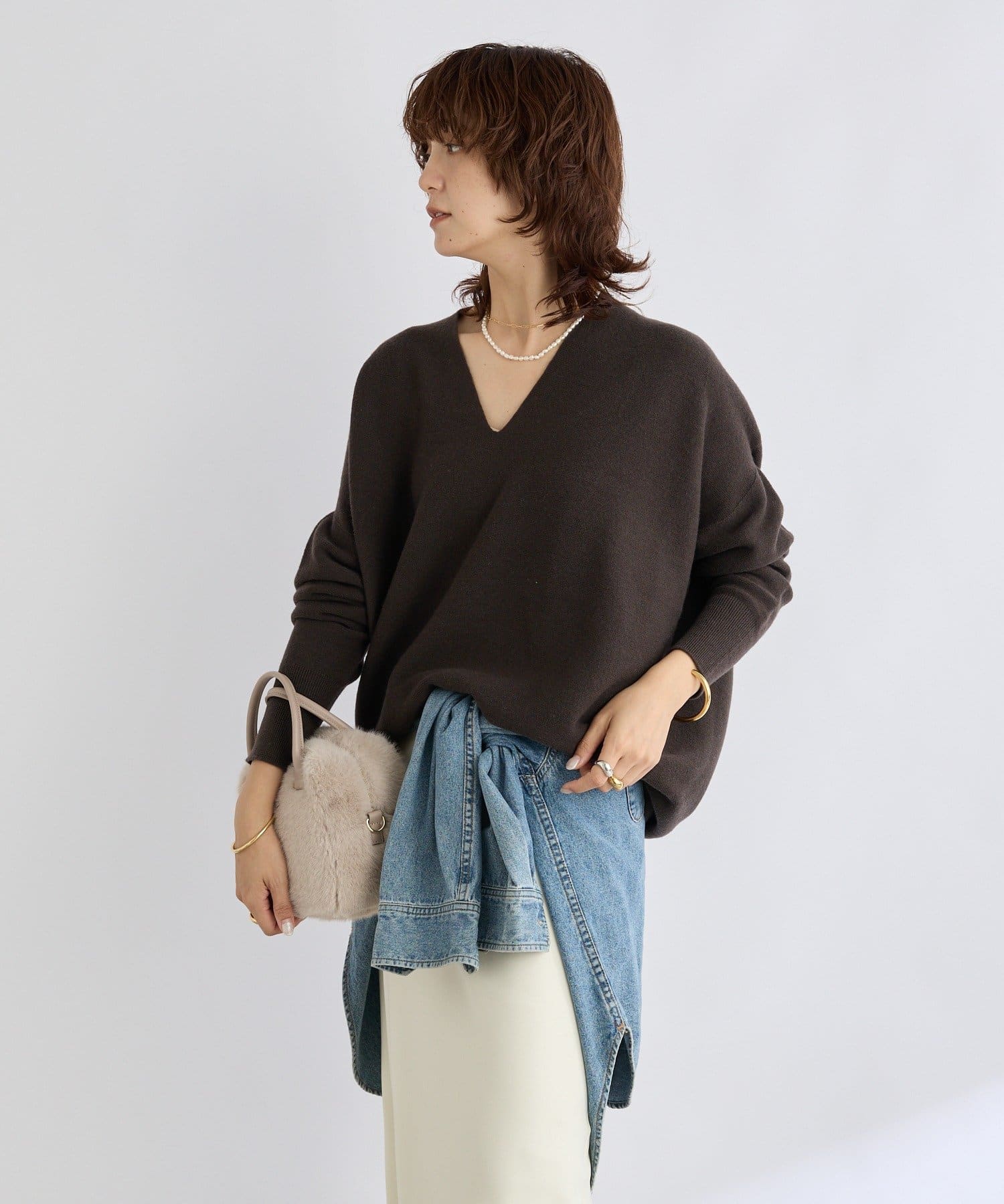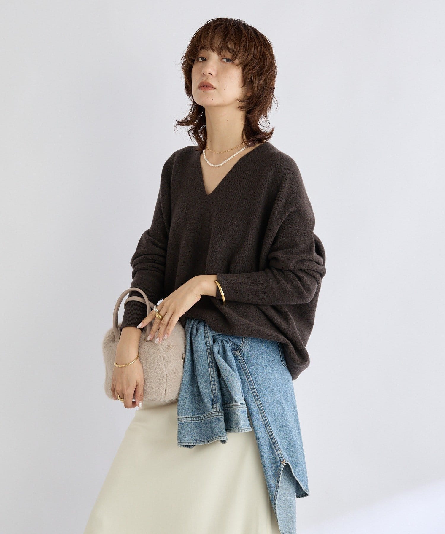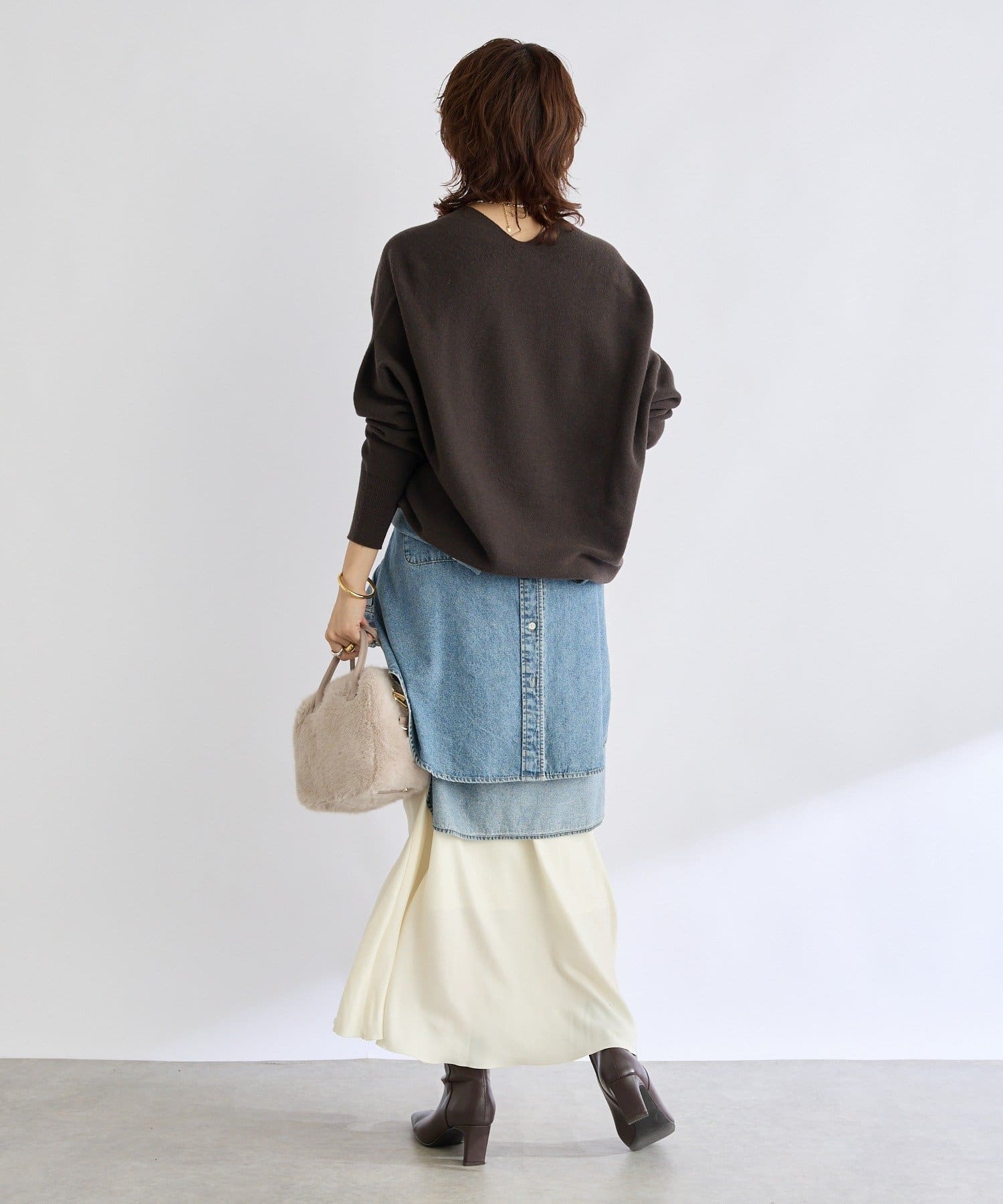 名前の通りバックにボリュームがあり、後ろ姿がすっきり見えてお尻もすっぽり隠れて細見えします。全体的にゆったりしているのですが、袖は細みでアウターを着てもごわつかないのがめちゃくちゃいいです。首周りも空きすぎず、肩が落ちたりせず着やすい。Vネックなので顔周りはすっきり見えます。ニットなのに細見えシルエットで綺麗です。ホワイトでも膨張しません。目が詰まったニットでめちゃくちゃ暖かそう