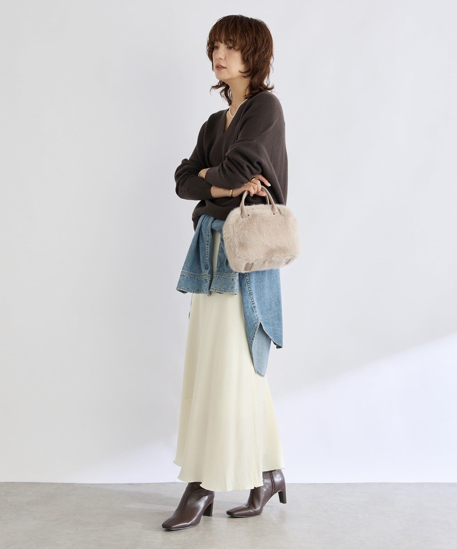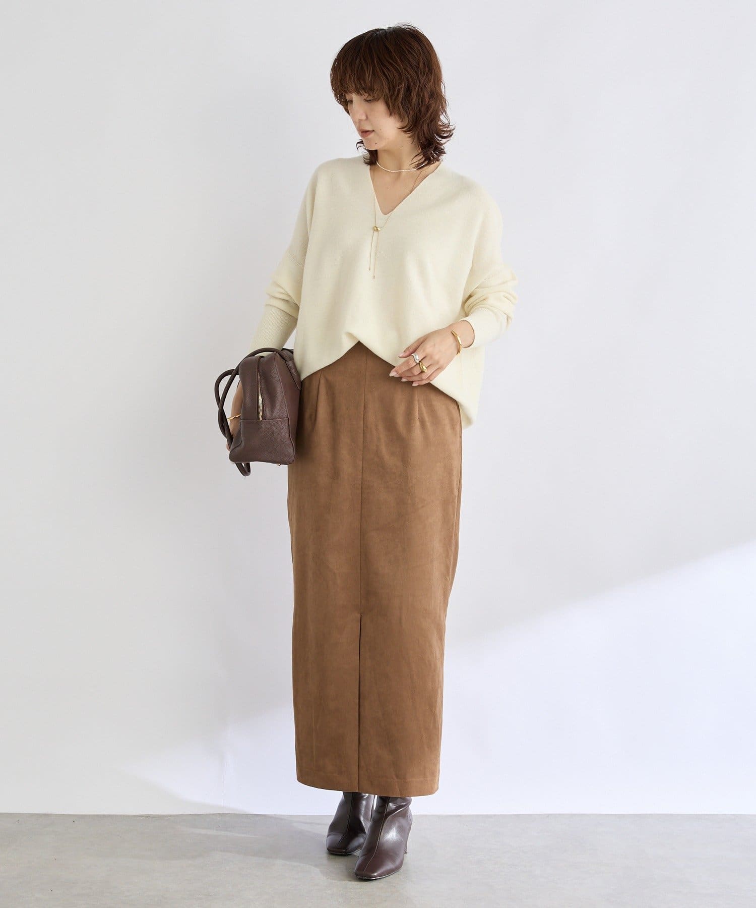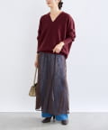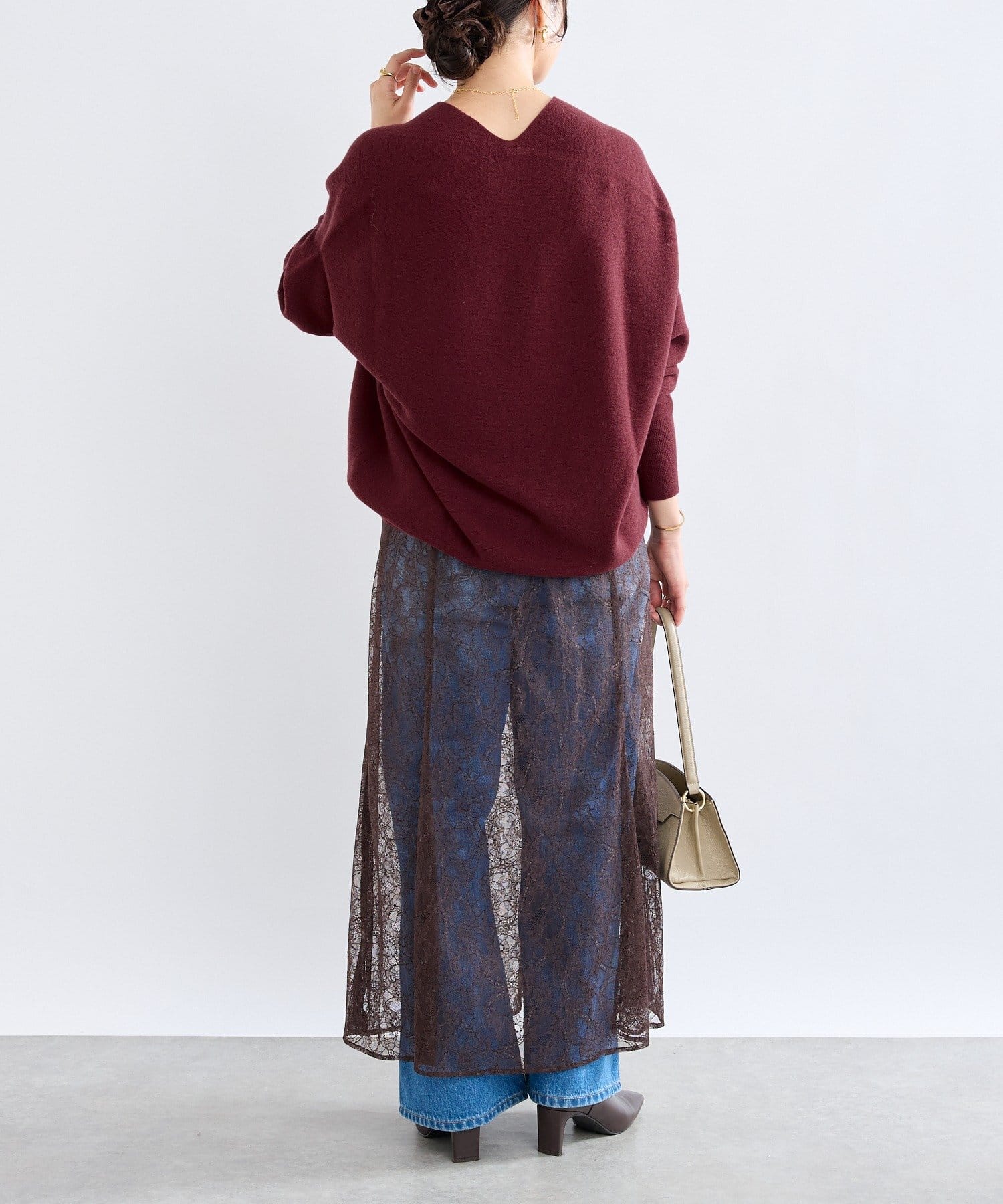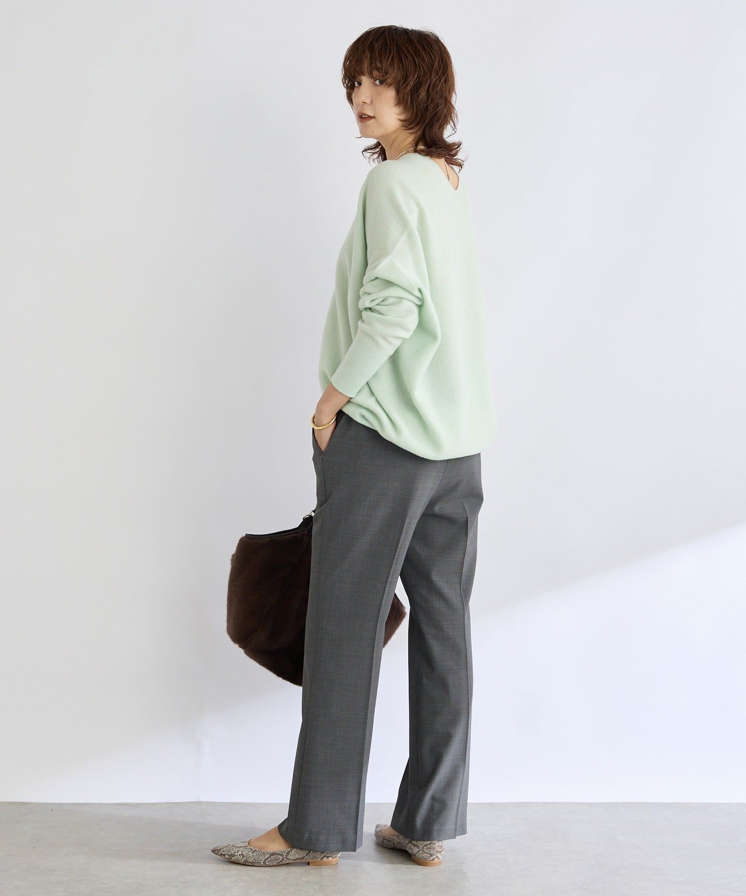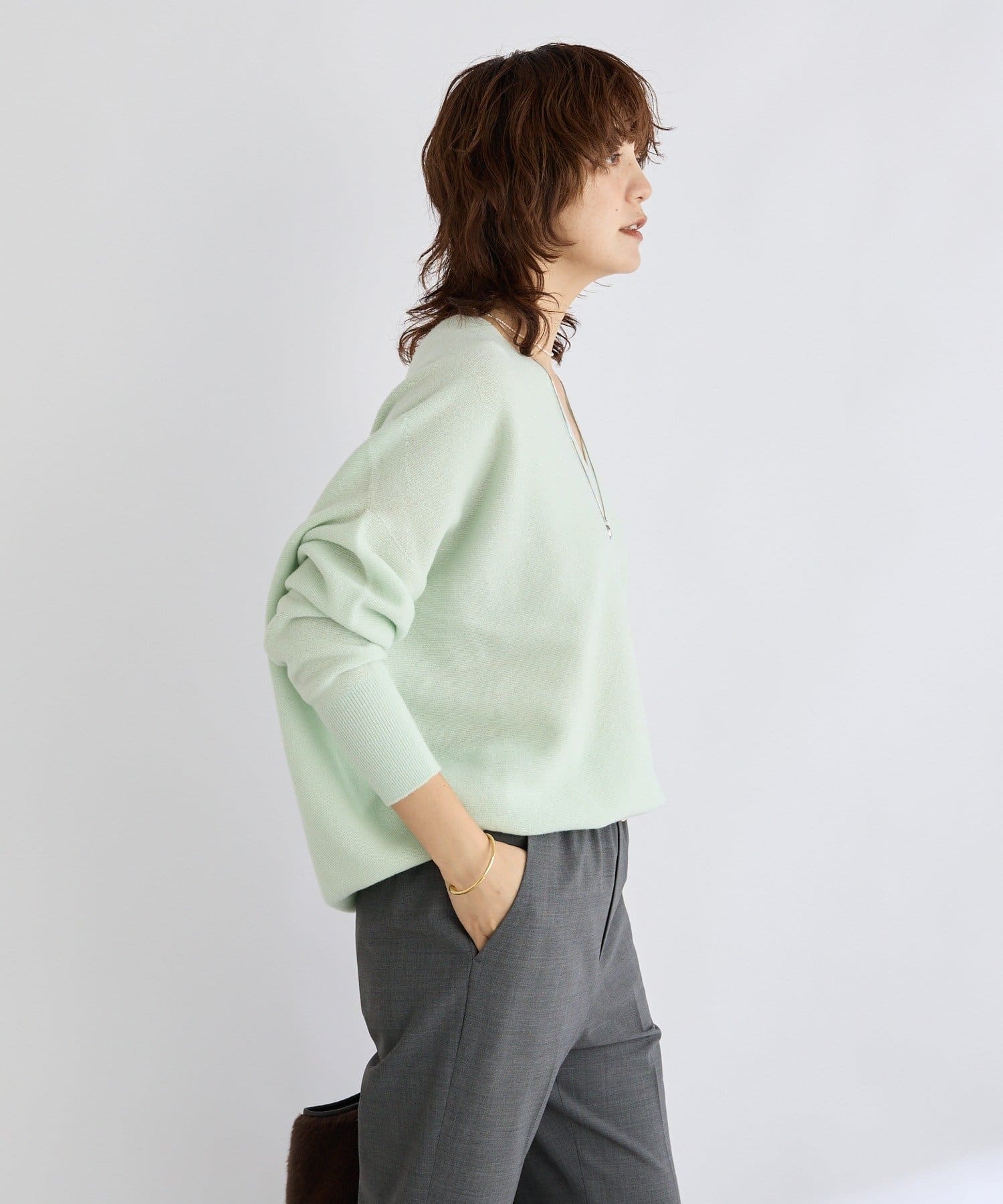 名前の通りバックにボリュームがあり、後ろ姿がすっきり見えてお尻もすっぽり隠れて細見えします。全体的にゆったりしているのですが、袖は細みでアウターを着てもごわつかないのがめちゃくちゃいいです。首周りも空きすぎず、肩が落ちたりせず着やすい。Vネックなので顔周りはすっきり見えます。ニットなのに細見えシルエットで綺麗です。ホワイトでも膨張しません。目が詰まったニットでめちゃくちゃ暖かそう