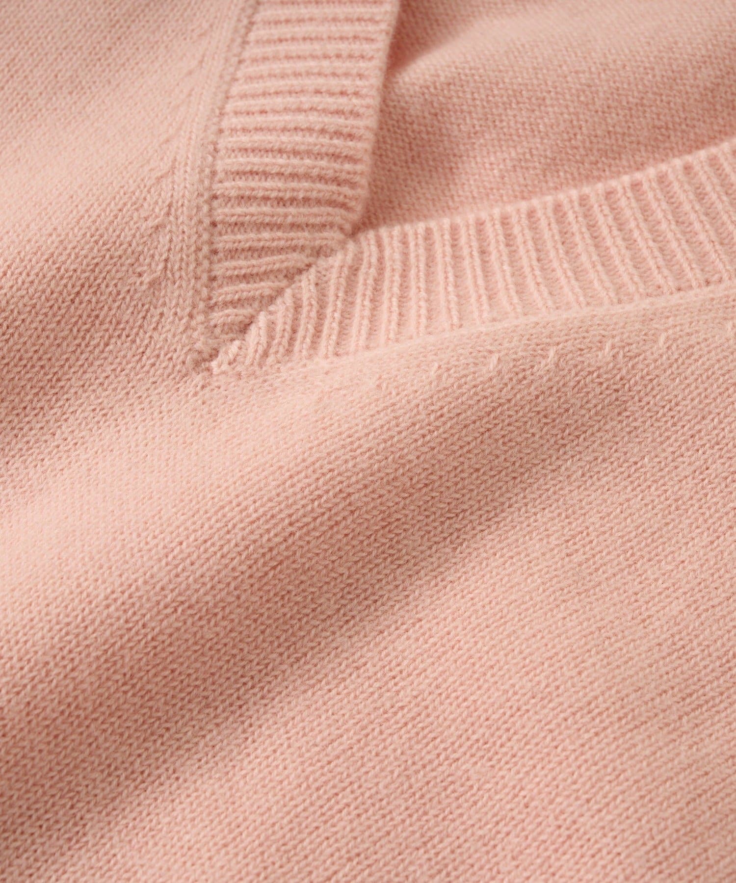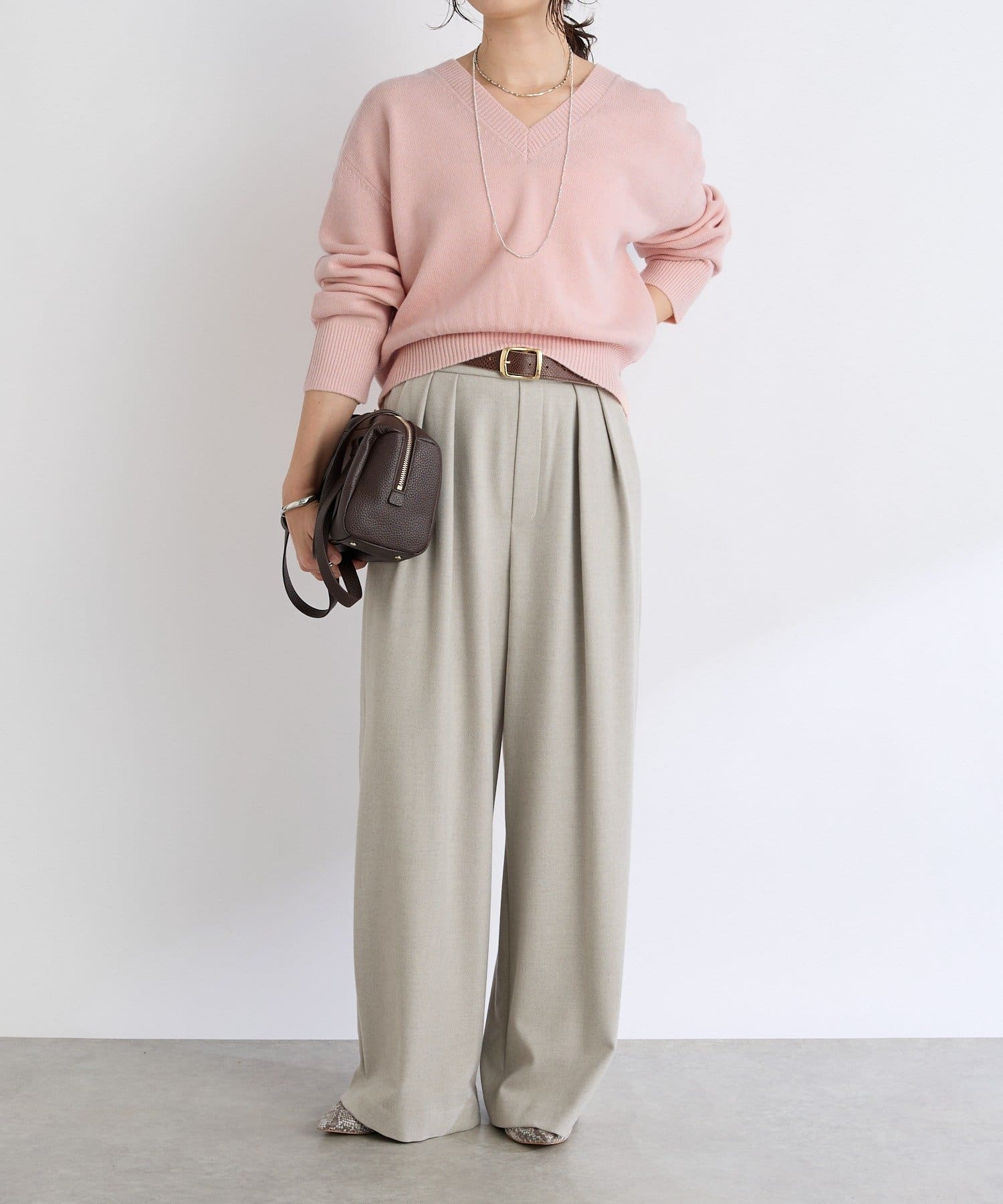 ・深めのVネックと細めの衿巾で女性らしいデコルテラインに