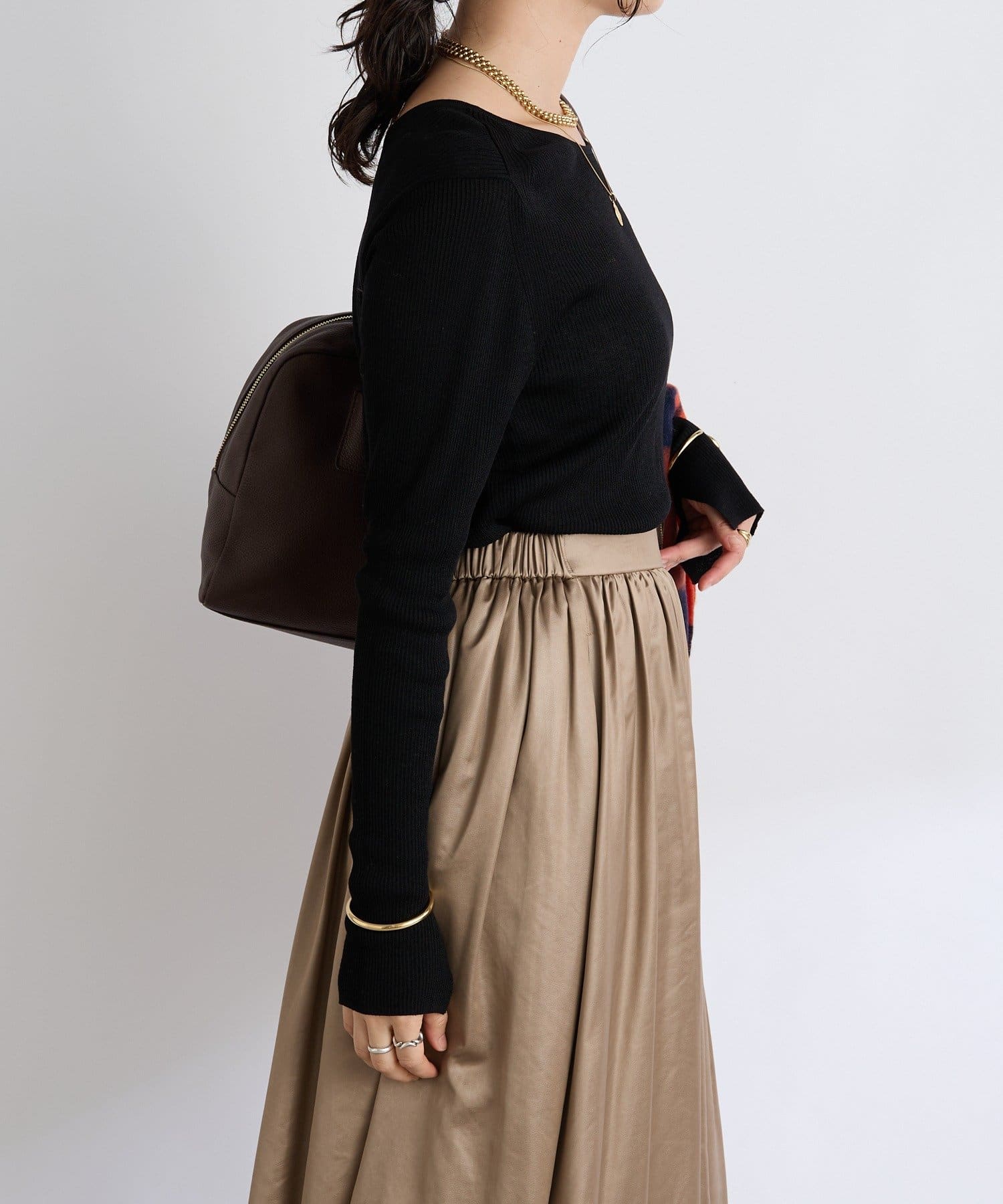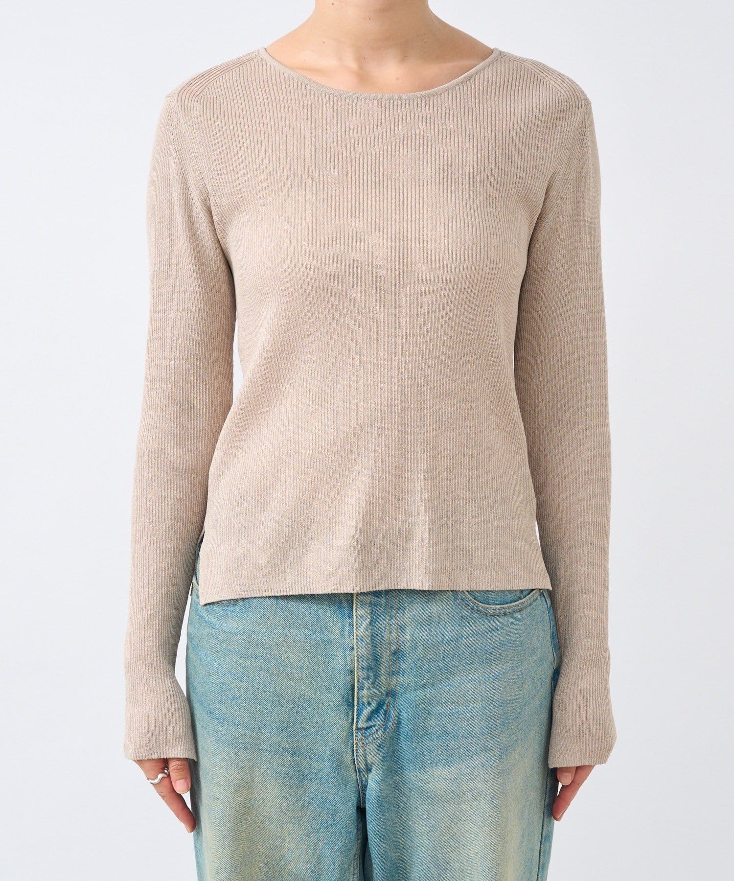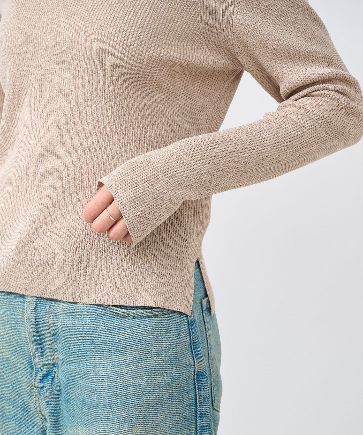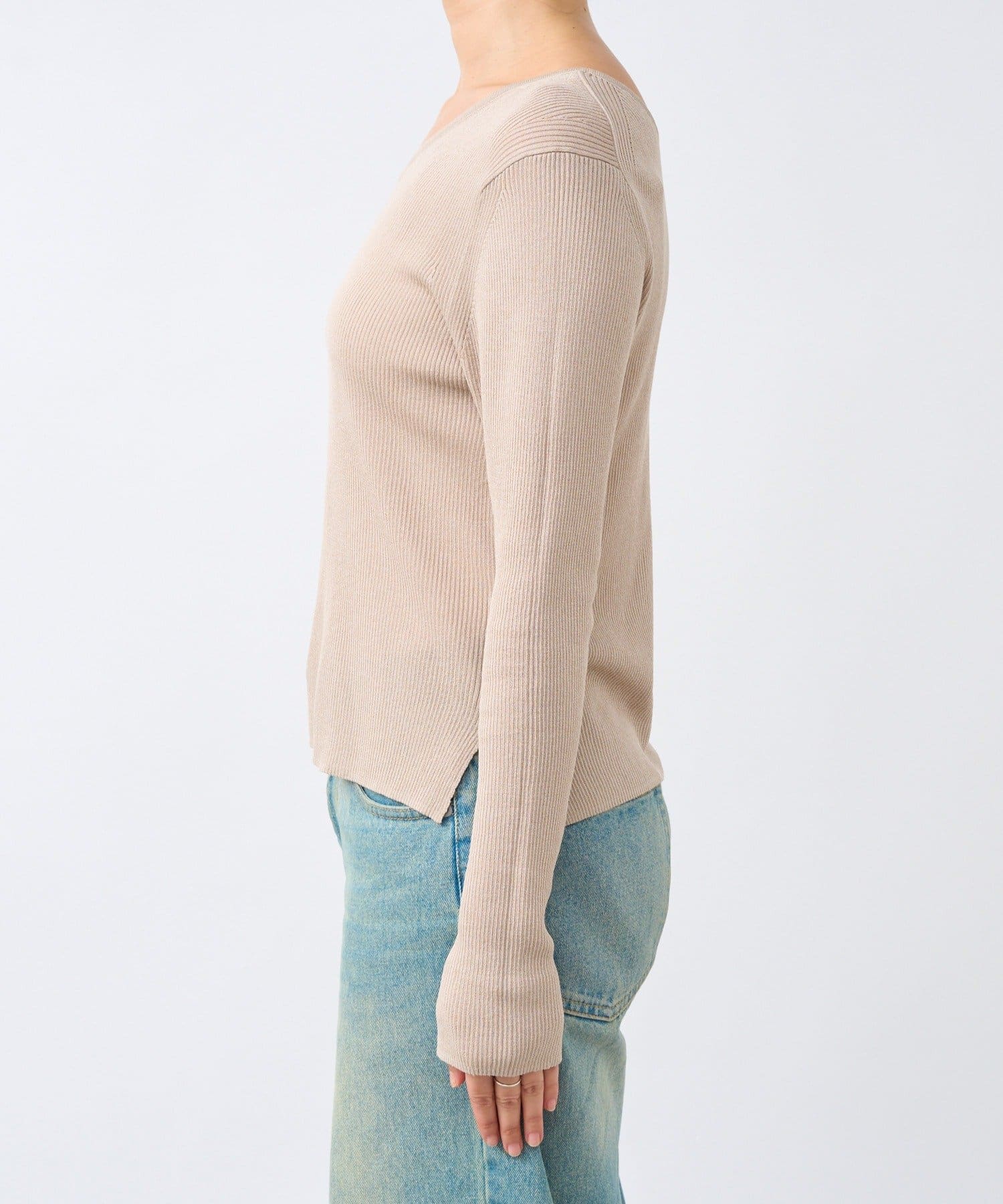 ・ミニマルなデザインのリブニットに、さりげなく袖ぐりと肩にかけて入れた編立てのディテールがポイント