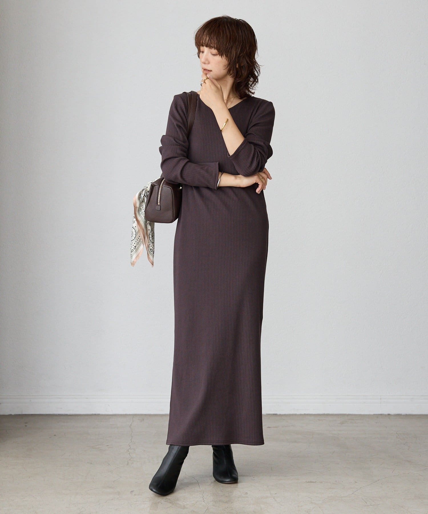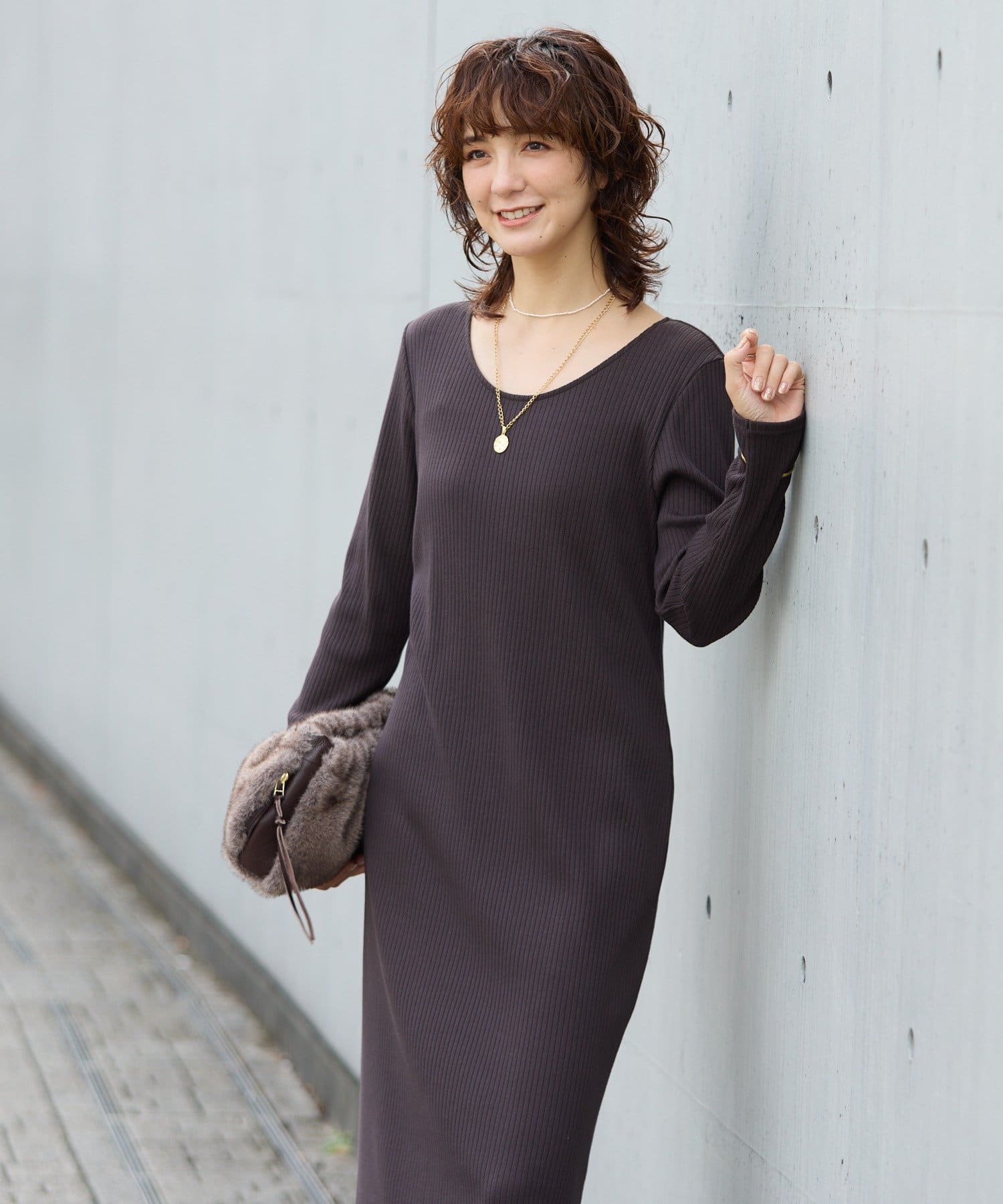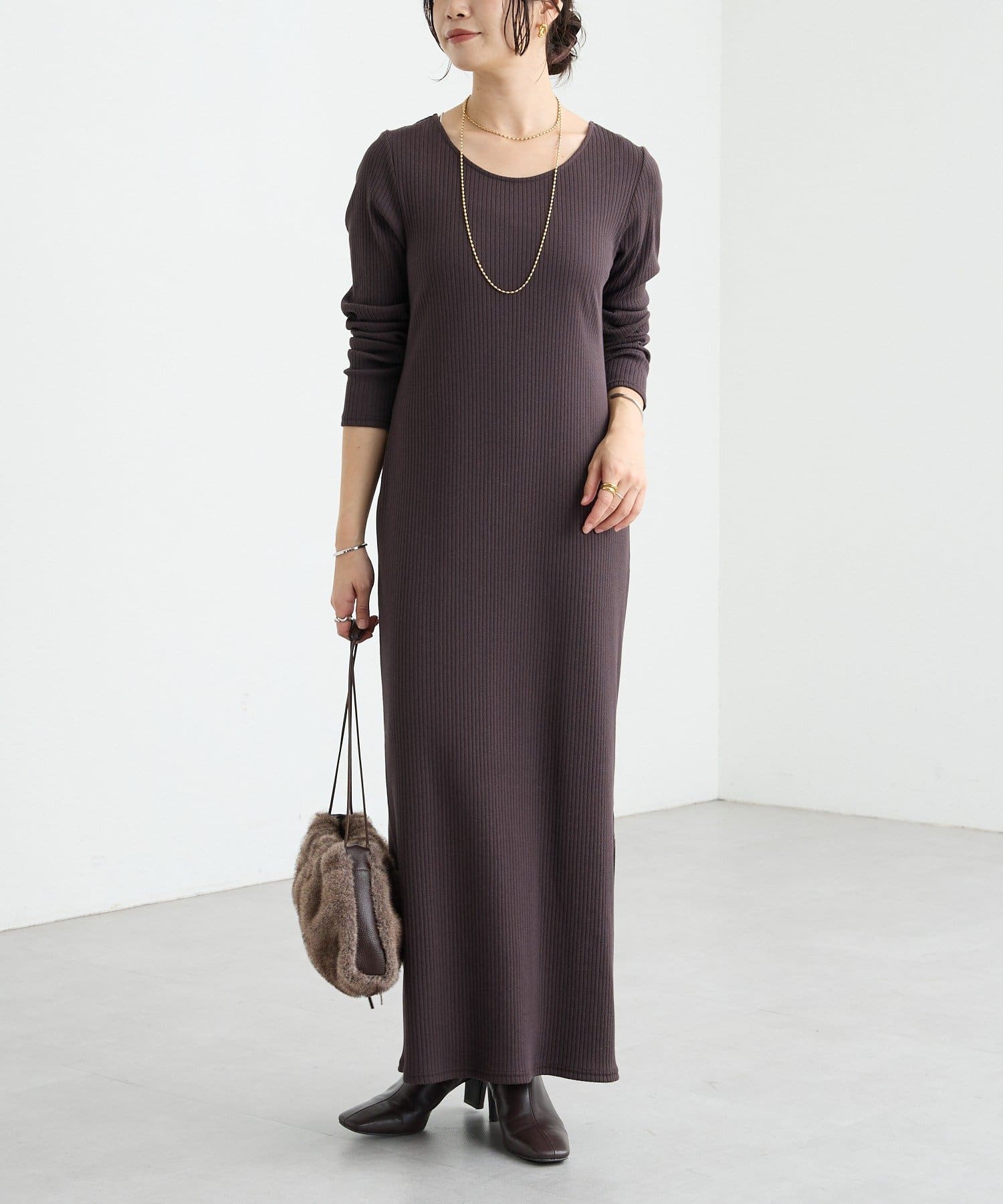 ・長いシーズン着やすい袖付きのデザインのリブワンピース。