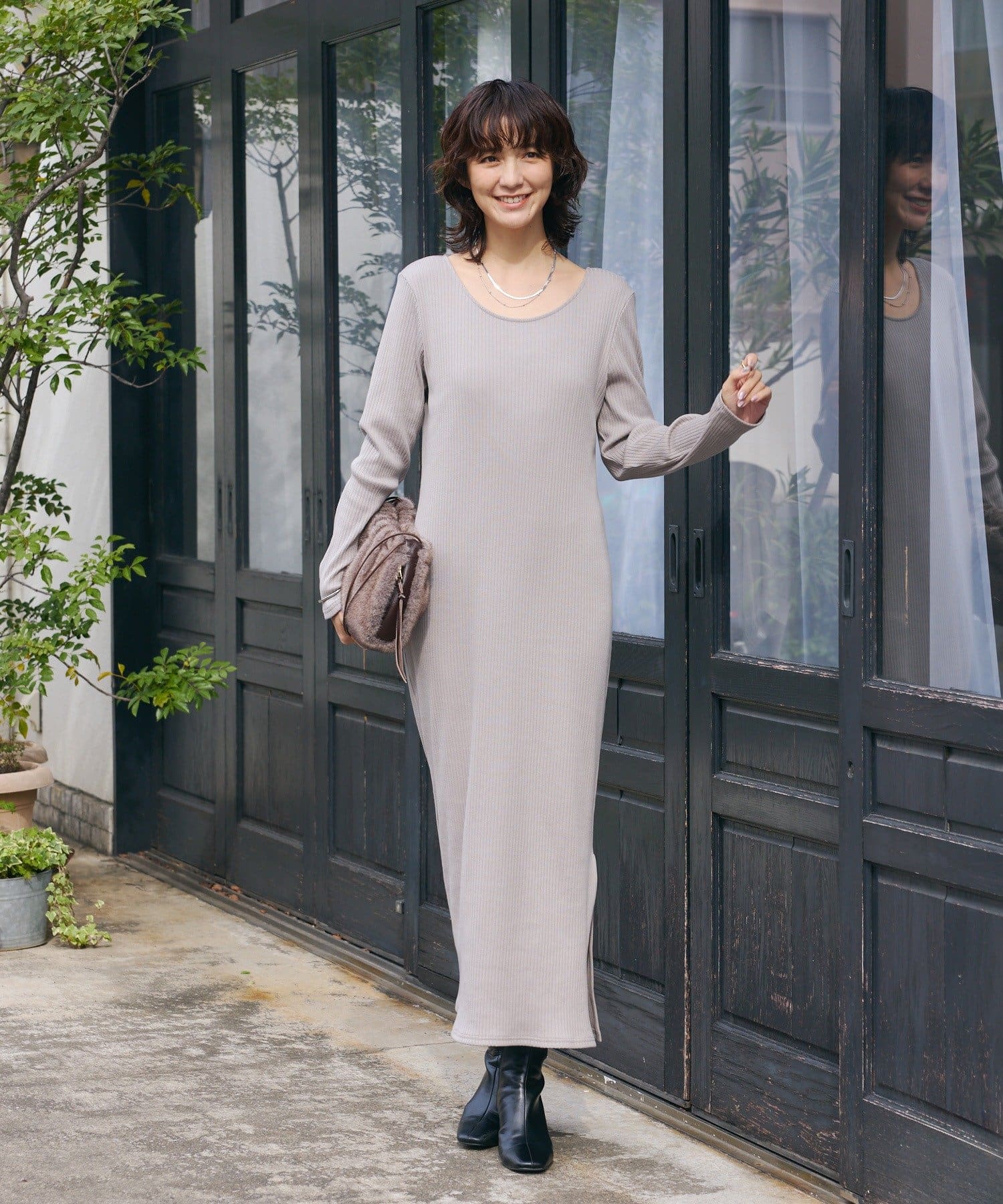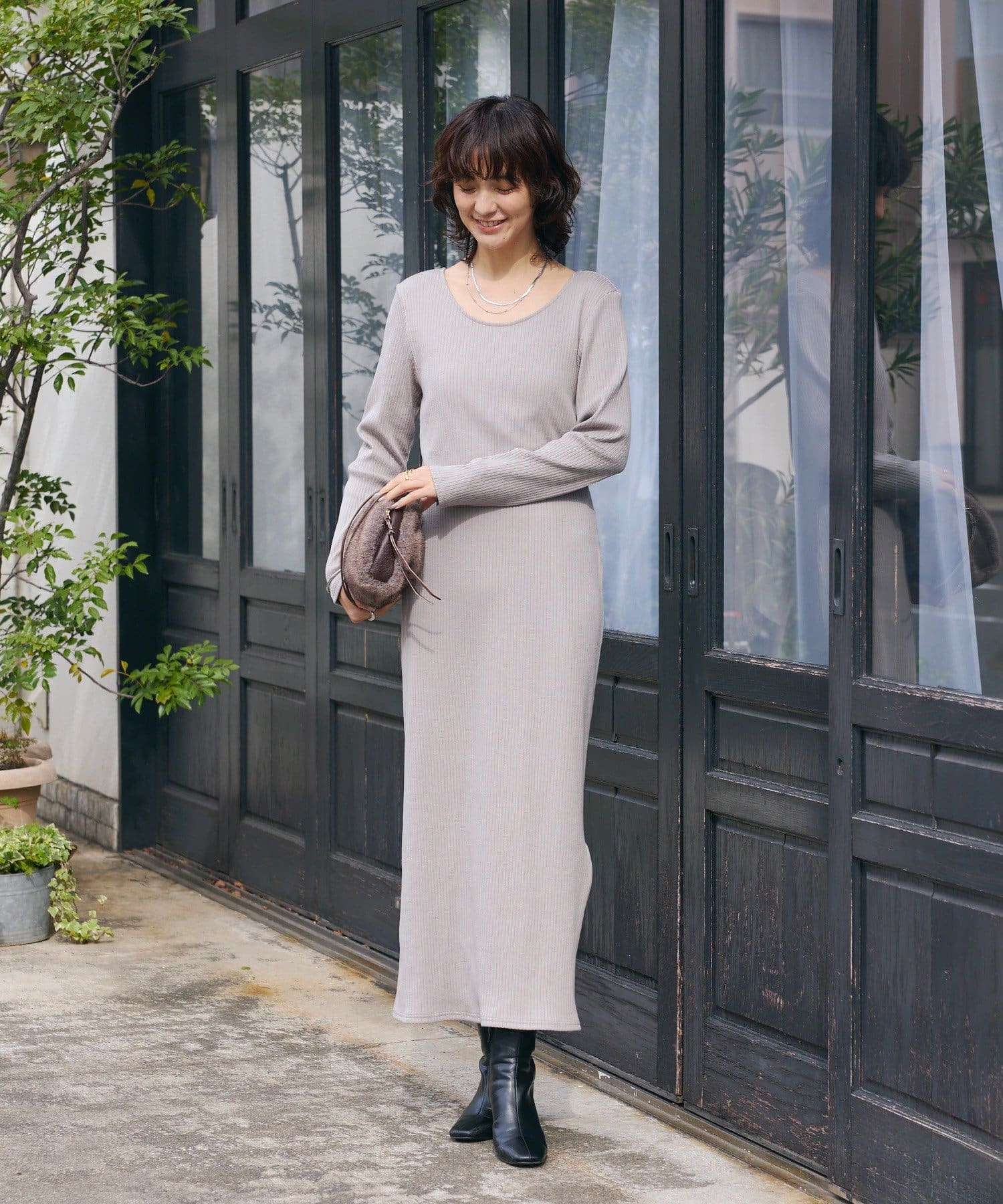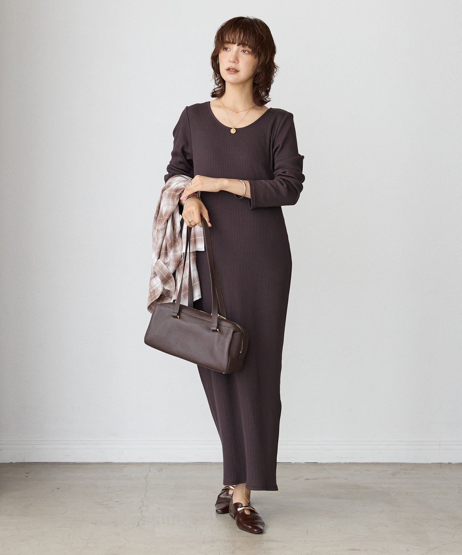 ・長いシーズン着やすい袖付きのデザインのリブワンピース。