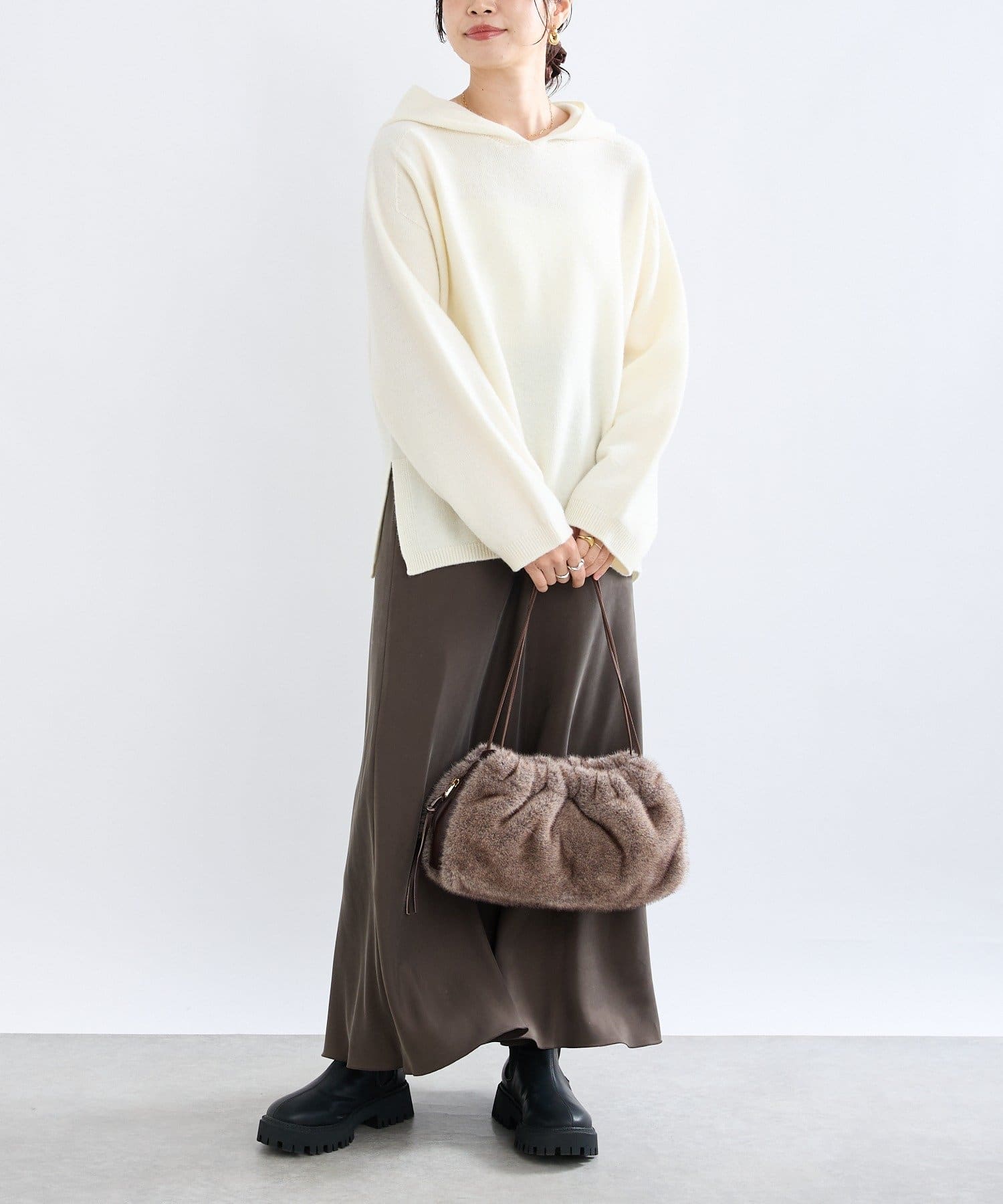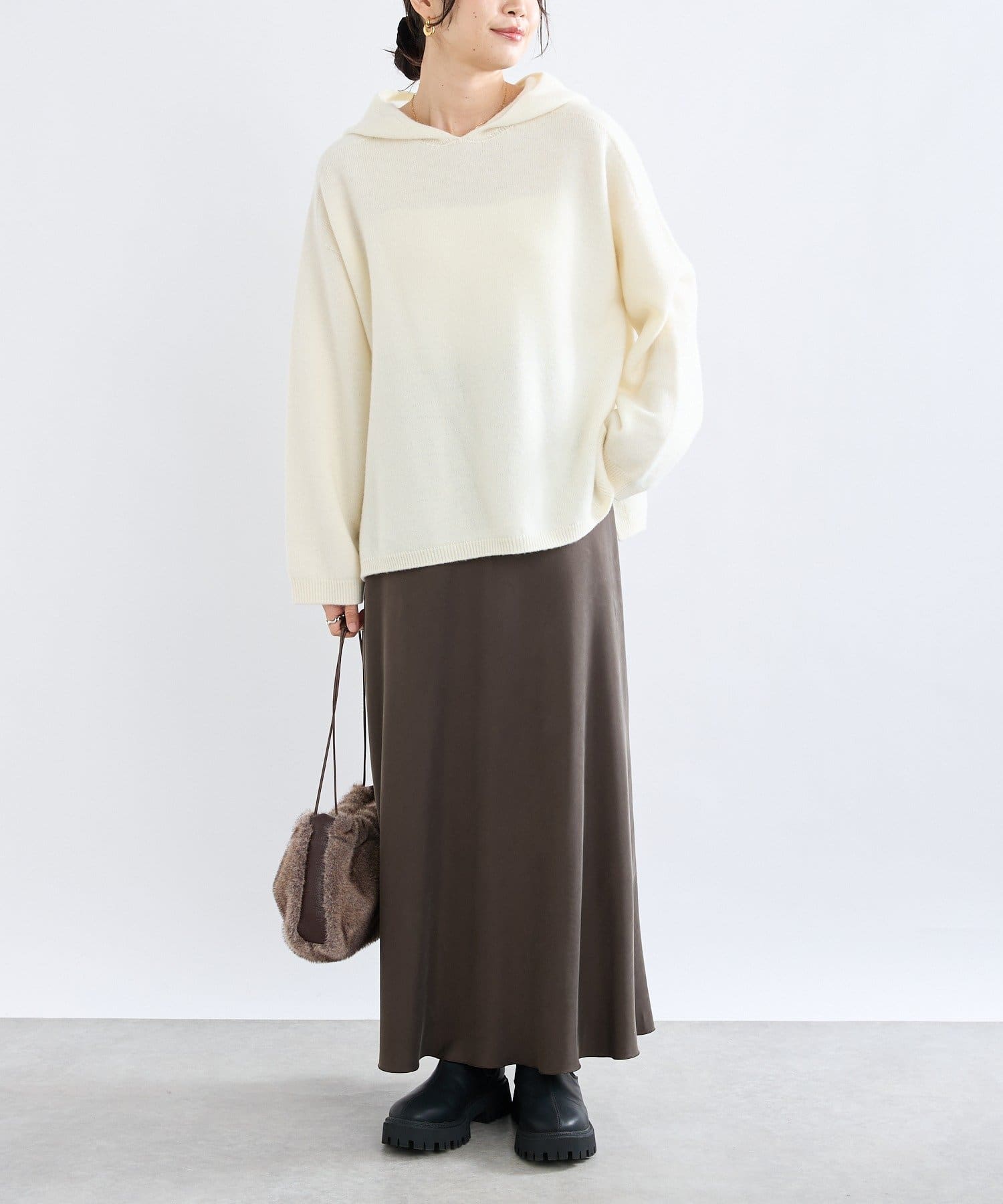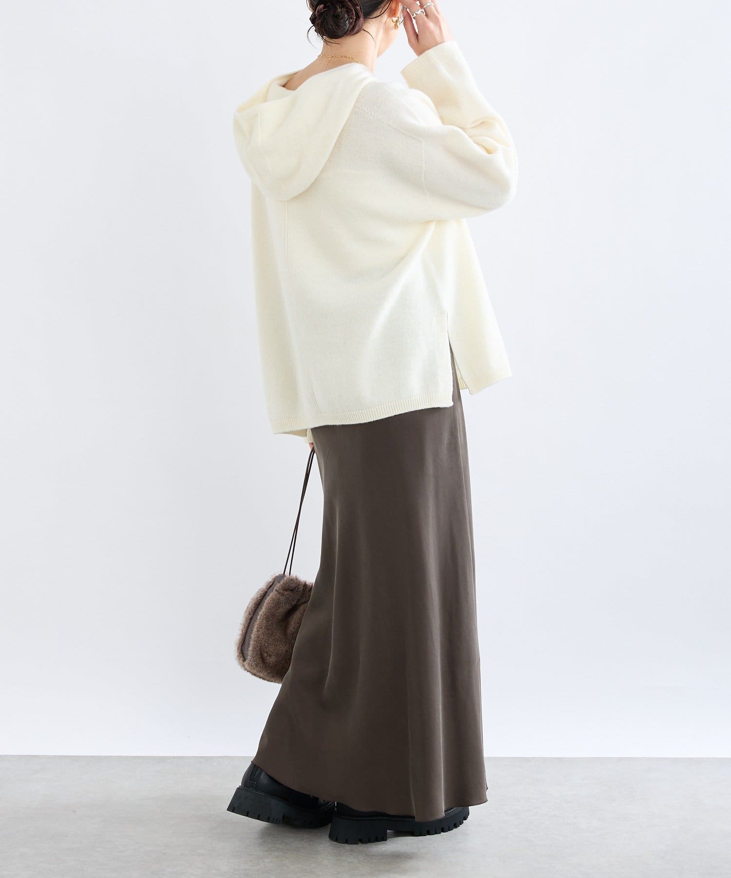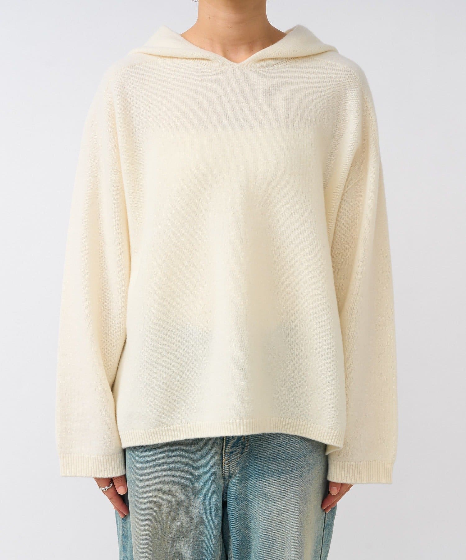 ・ホールガーメント編みで編み上げた立体的なフード付きプルオーバー。
