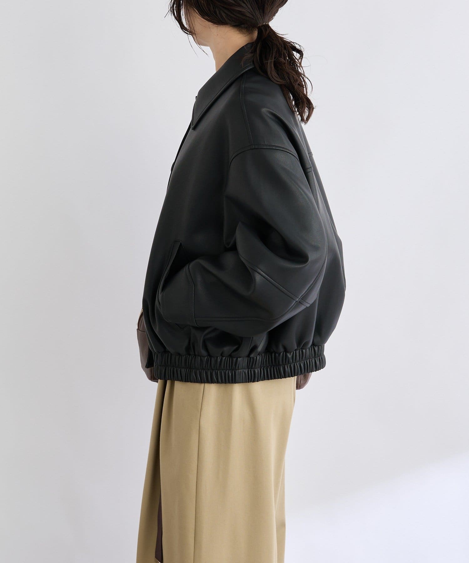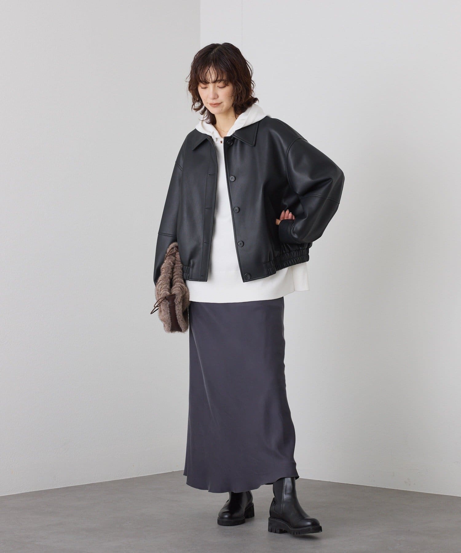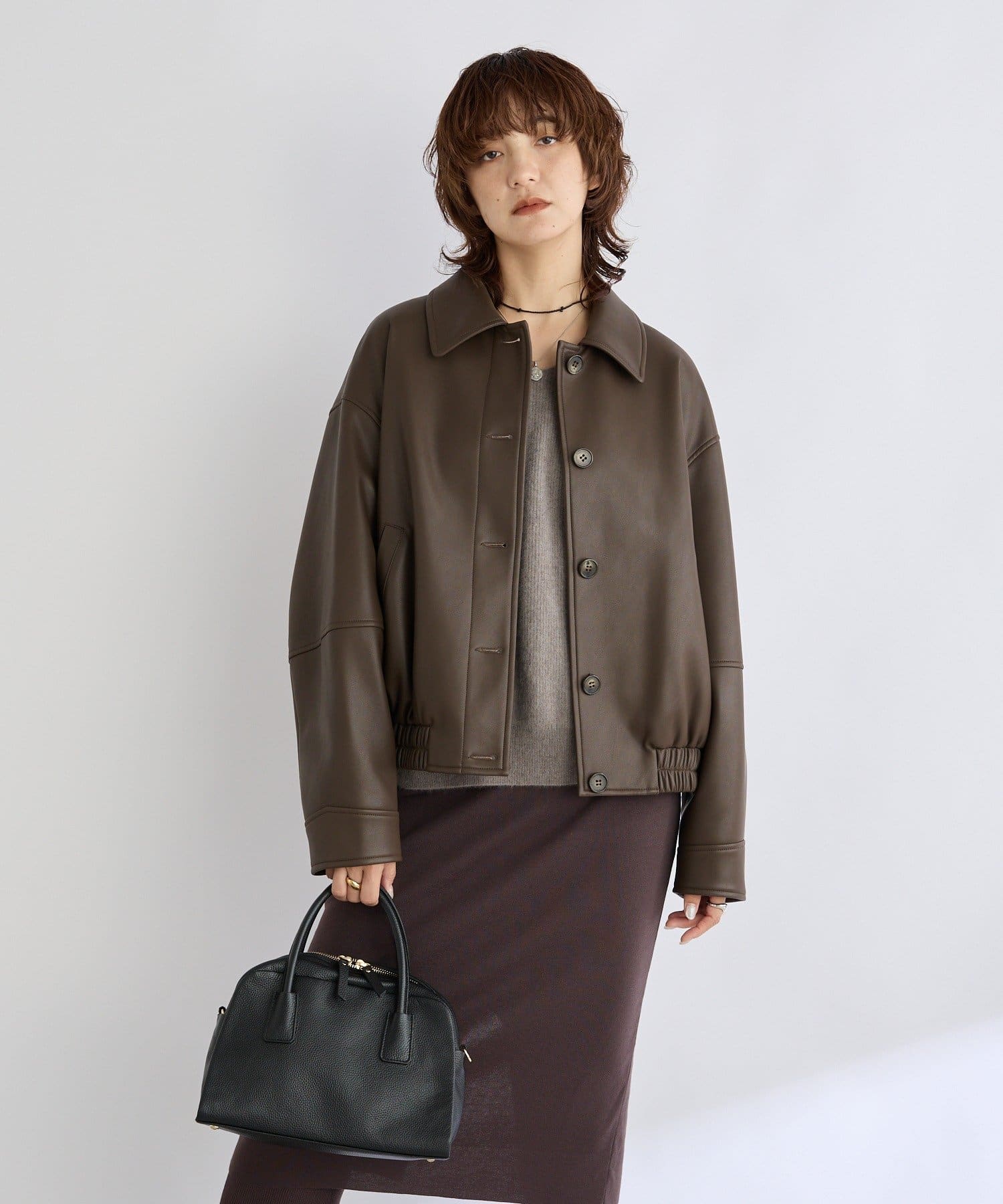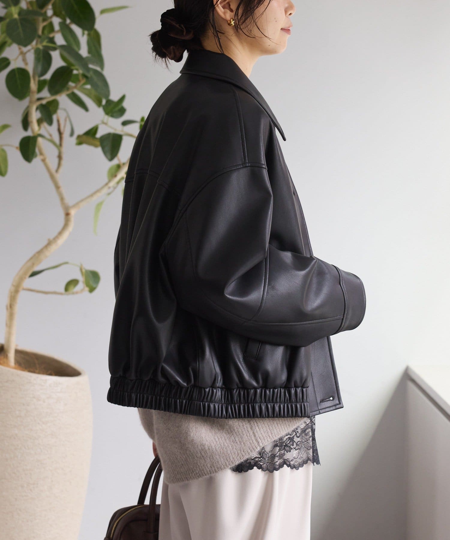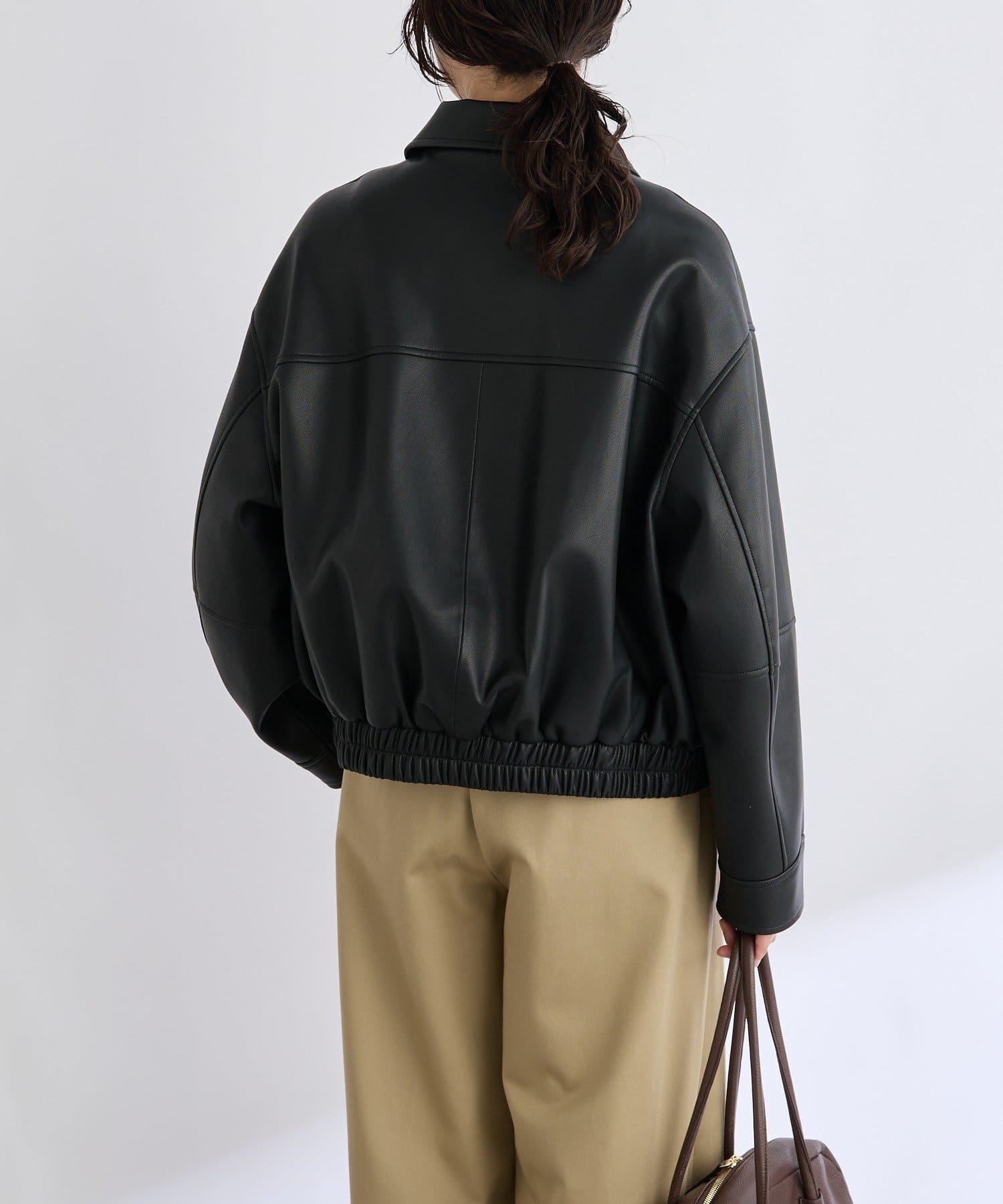 ・リアルレザーを思わせるソフトでしっとりとした合成皮革を使用したミドル丈ブルゾン。