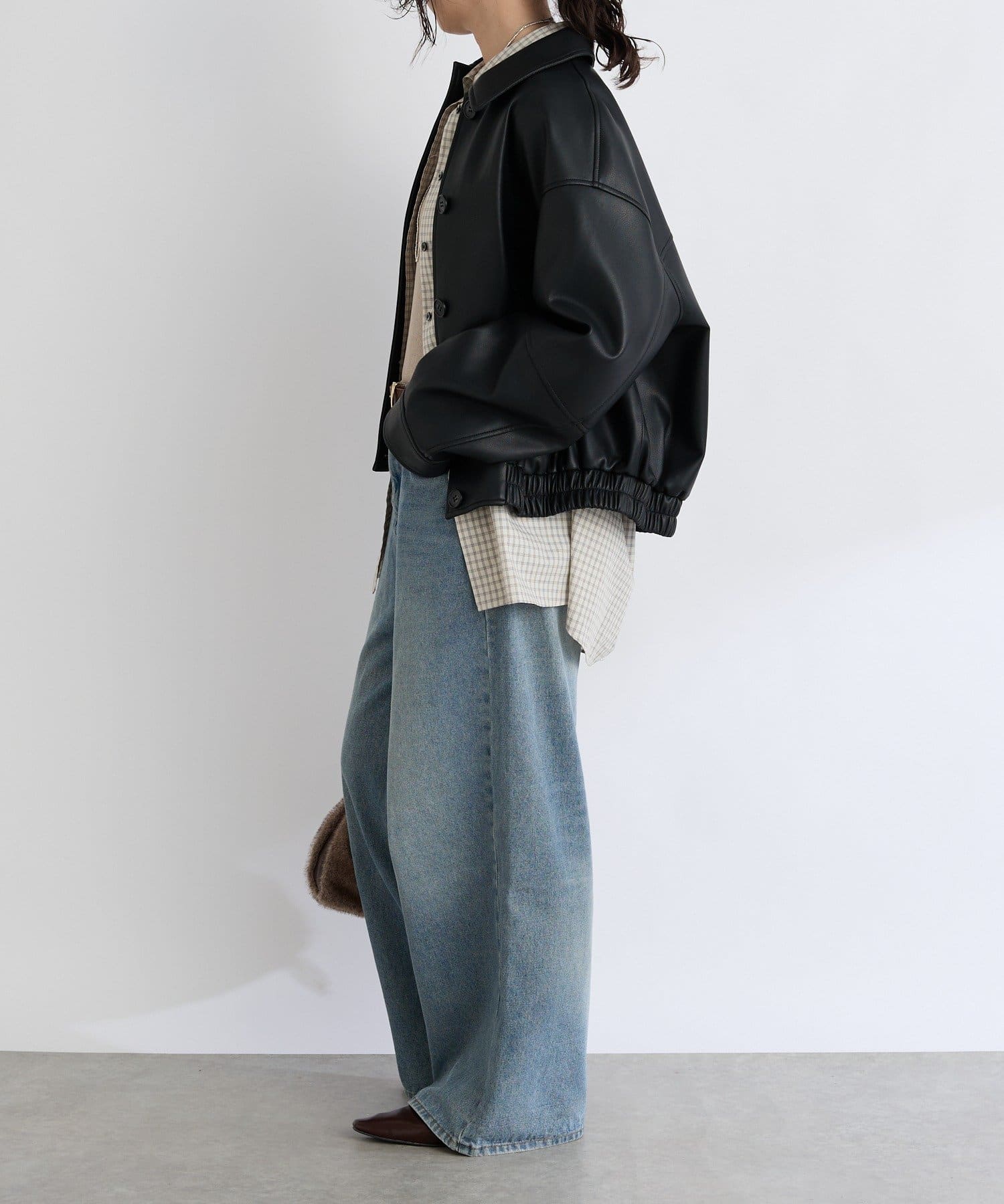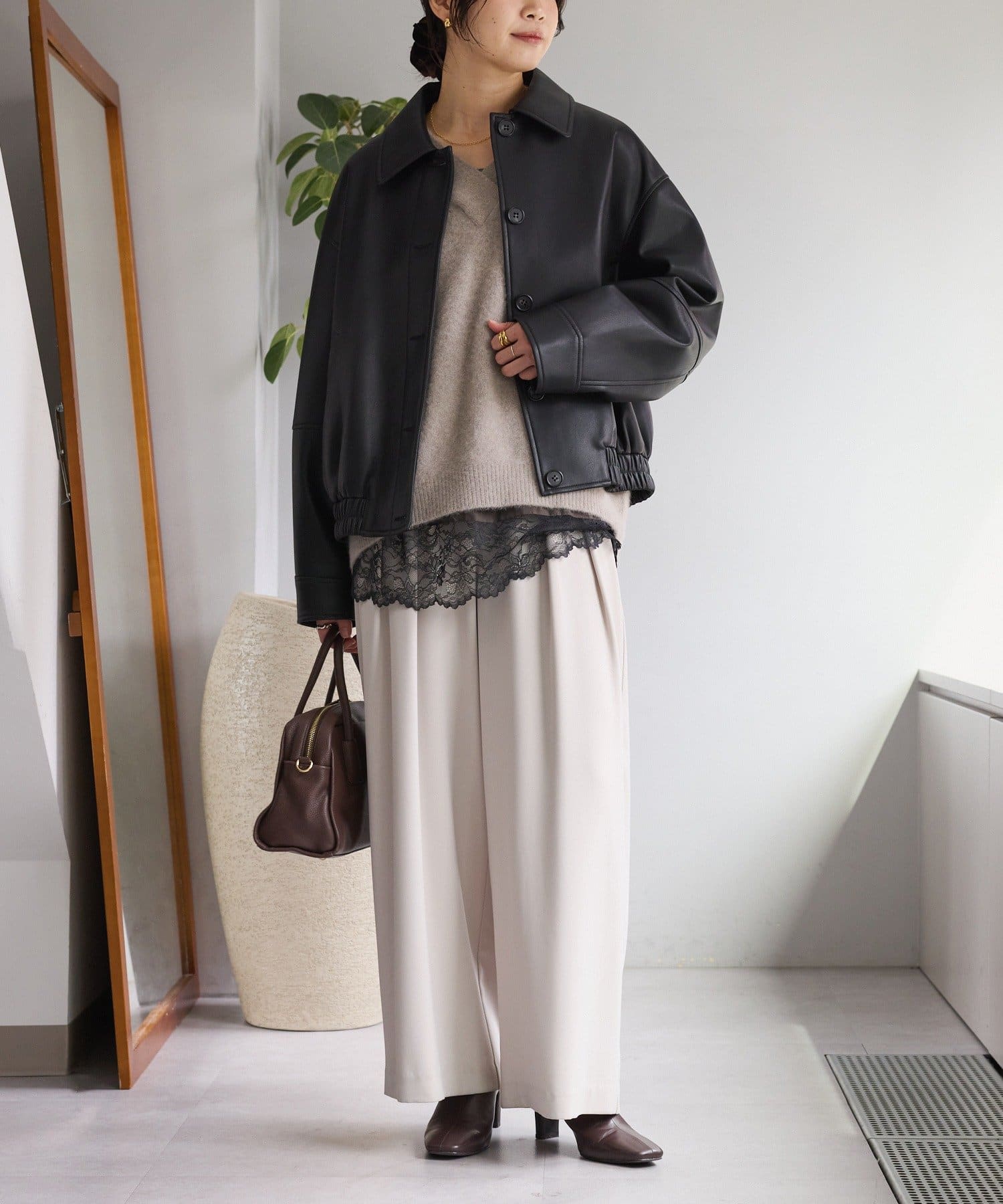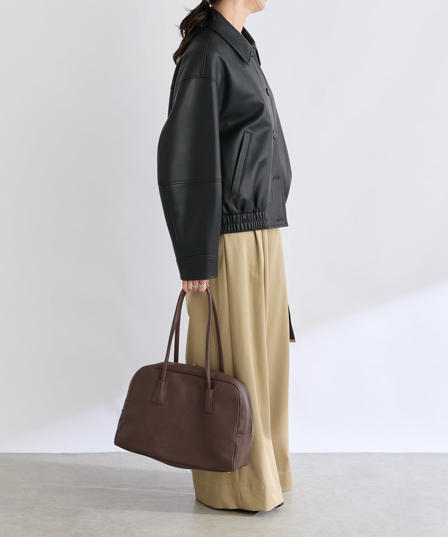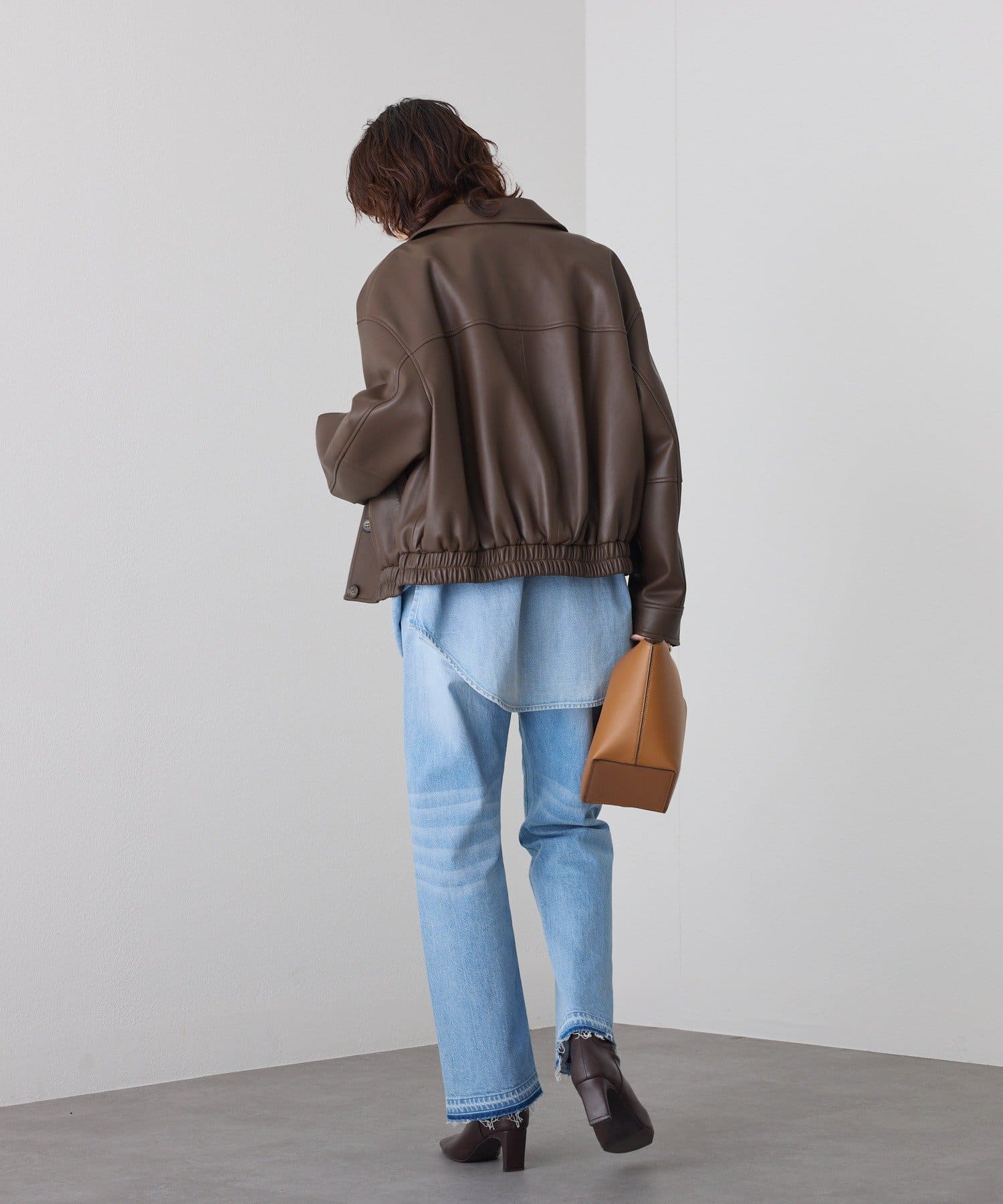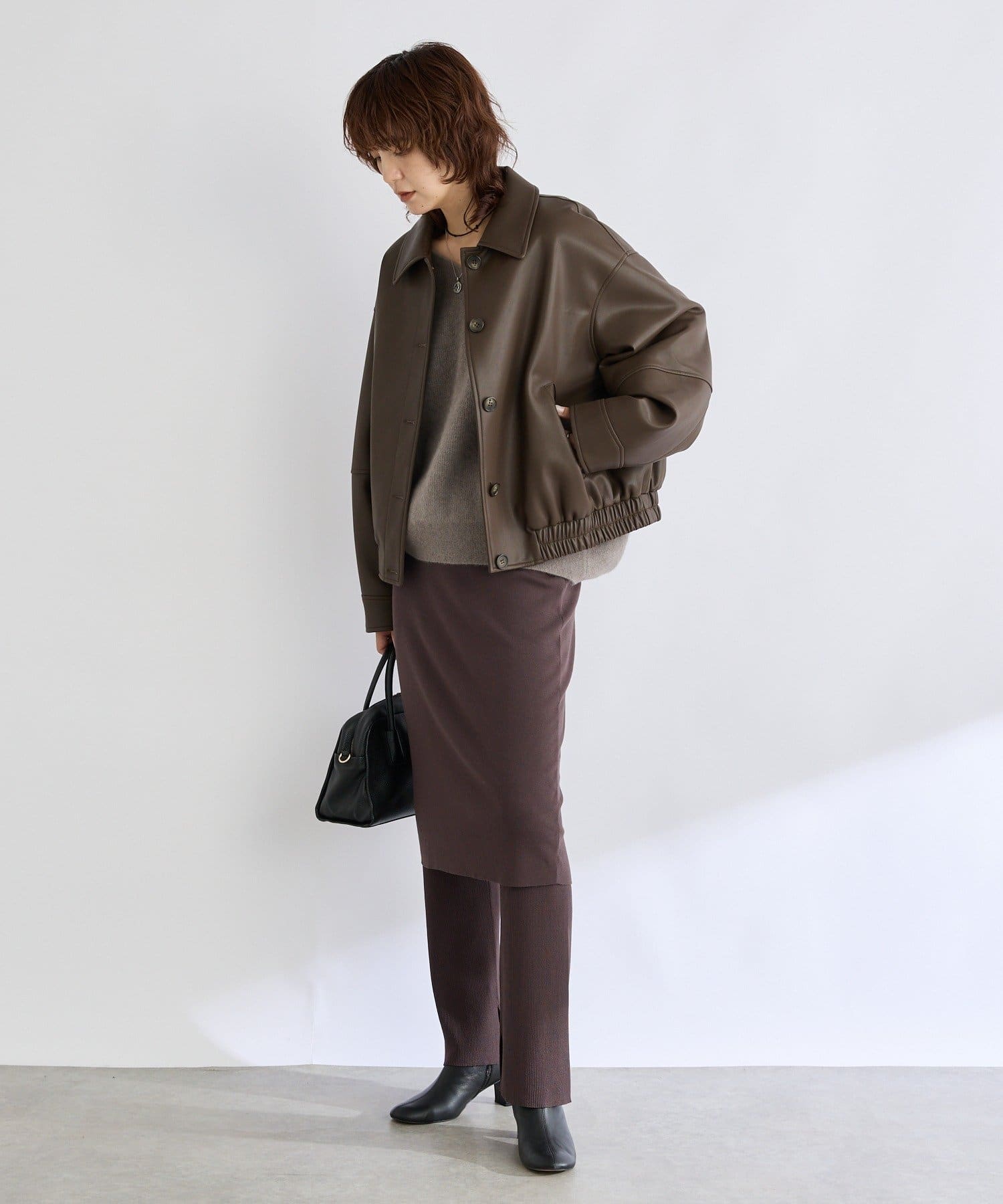 ・リアルレザーを思わせるソフトでしっとりとした合成皮革を使用したミドル丈ブルゾン。