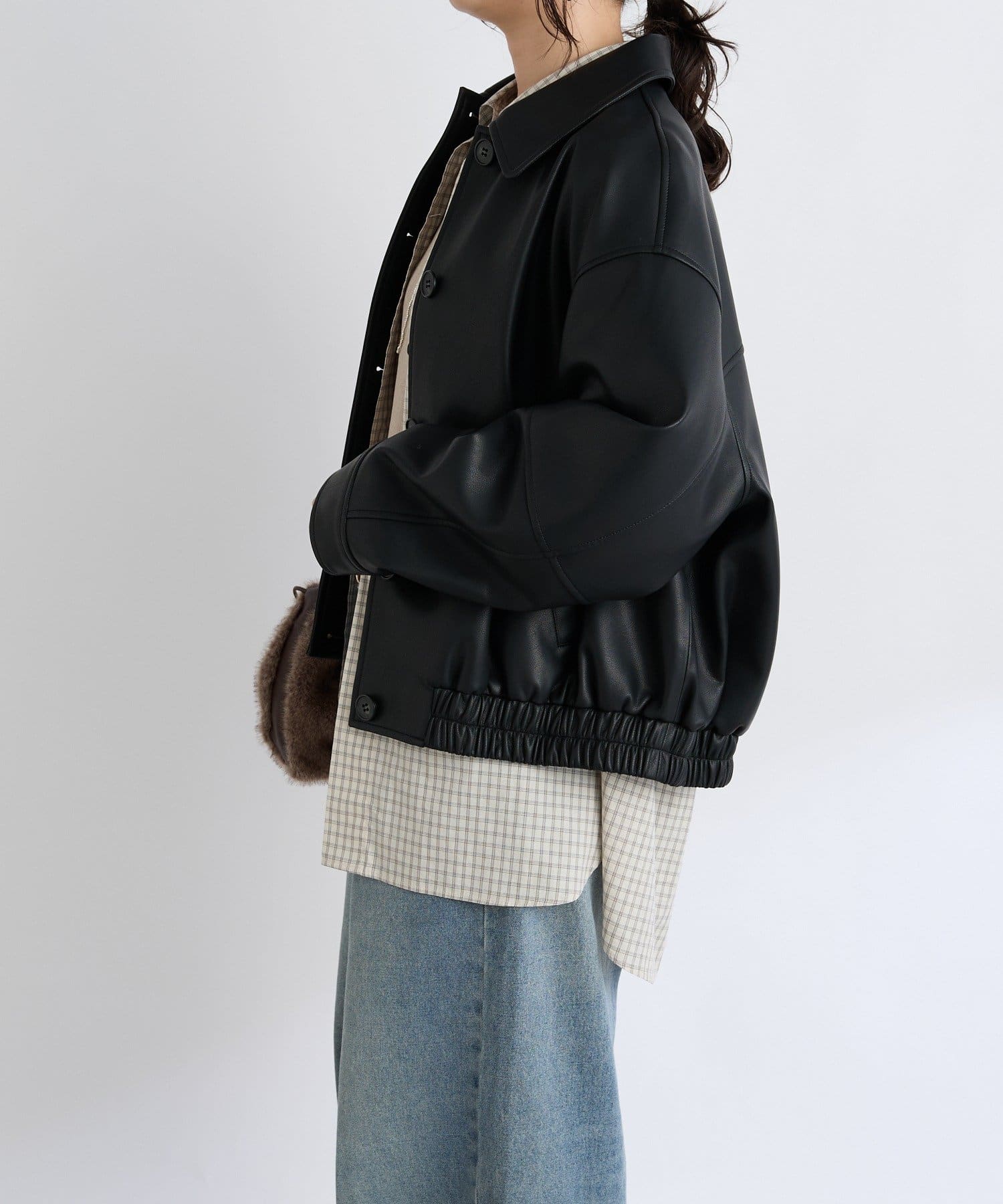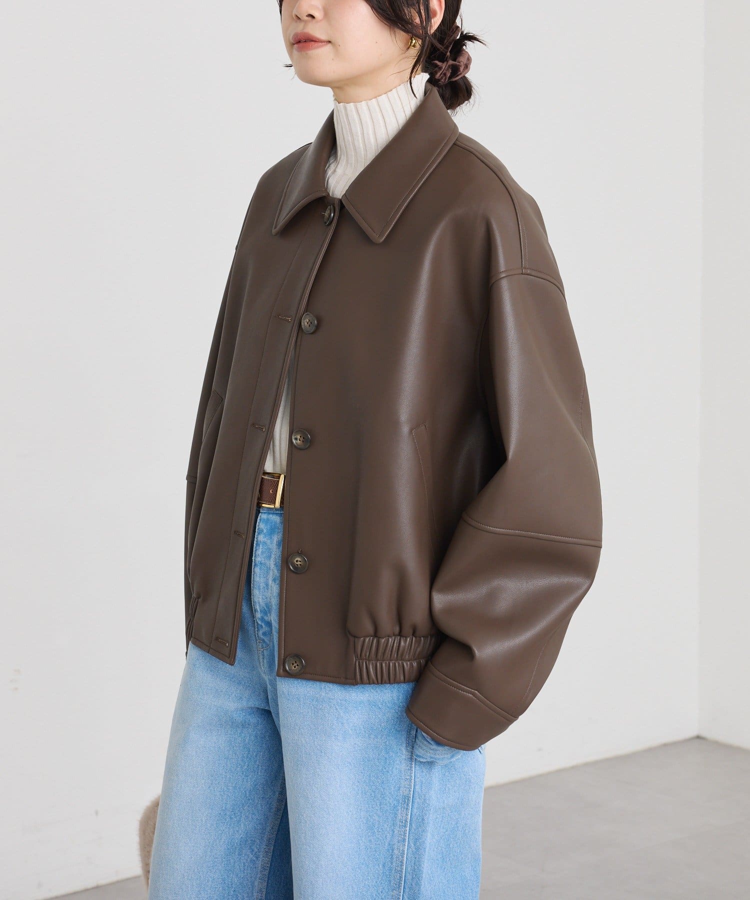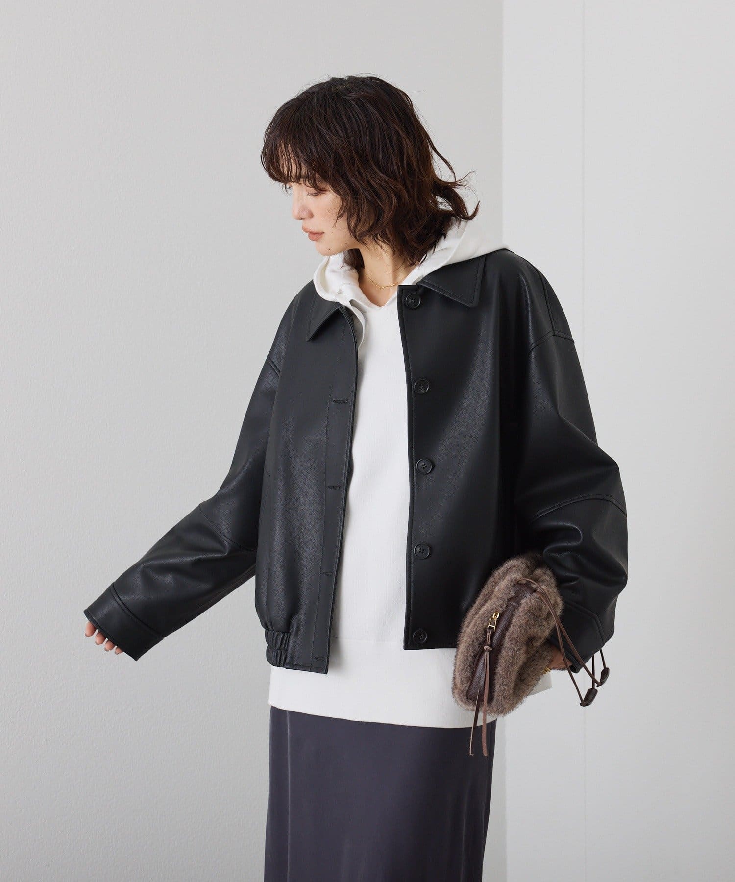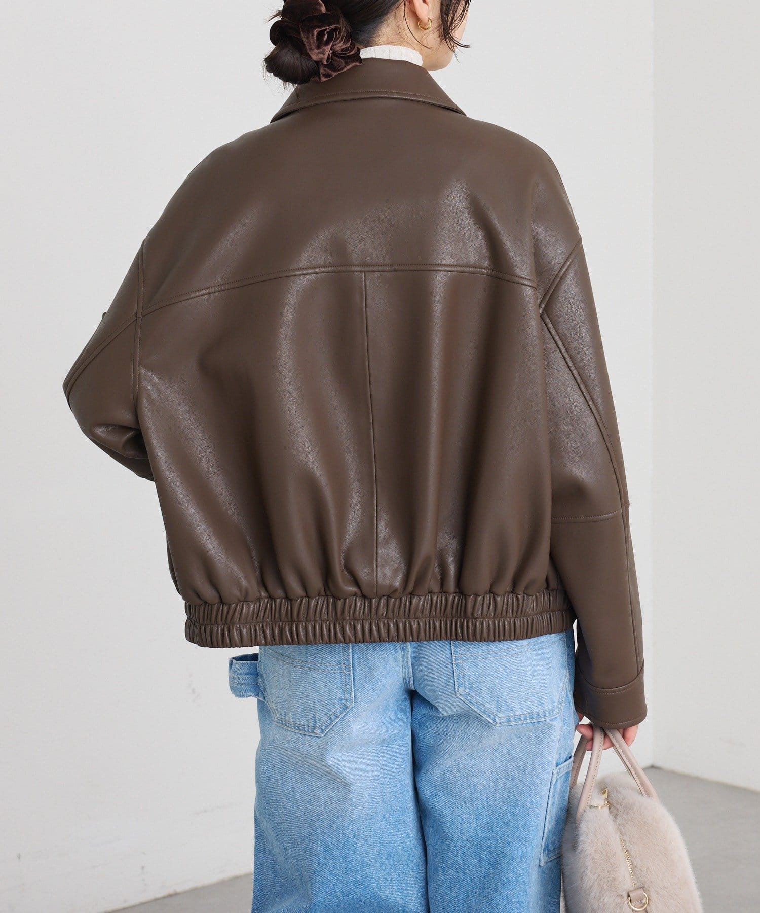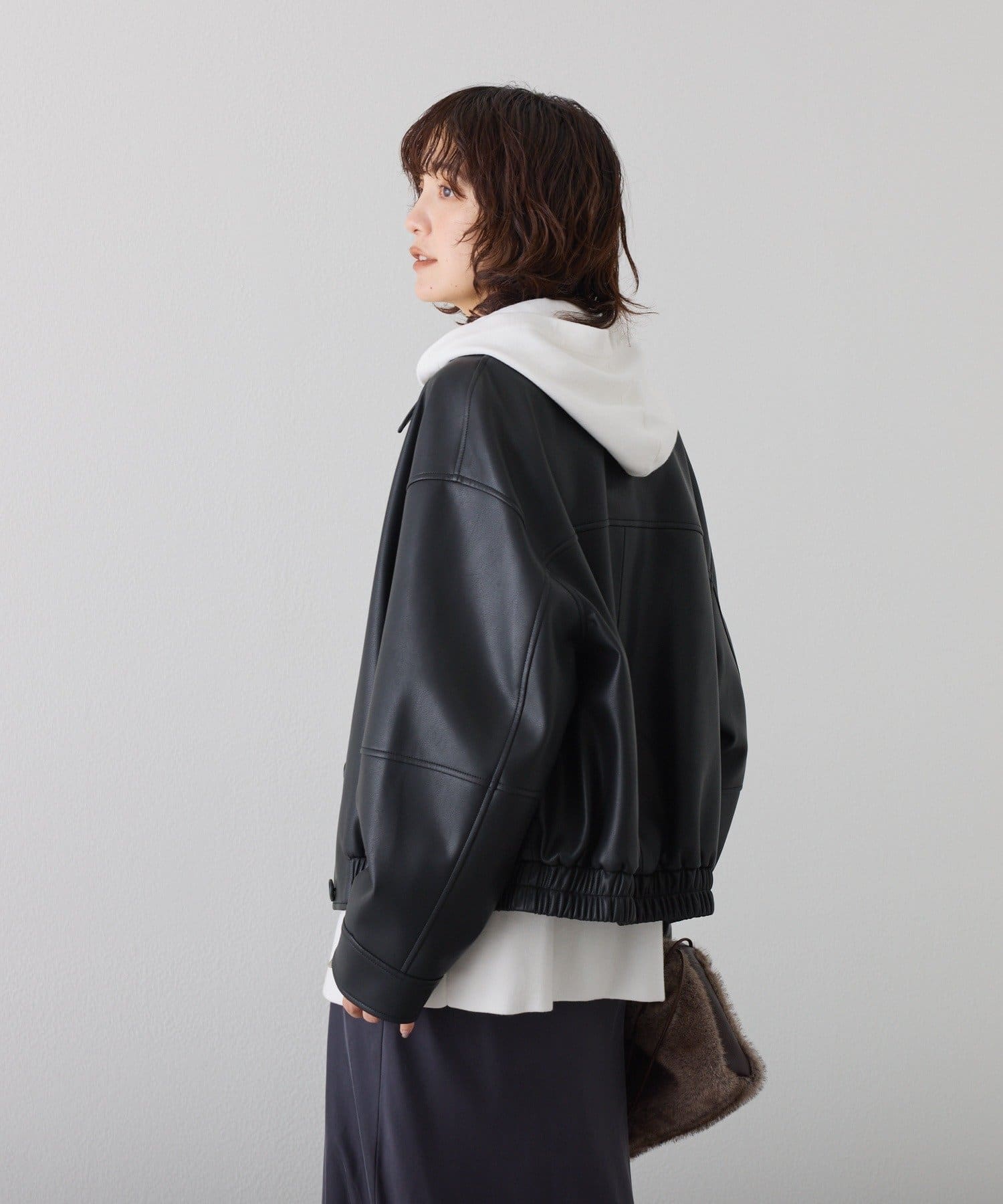 柔らかな質感の合皮素材でゆったり着やすいブルゾン。