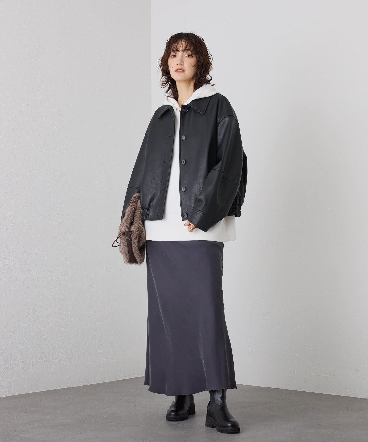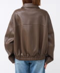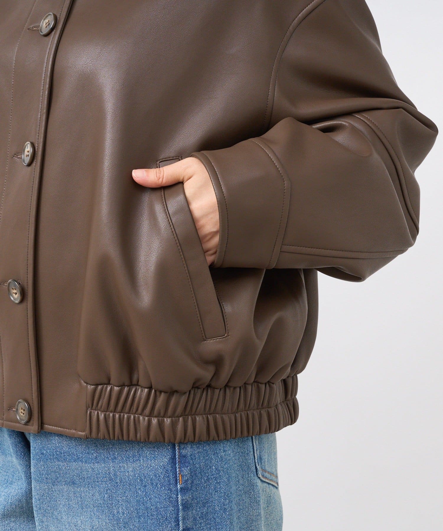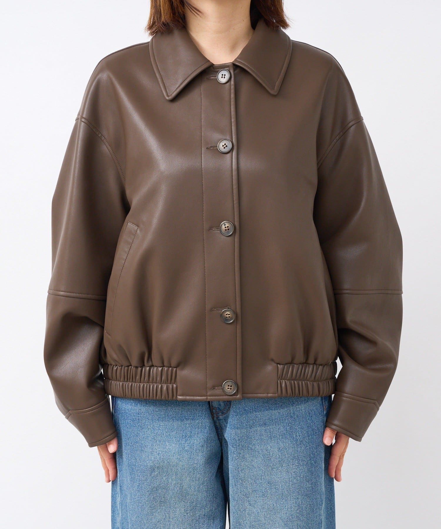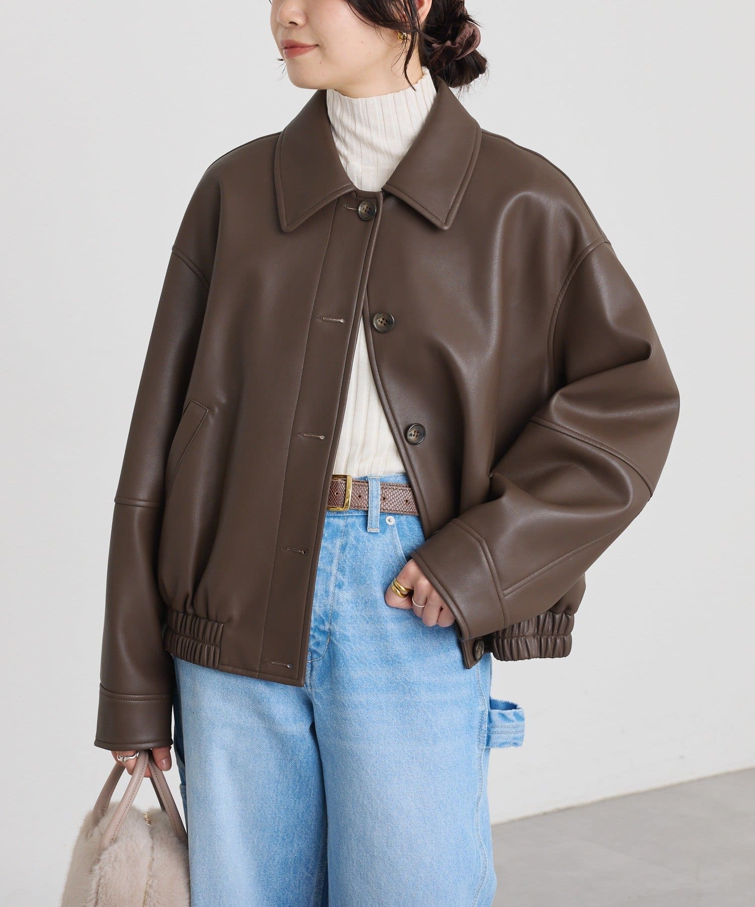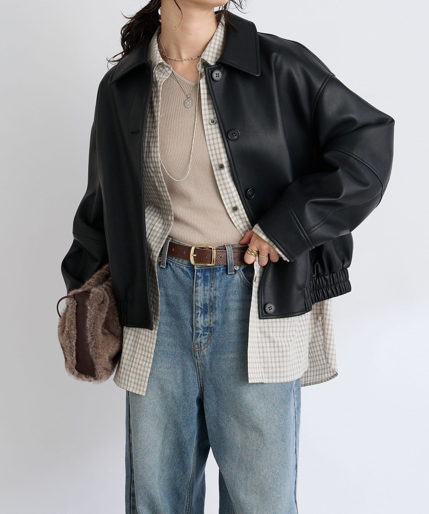 柔らかな質感の合皮素材でゆったり着やすいブルゾン。