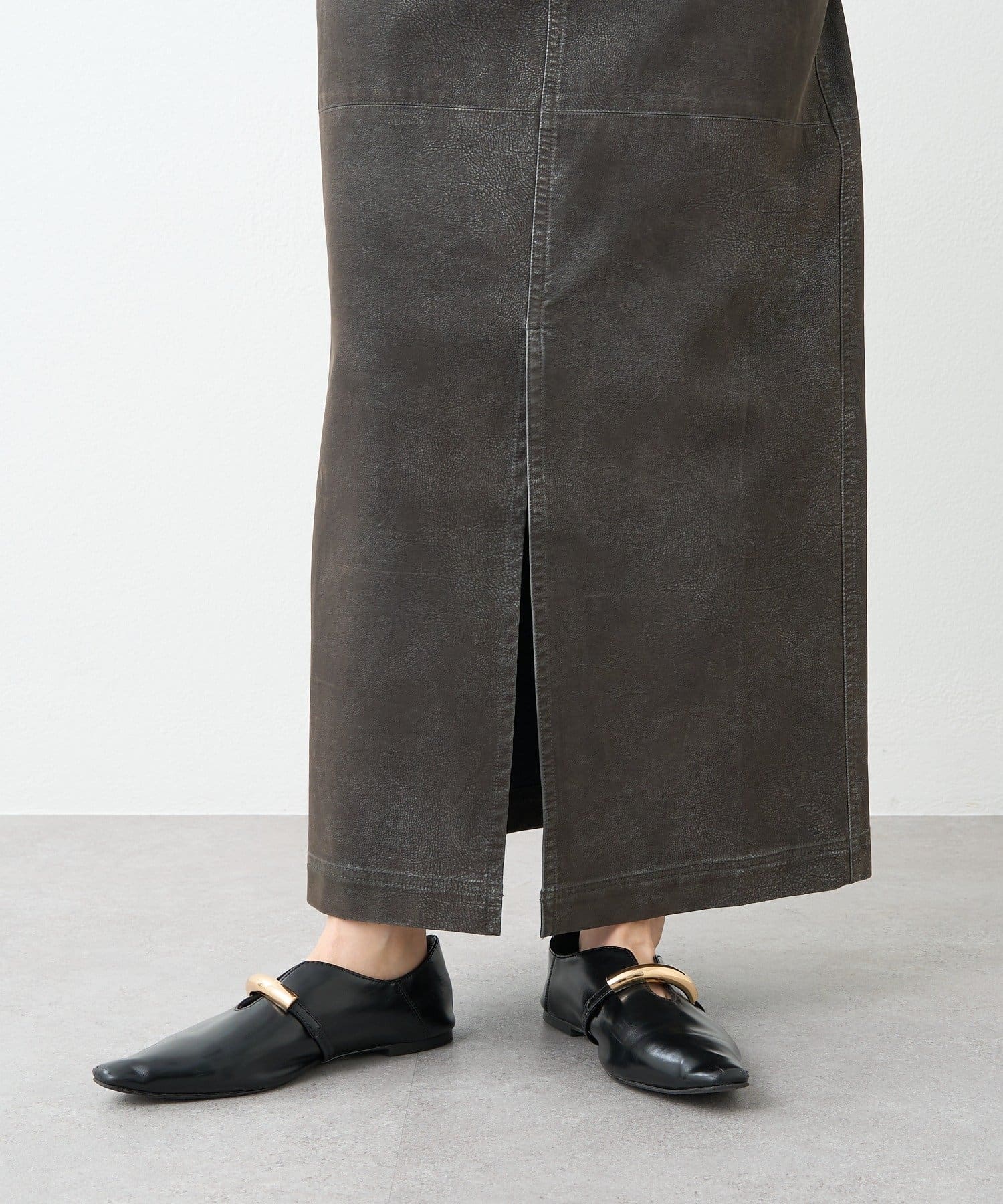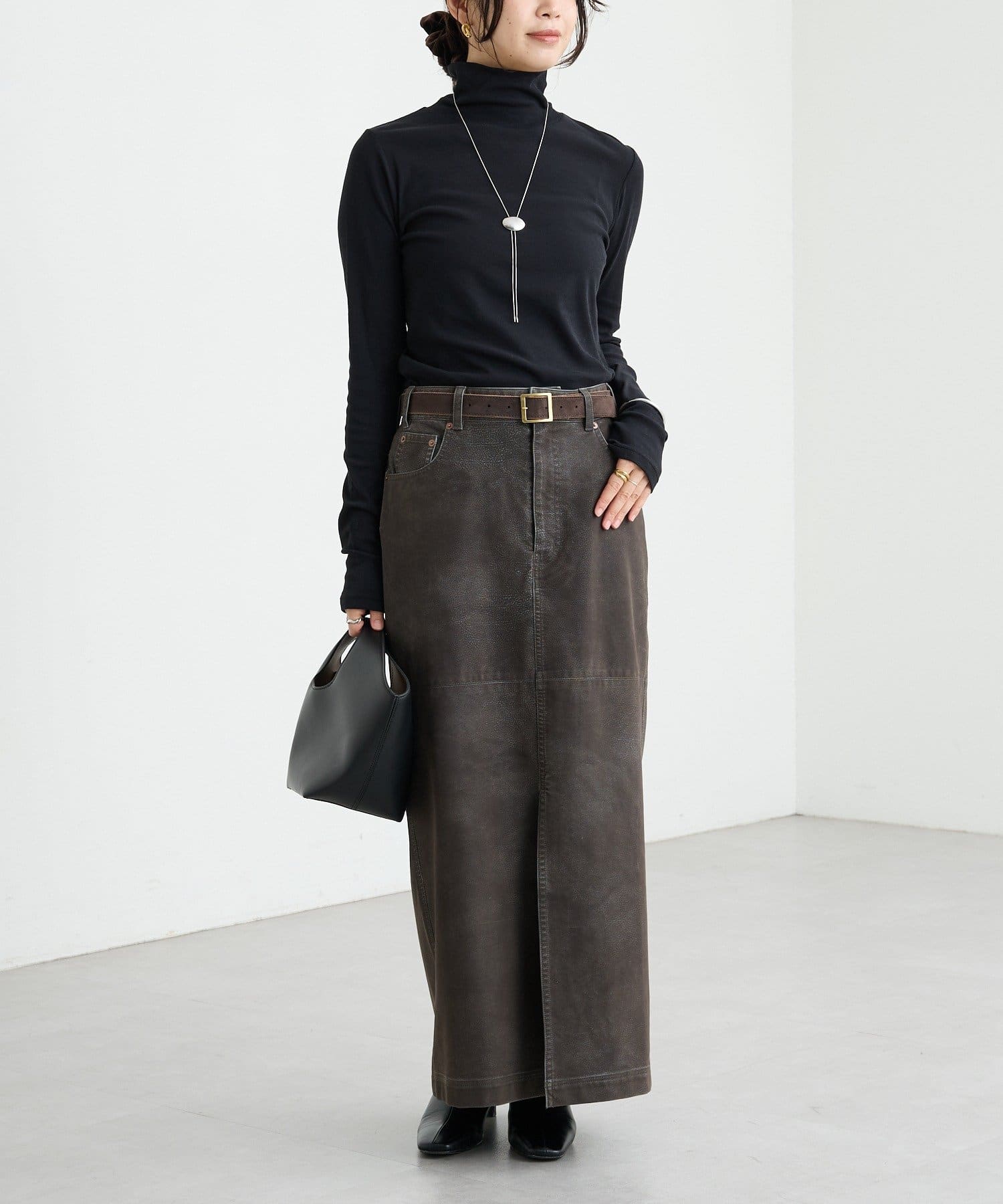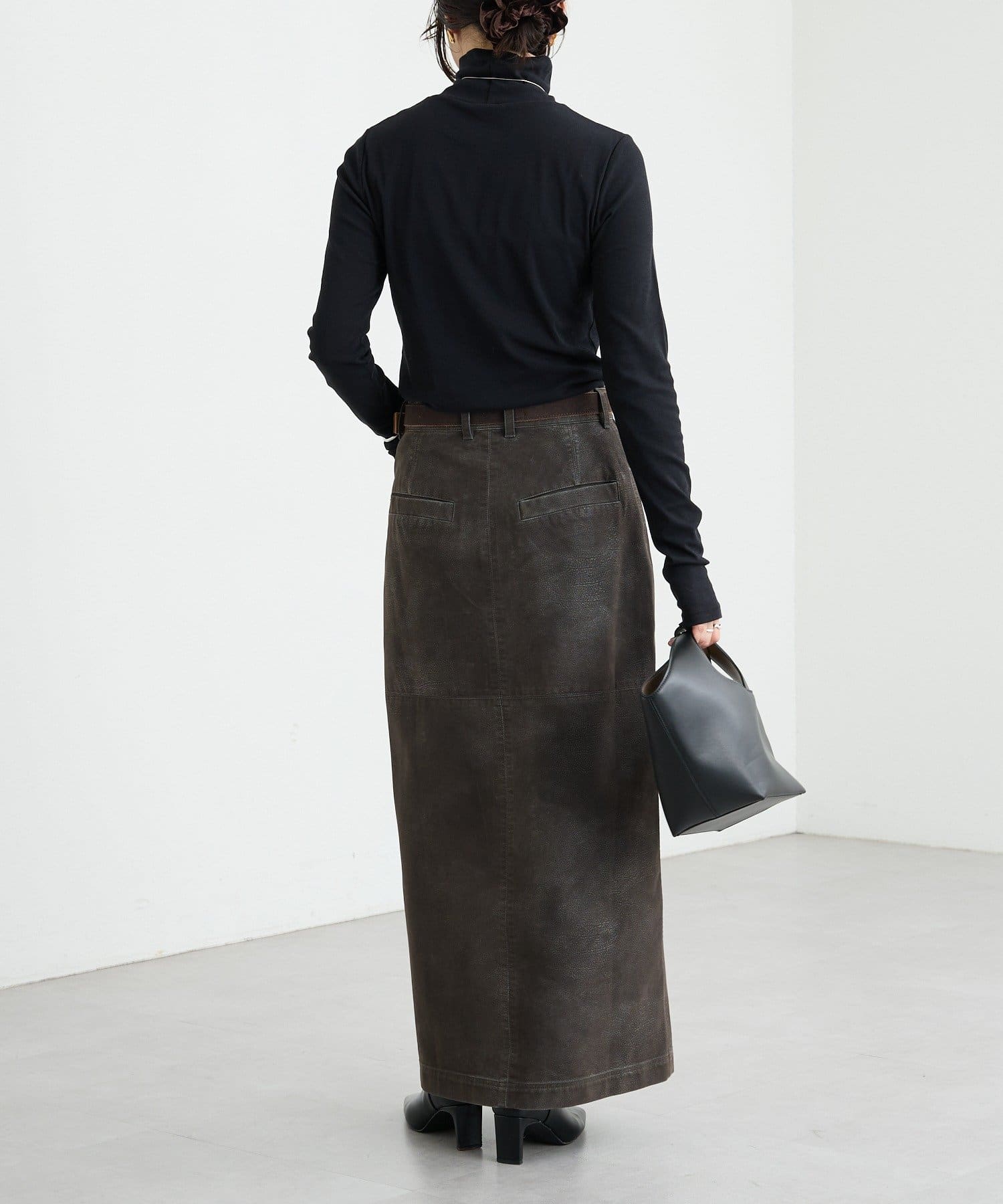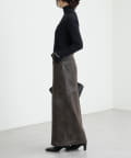 ・レザースカートらしく十字に切り替えをいれたロングタイトスカート