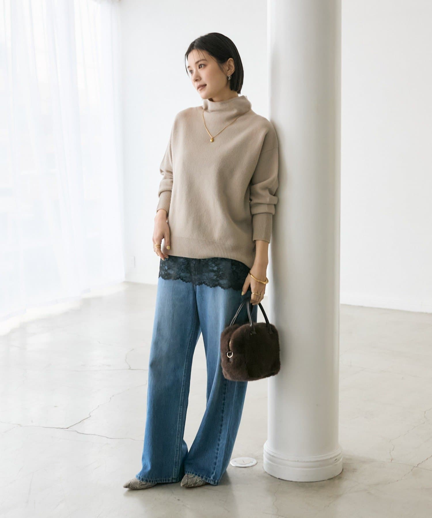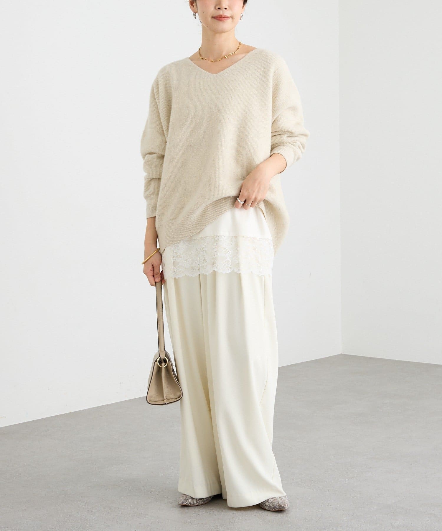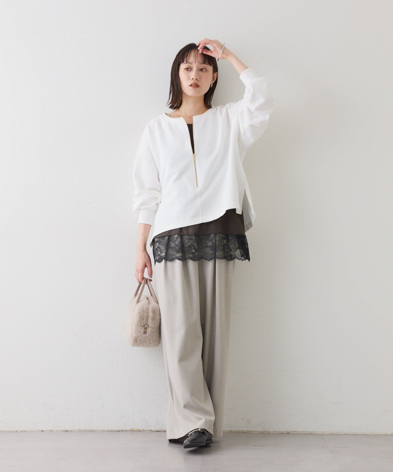 ・レースをトップスの裾からさりげなくのぞかせるだけで、鮮度のあるスタイルになります