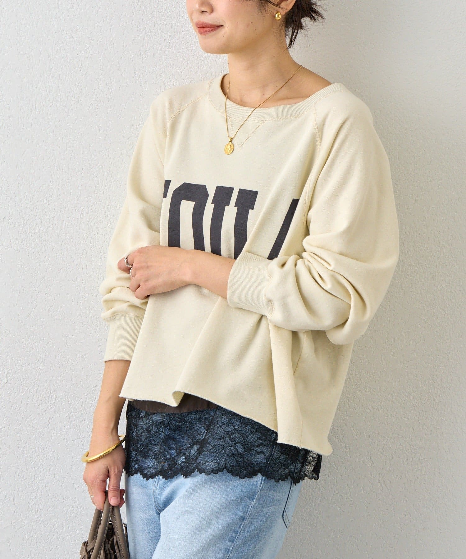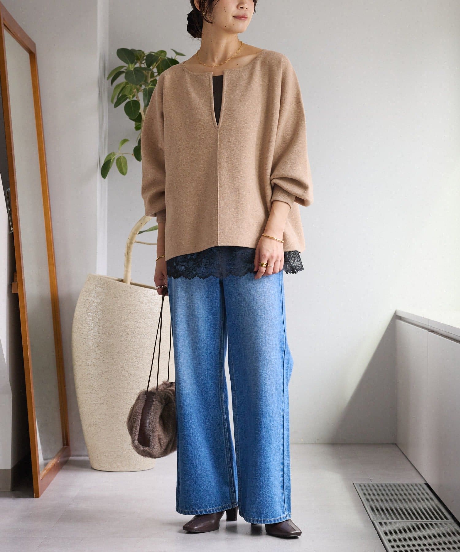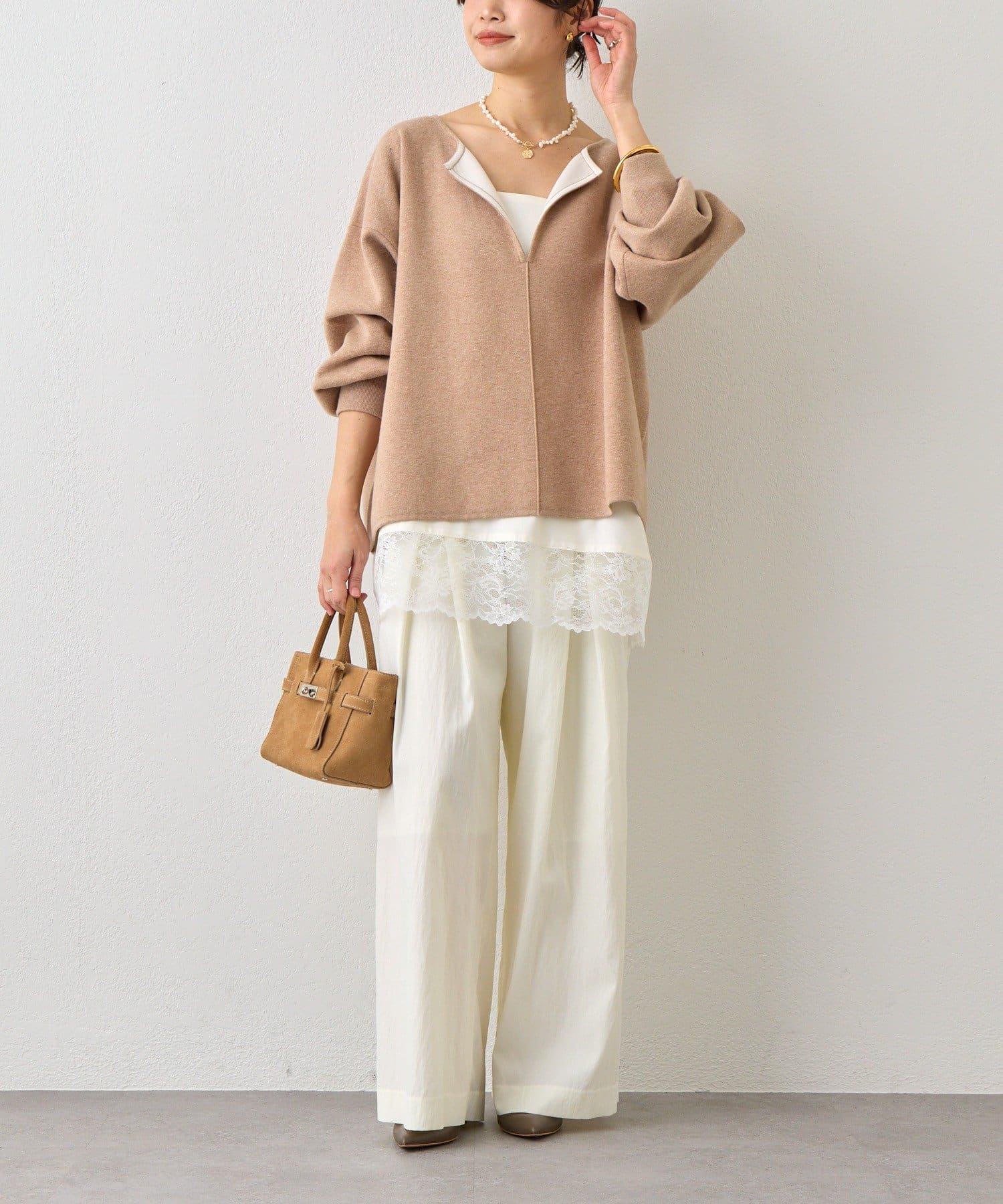 ・レースをトップスの裾からさりげなくのぞかせるだけで、鮮度のあるスタイルになります