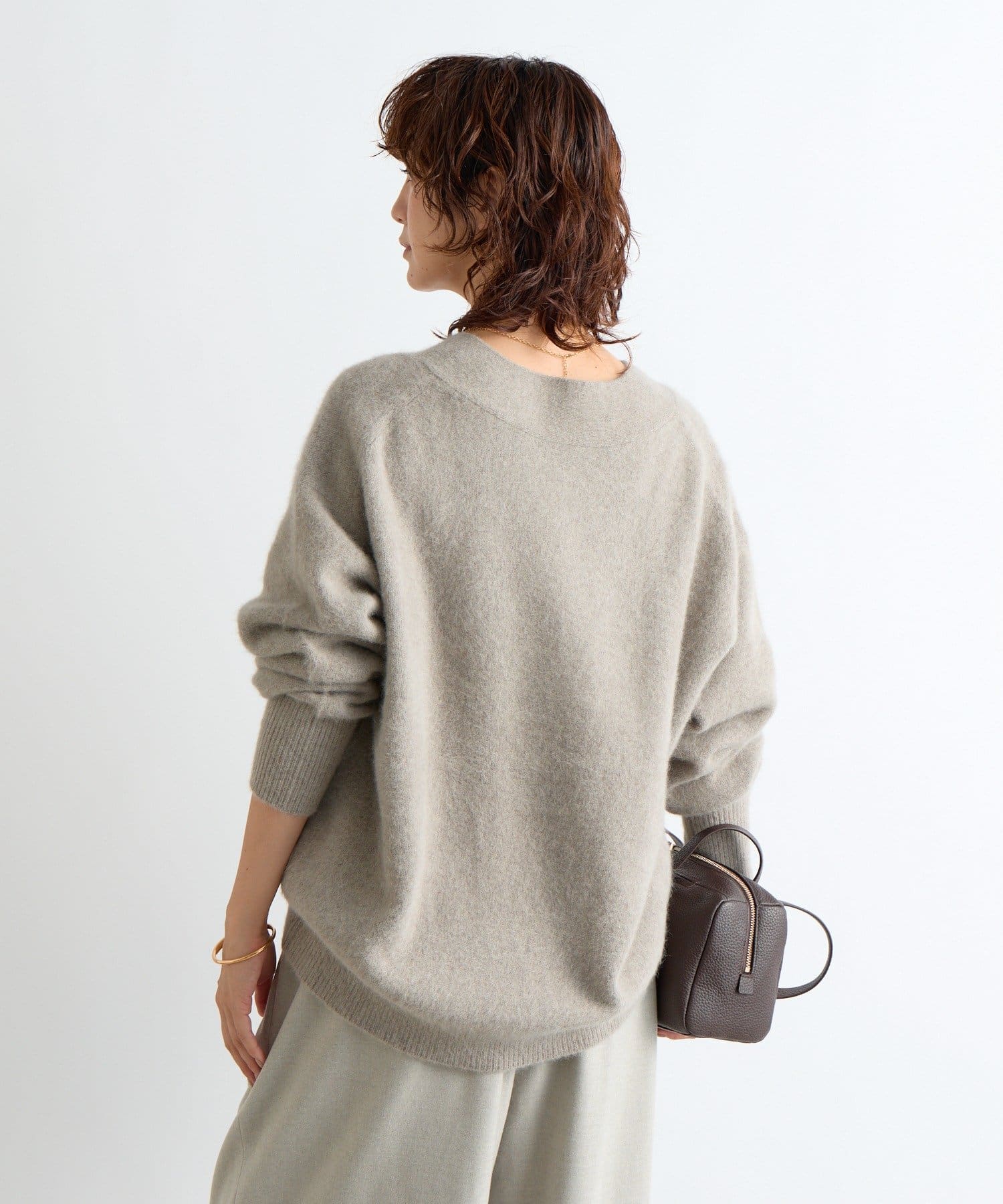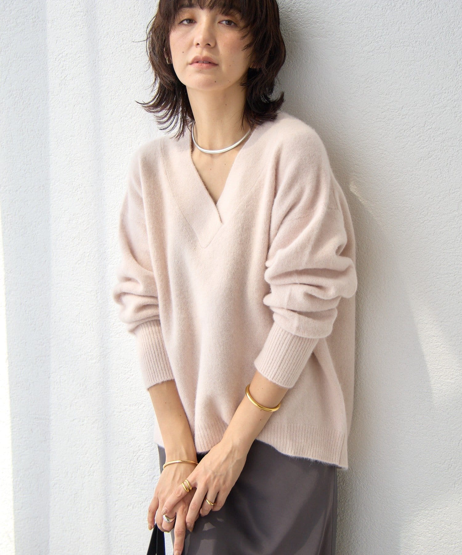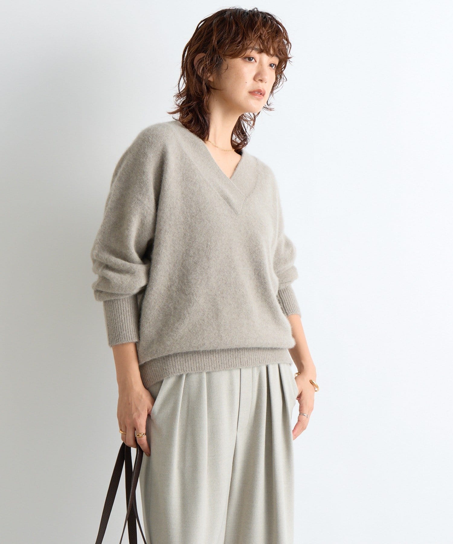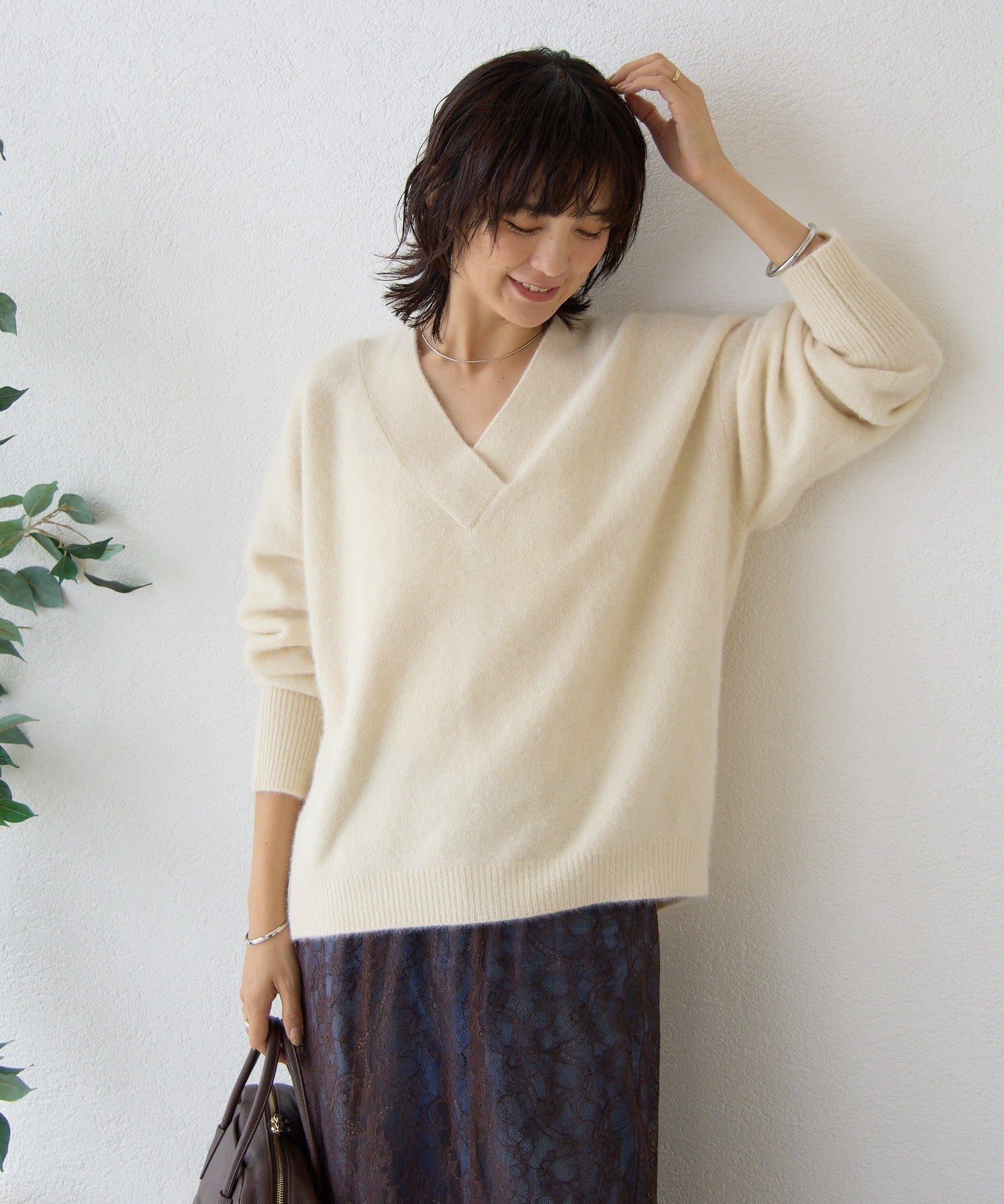【華やかな印象に】ヘアリーヤーン深Vネックニット