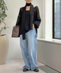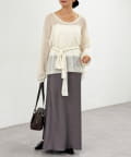 ストールはグルッと巻いたり、ボウタイに結んだり、ウエストマークしたりとスタイリングに合わせたアレンジが可能です。