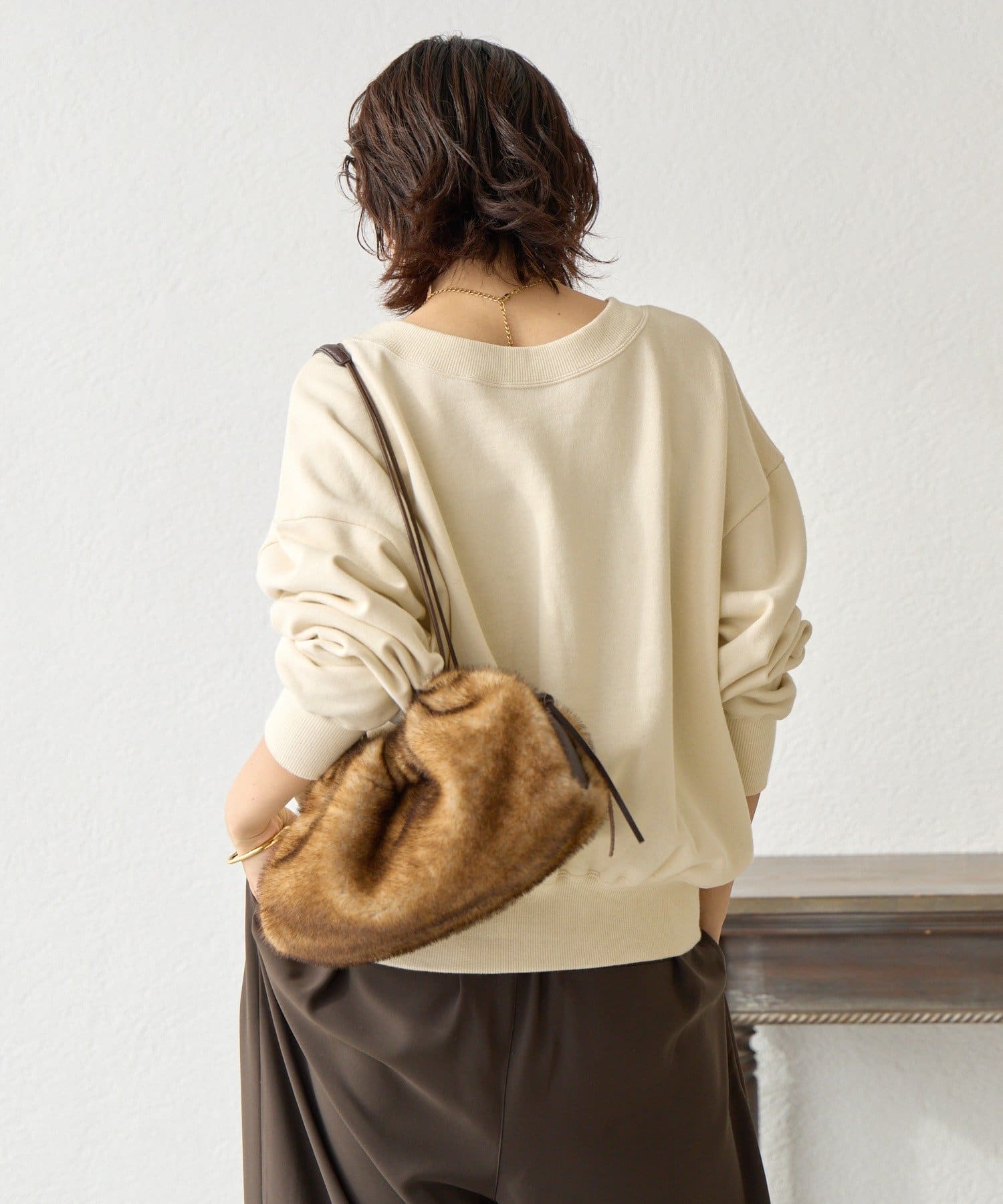 ・衿ぐりは横に開けて、女っぽい抜け感もプラス
