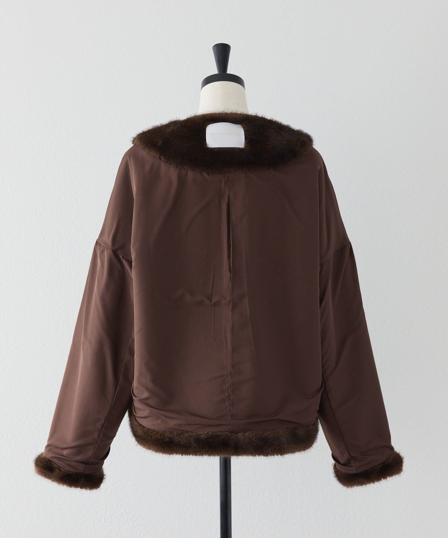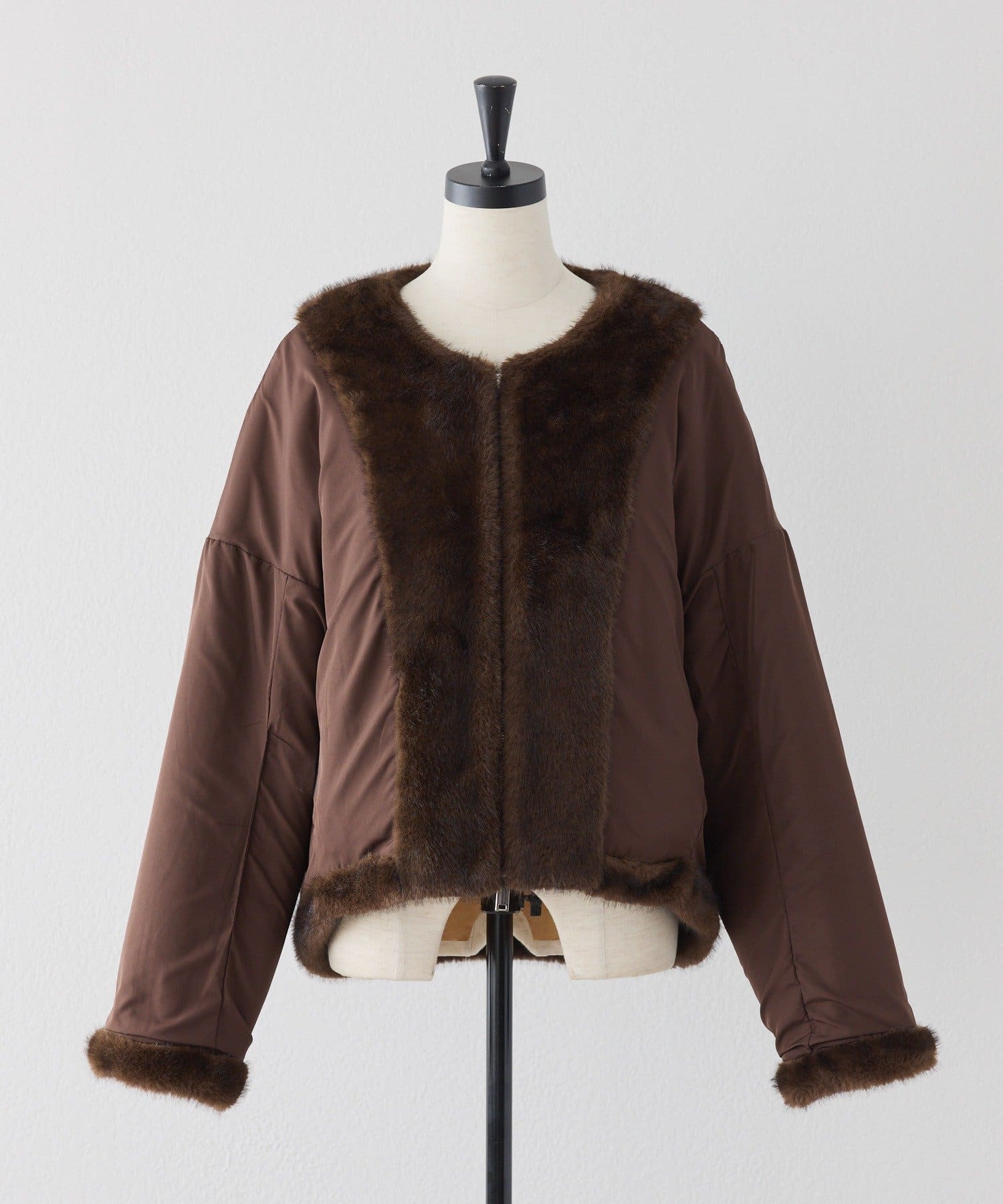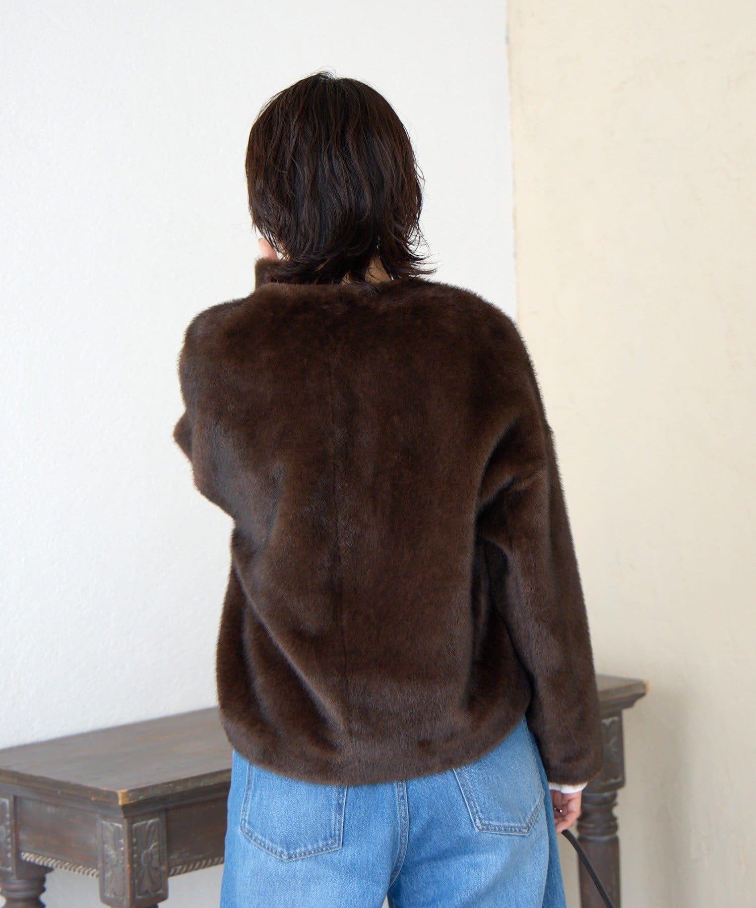 ・上品な光沢を持つミンクライクファーを使用した、羽織るだけで秋冬のムードを高められるアイテム。
