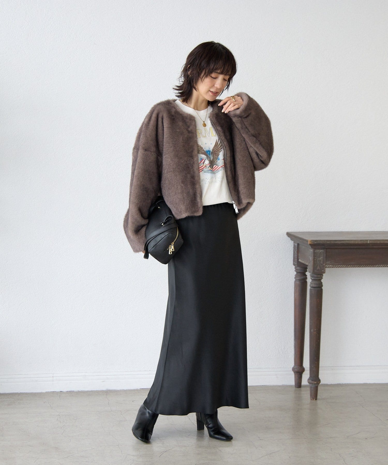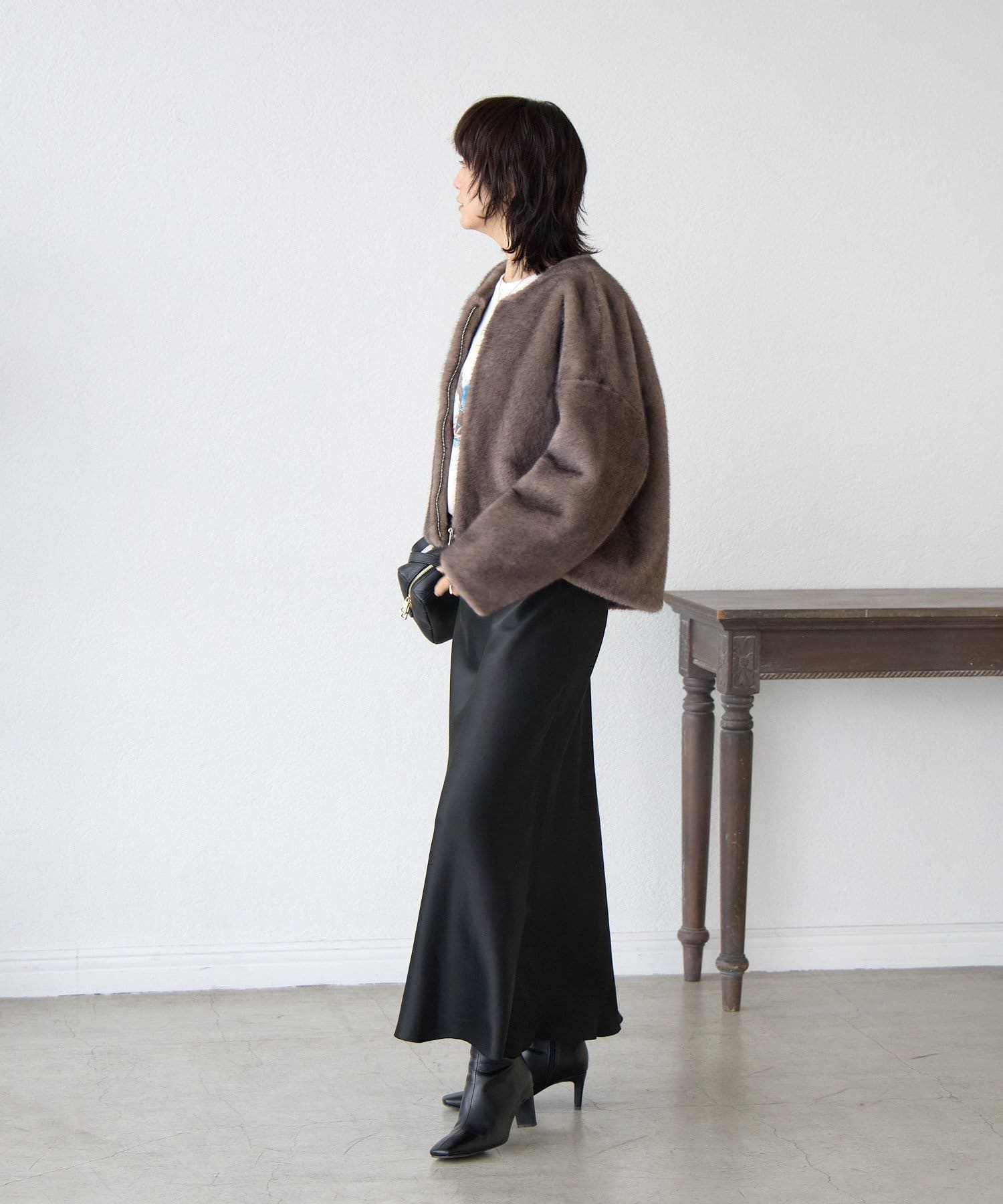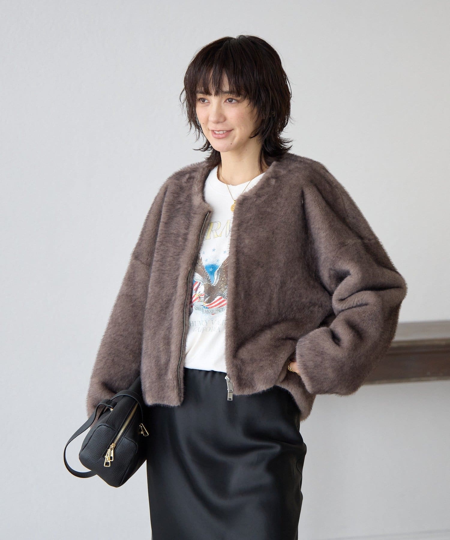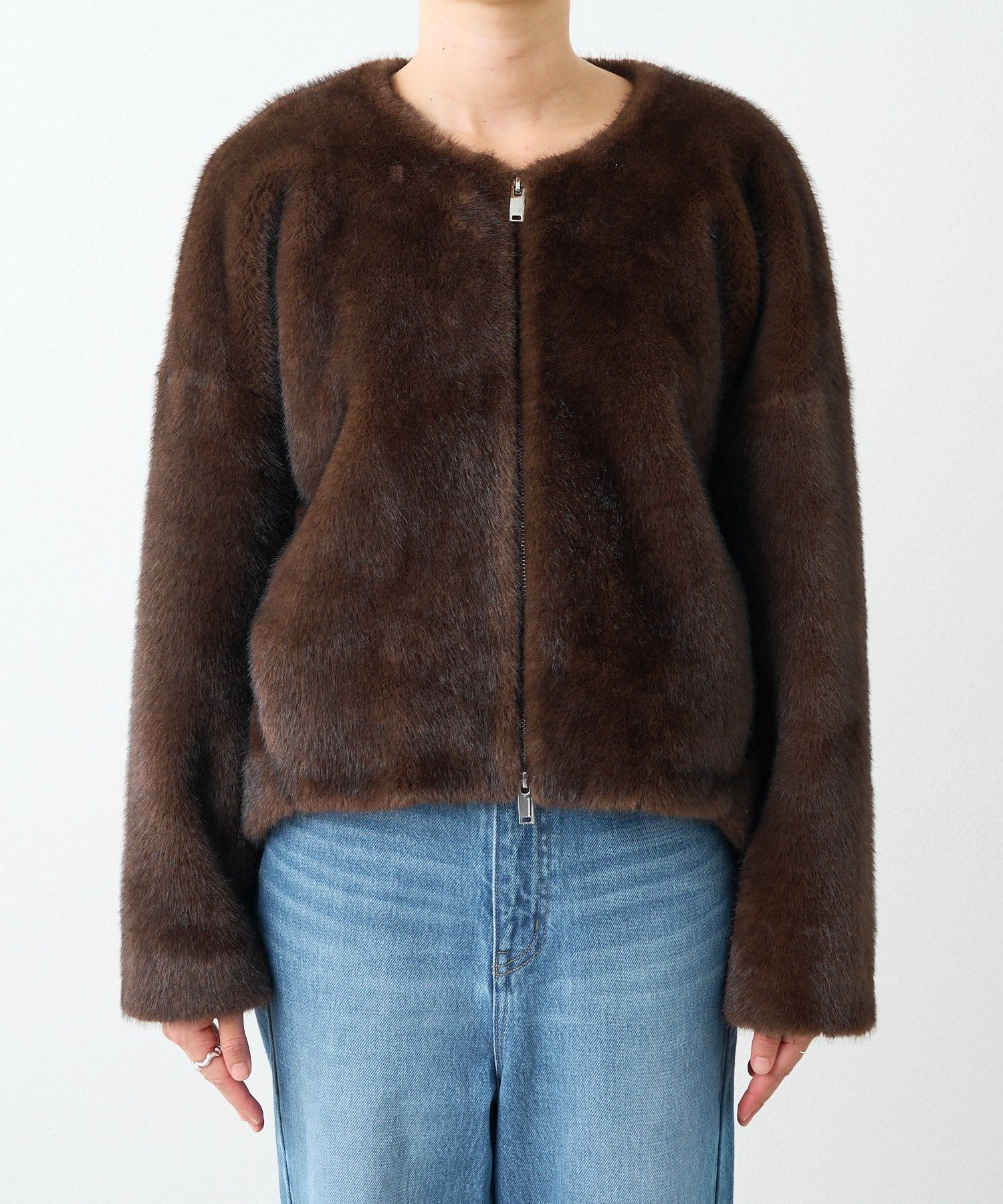 長すぎない着丈ですっきりと着れるため『ファーコートは着ぶくれが気になる…』という方にも着ていただきやすいアイテムです。