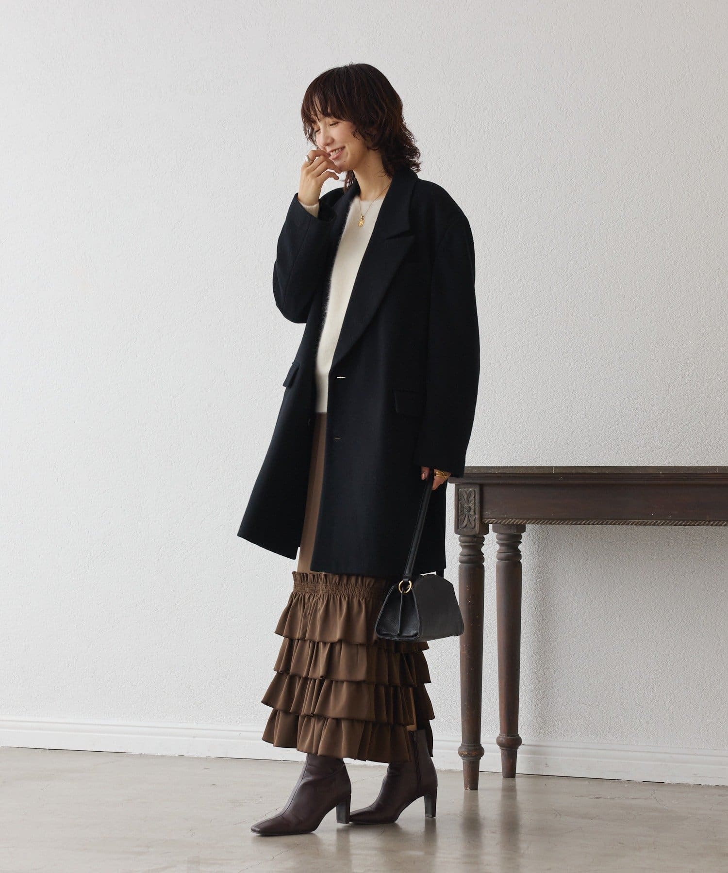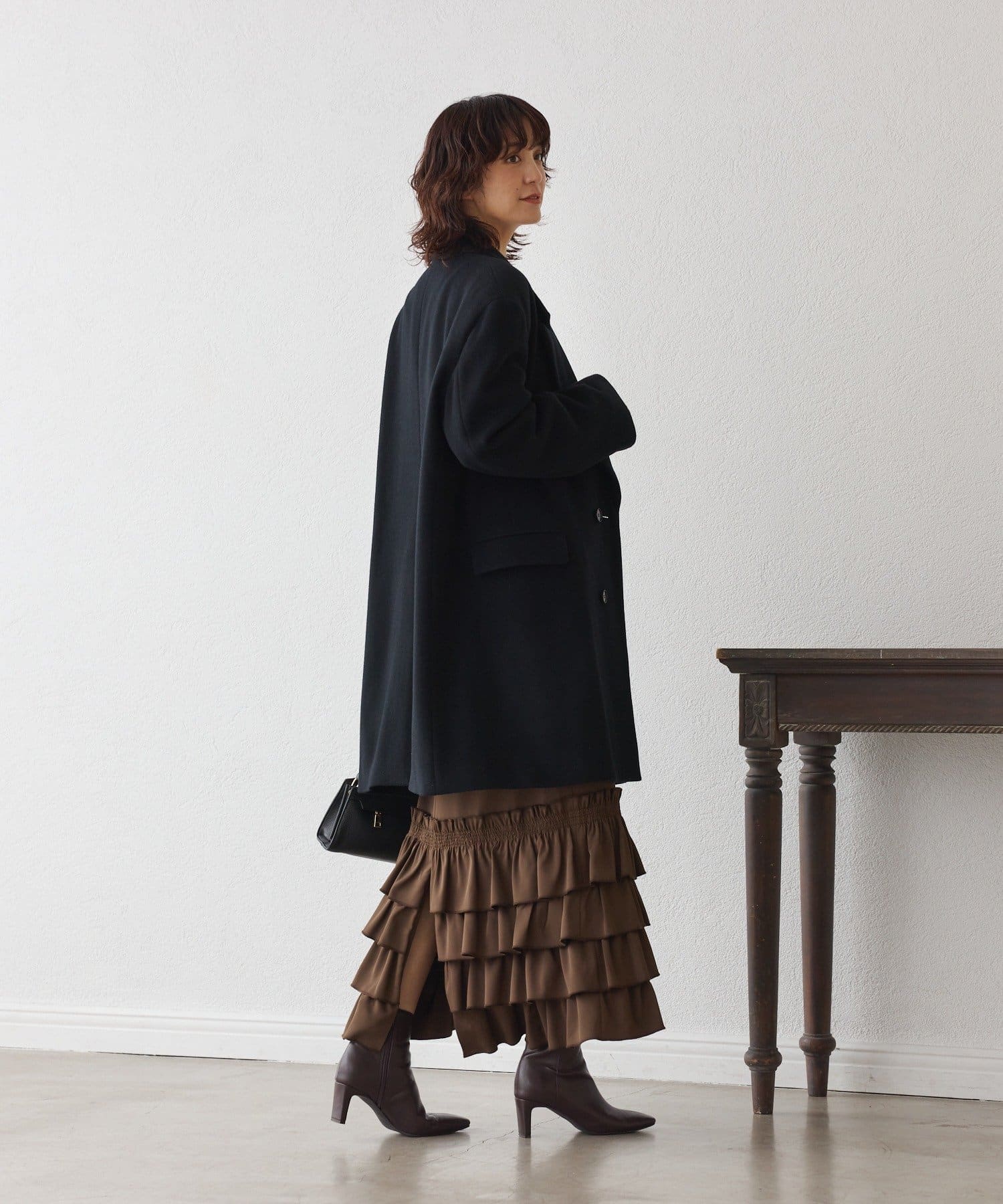 ・足の甲にかかるロング丈もポイント。フリル付きですがモードな着こなしが叶うスカートです。