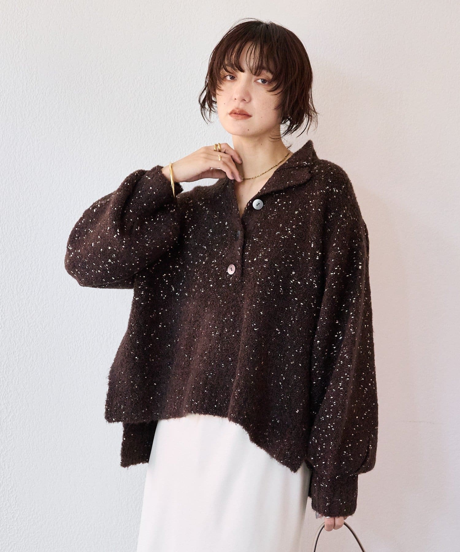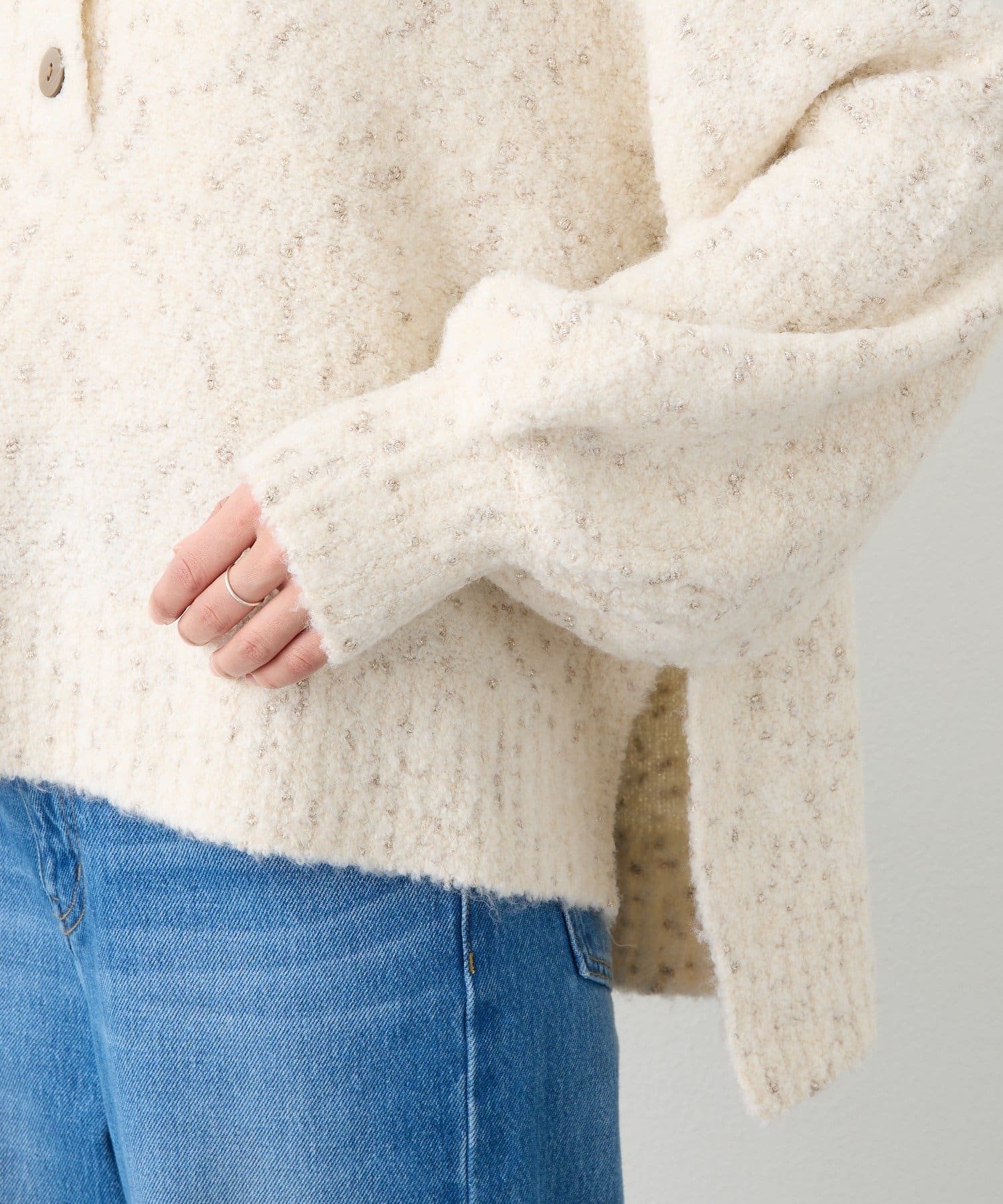 • ノット状のラメ糸が入ったブークレーヤーンを使用