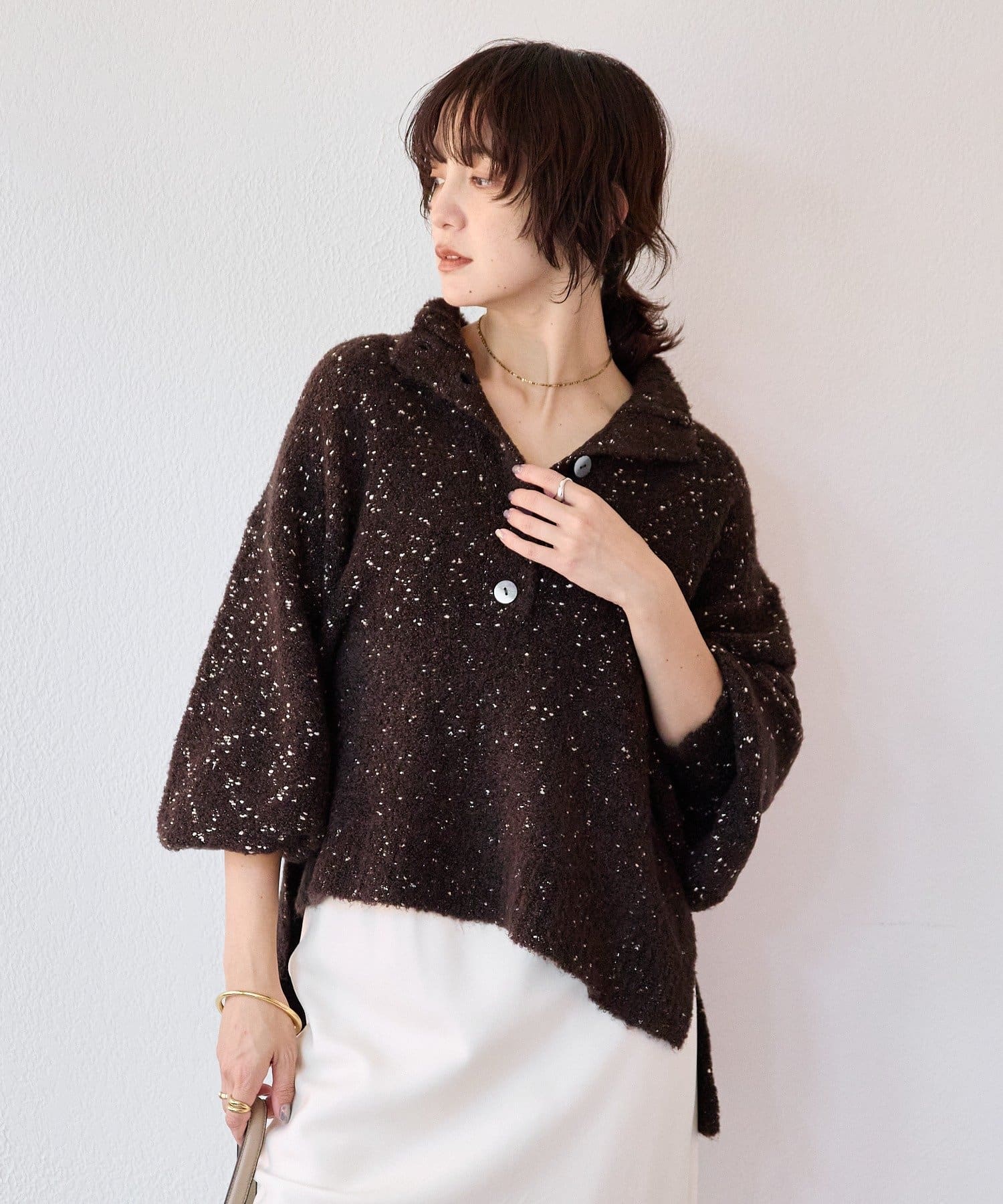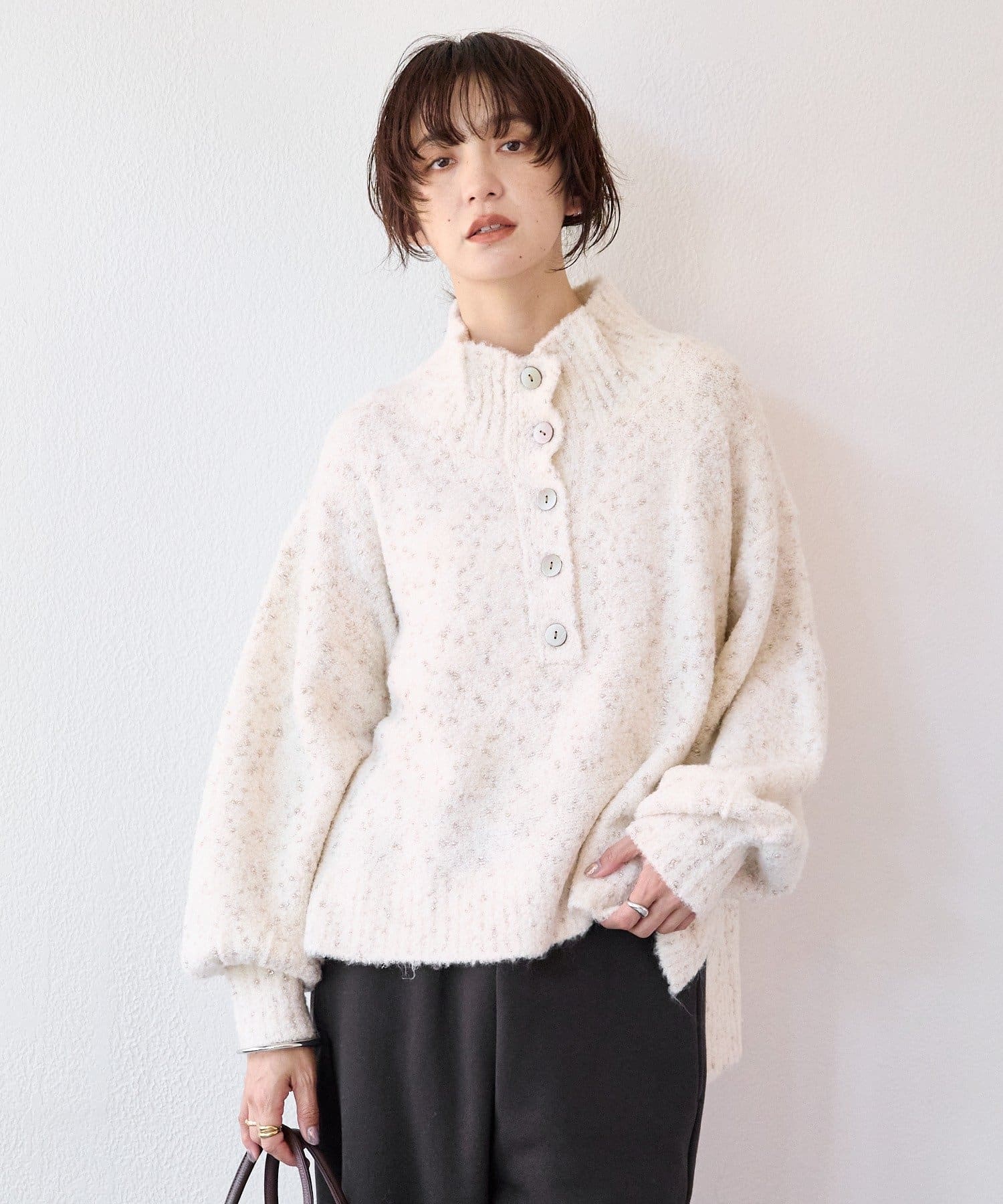 襟ボタンの開閉で印象を変えて着まわせる華やかニット