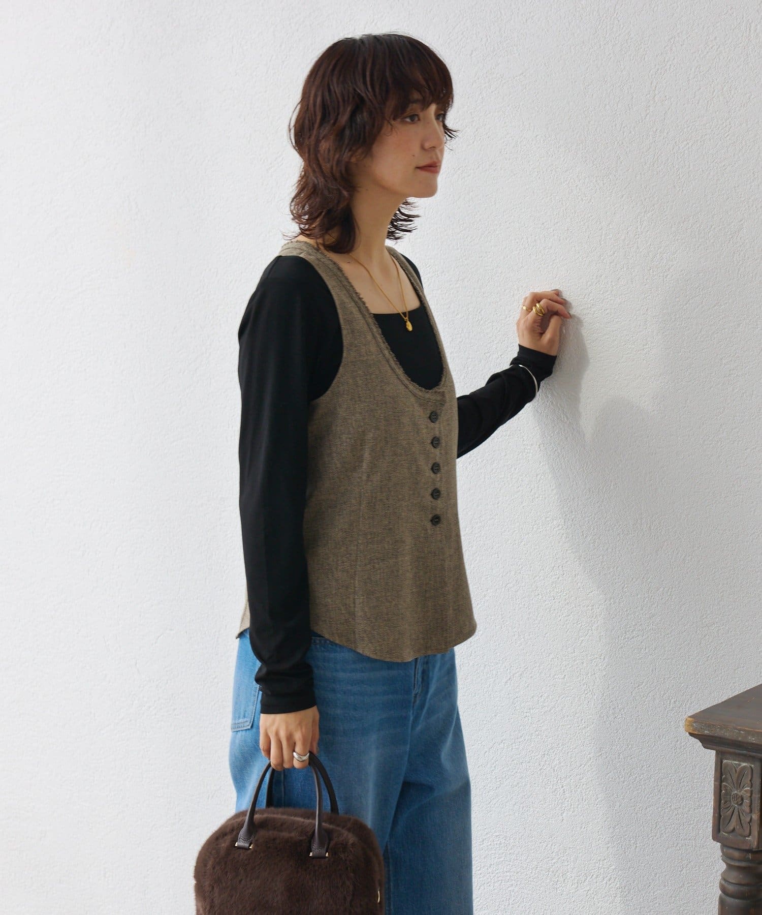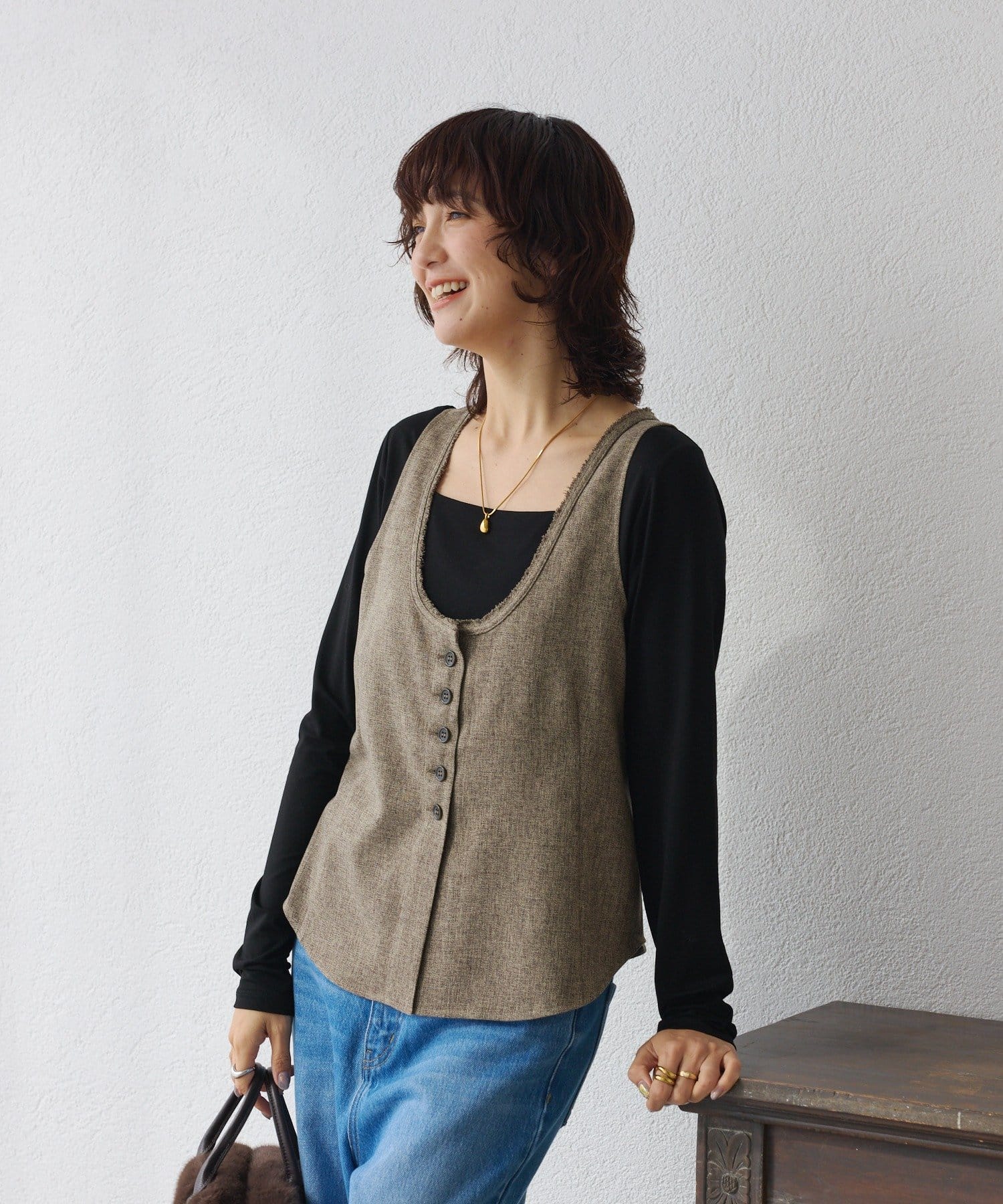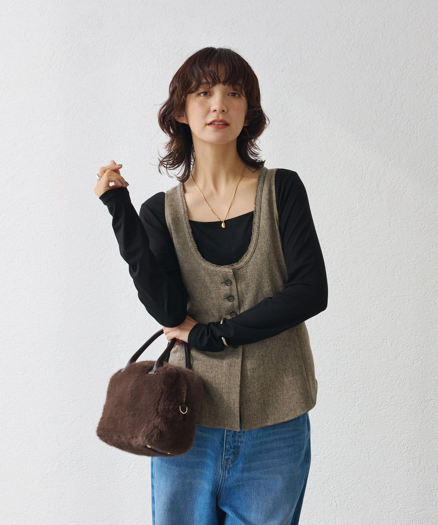 ・フリンジ始末でアクセントを効かせたネックラインがポイント。