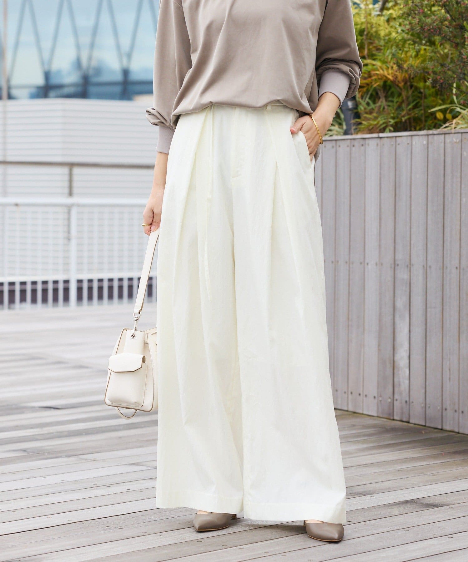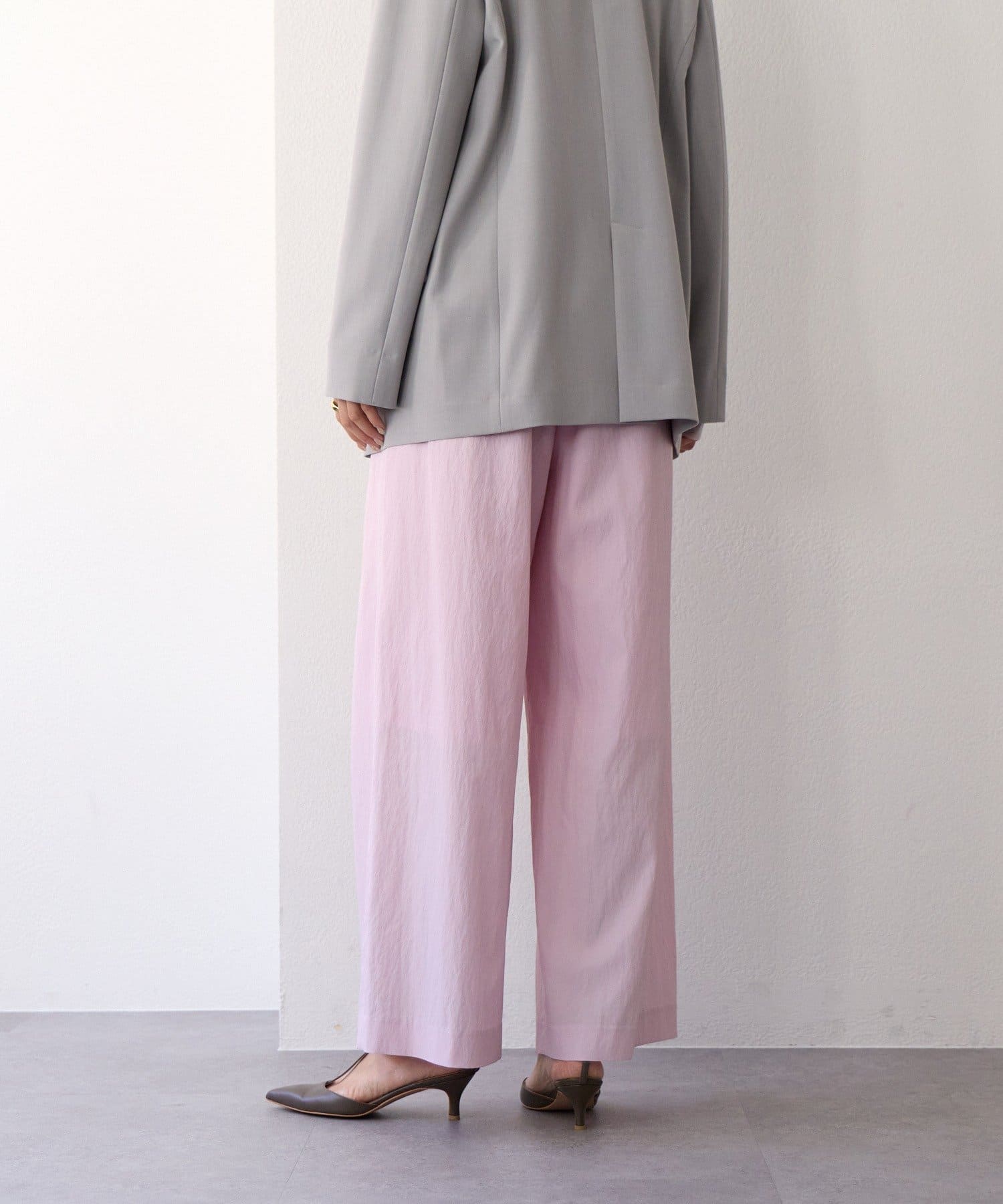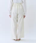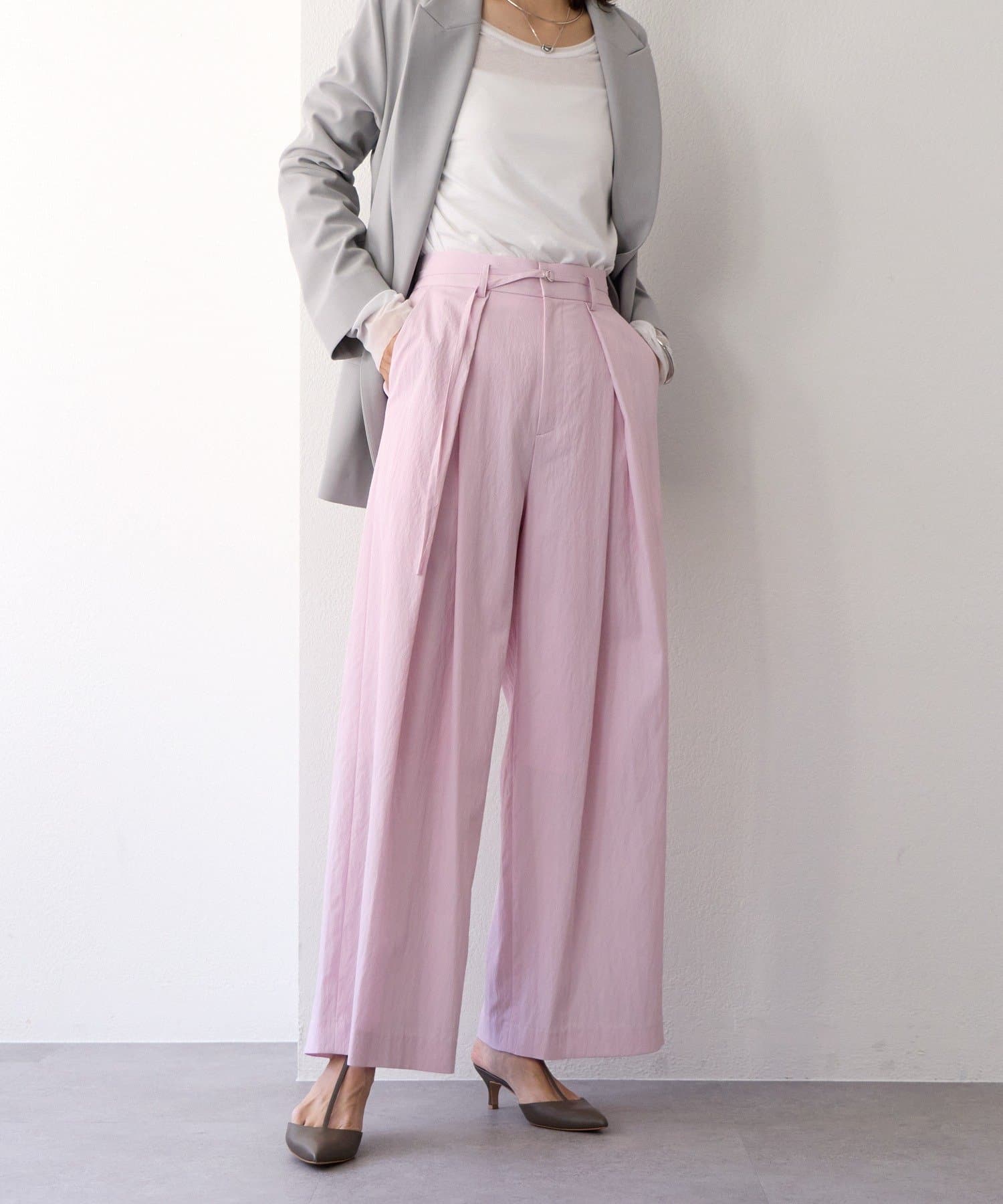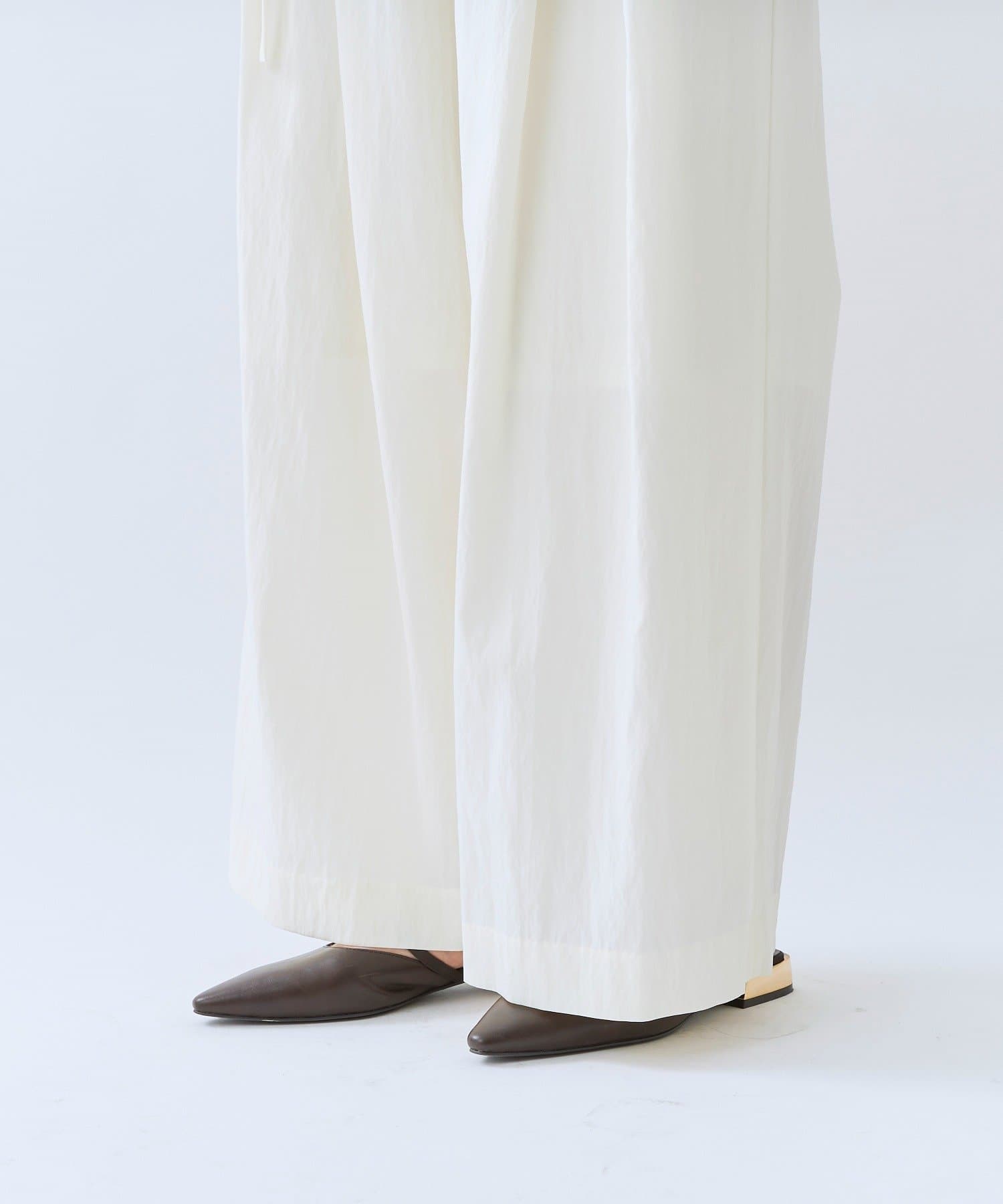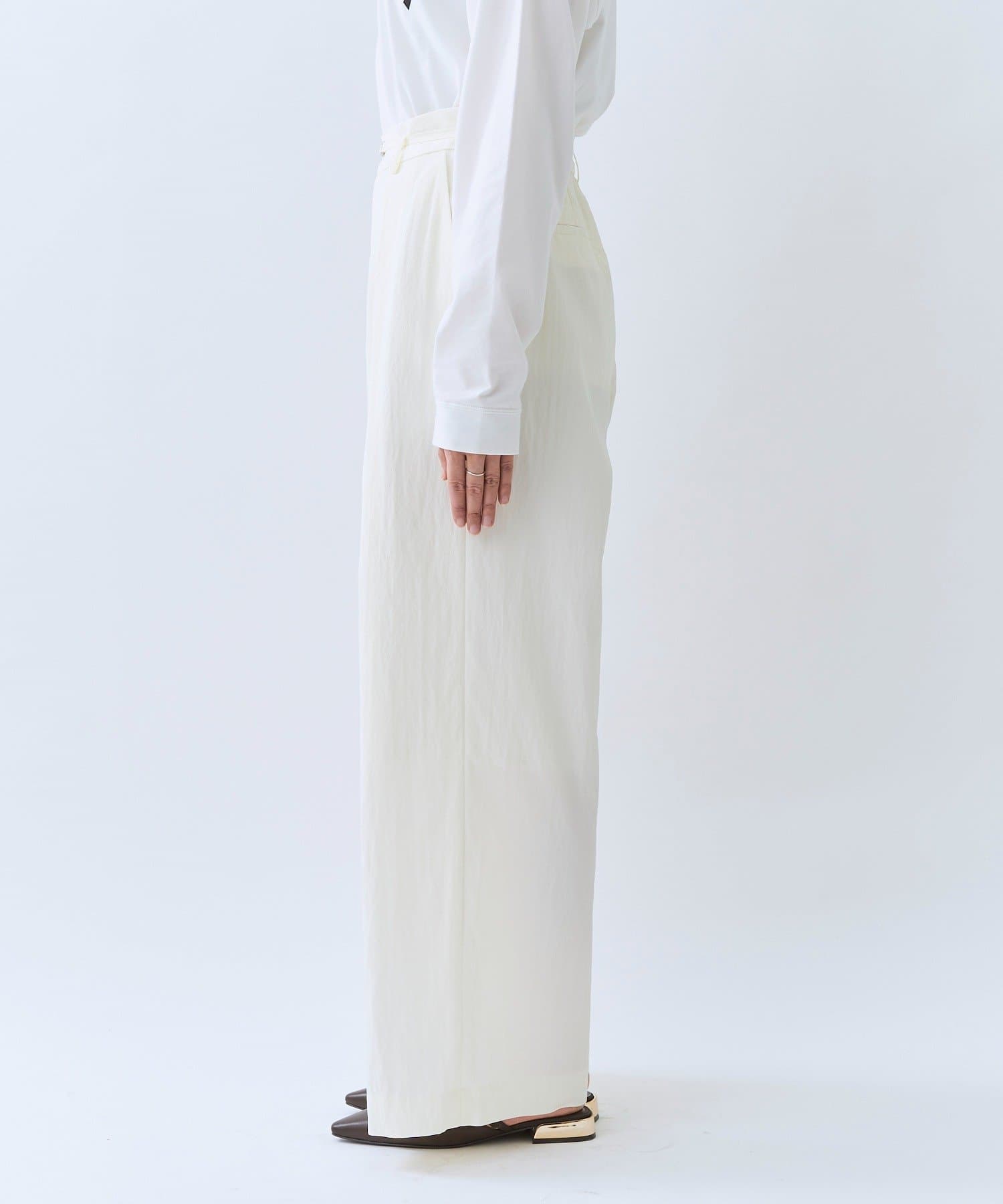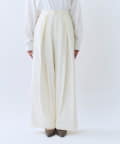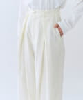・クロスしたタックがデザインポイントのワイドパンツ。