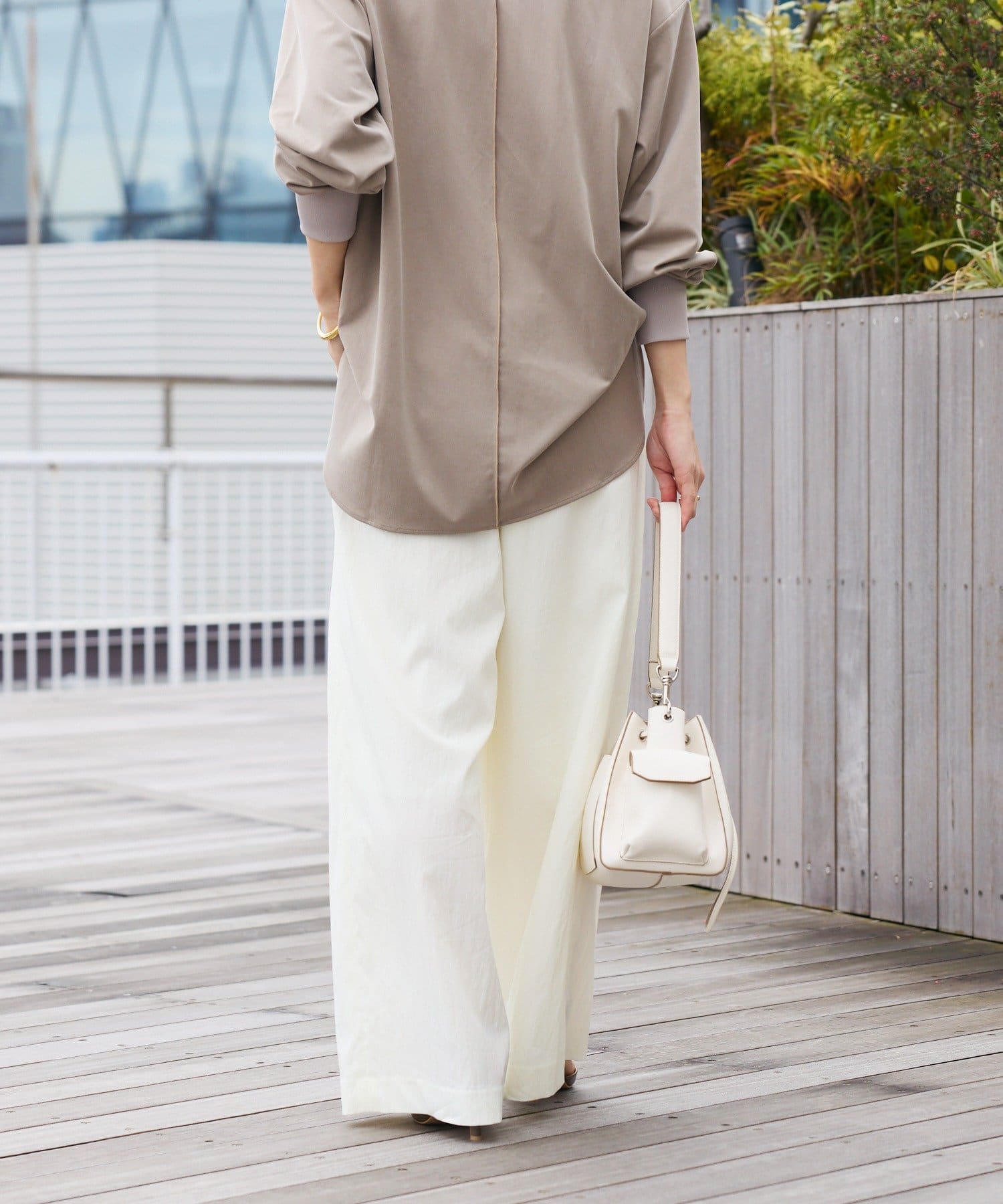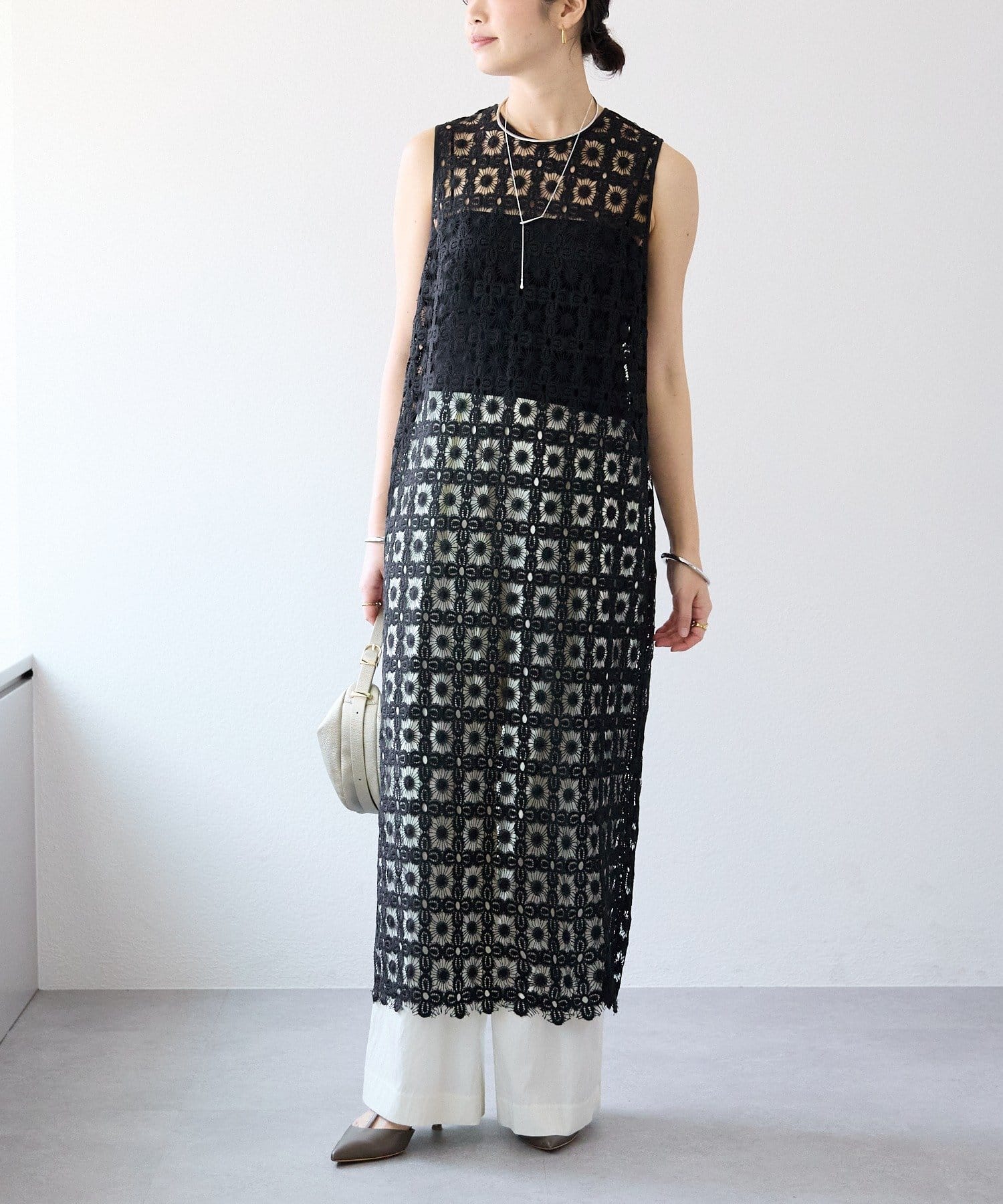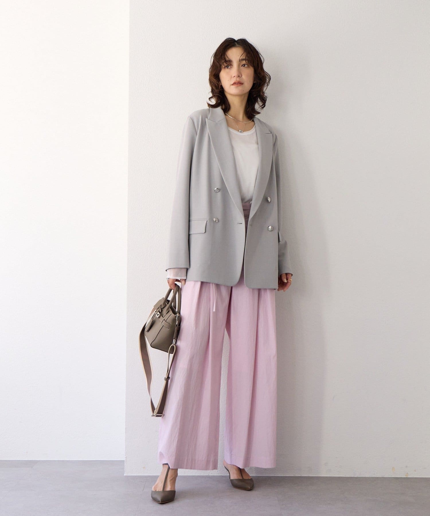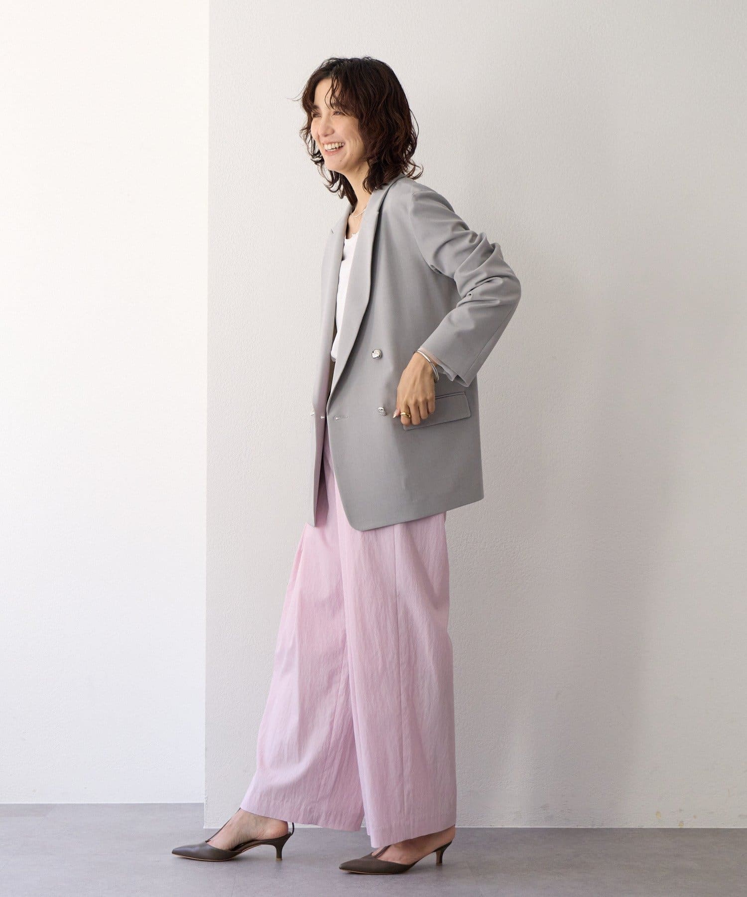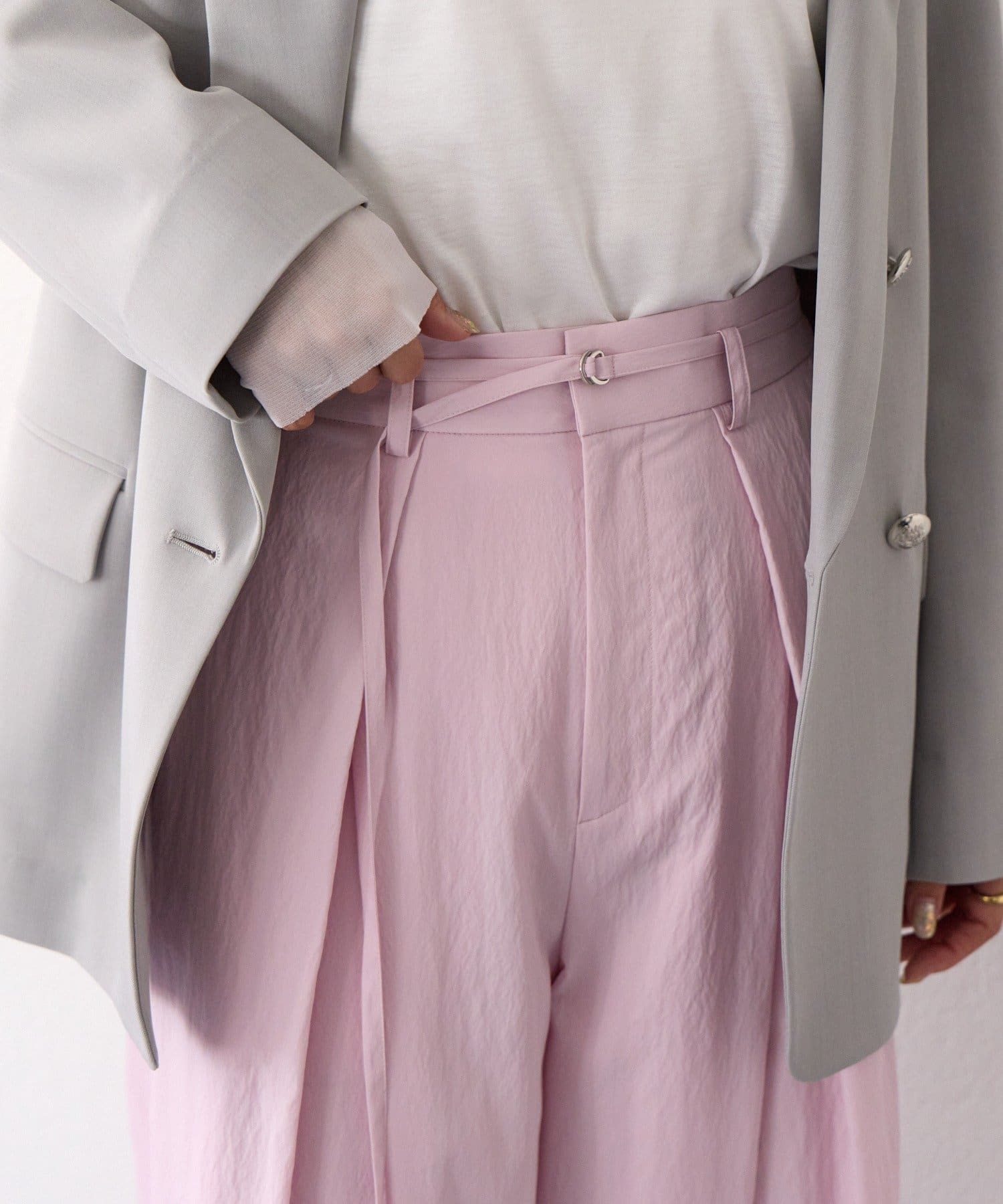 ・ハイウエストとワイドシルエットがメリハリを生むデザインです。