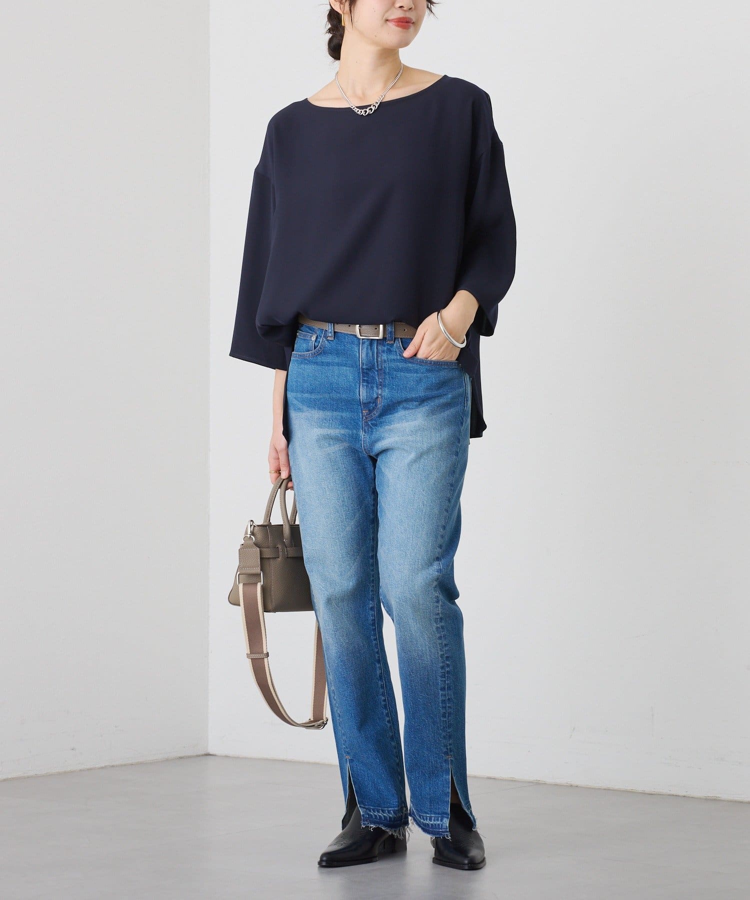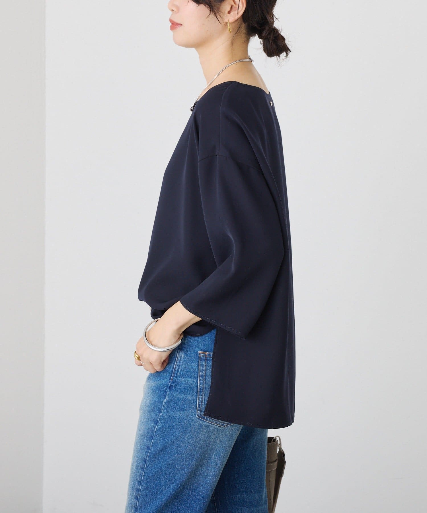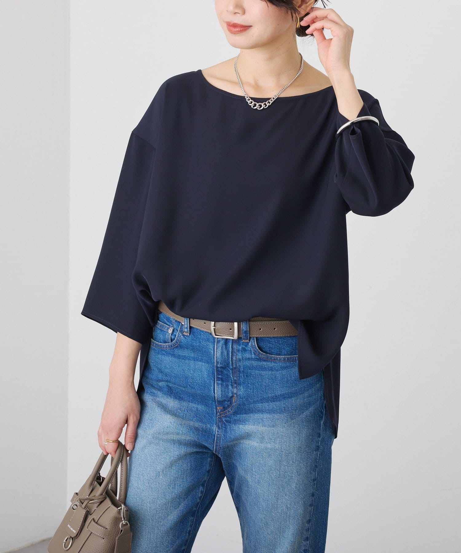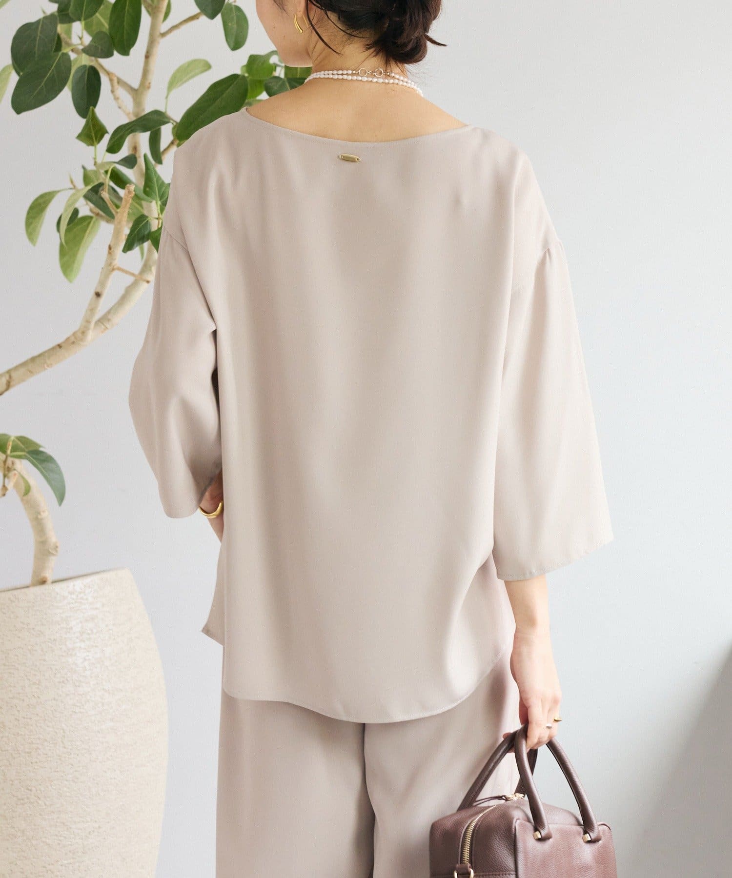 ・横に抜けた衿ぐりと、手首の覗く袖丈で女性らしい抜けのあるブラウス