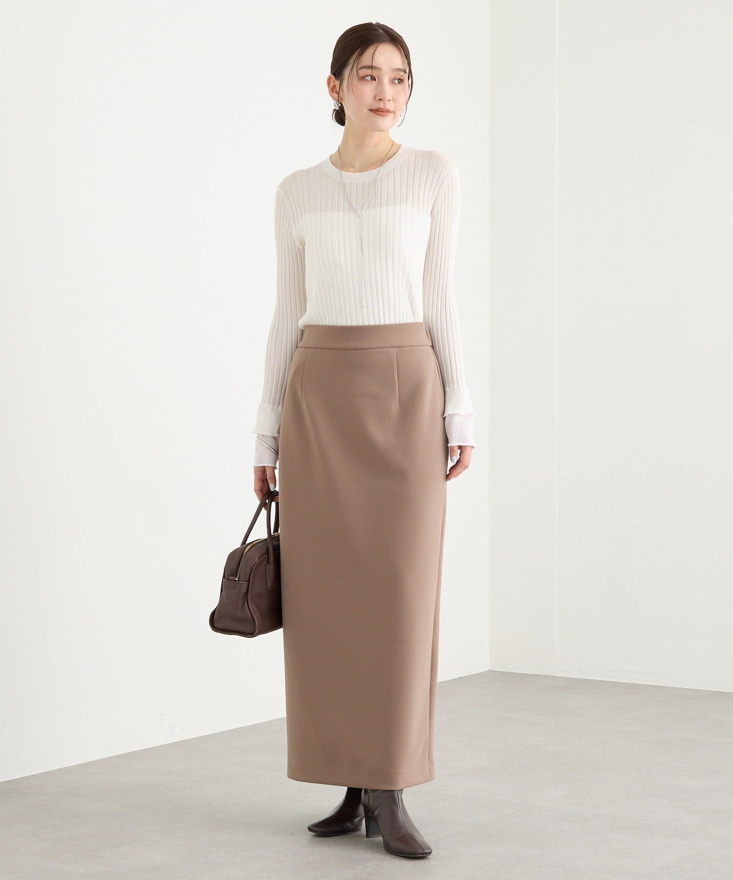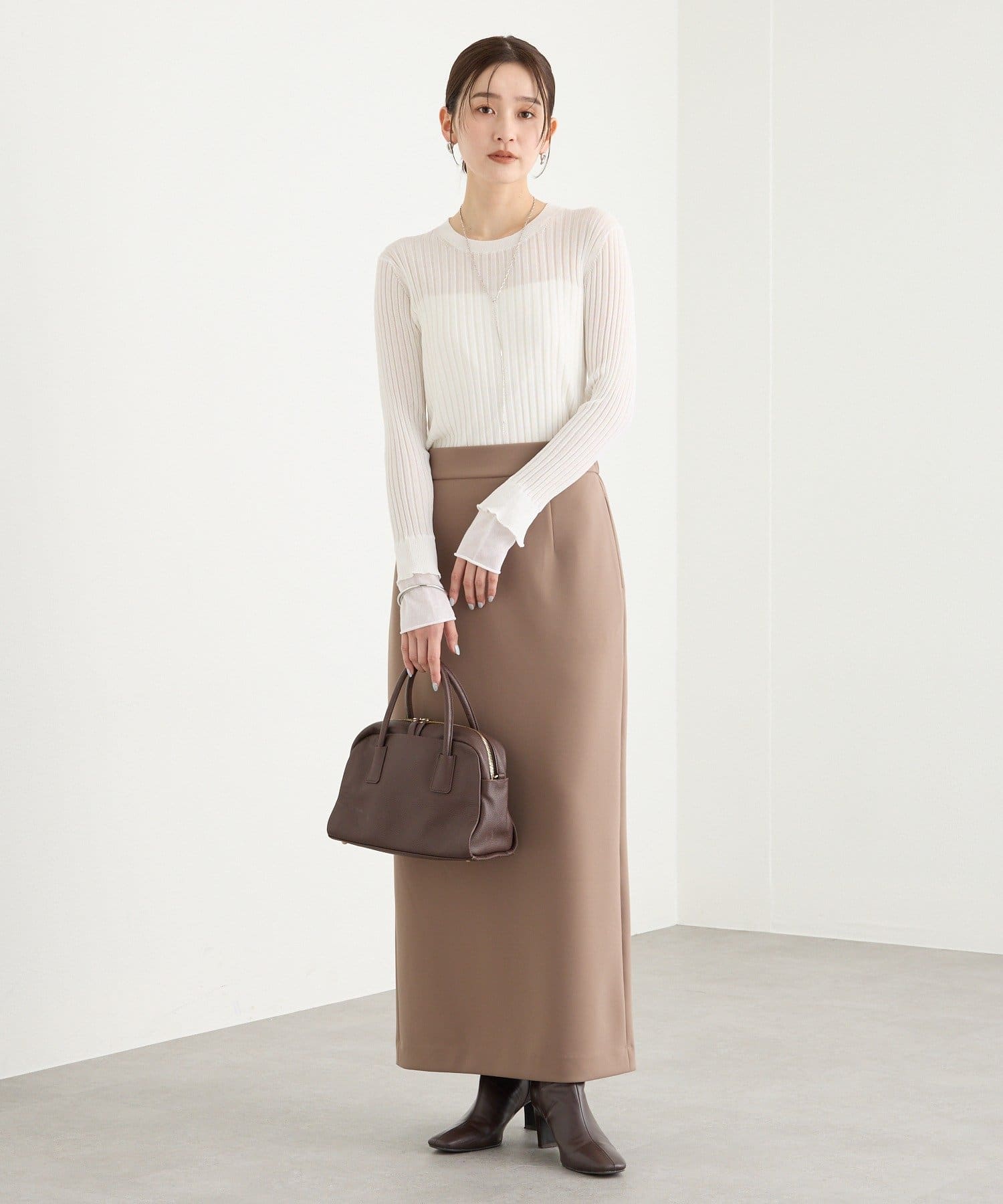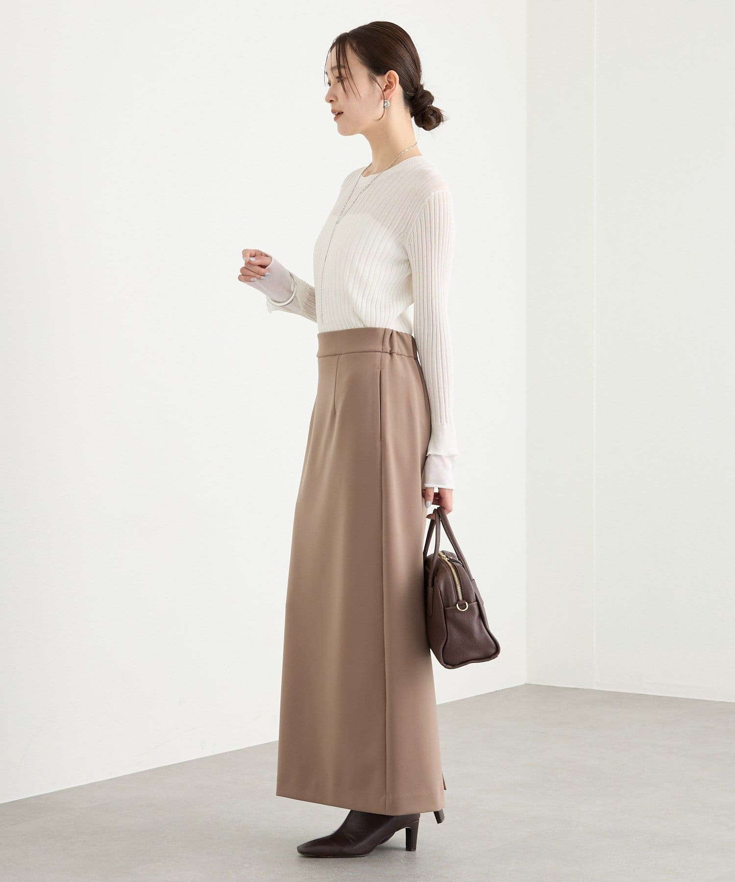 ・デコルテを感じさせる女性らしいクルーネックもポイントです。