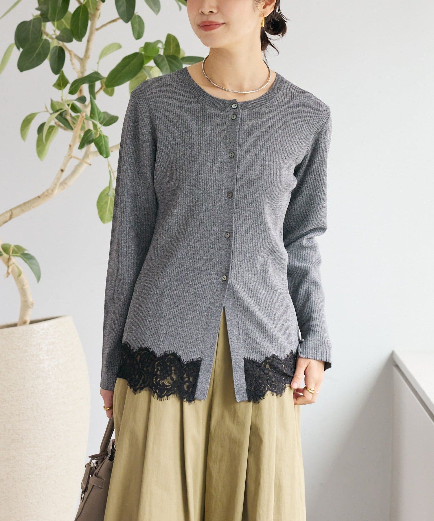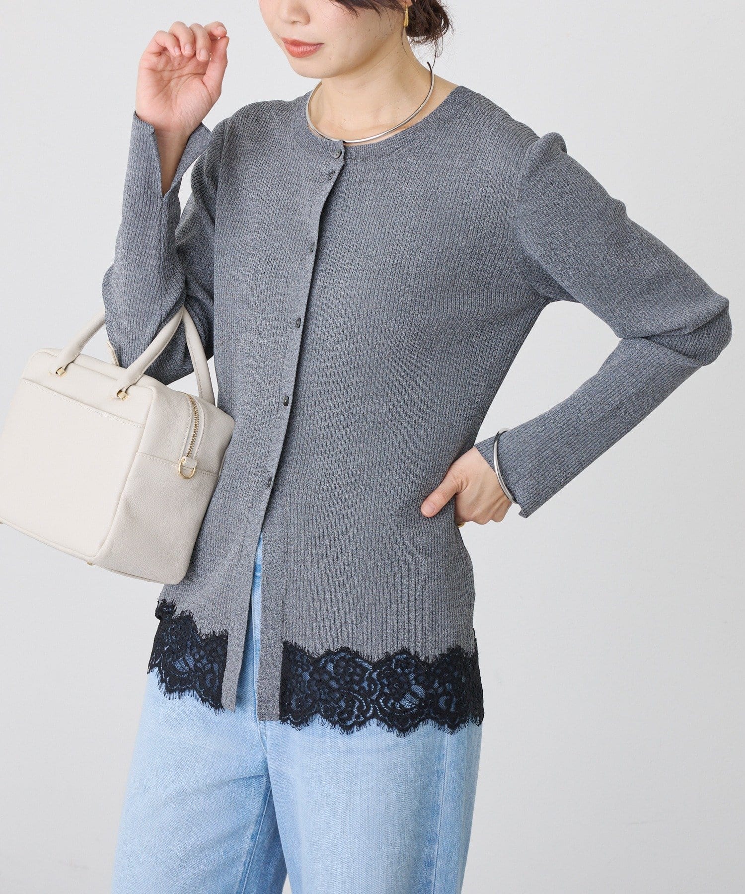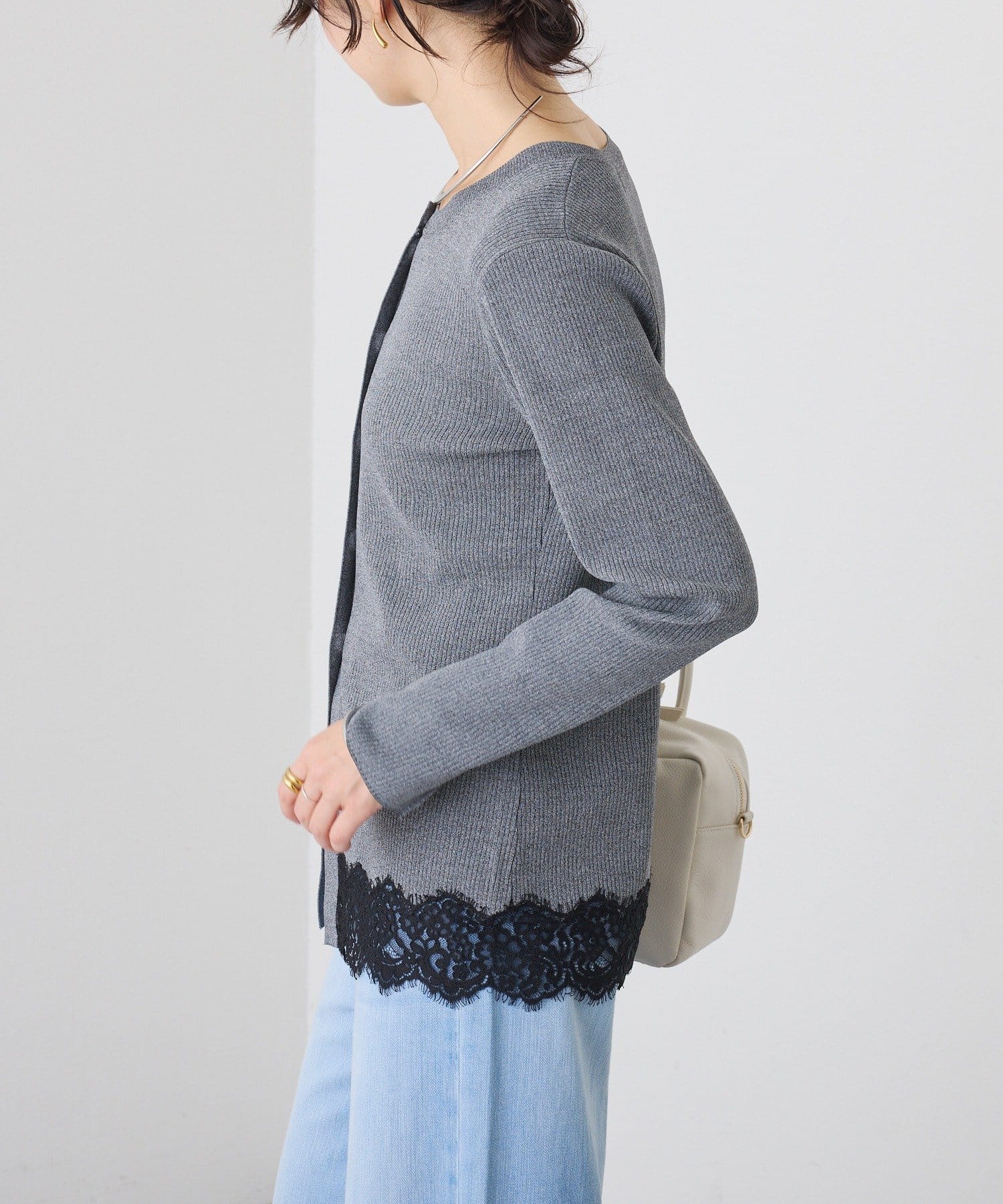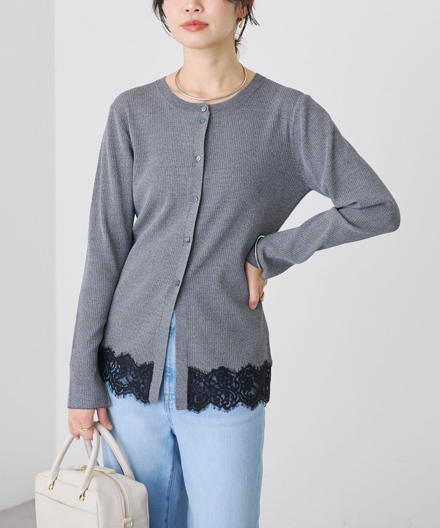 ・今季トレンドの繊細なレース使いを取り入れて、鮮度を出したニットカーディガン