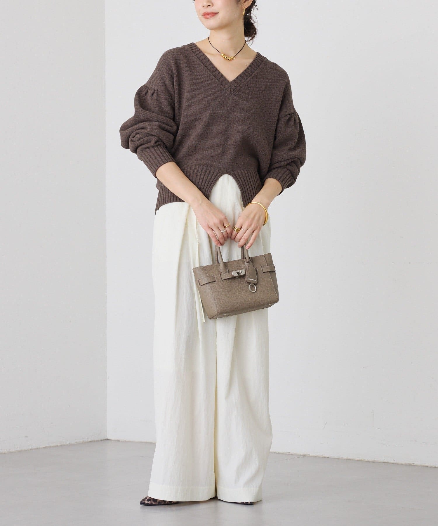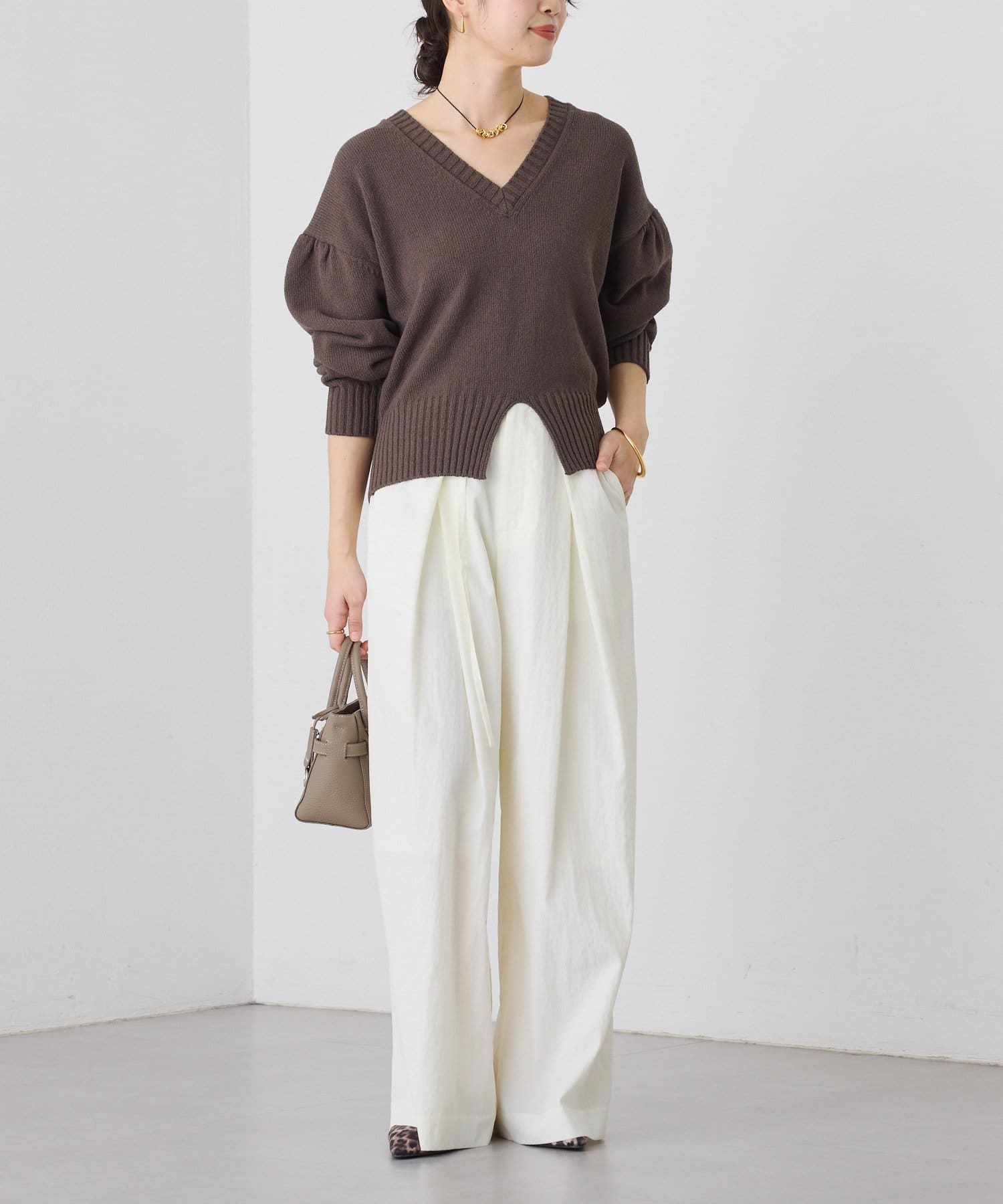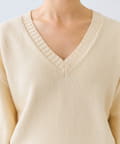 ・深めのVネックと袖のボリューム感、短めの着丈のバランスが可愛く着映えするニット