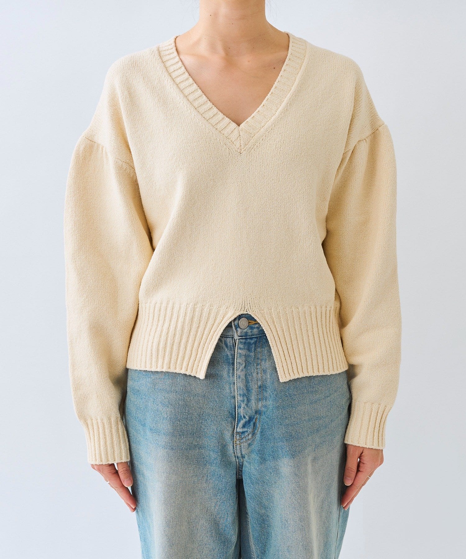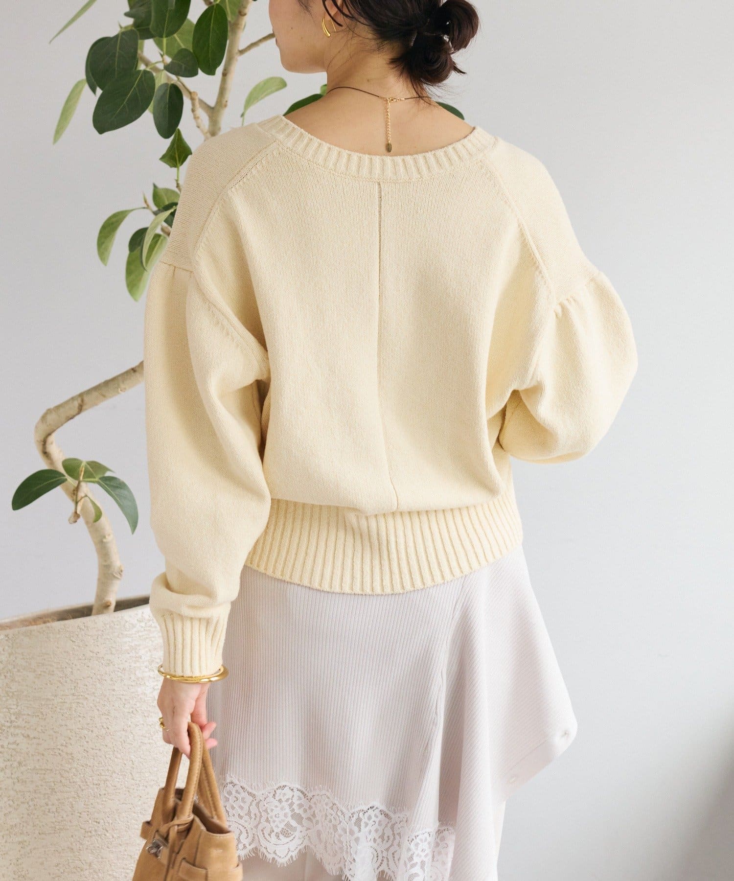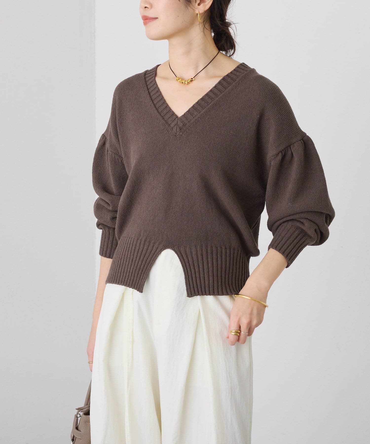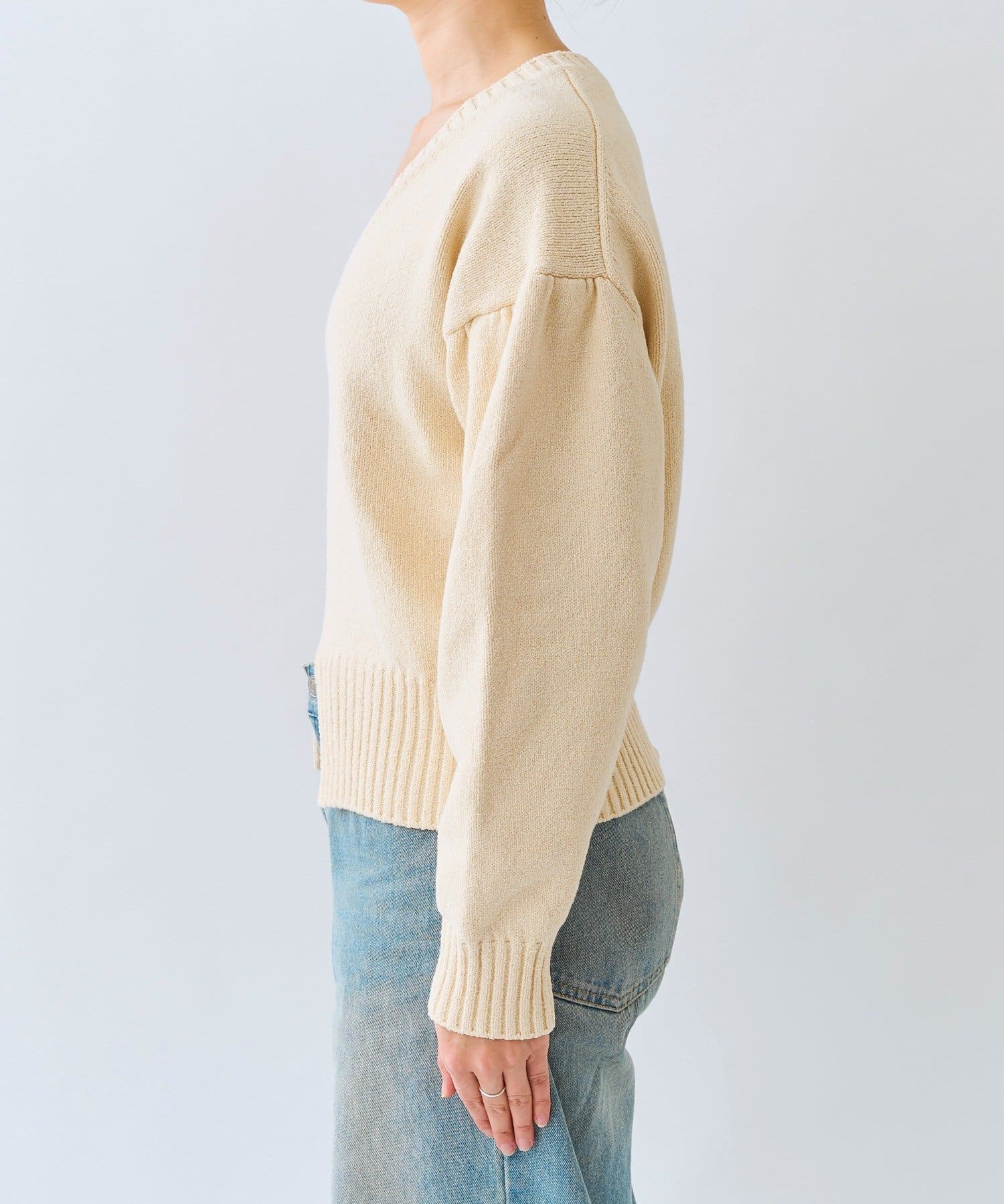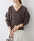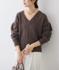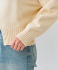 • 深めのVネックと袖のボリューム感、短めの着丈のバランスが可愛い着映えするニット