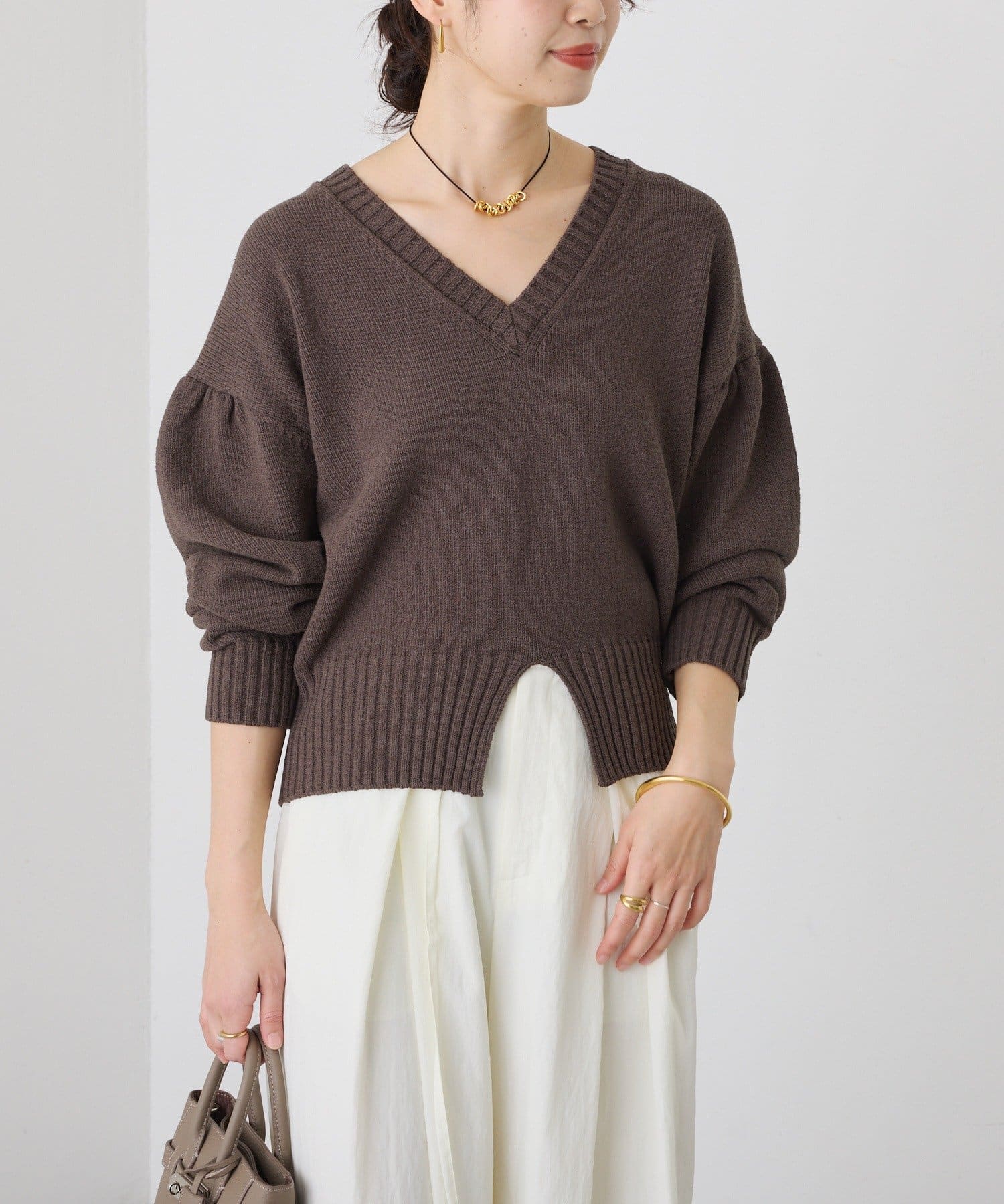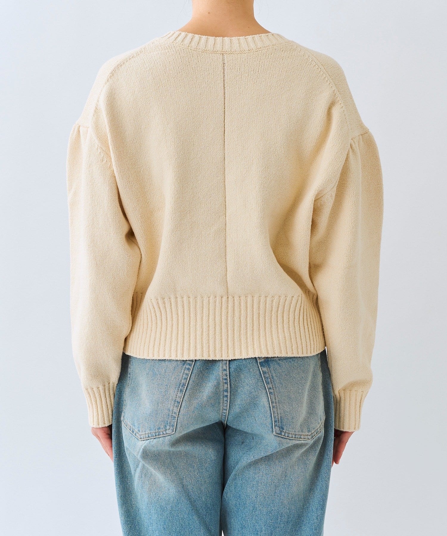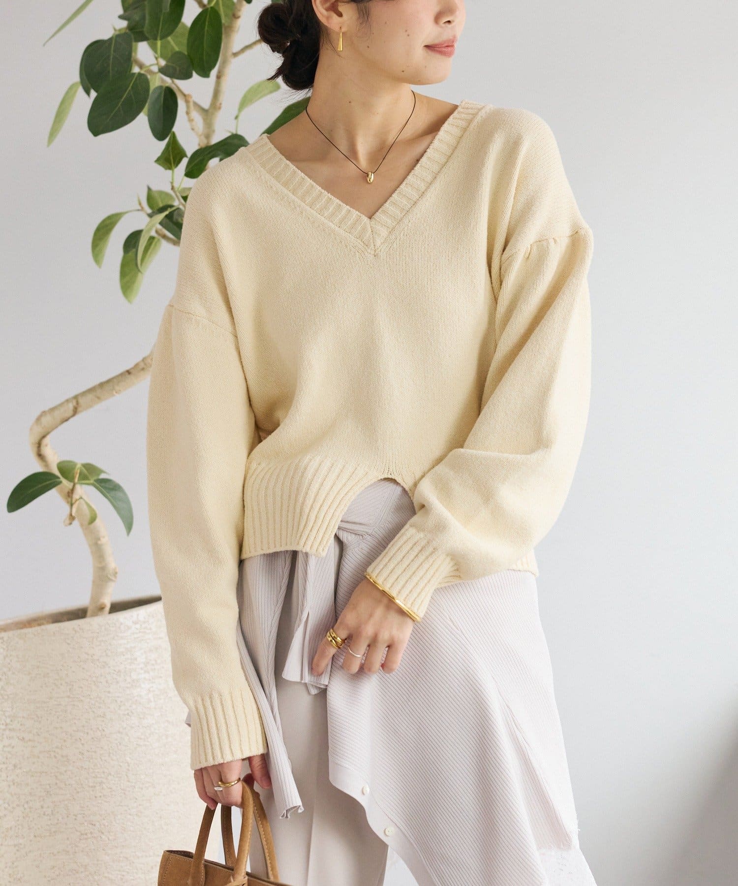 • 深めのVネックと袖のボリューム感、短めの着丈のバランスが可愛い着映えするニット