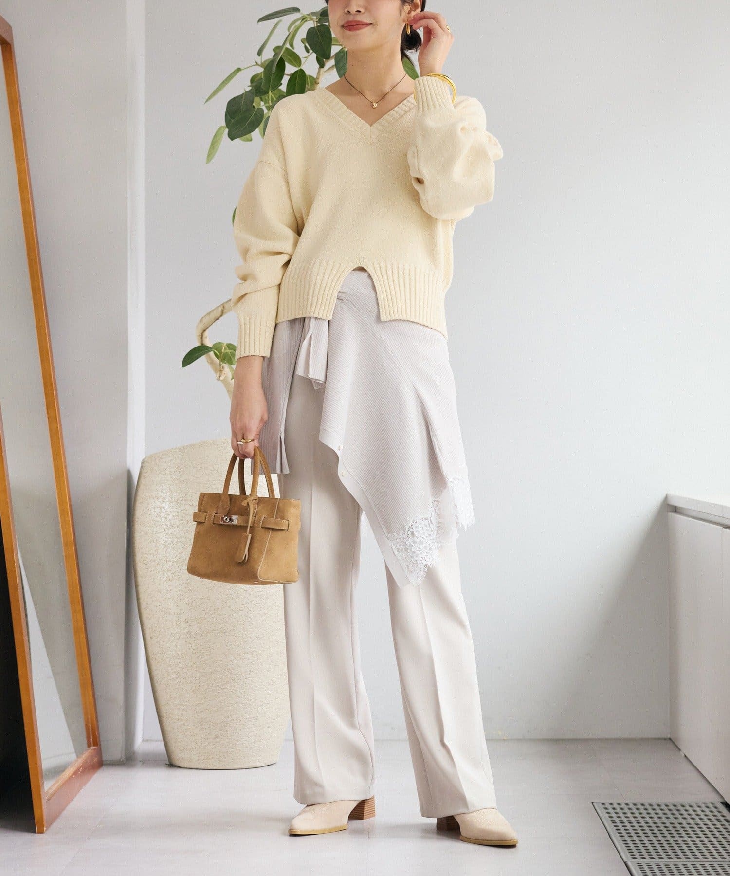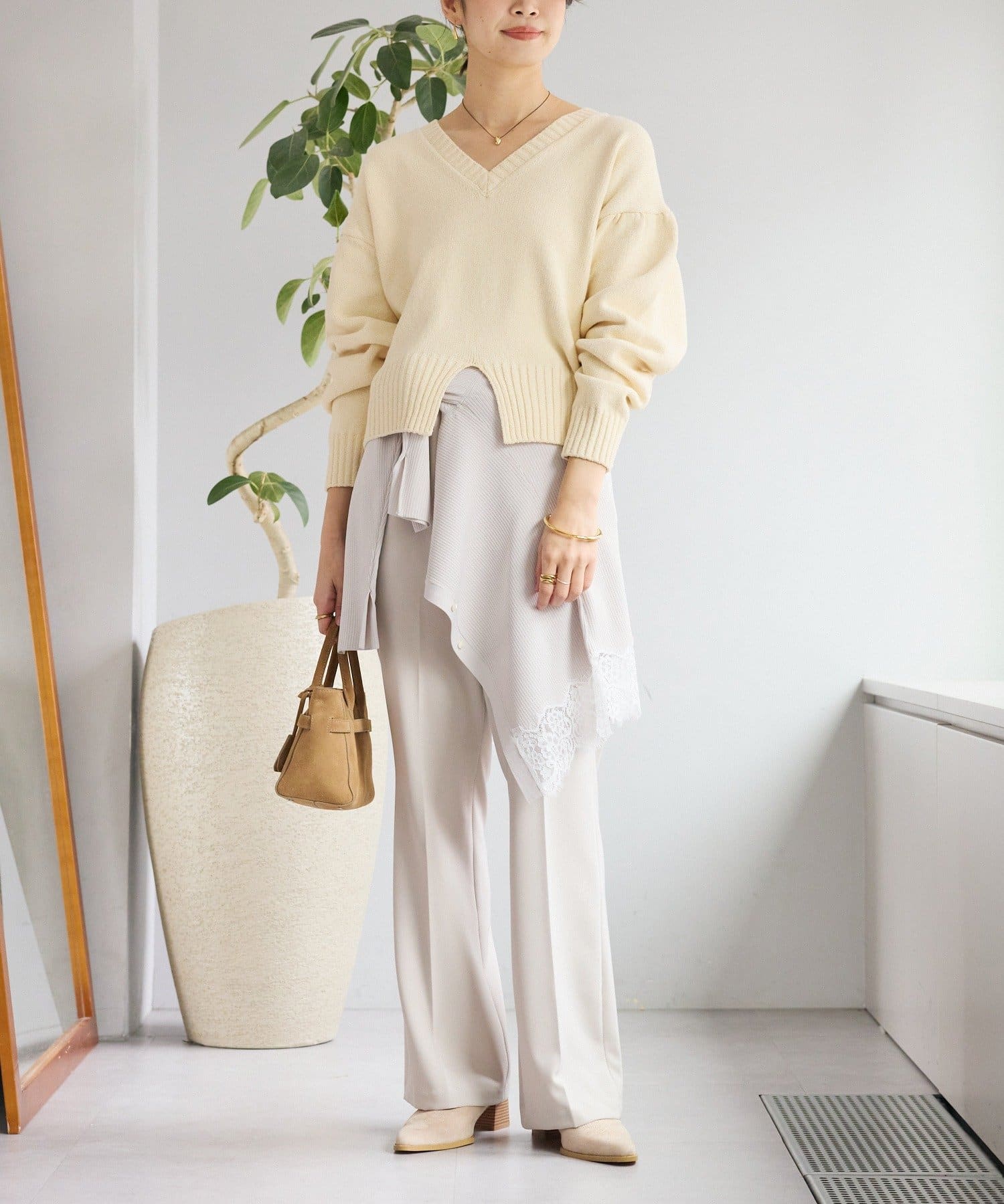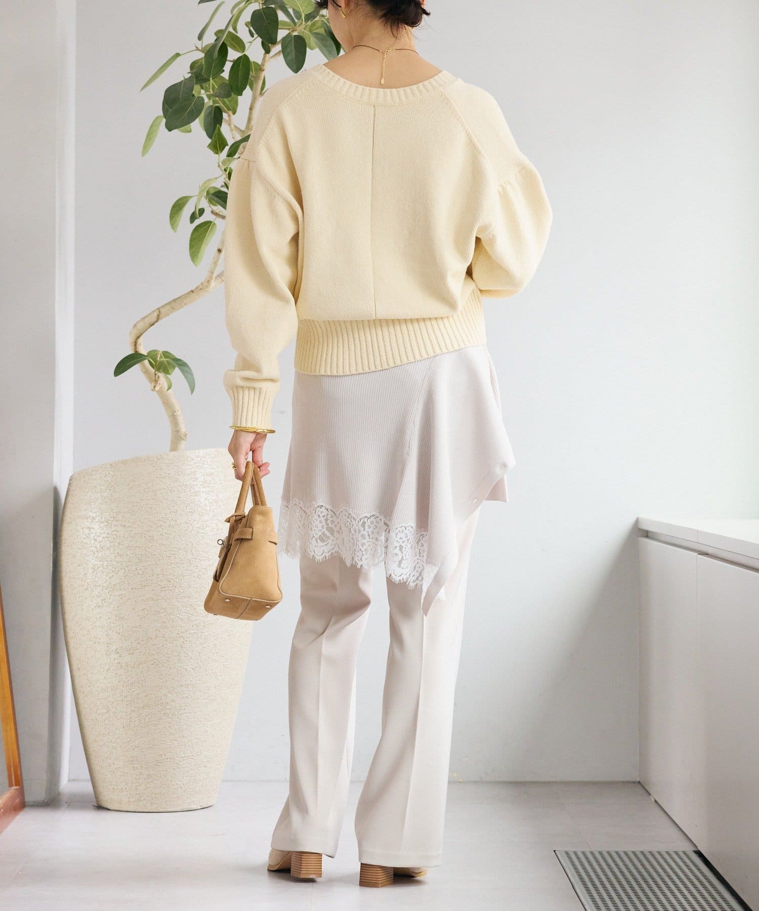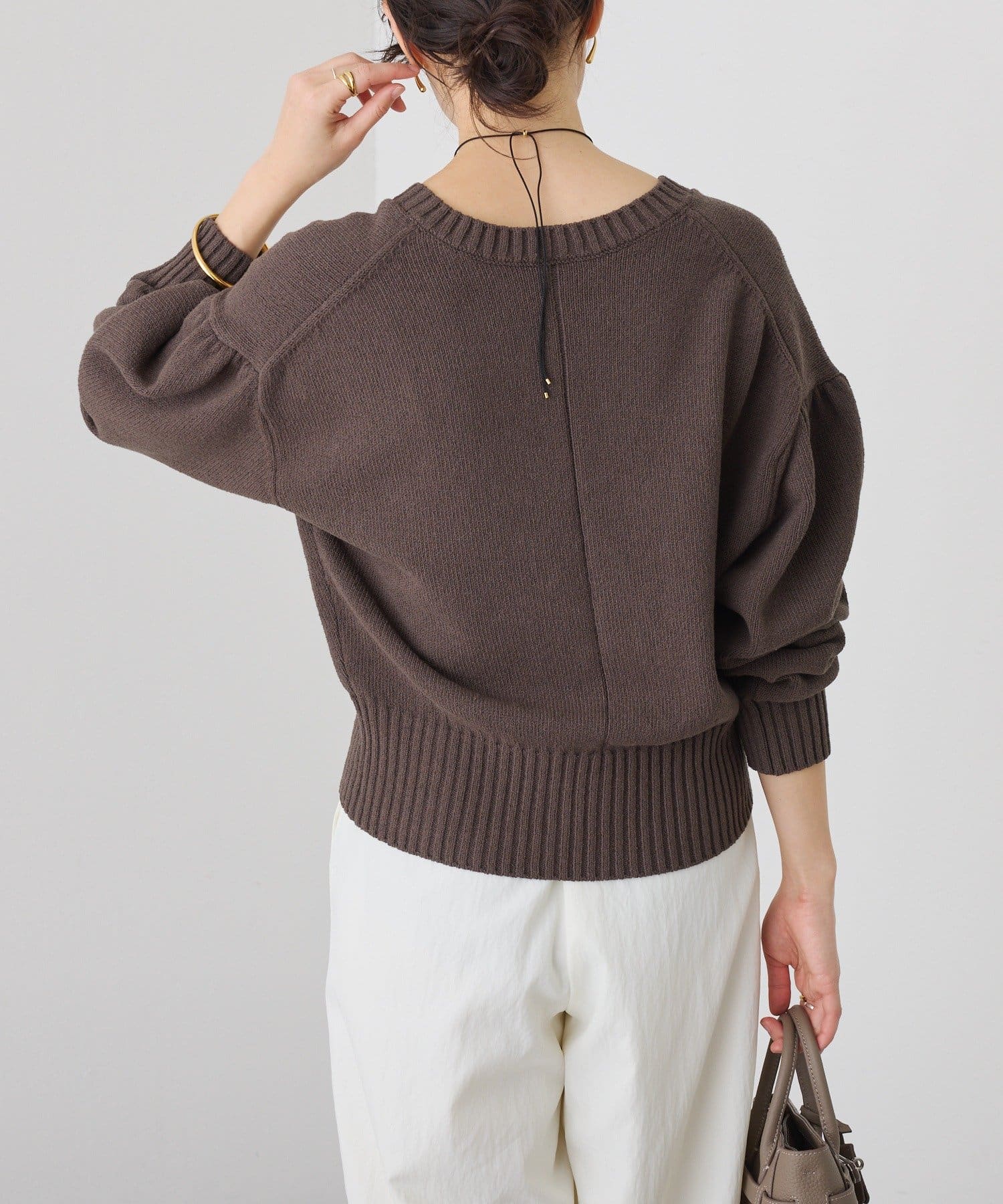 • 深めのVネックと袖のボリューム感、短めの着丈のバランスが可愛い着映えするニット