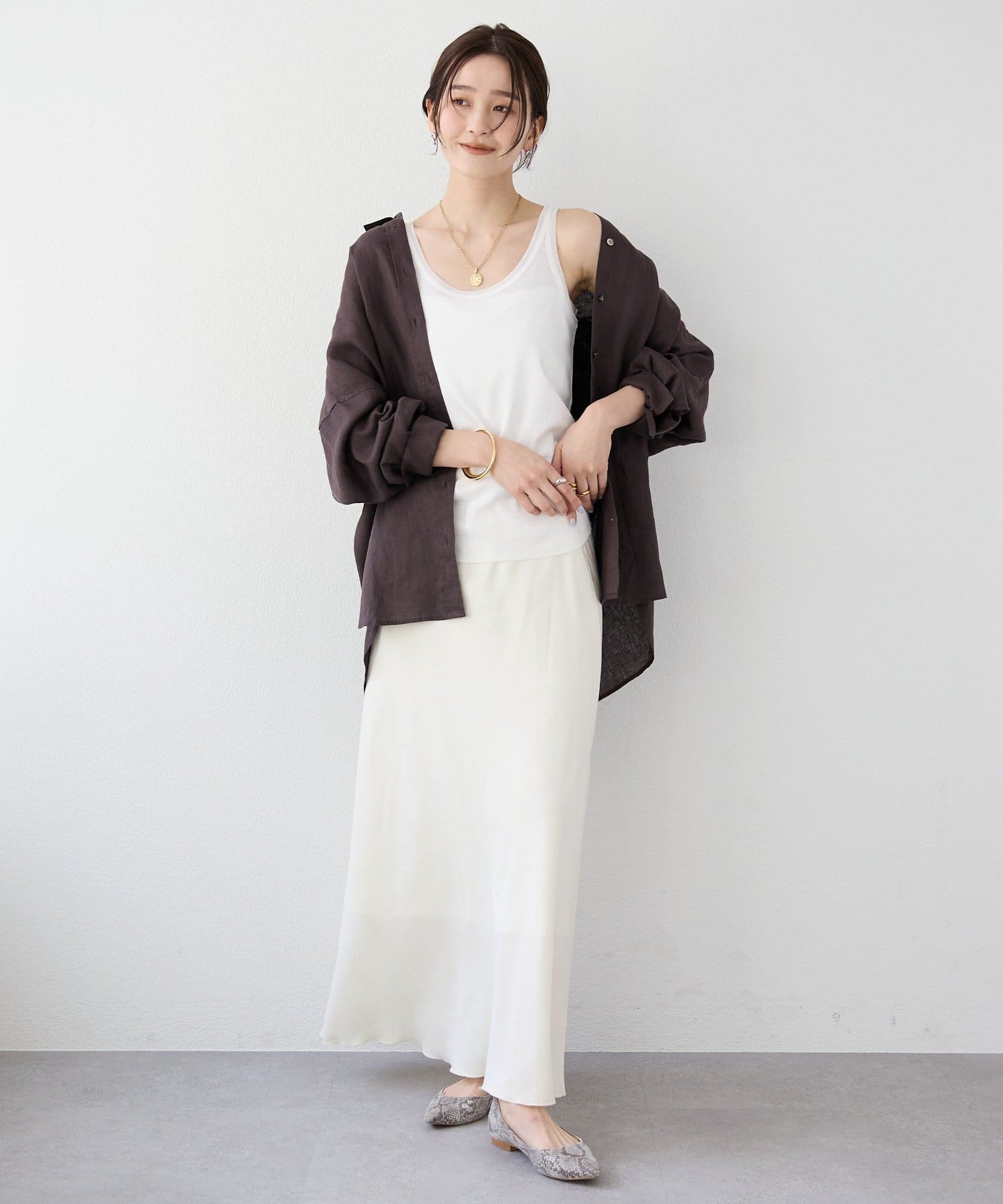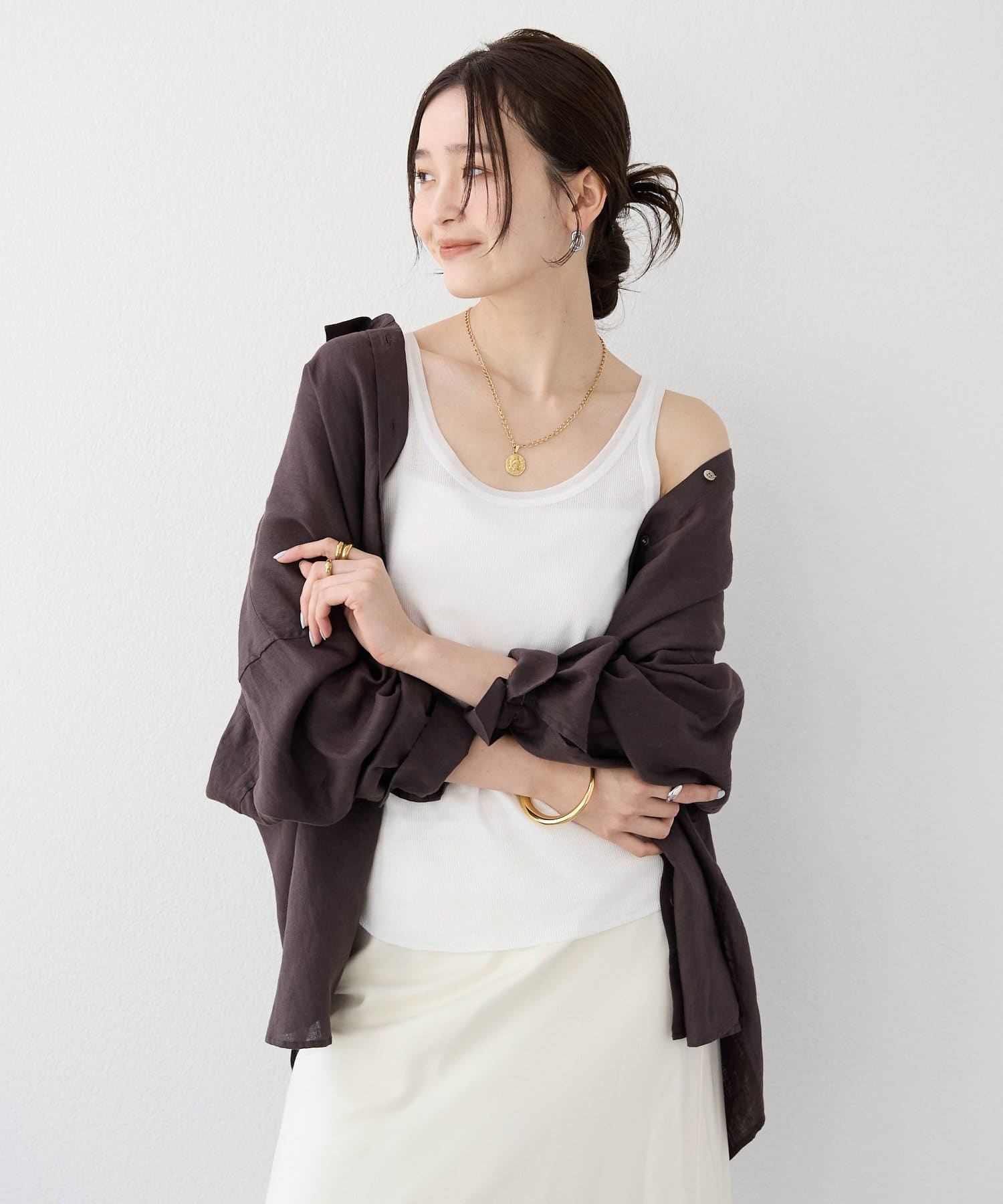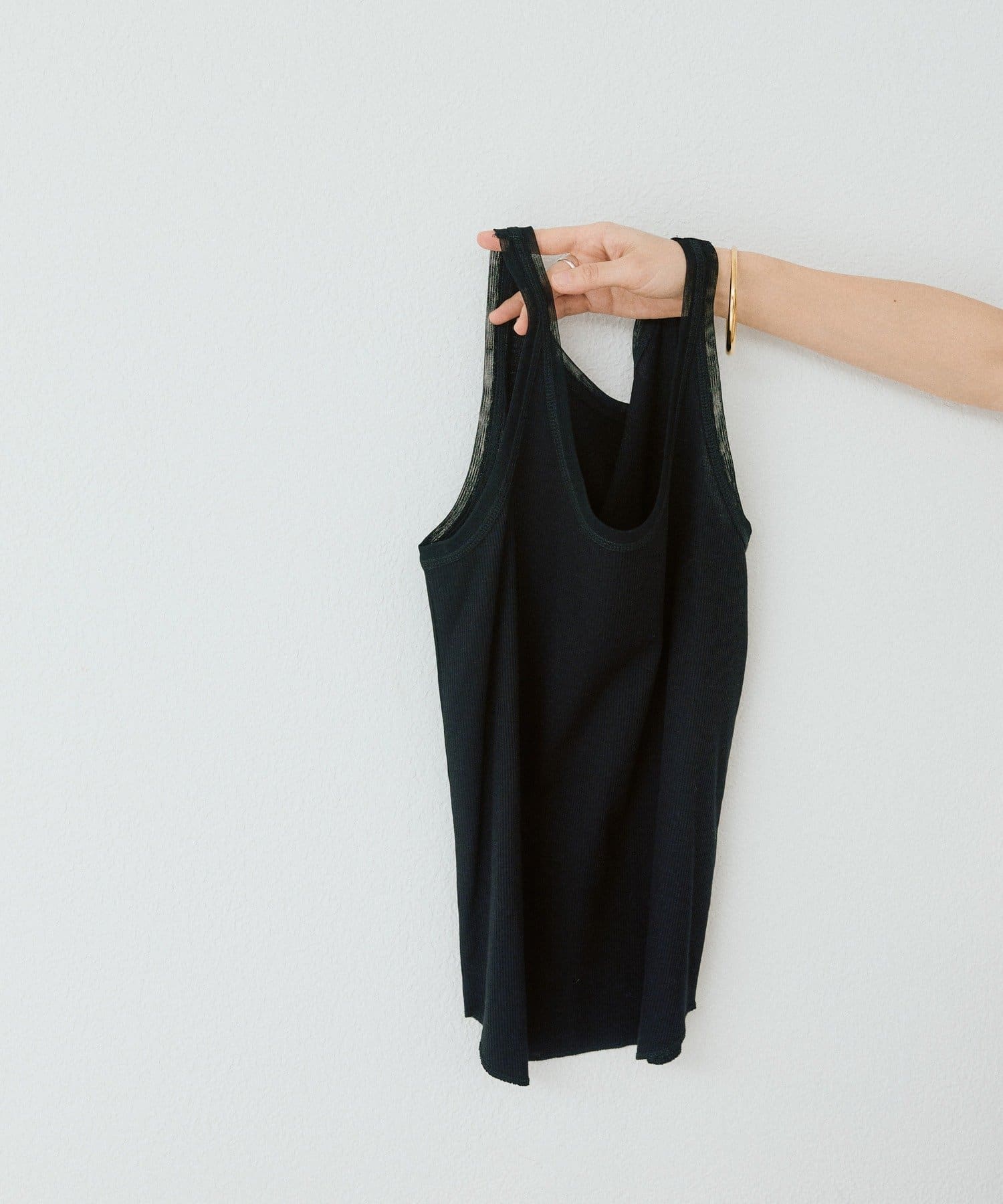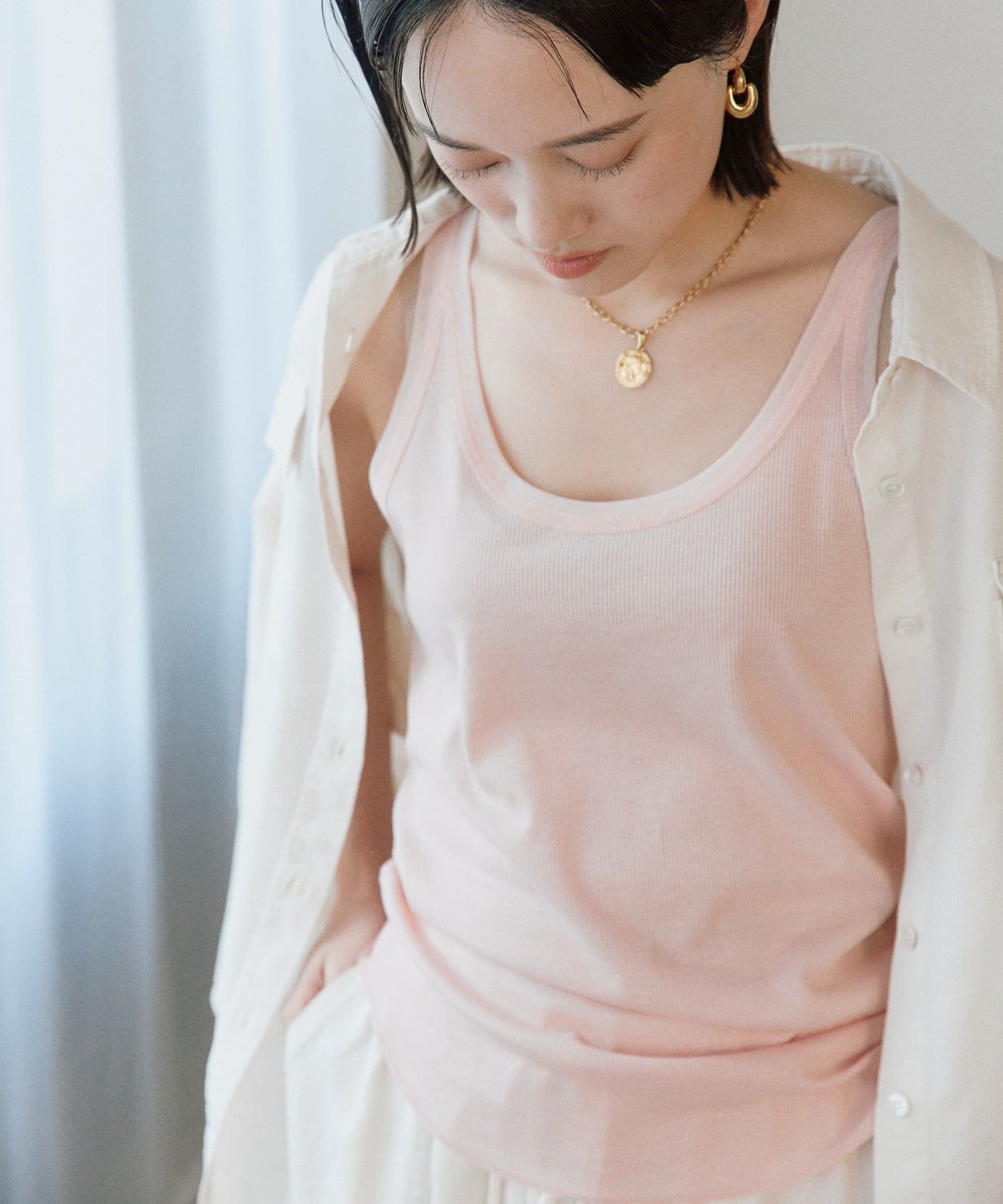 ・チュールのトリミングがポイントで、トップスとしても映えるタンクトップ。