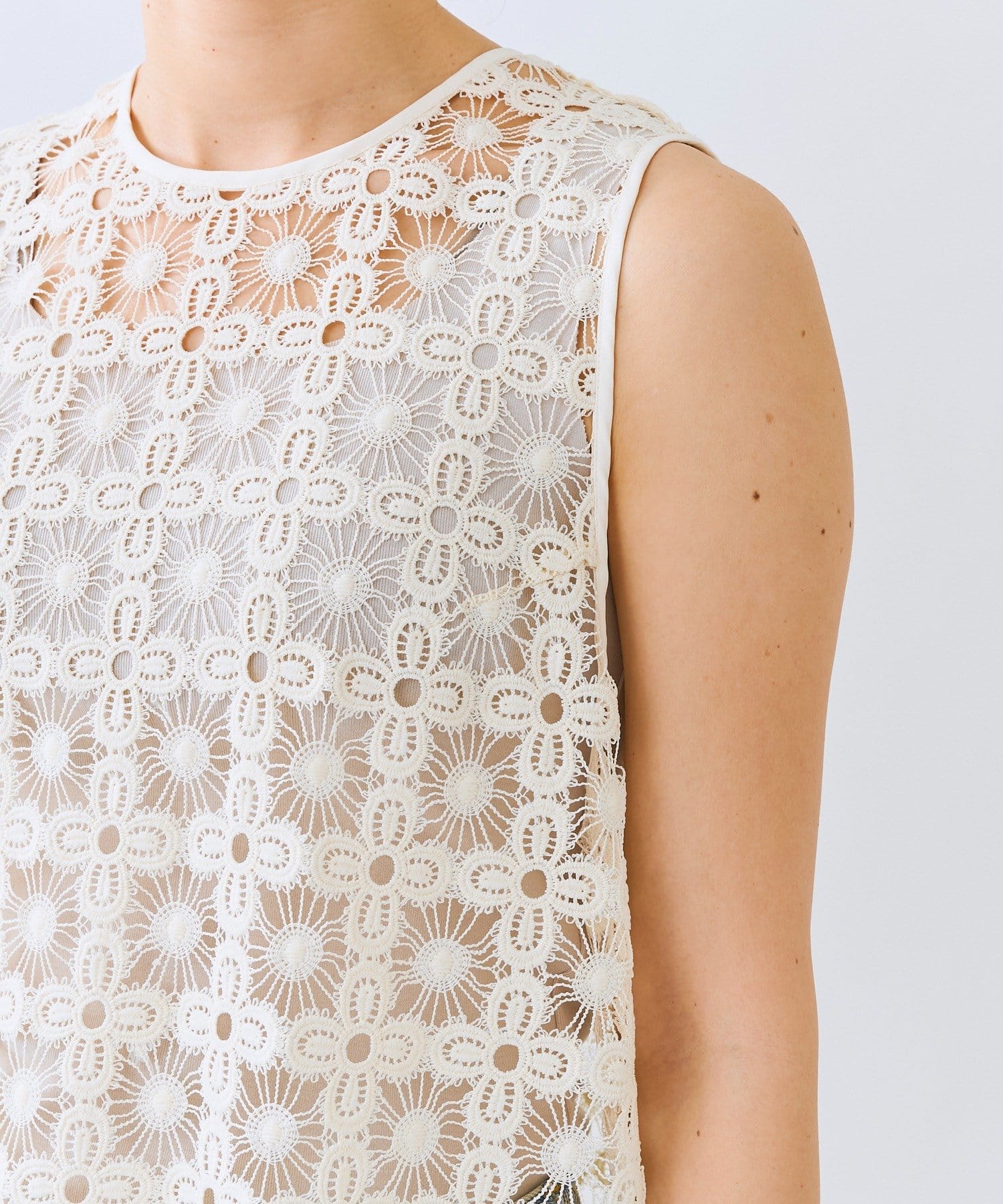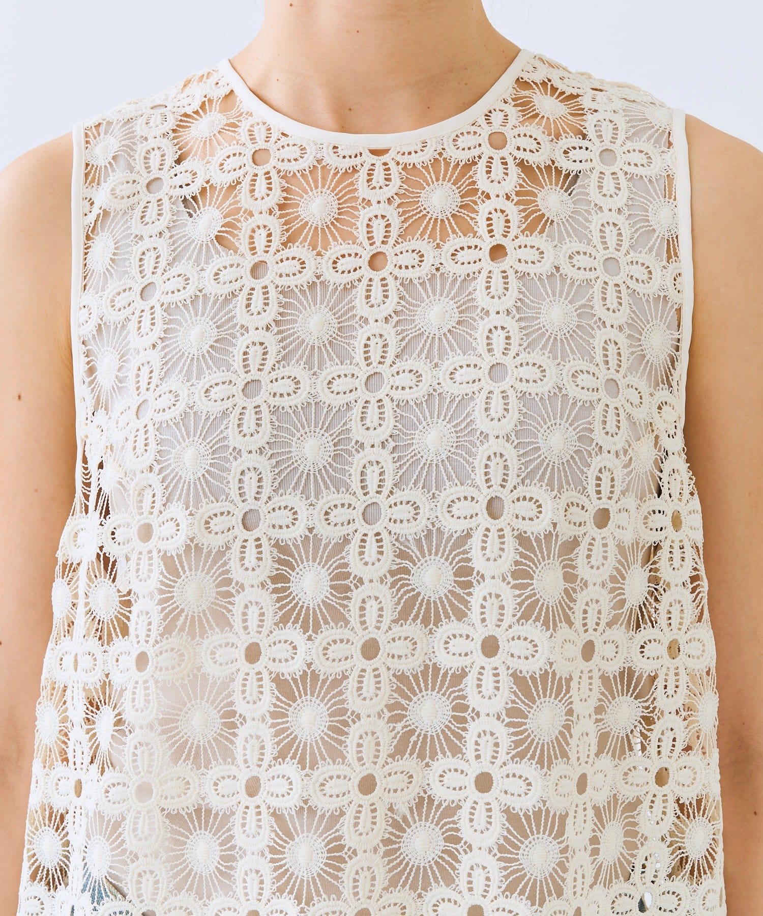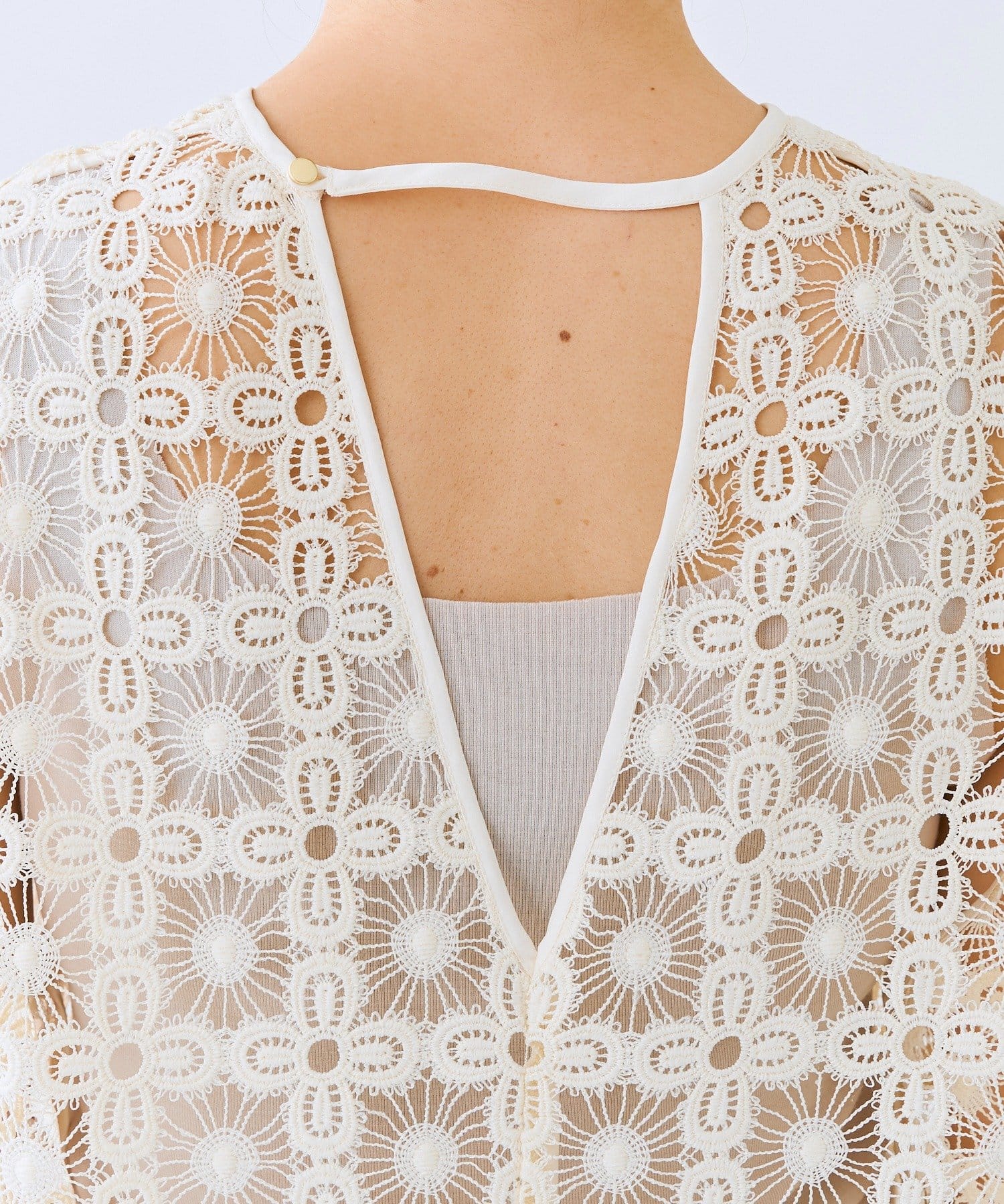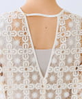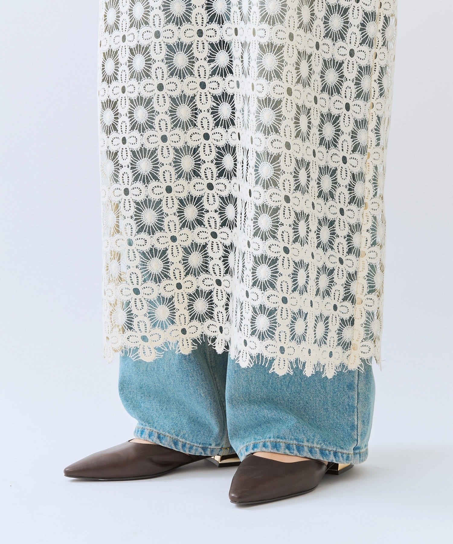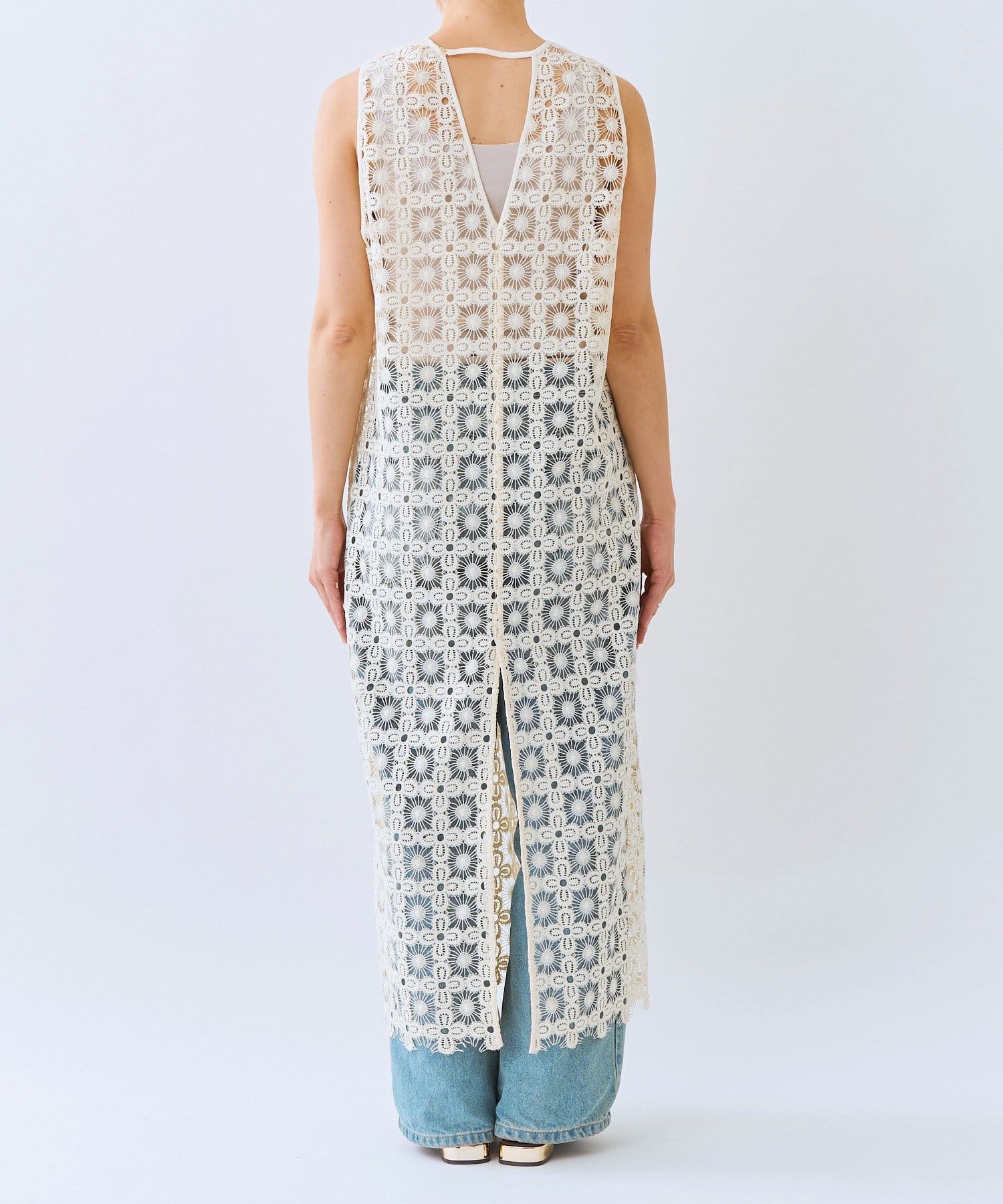 ・ミニマルなIラインシルエットとジオメトリックな柄行がマッチした総レースのワンピース。