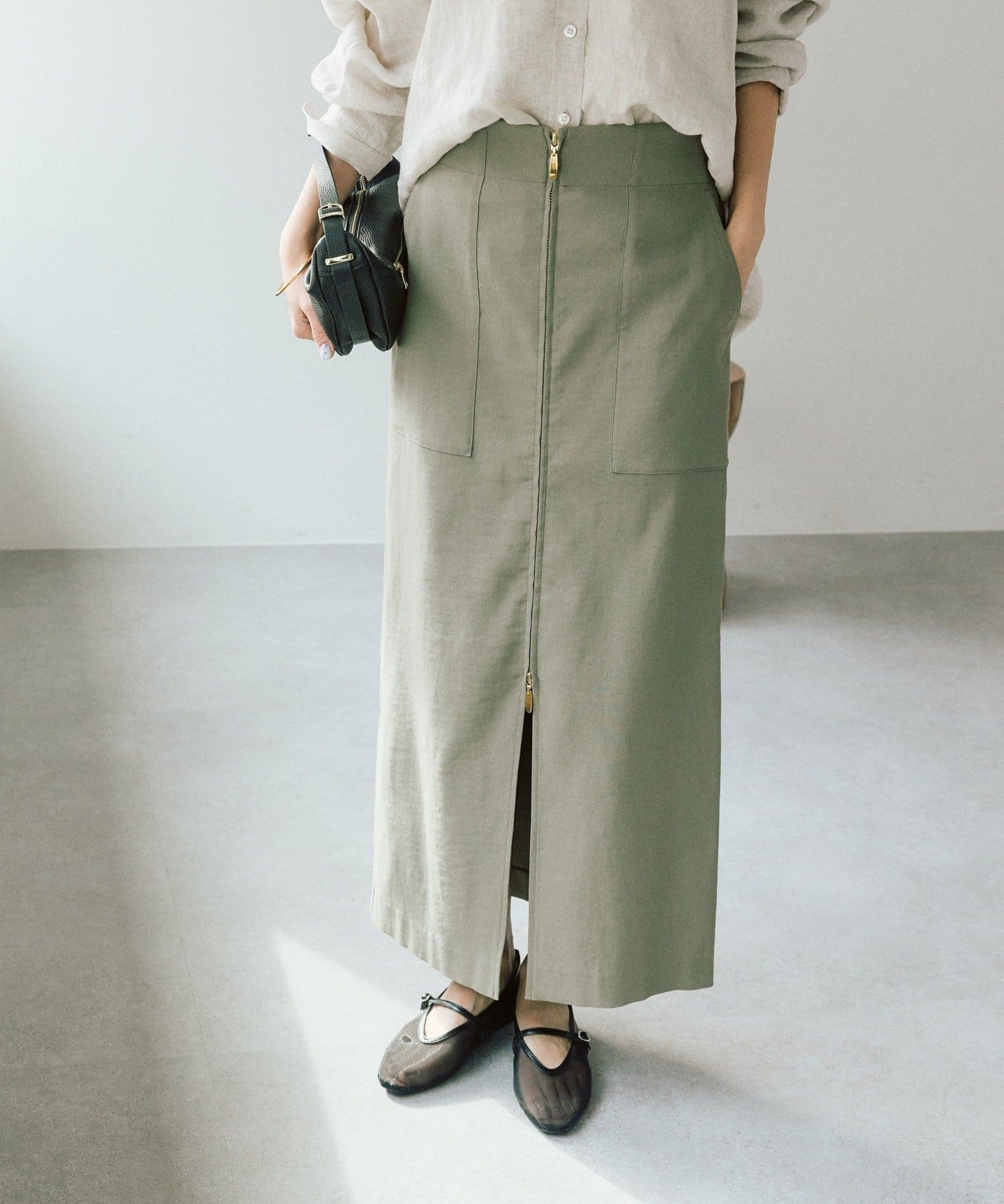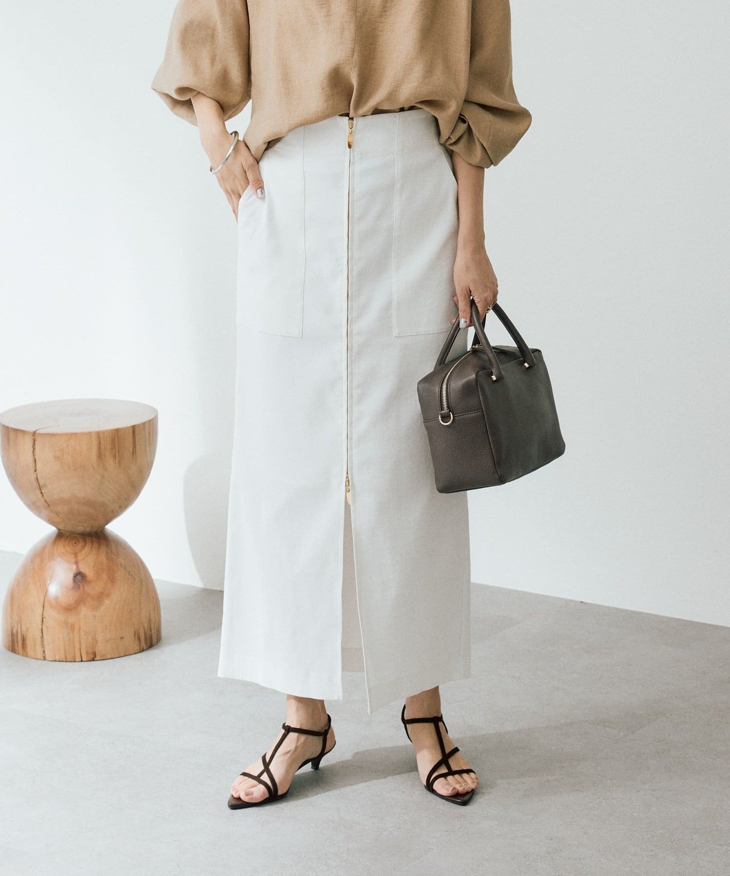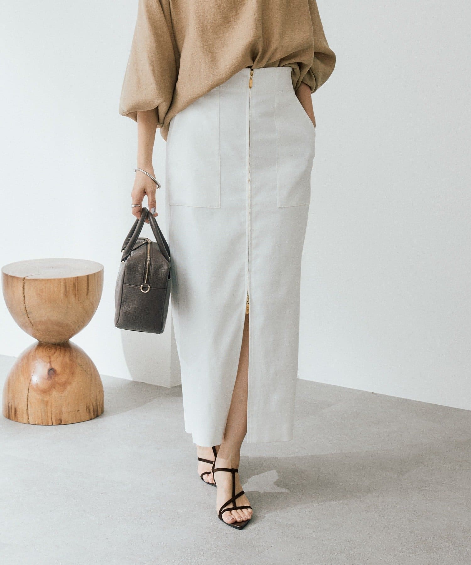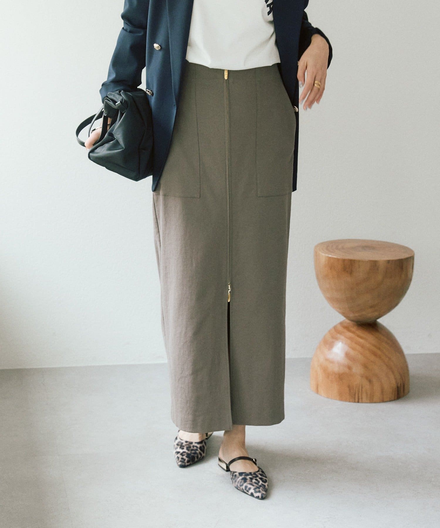 • フロントのファスナー切替で縦ラインを強調したタイトスカート