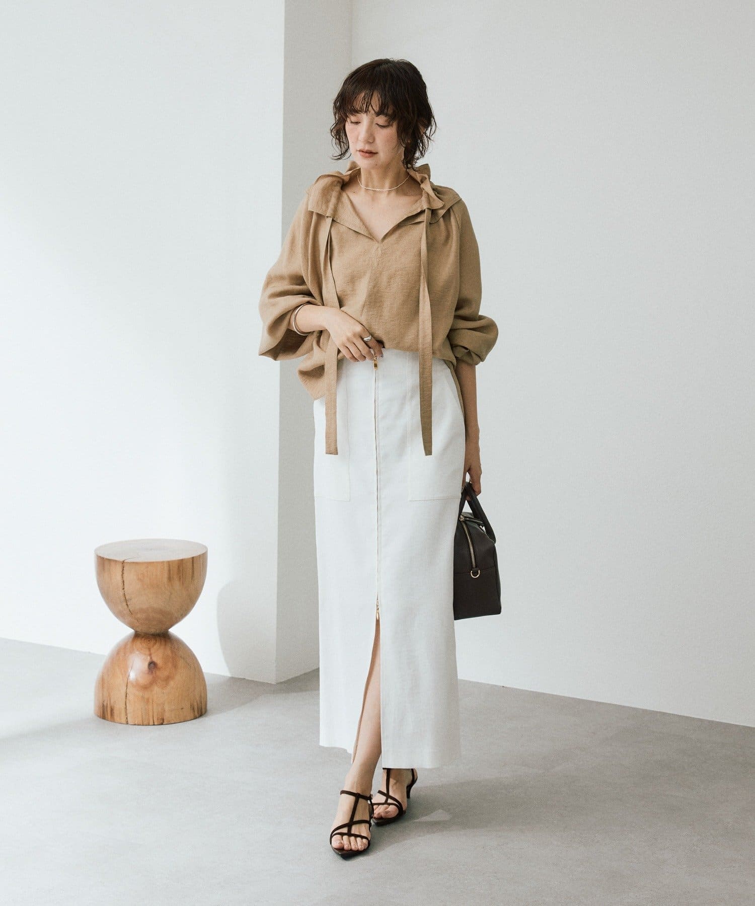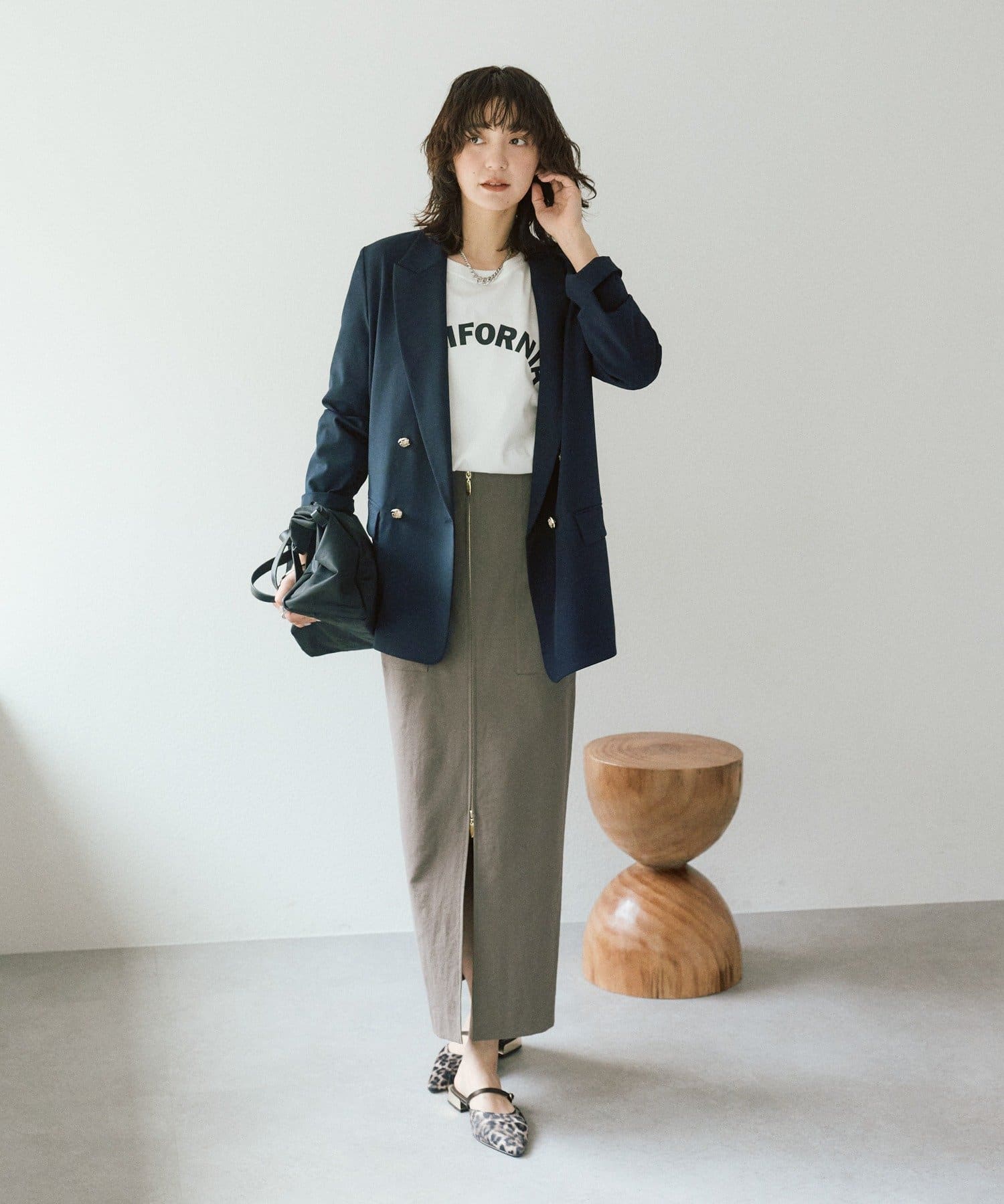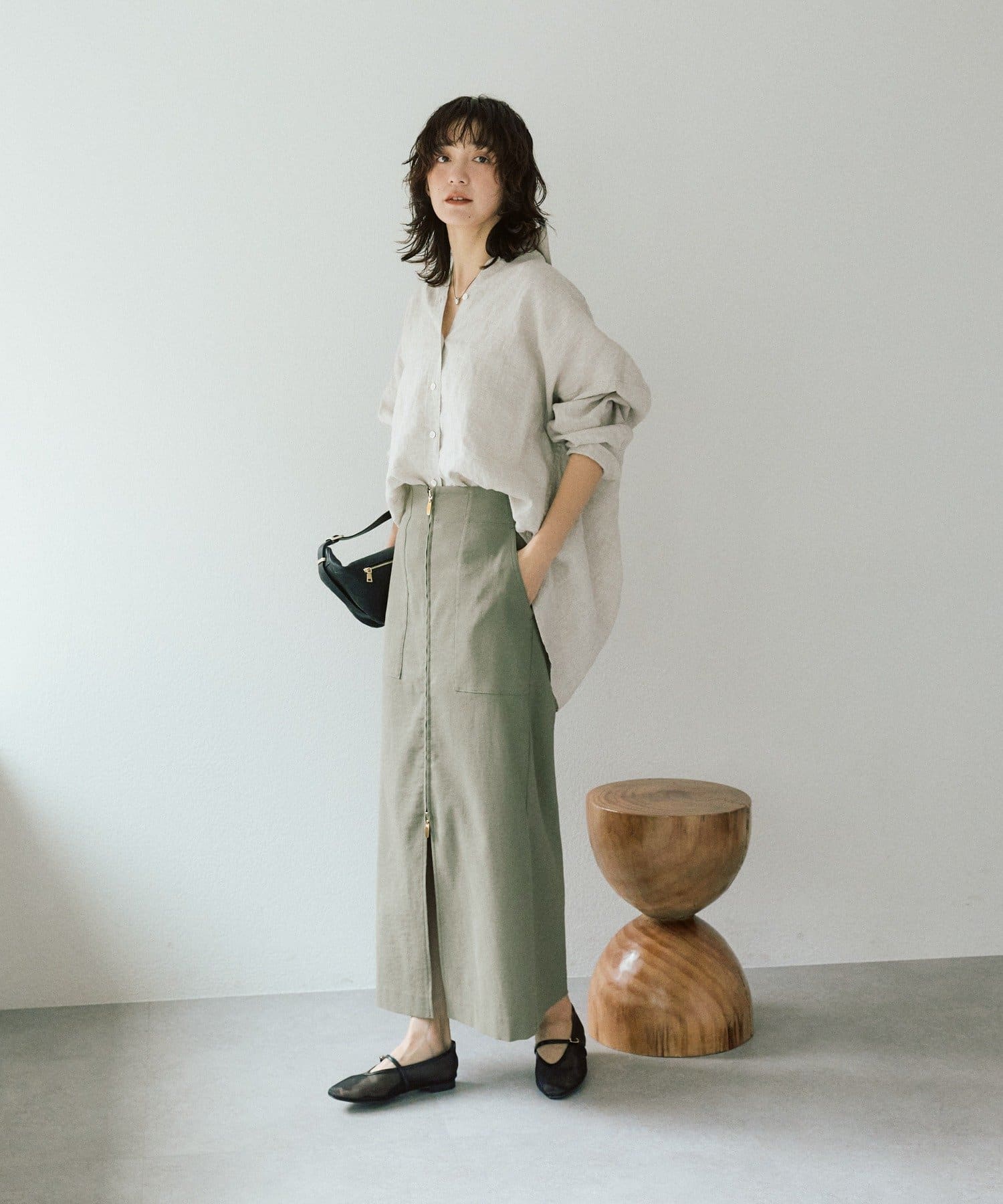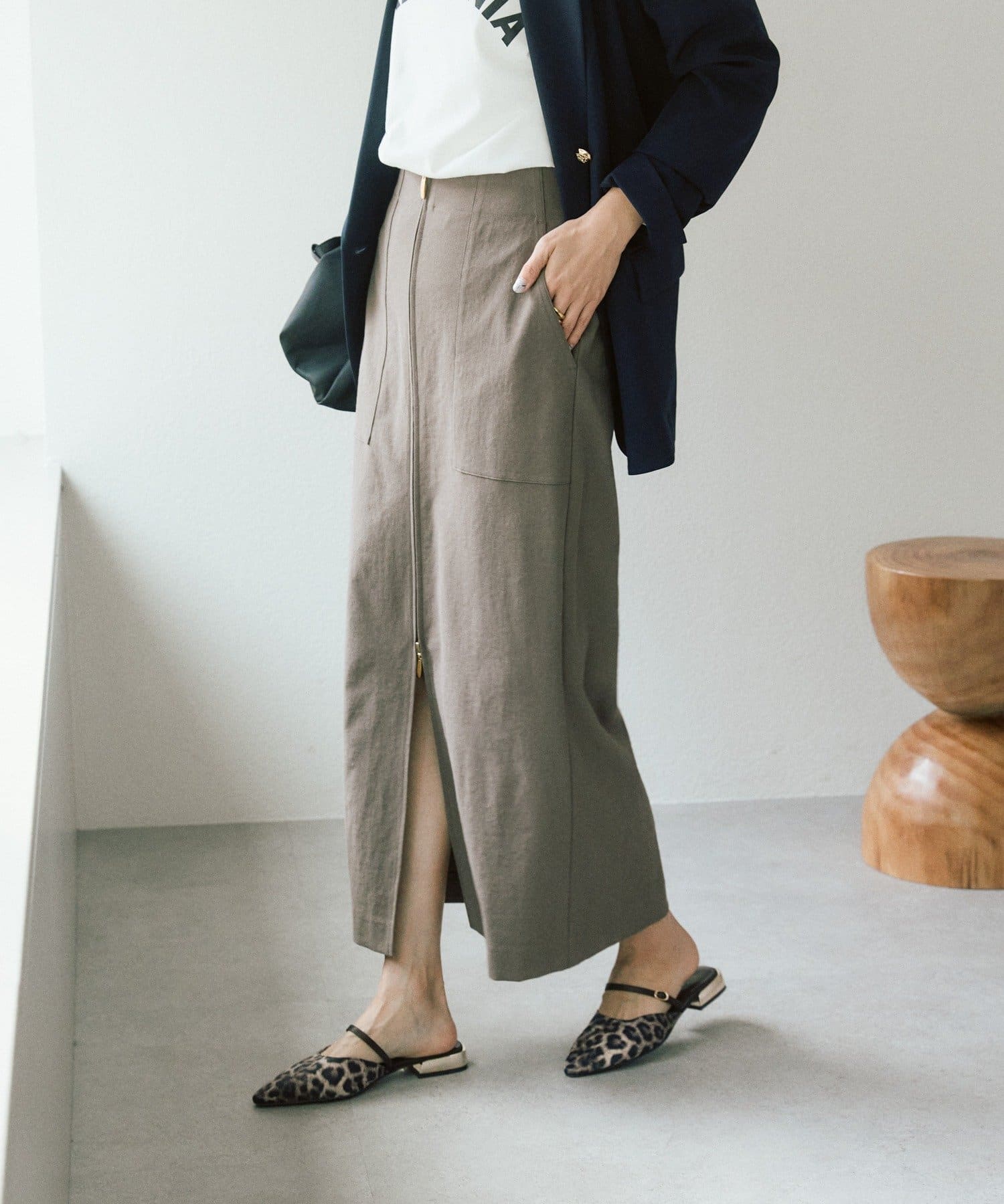 • フロントのファスナー切替で縦ラインを強調したタイトスカート