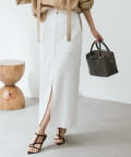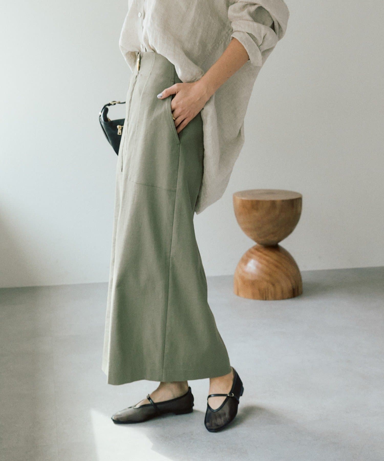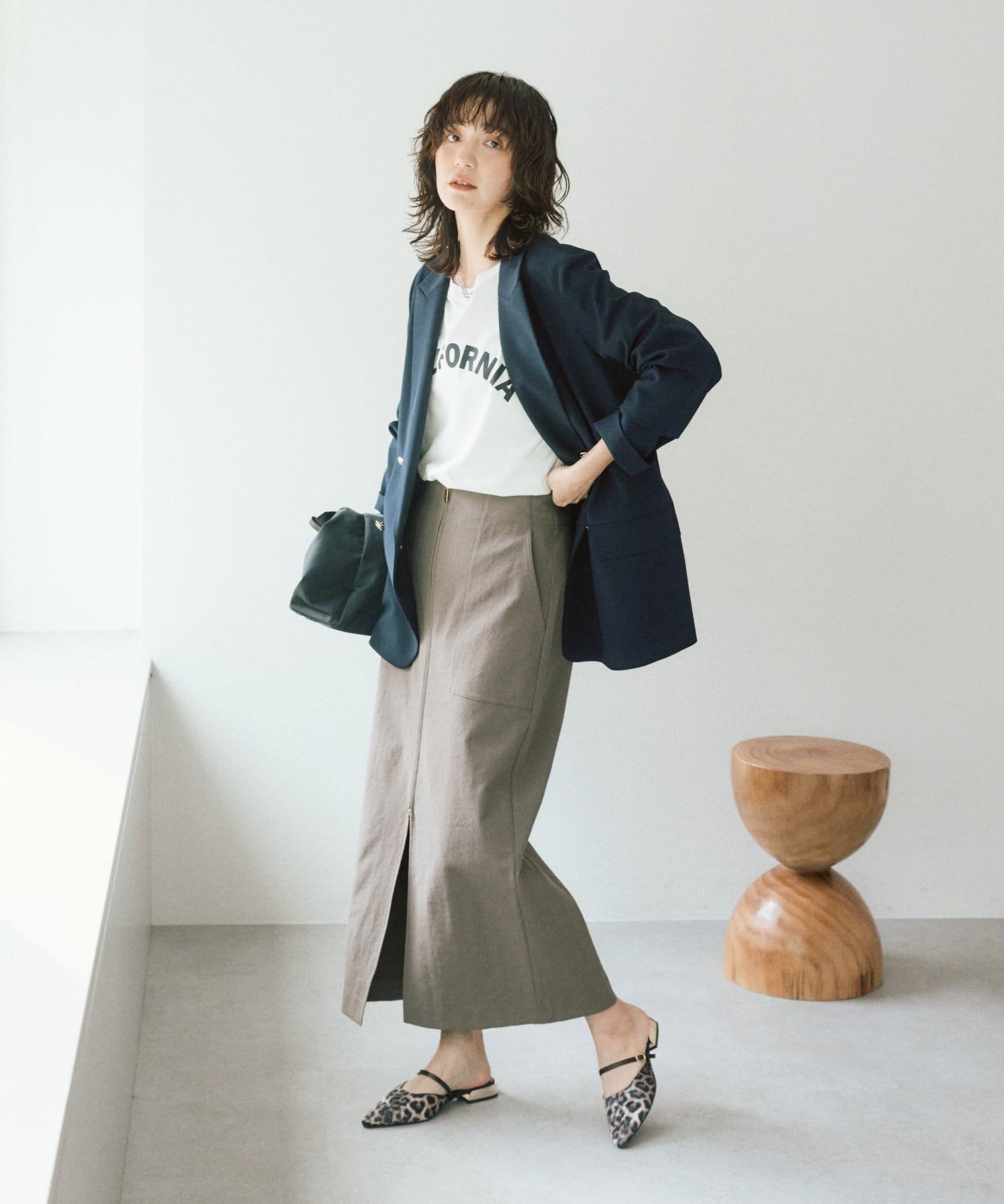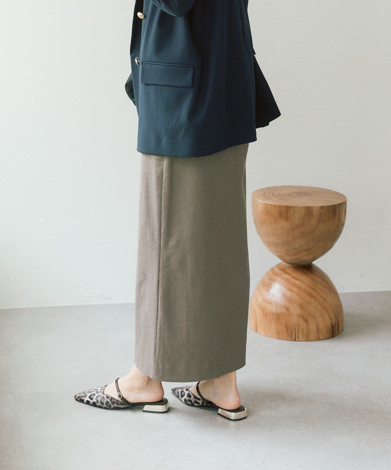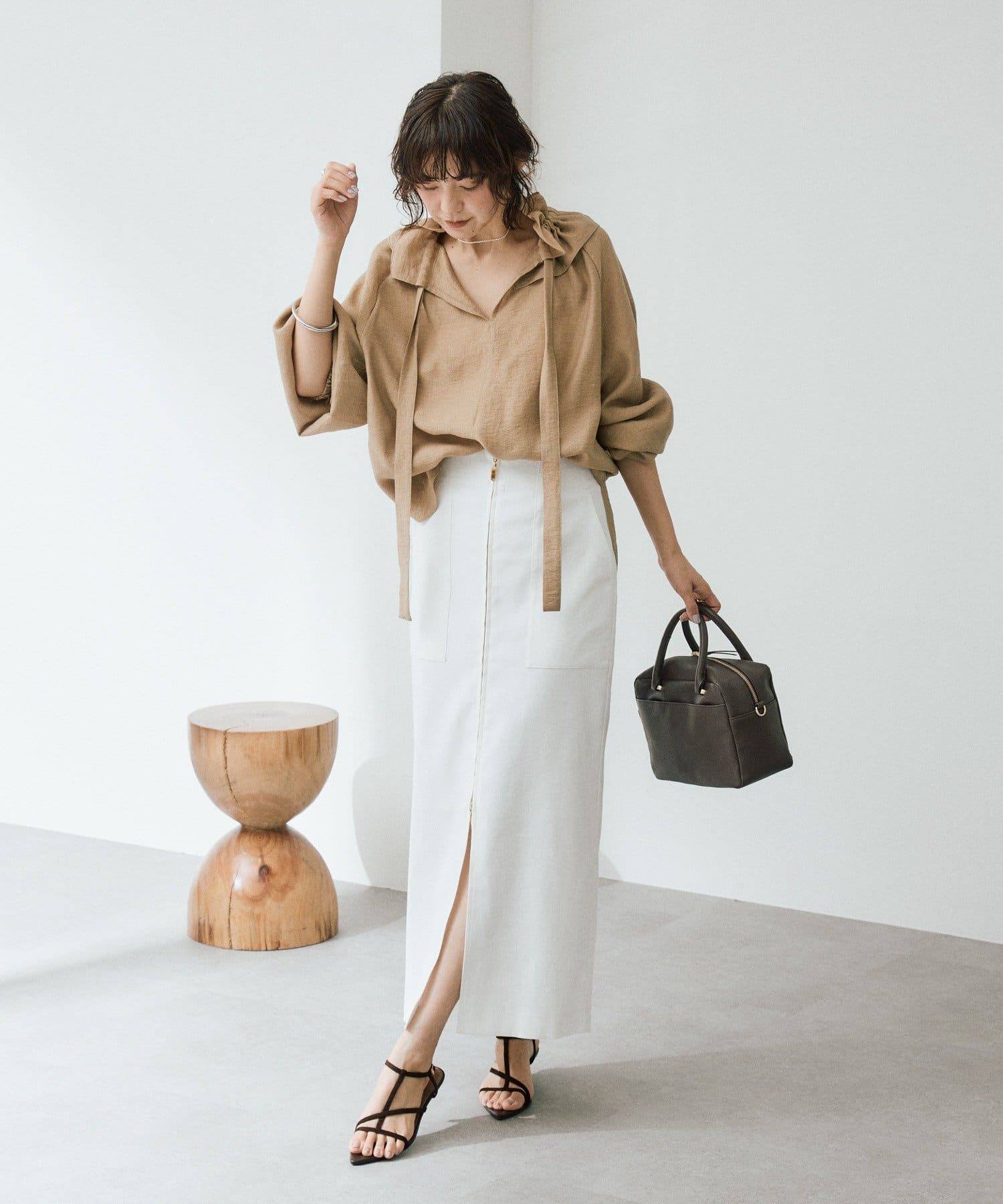 • フロントのファスナー切替で縦ラインを強調したタイトスカート