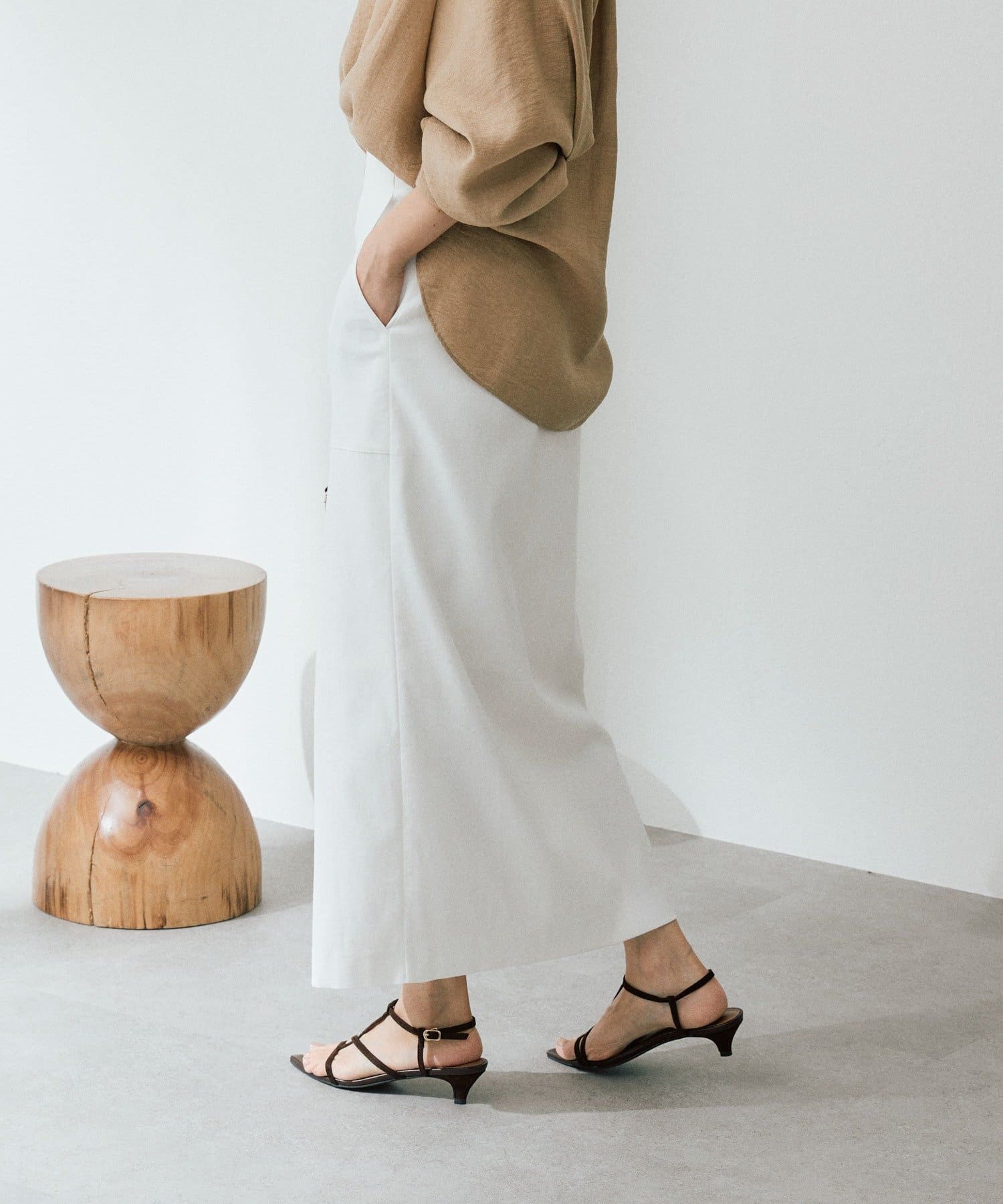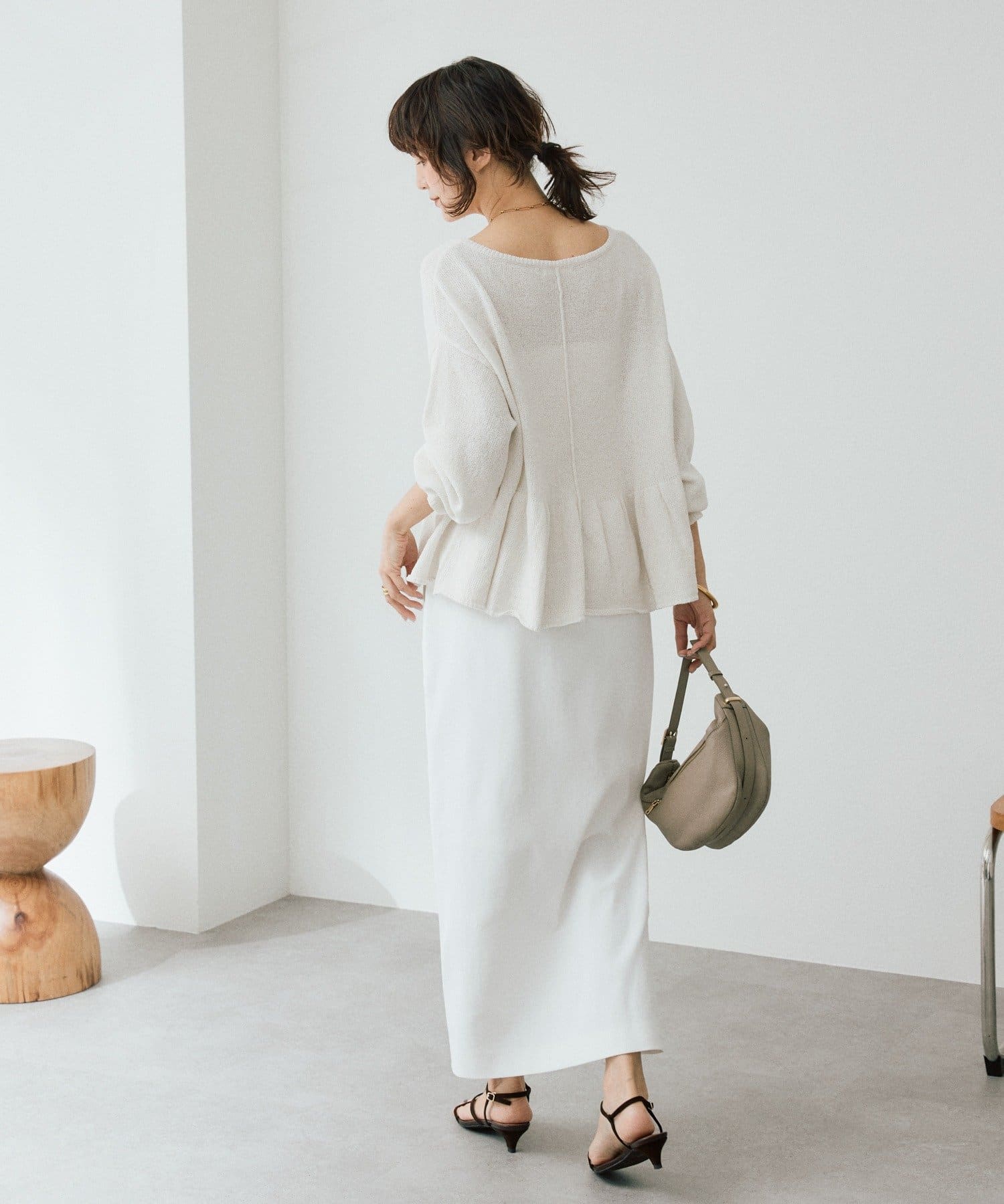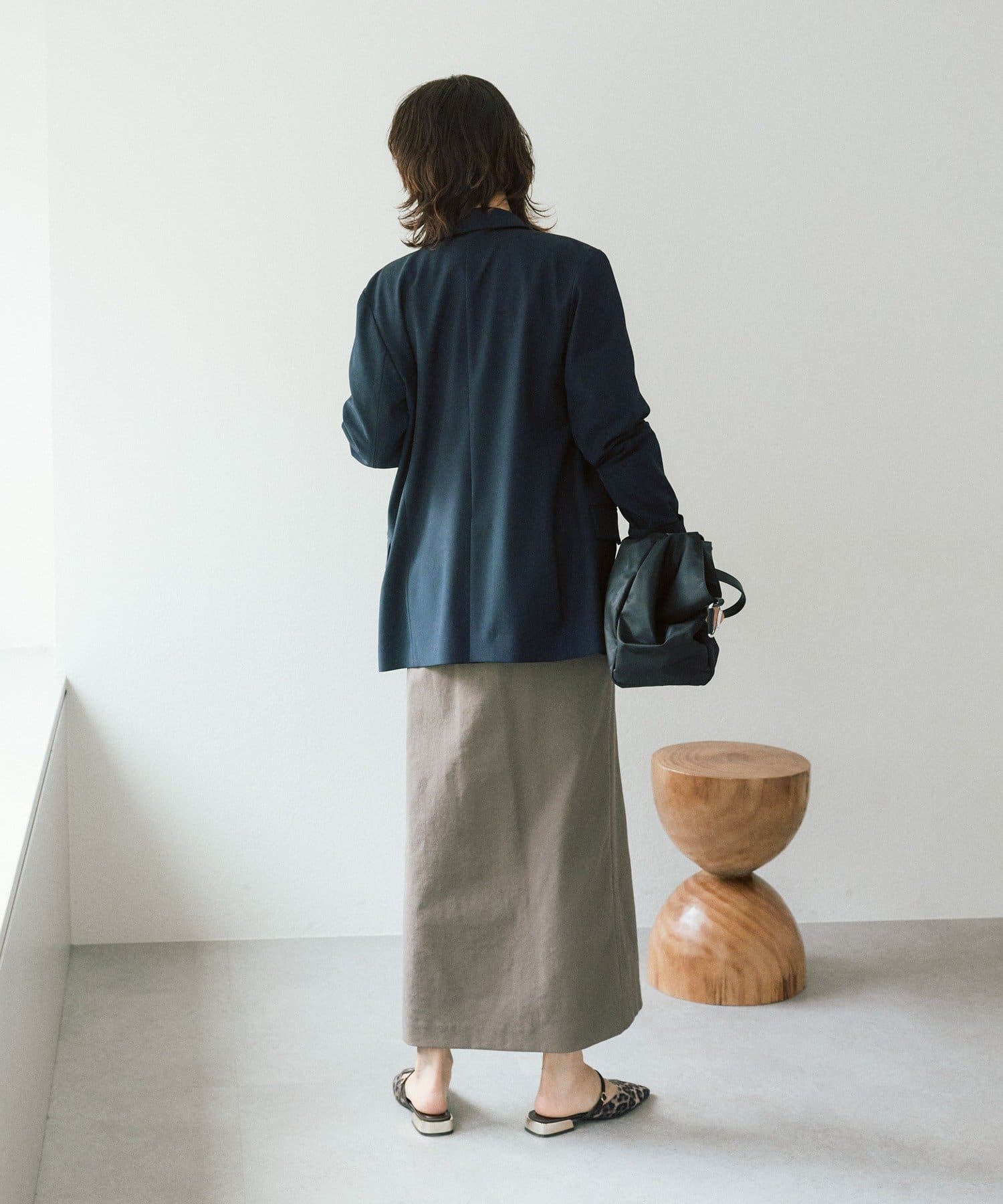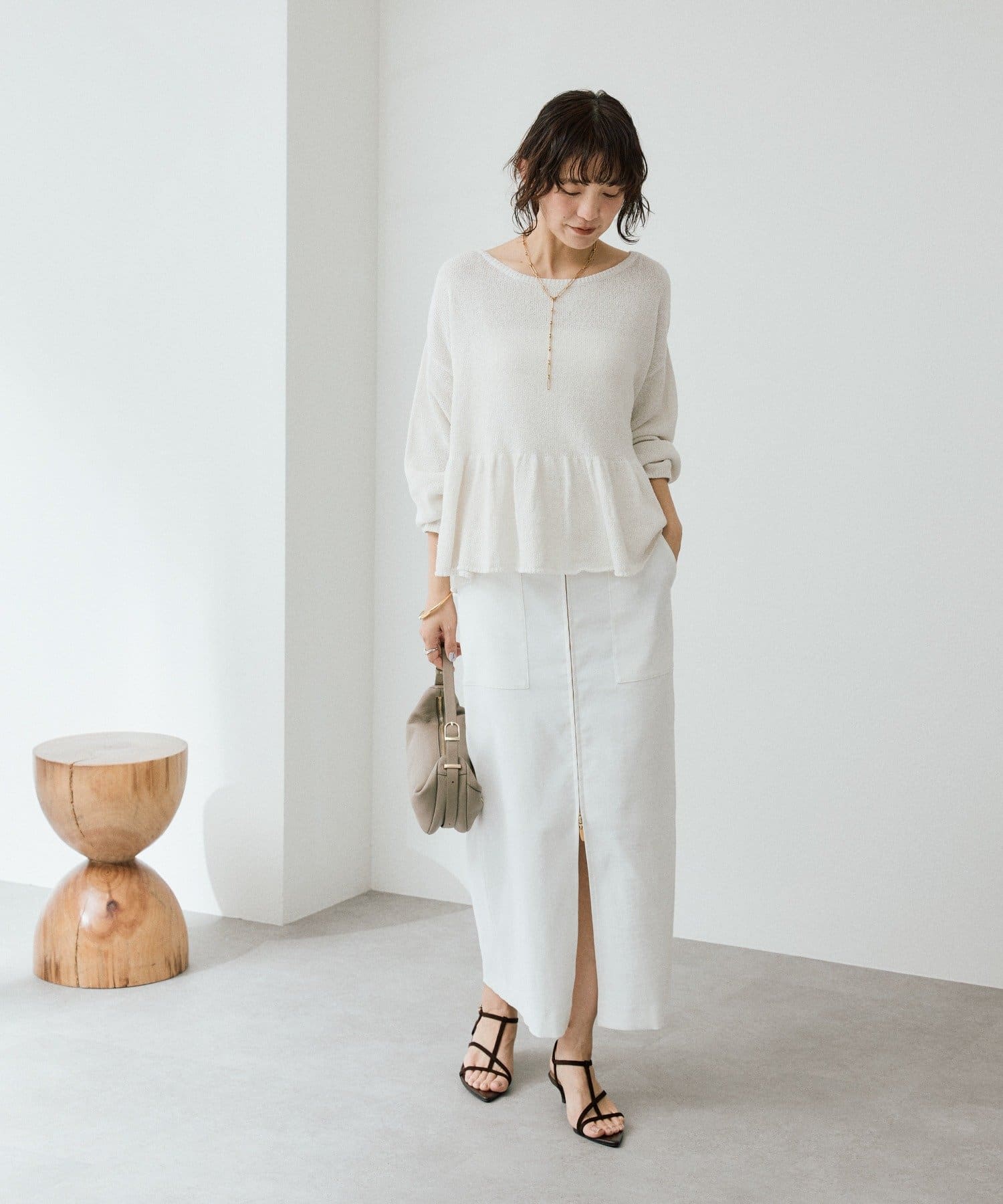 • フロントのファスナー切替で縦ラインを強調したタイトスカート