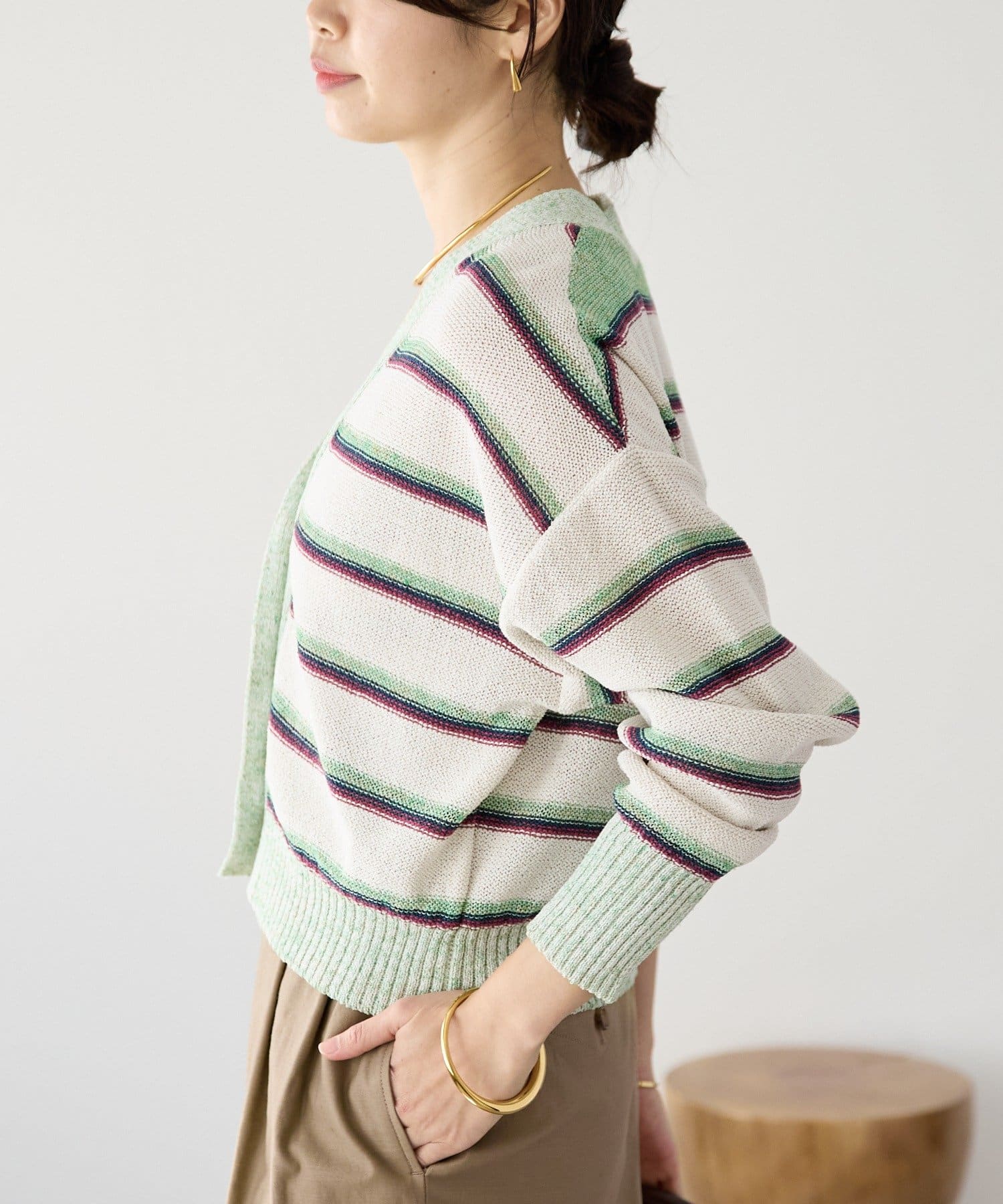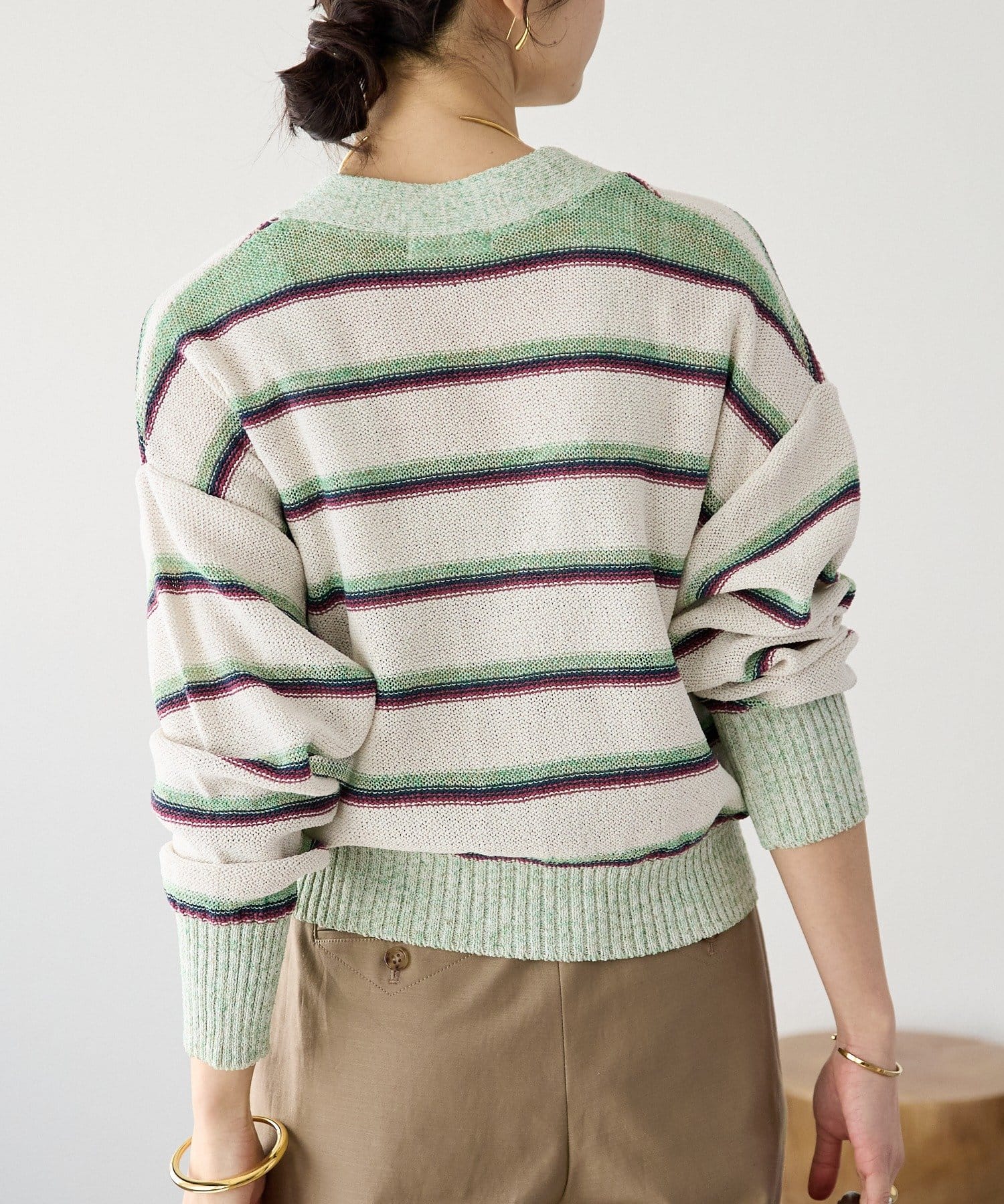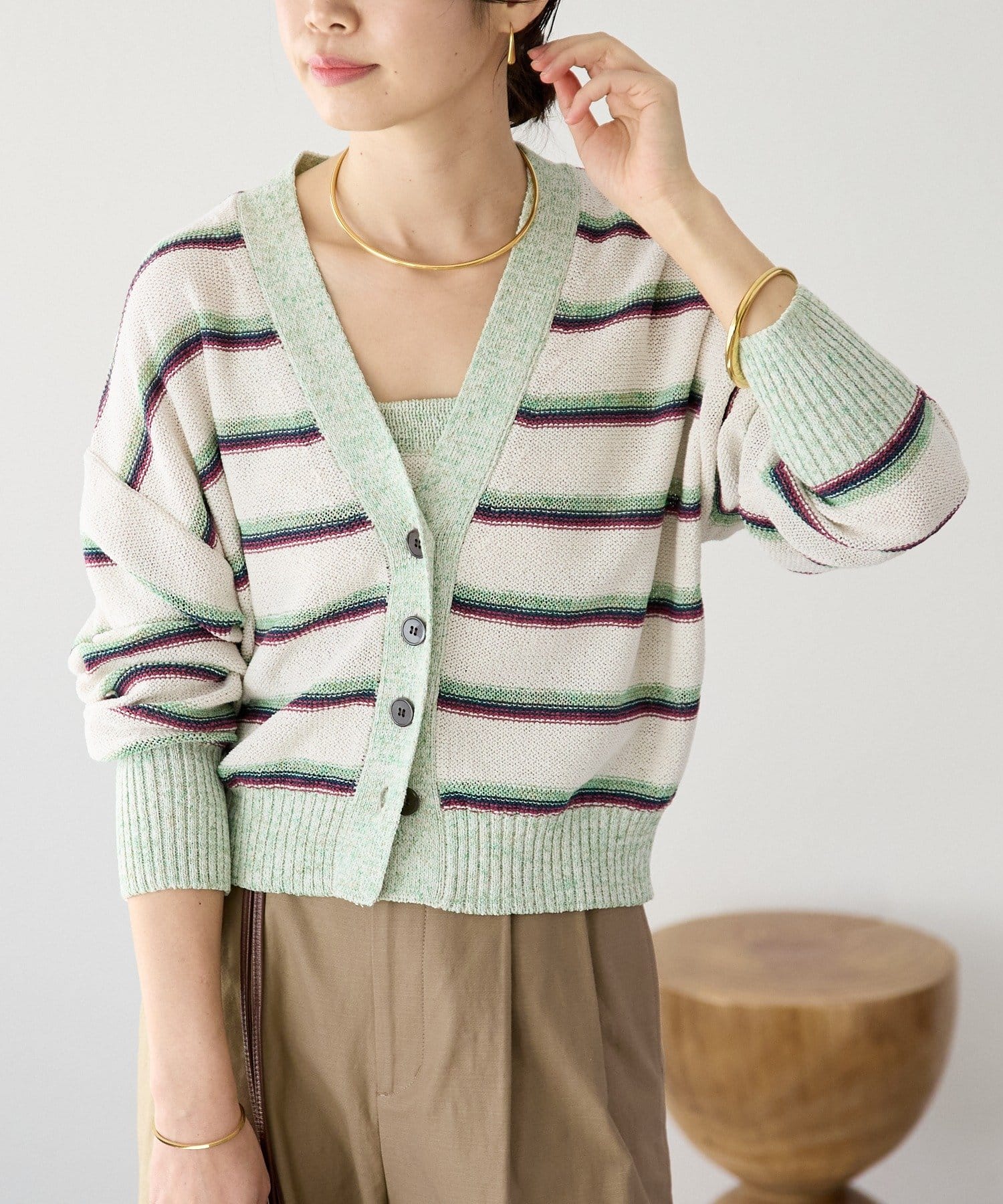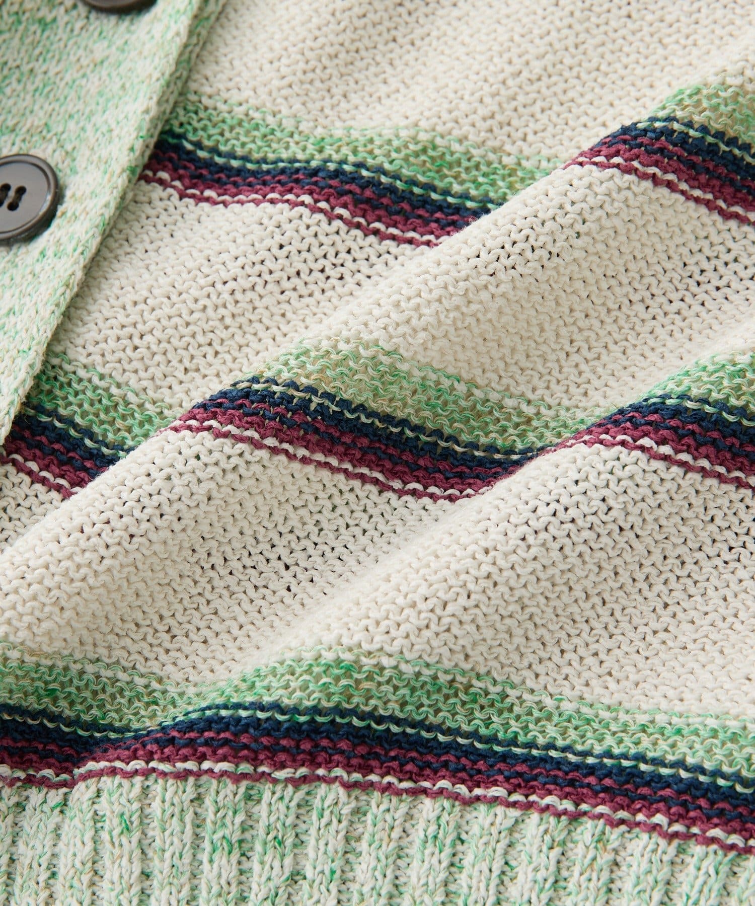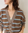 ・特別感のある色の組み合わせと、編地の質感にこだわったカーディガン。マルチボーダーはあえて裏目使いにすることで、奥行きのあるテキスタイルに編み上げました。