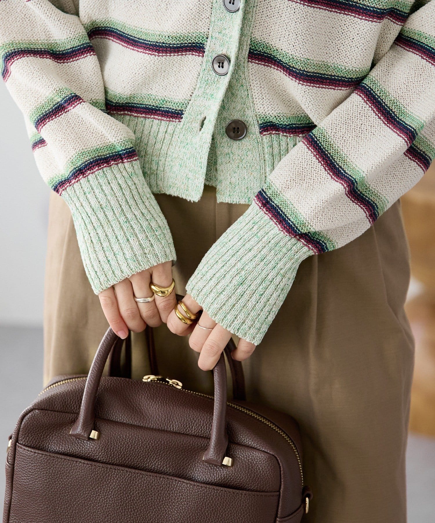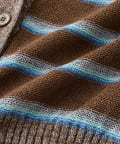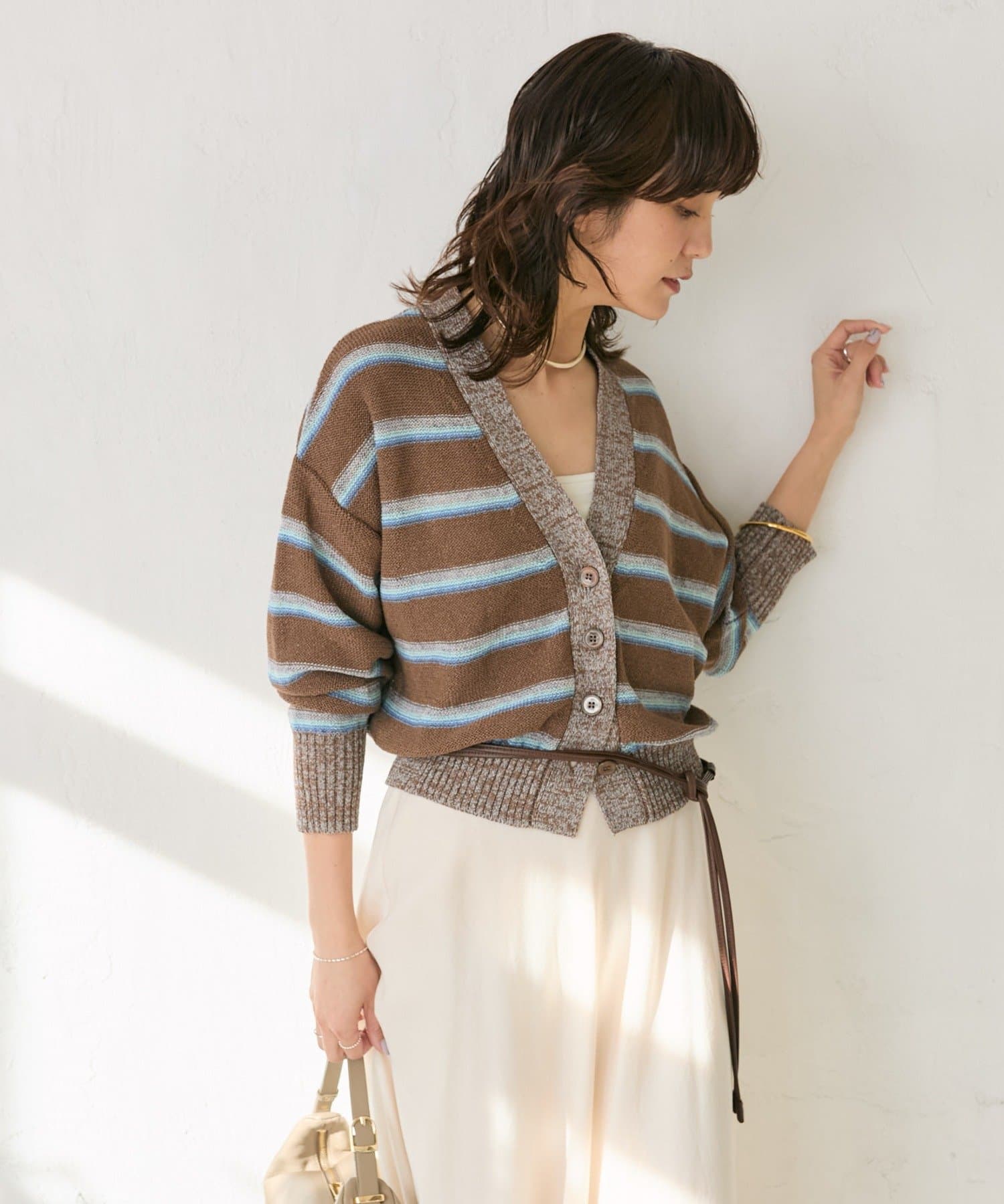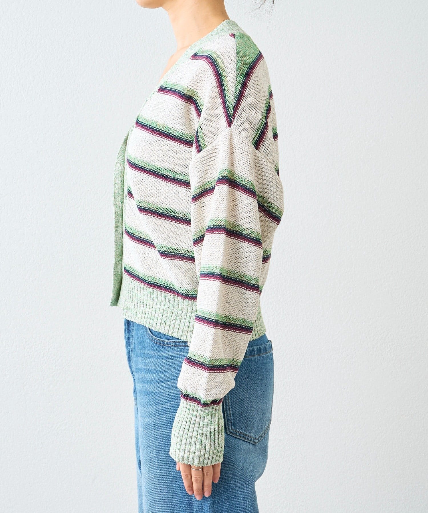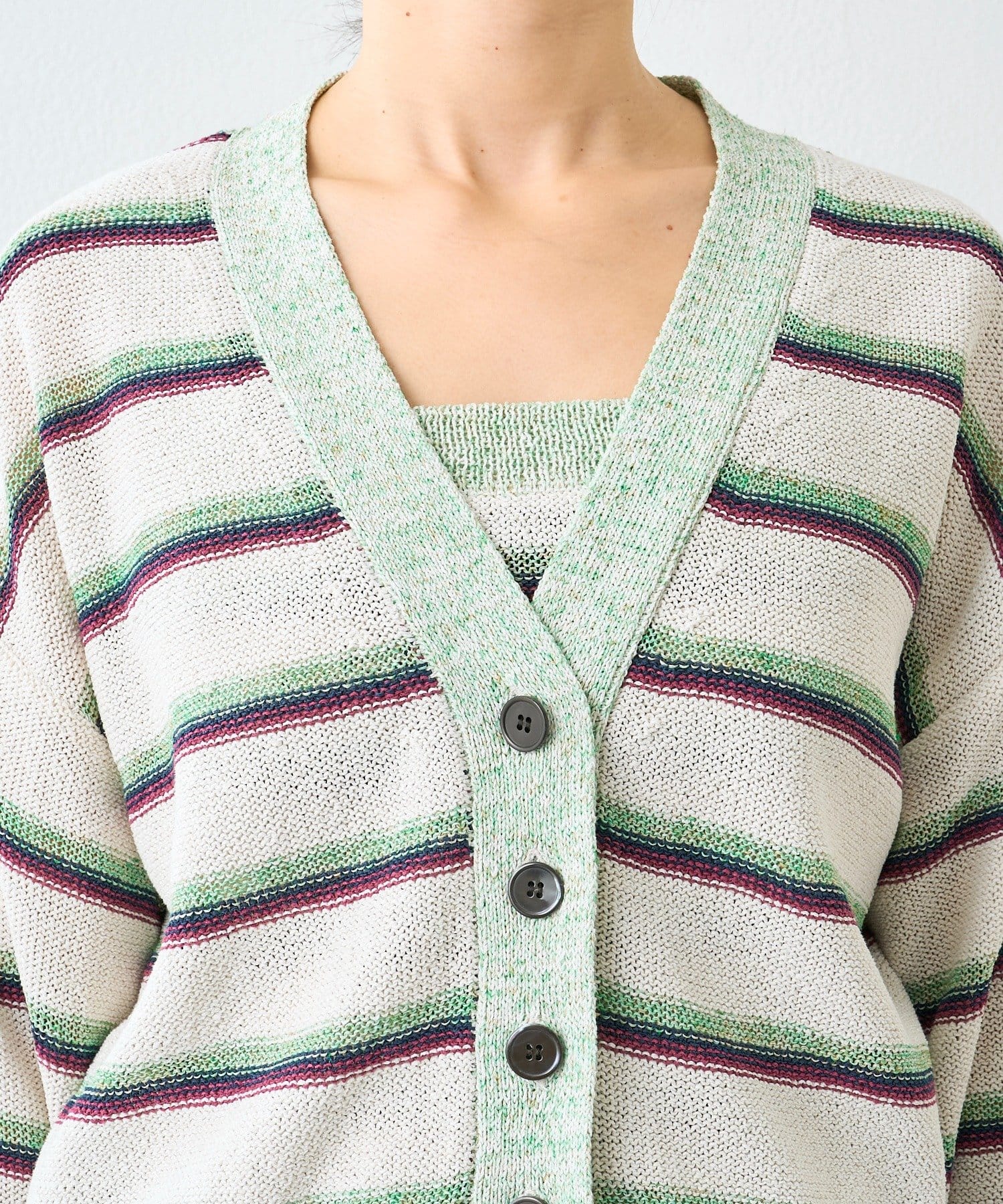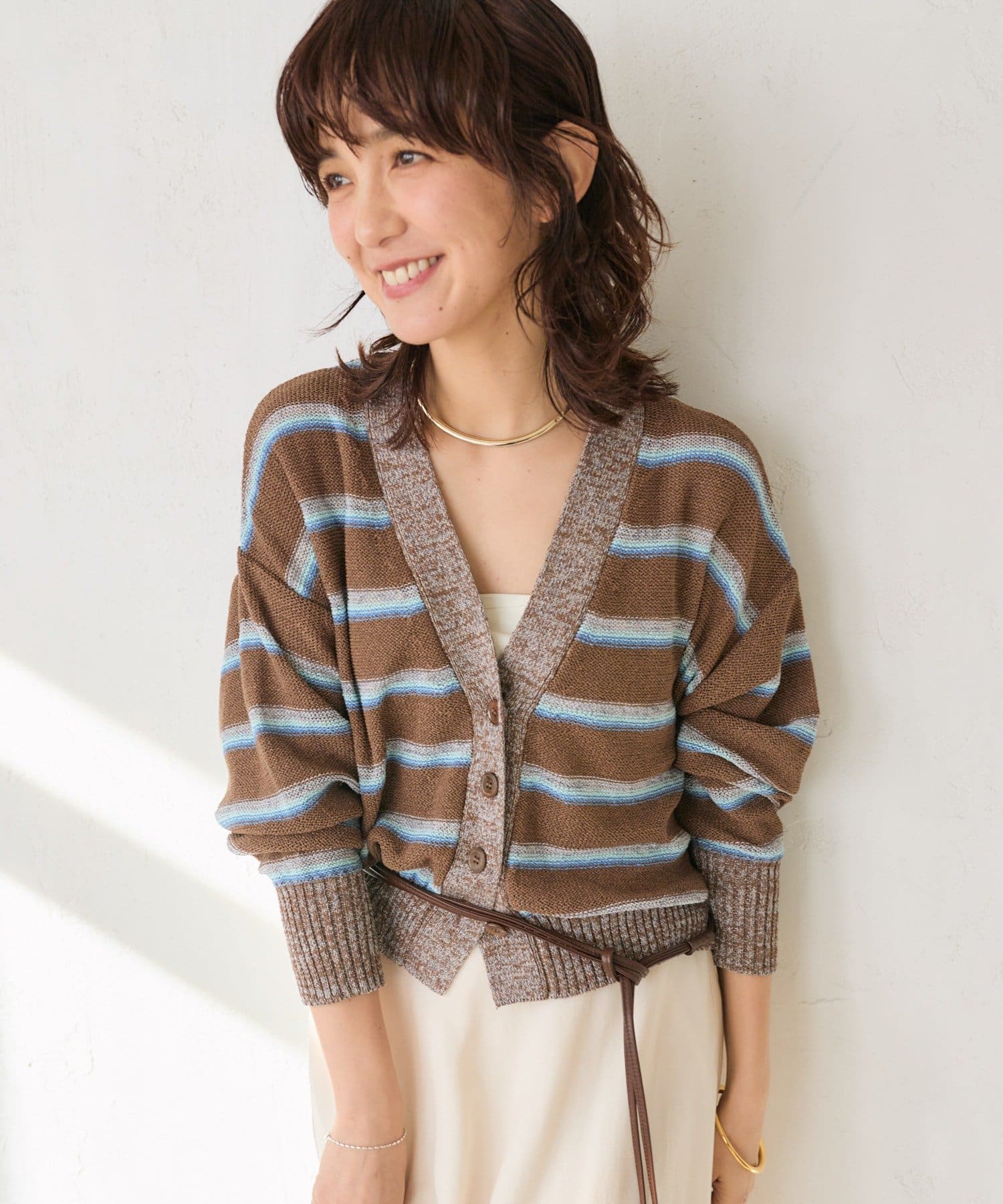 ・特別感のある色の組み合わせと、編地の質感にこだわったカーディガン。マルチボーダーはあえて裏目使いにすることで、奥行きのあるテキスタイルに編み上げました。