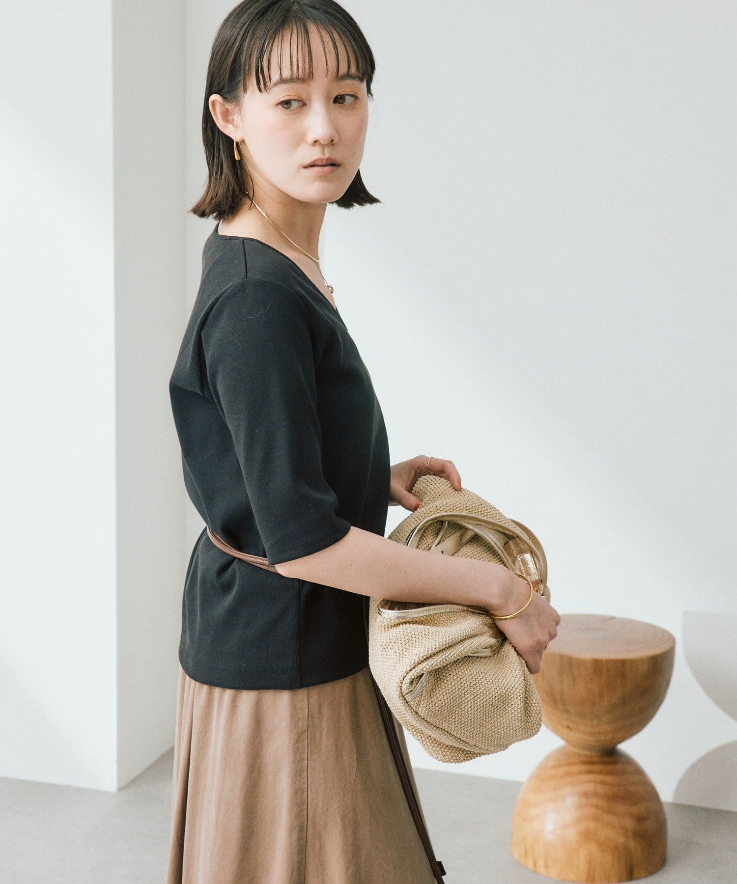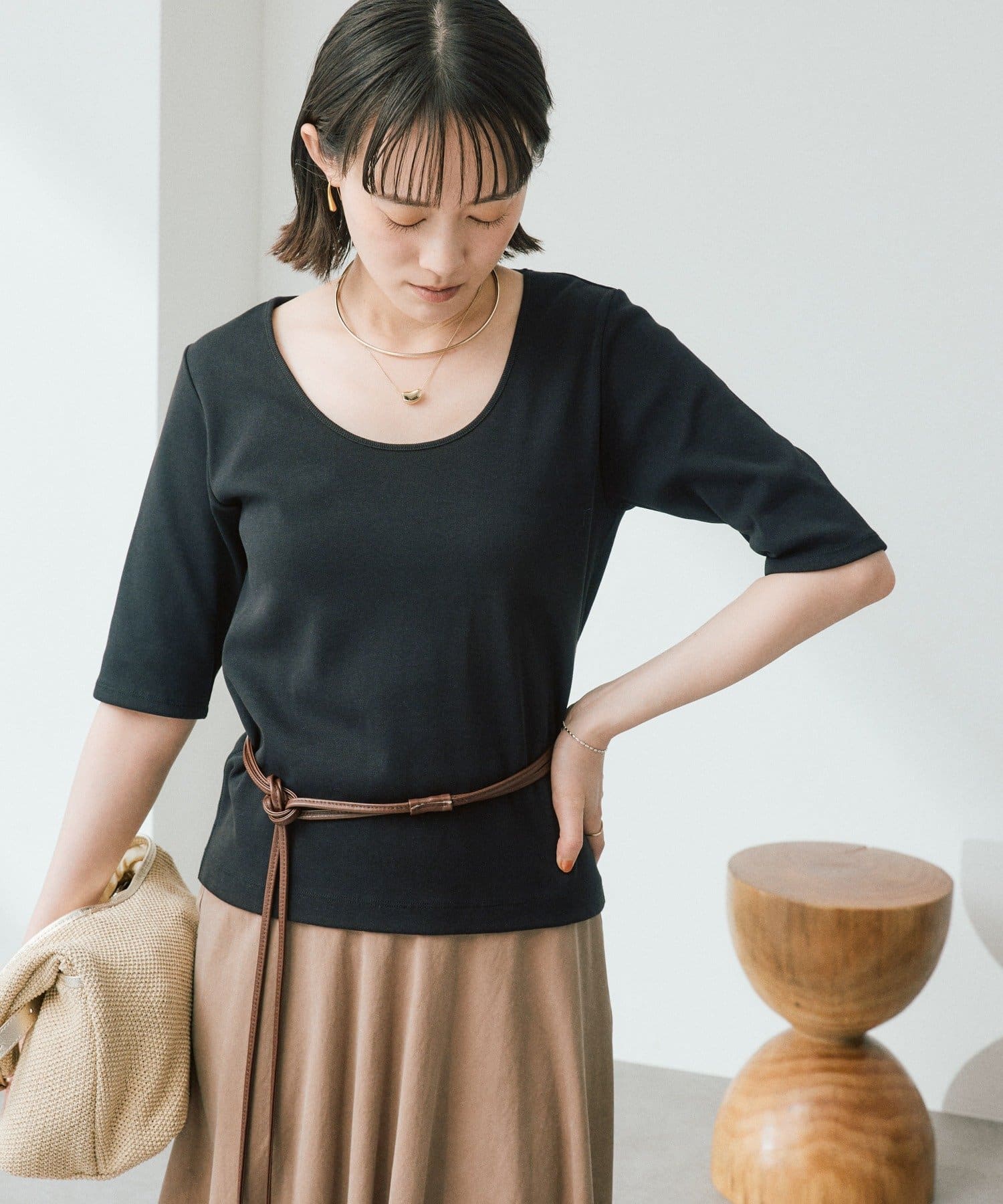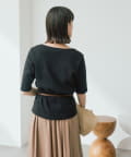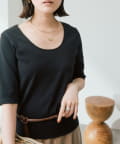 ・Uネックの衿ぐりと、細幅で繊細に仕上げた衿ぐりの付属がデコルテラインを綺麗に見せてくれます