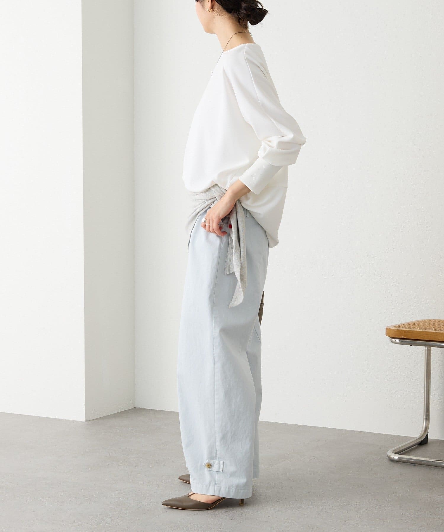 ・オンオフ兼用しやすいシンプルなデザインで、カジュアルにもきれいめにも万能に着まわせるアイテム。
