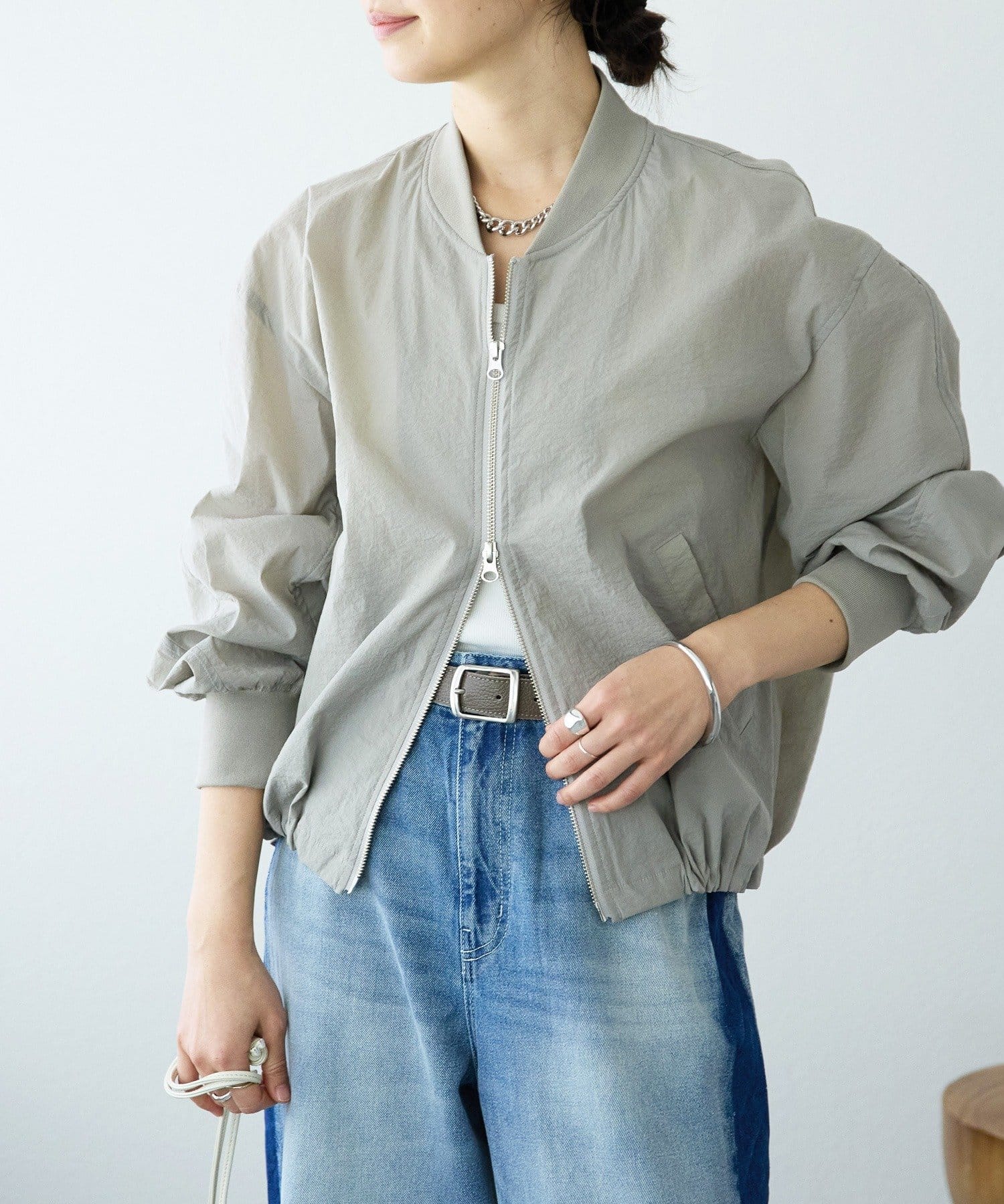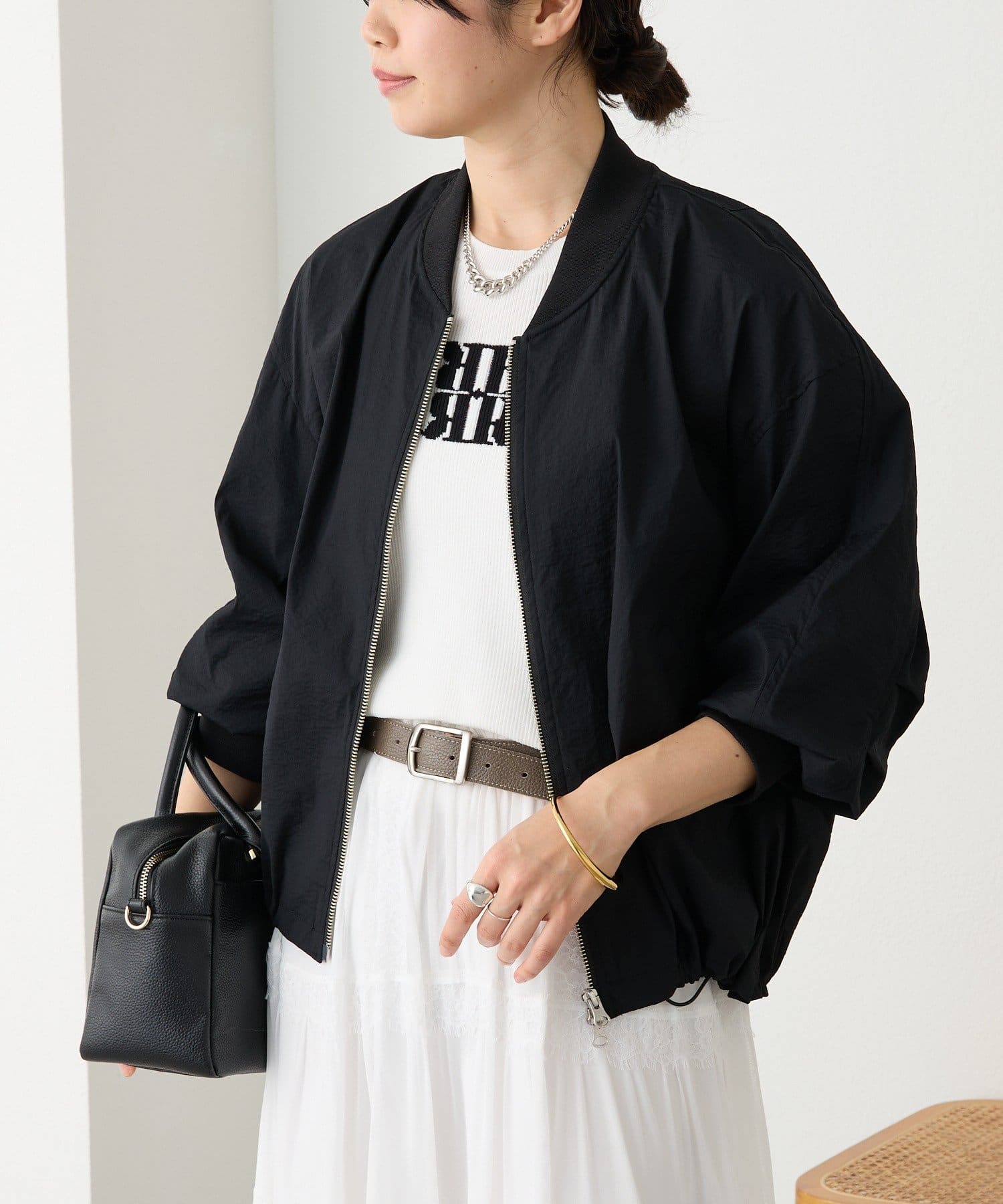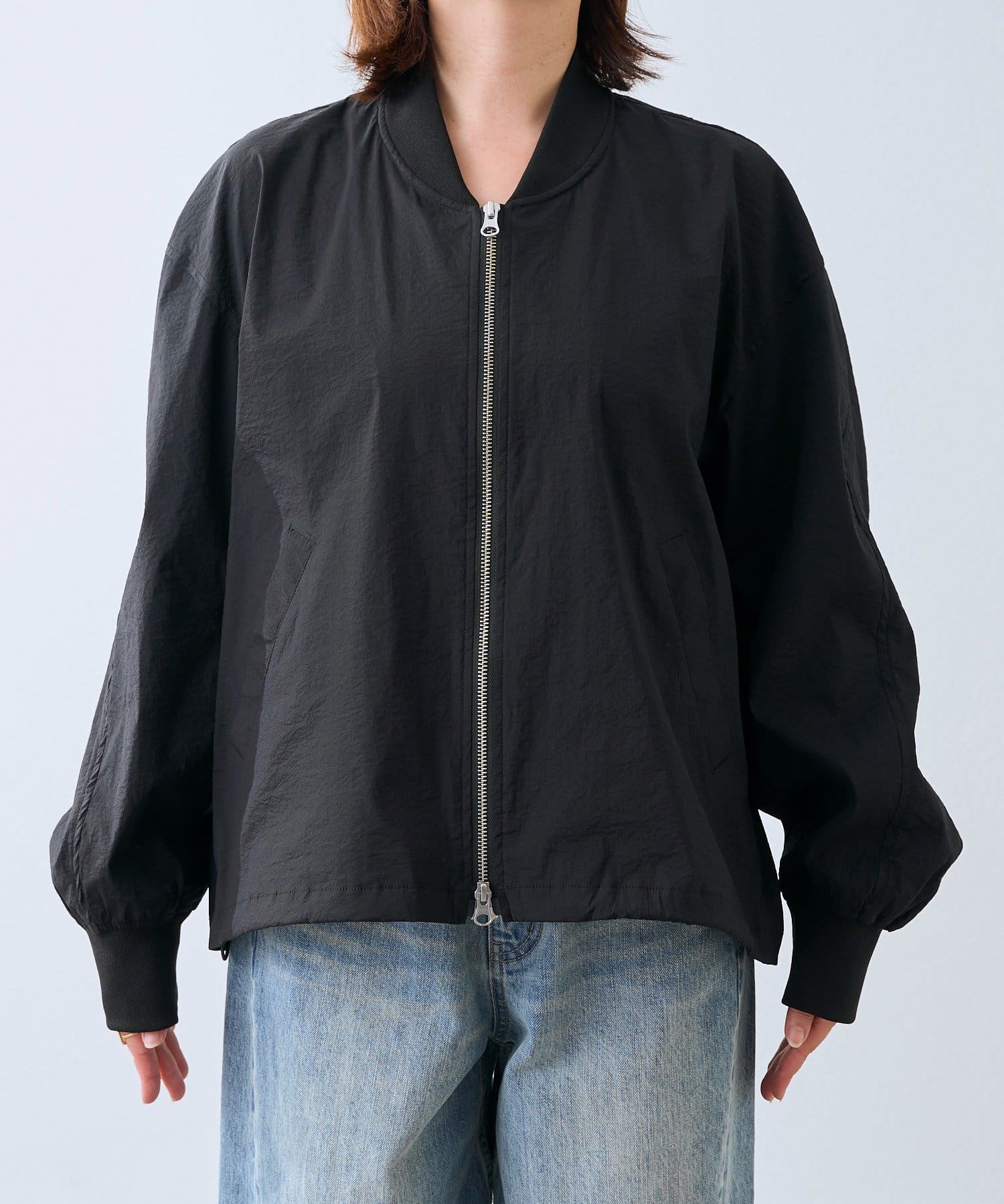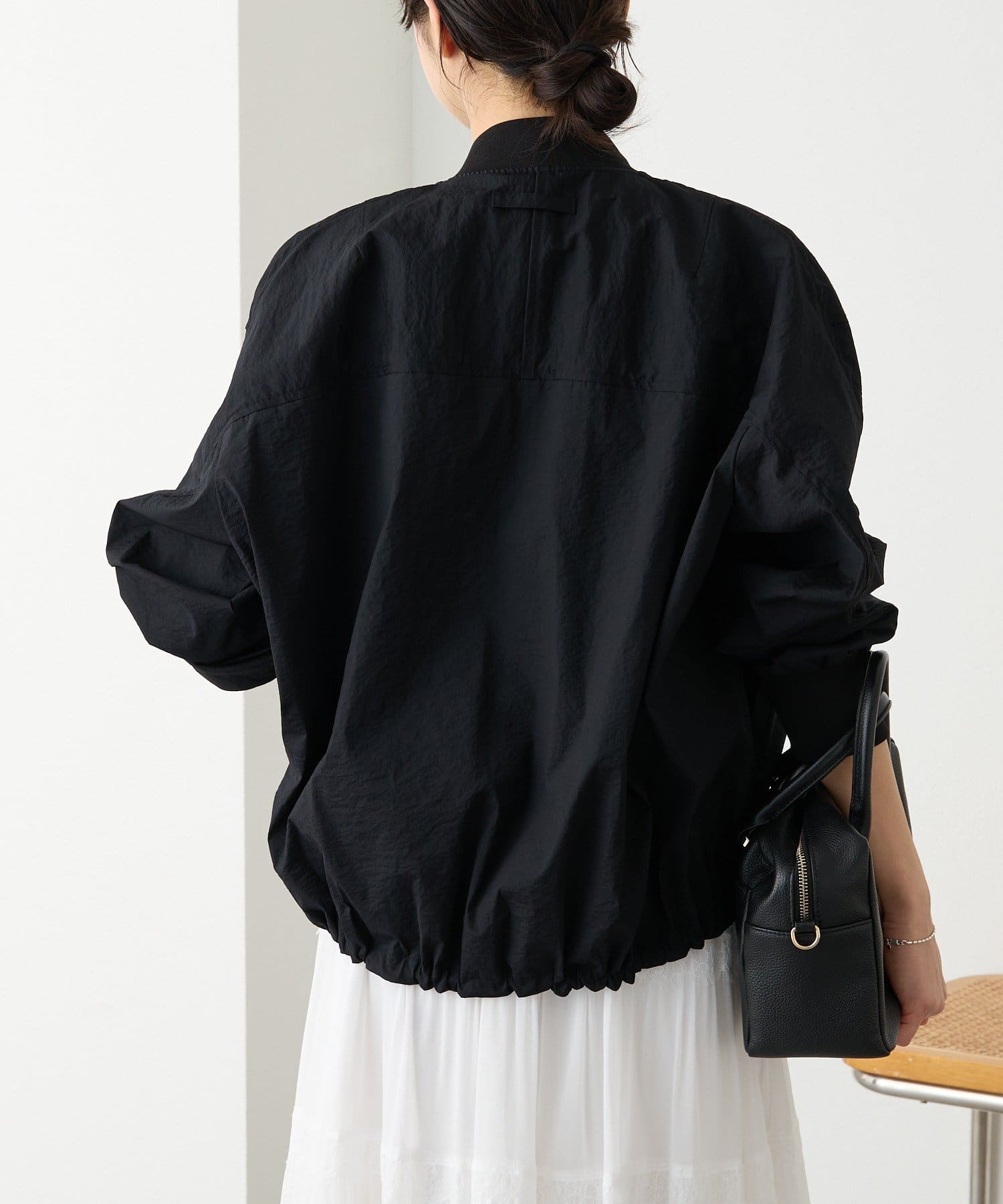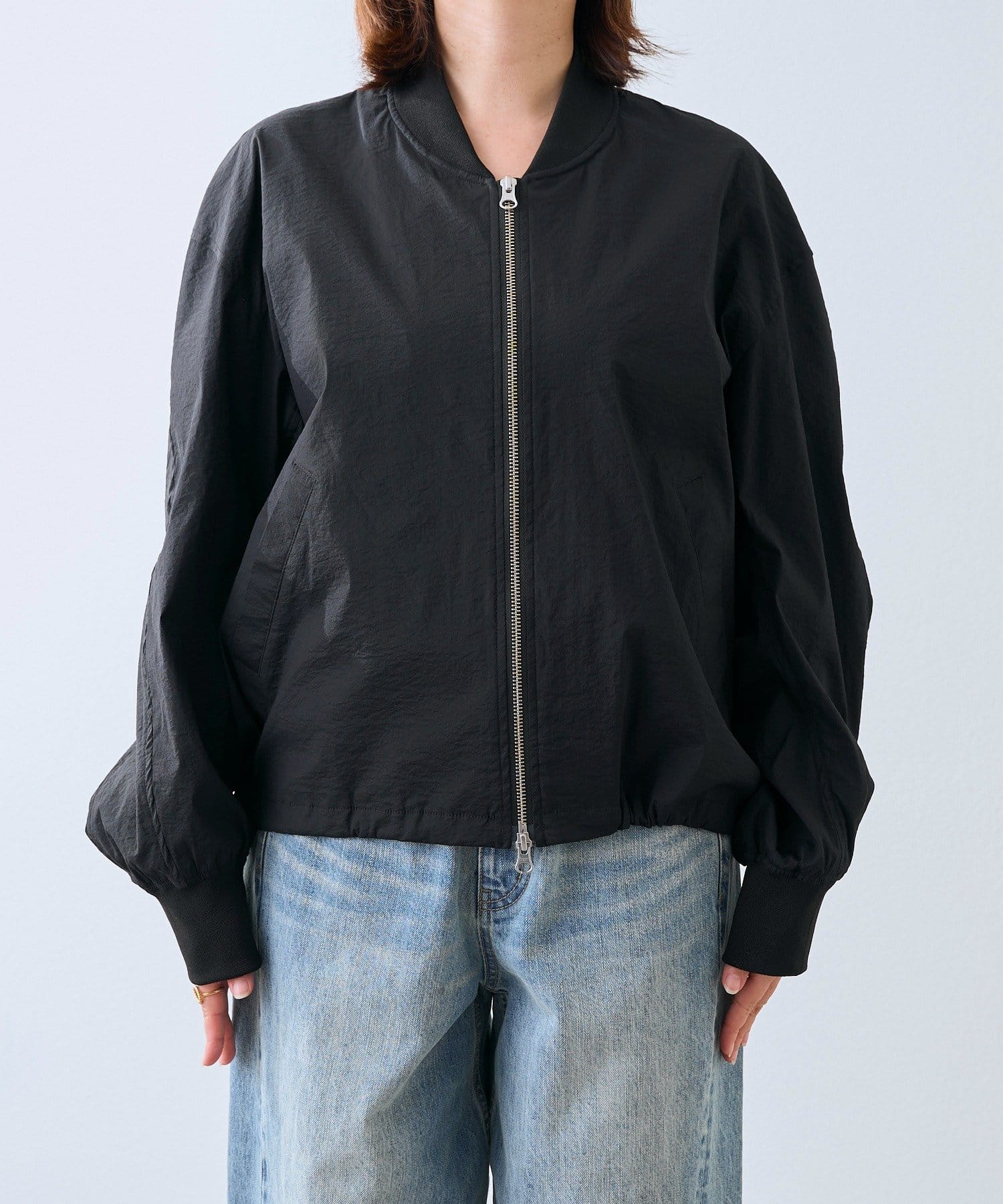 ・袖リブ・衿リブ付きでMA-1のムードを残しつつ、裾はドローコードデザインにアップデート。裾を絞ったバルーンフォルムが目を引く、モードでトレンド感のある一着です。