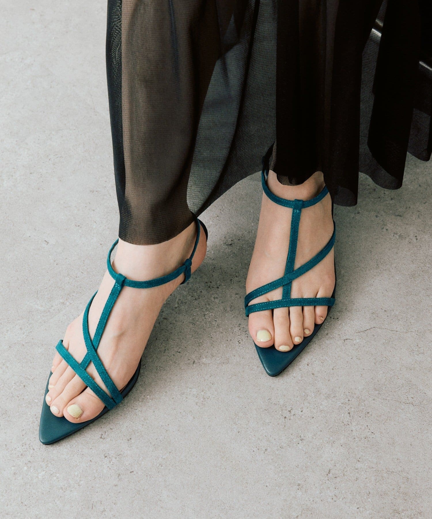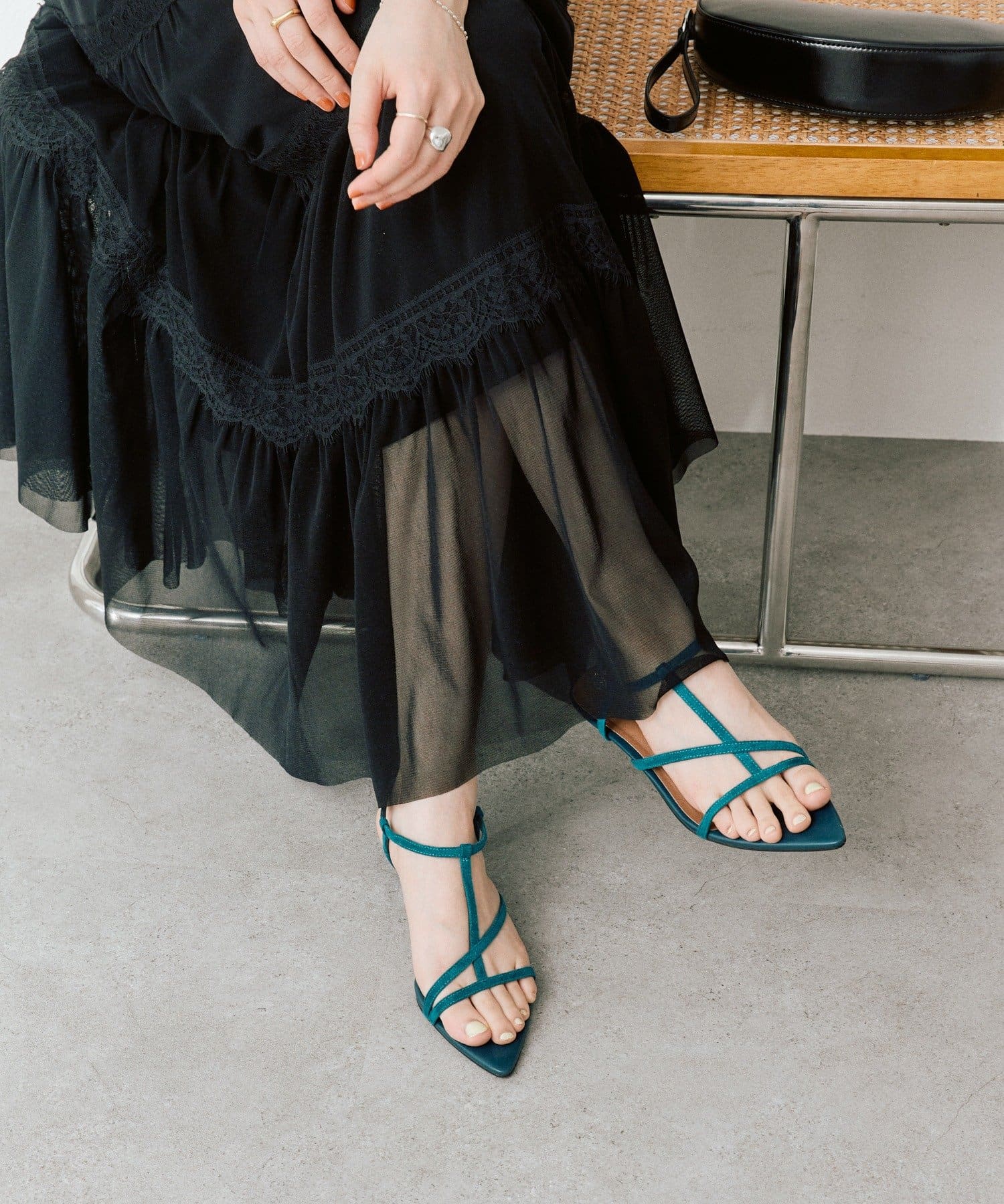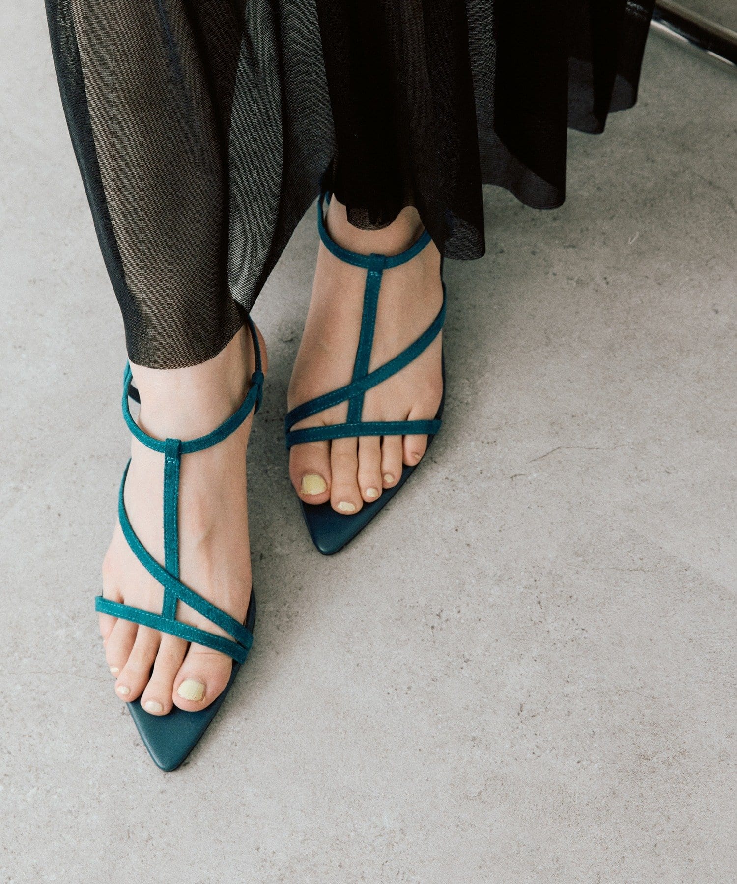 ・華奢なストラップが抜け感のある足元を演出